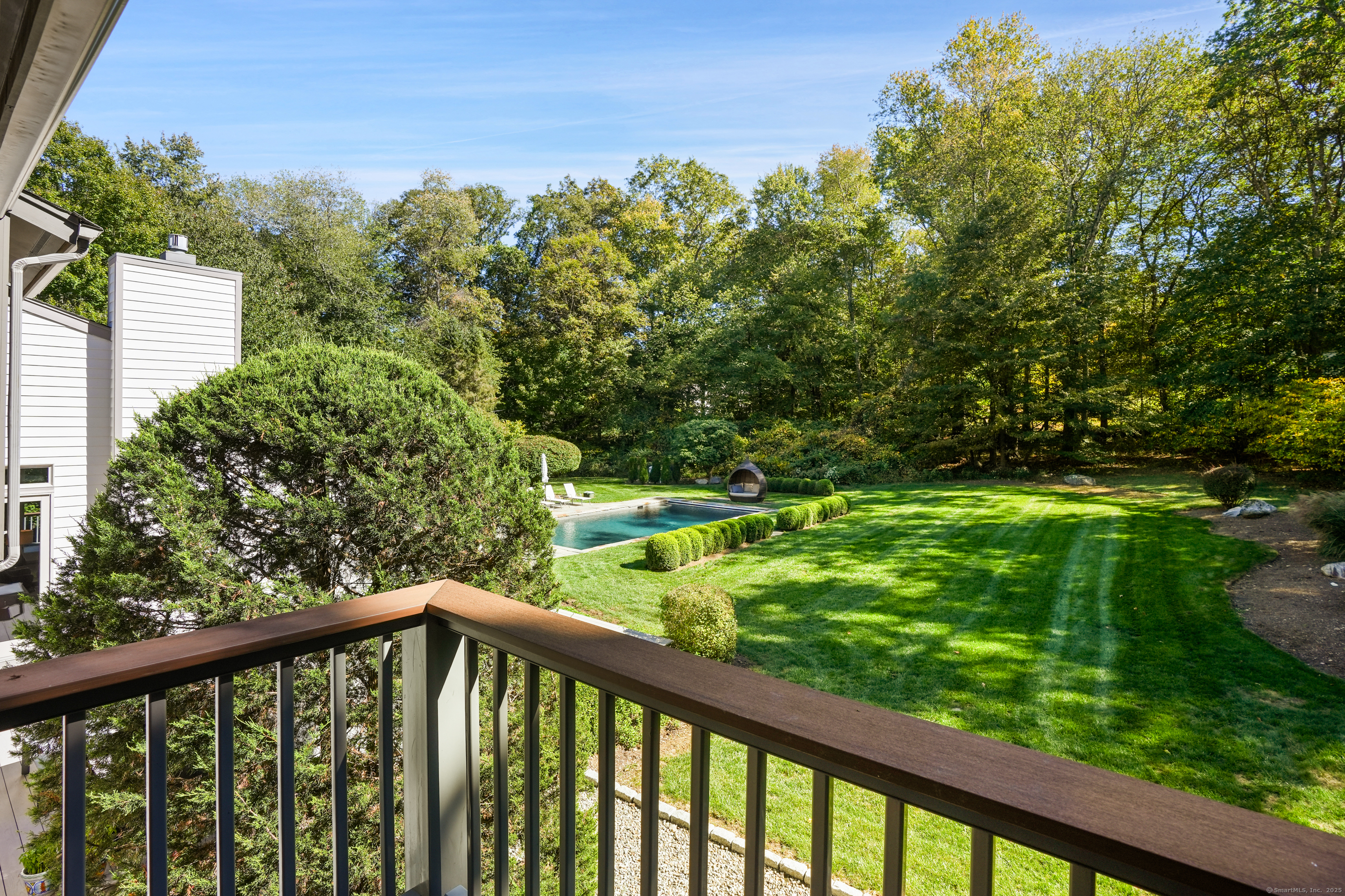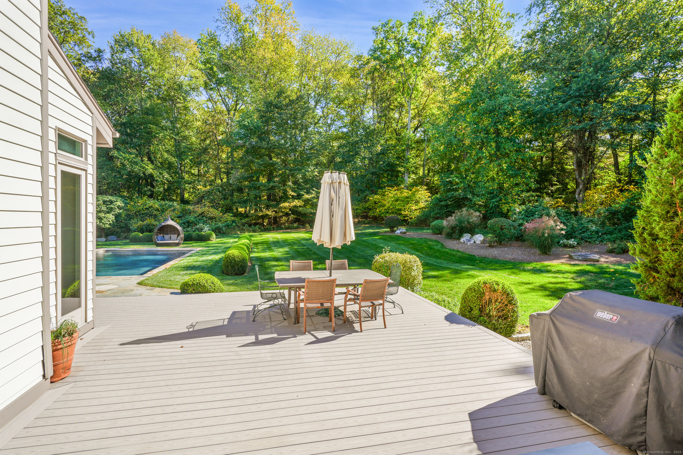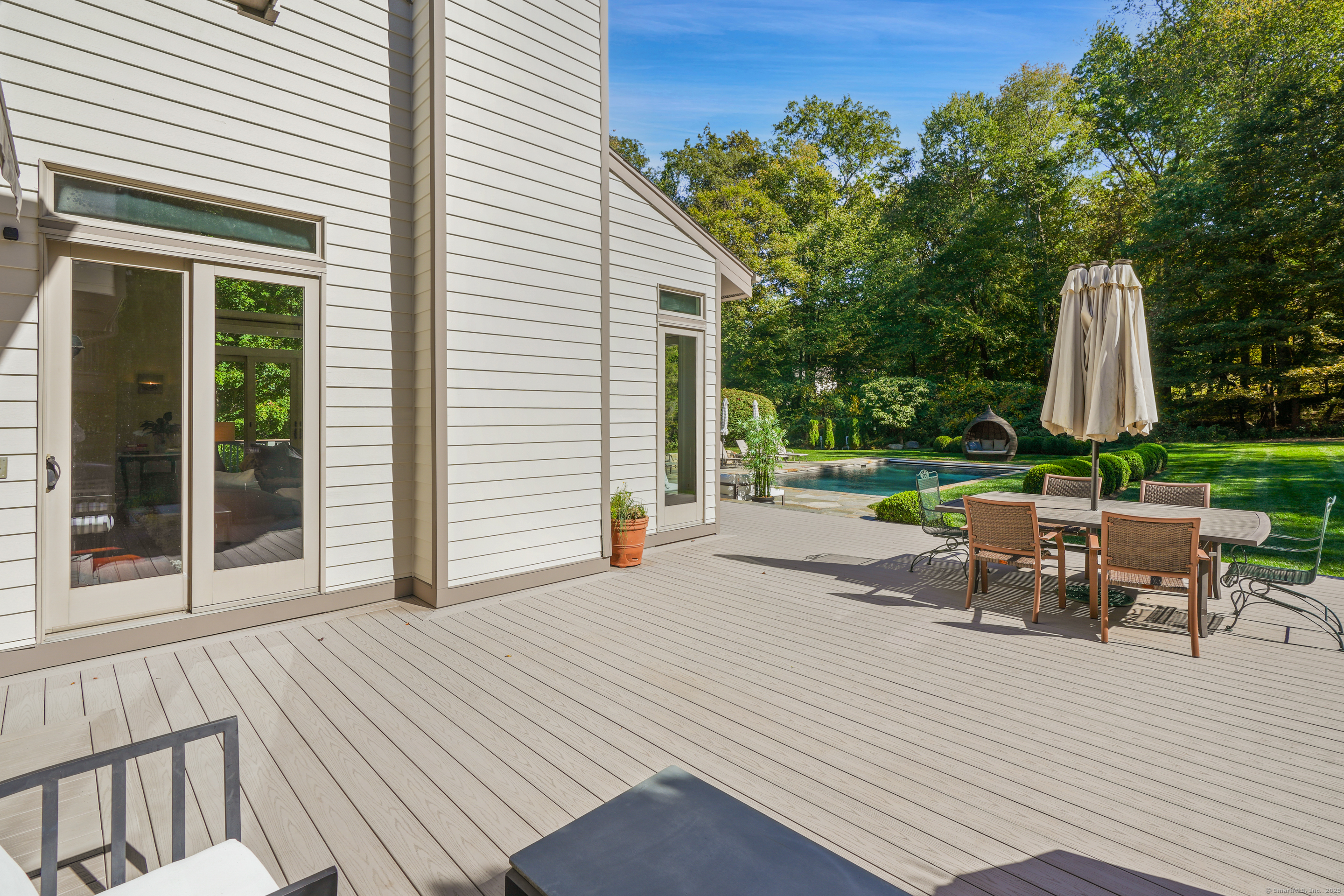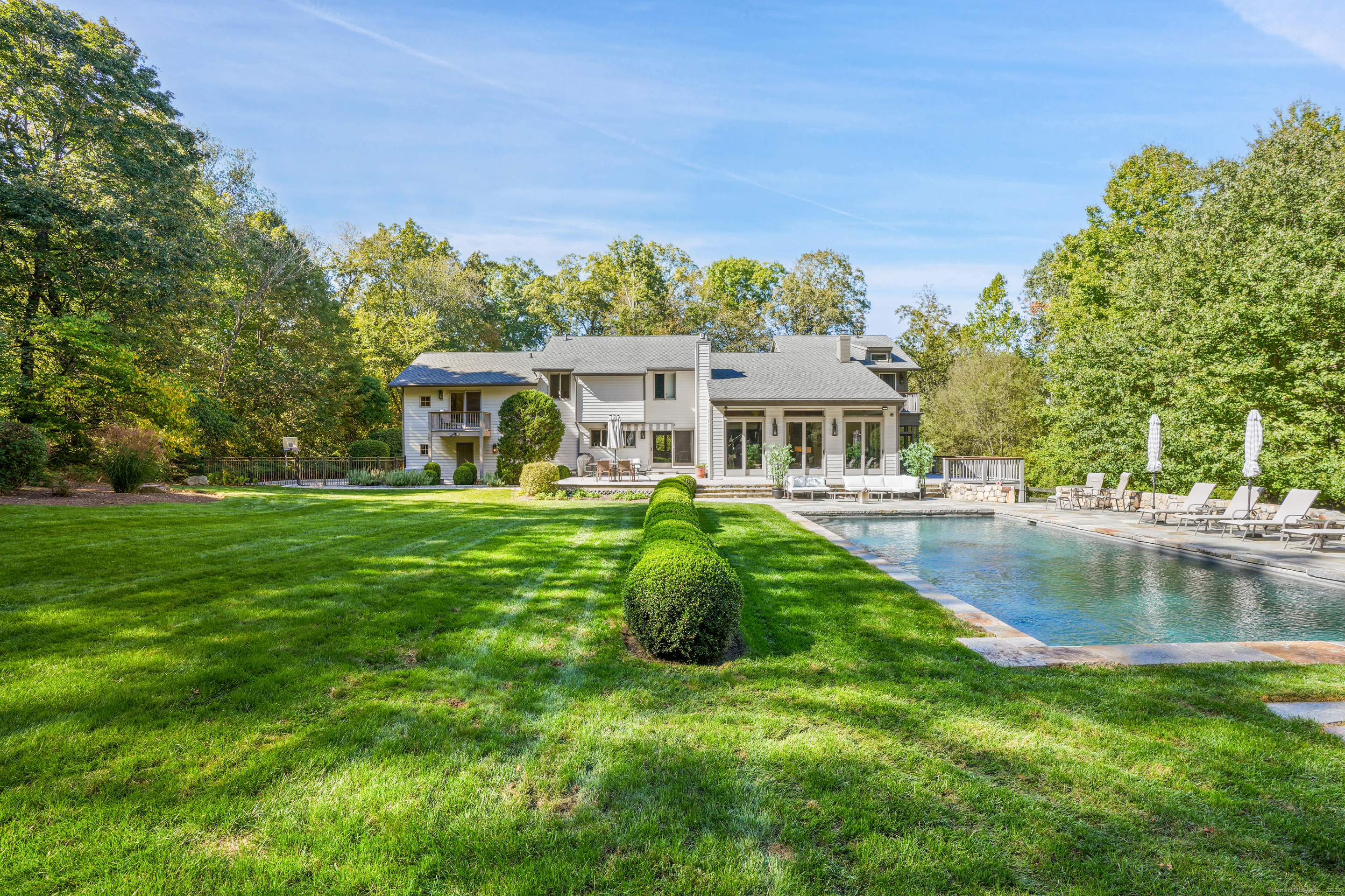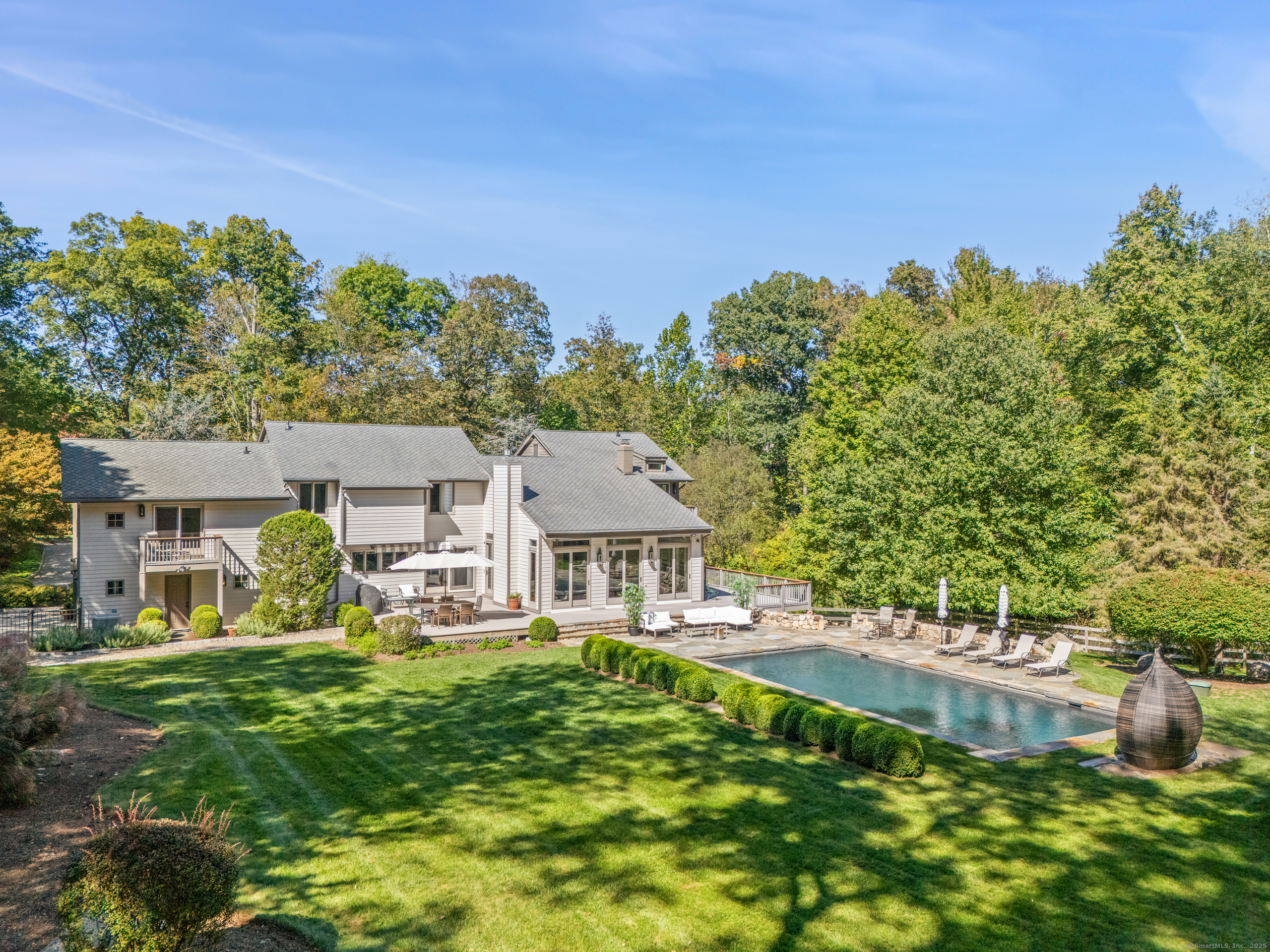 Set on more than two acres of exquisite, park-like property in the coveted Red Coat estate section of Westport, this spectacular modern home with a glorious gunite pool offers an ideal lifestyle. A designer's own residence, this home showcases uncompromising quality with intuitive features. The landscaped approach begins with a large stone parking court that accommodates entertaining on a grand scale. The dramatic entrance leads to a soaring foyer with custom stairs, where the sun-filled interiors begin to unfold and glimpses of the glorious rear property and pool come into view. The grand-scale Great Room w/gas fireplace has windows & doors on three sides, brining in light and views. The fam rm has a professional media system to bring your favorite shows and games to the big screen, and access to the serene screened-in porch. The gourmet kitchen has style and flair w/concrete center island, stone counters, Sub Zero & Viking appls, wet bar w/beverage chiller, lrg pantry, built-in desk, dining area & access to the deck. The dining room has a custom built-in server, 3D ceiling design & doors to a covered deck. The flexible 2nd level has 5 BRs incl a grand primary suite w/two balconies, excellent closet space & a luxe bth w/glass shower & spa tub. All baths have been updated. The apt/guest wing w/priv entry, 2 rms, kitchenette & laundry is ideal for multi-generational living or anyone seeking privacy. Finished walk-out LL w/rec & office spaces. Many new improvements. Generator.