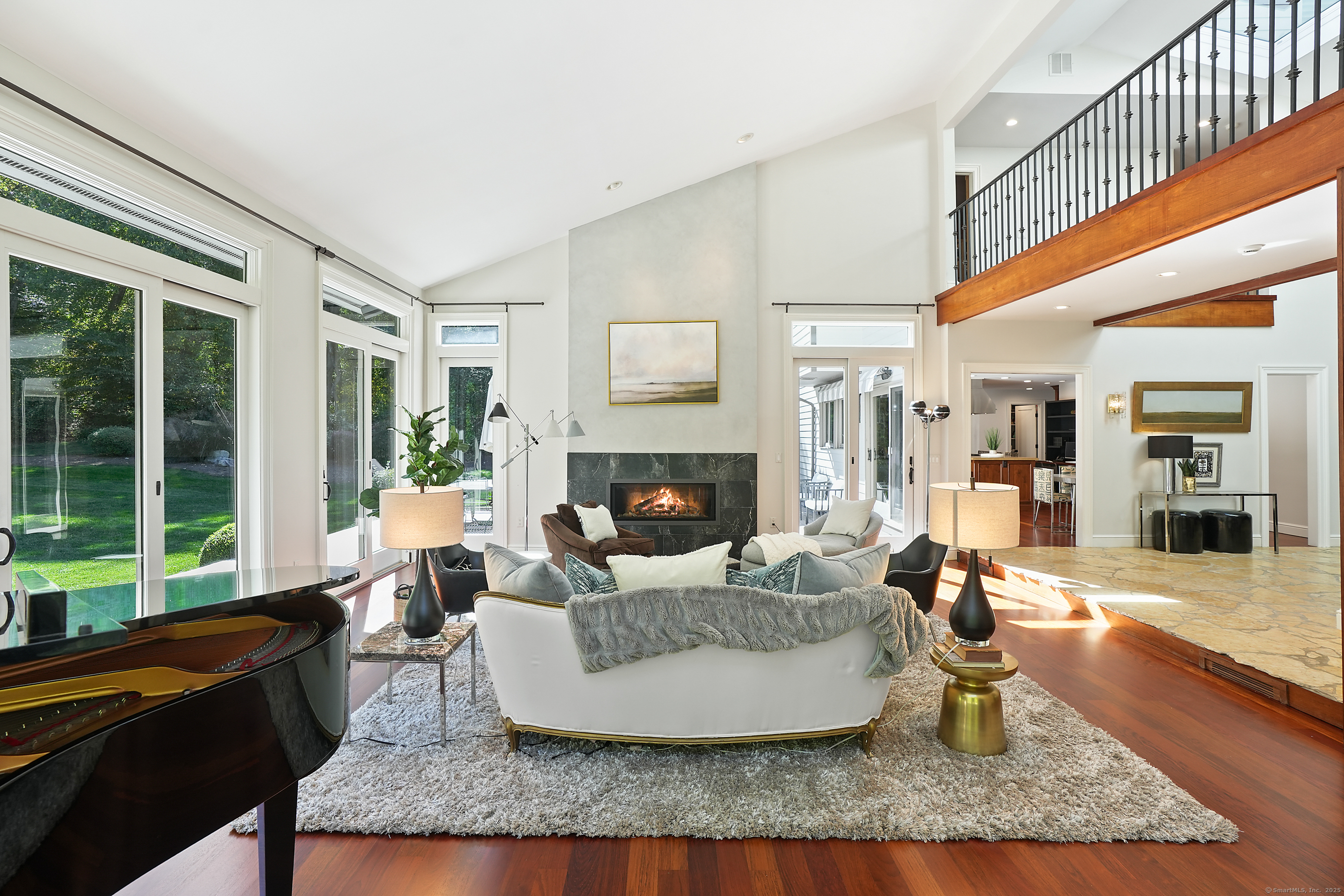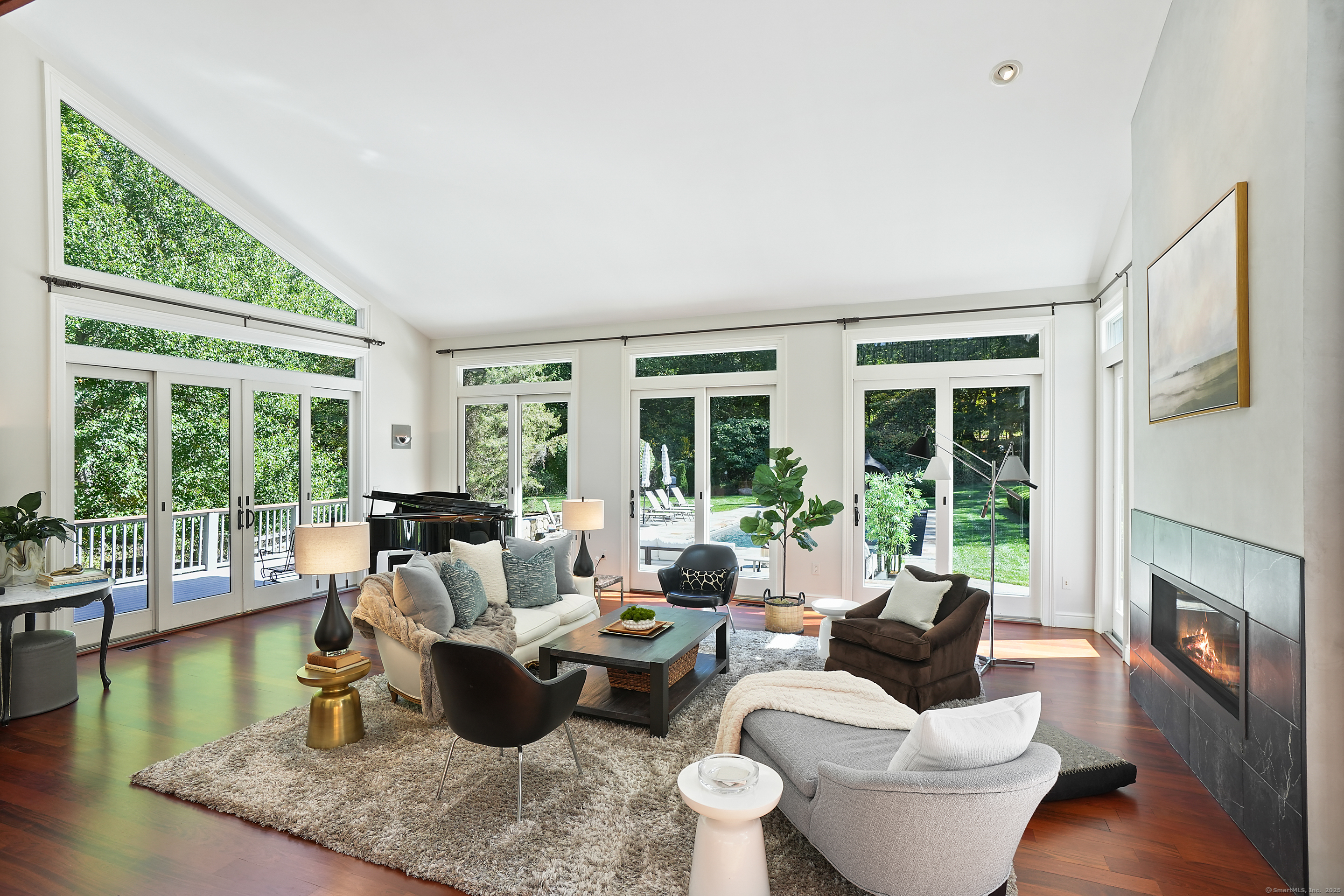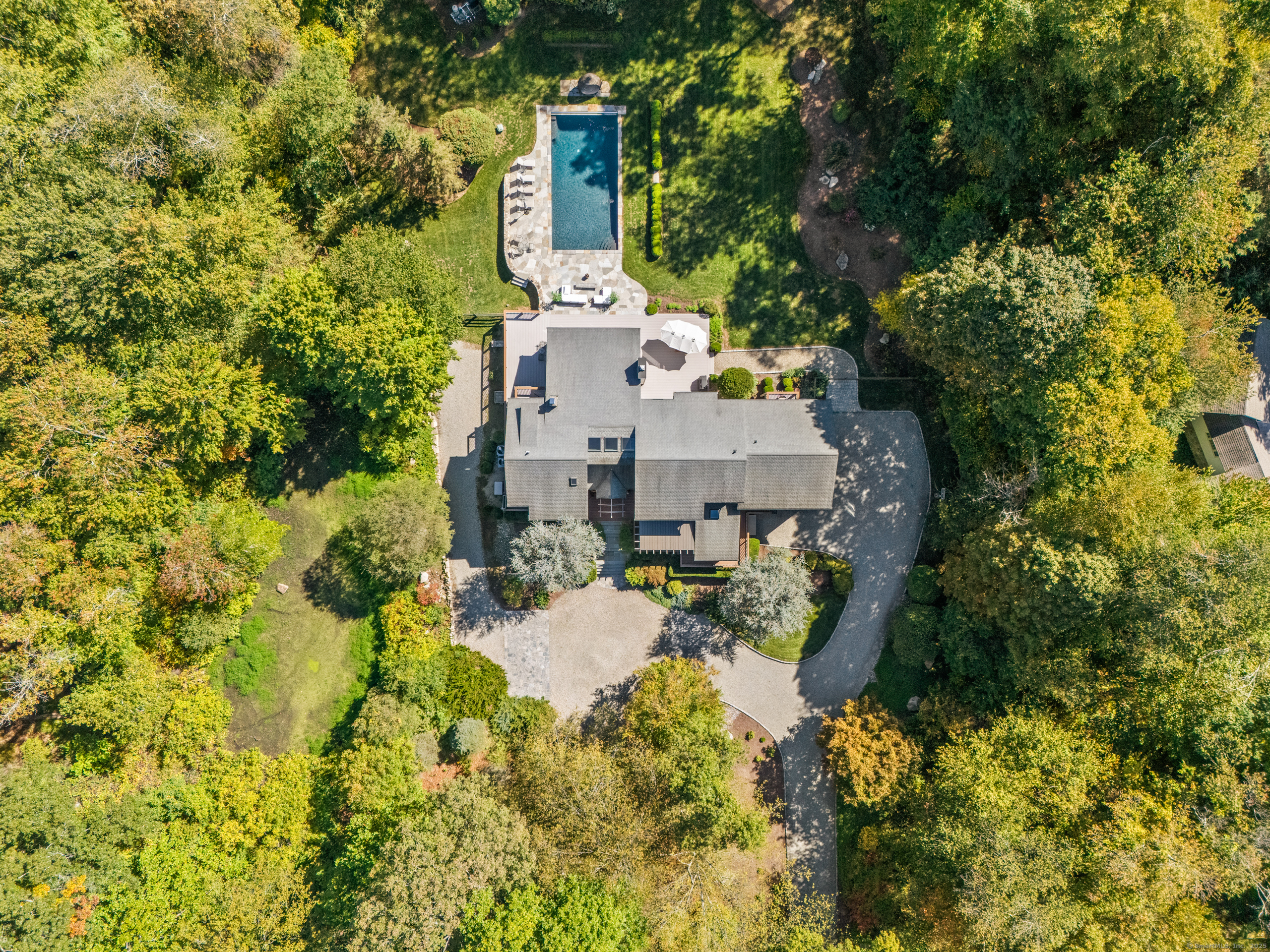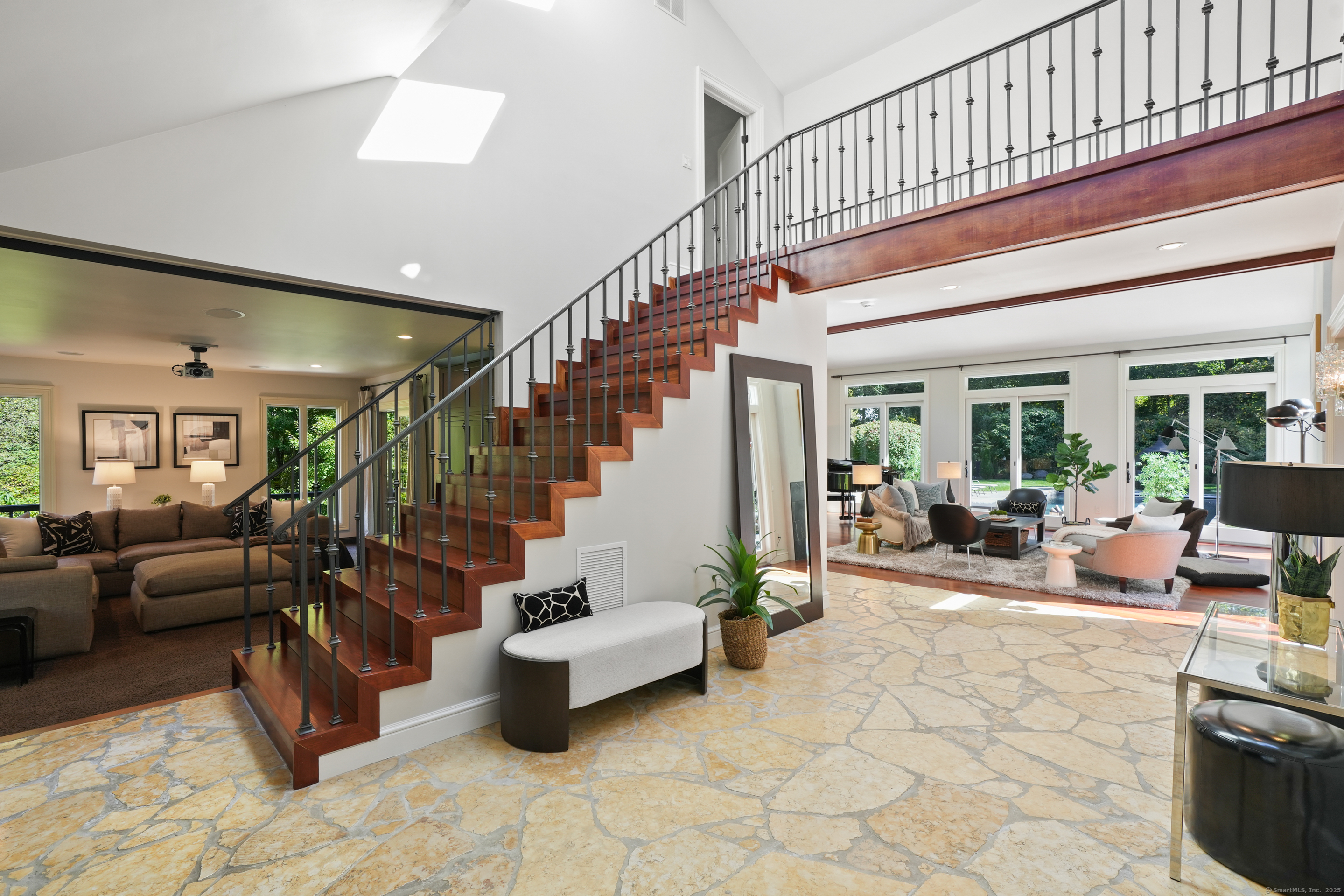 Set on more than two acres of exquisite, park-like property in the coveted Red Coat estate section of Westport, this spectacular modern home with a glorious gunite pool offers an ideal lifestyle. A designer's own residence, this home showcases uncompromising quality with intuitive features. The landscaped approach begins with a large stone parking court that accommodates entertaining on a grand scale. The dramatic entrance leads to a soaring foyer with custom stairs, where the sun-filled interiors begin to unfold and glimpses of the glorious rear property and pool come into view. The grand-scale Great Room w/gas fireplace has windows & doors on three sides, brining in light and views. The fam rm has a professional media system to bring your favorite shows and games to the big screen, and access to the serene screened-in porch. The gourmet kitchen has style and flair w/concrete center island, stone counters, Sub Zero & Viking appls, wet bar w/beverage chiller, lrg pantry, built-in desk, dining area & access to the deck. The dining room has a custom built-in server, 3D ceiling design & doors to a covered deck. The flexible 2nd level has 5 BRs incl a grand primary suite w/two balconies, excellent closet space & a luxe bth w/glass shower & spa tub. All baths have been updated. The apt/guest wing w/priv entry, 2 rms, kitchenette & laundry is ideal for multi-generational living or anyone seeking privacy. Finished walk-out LL w/rec & office spaces. Many new improvements. Generator.