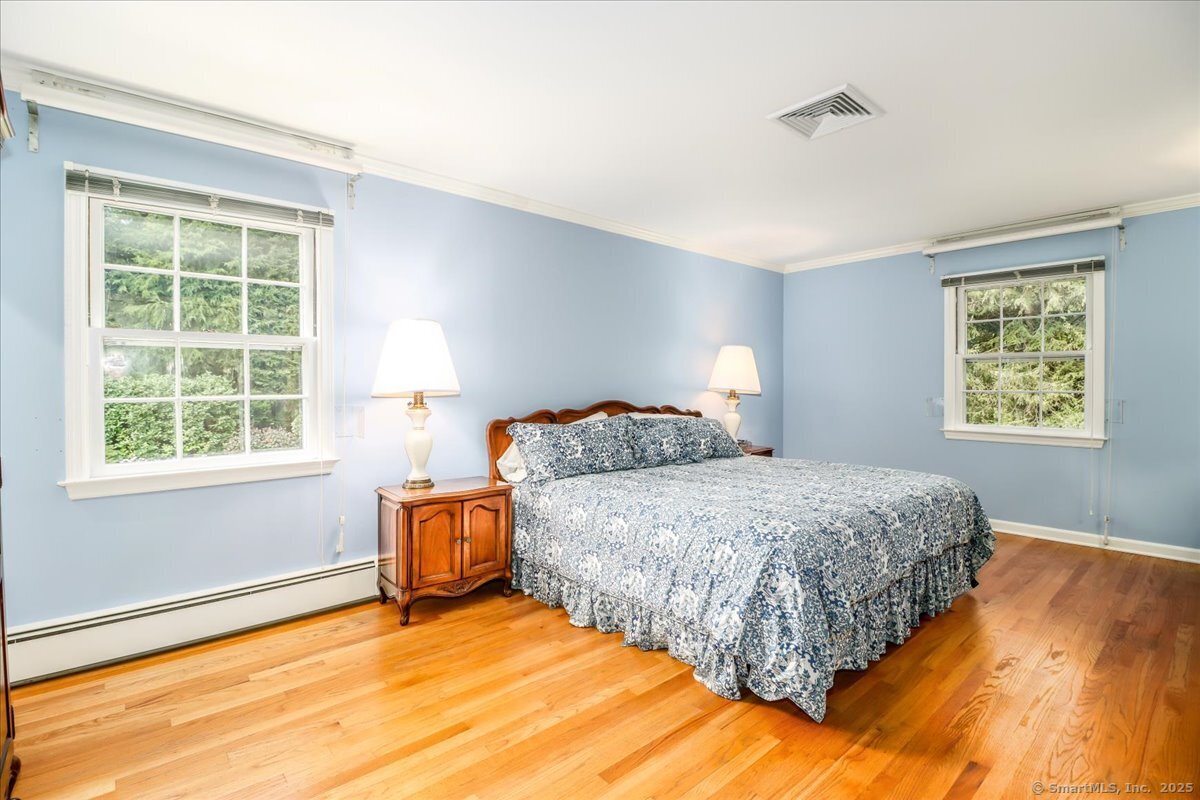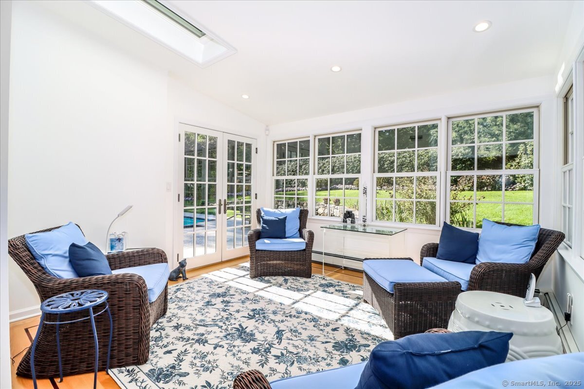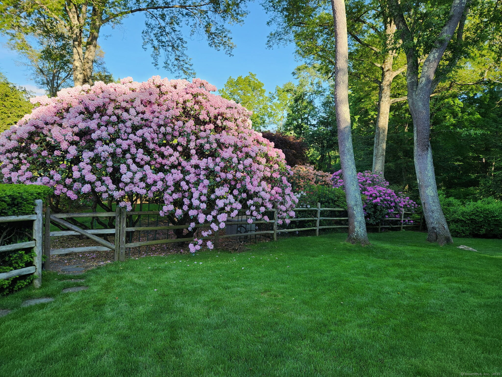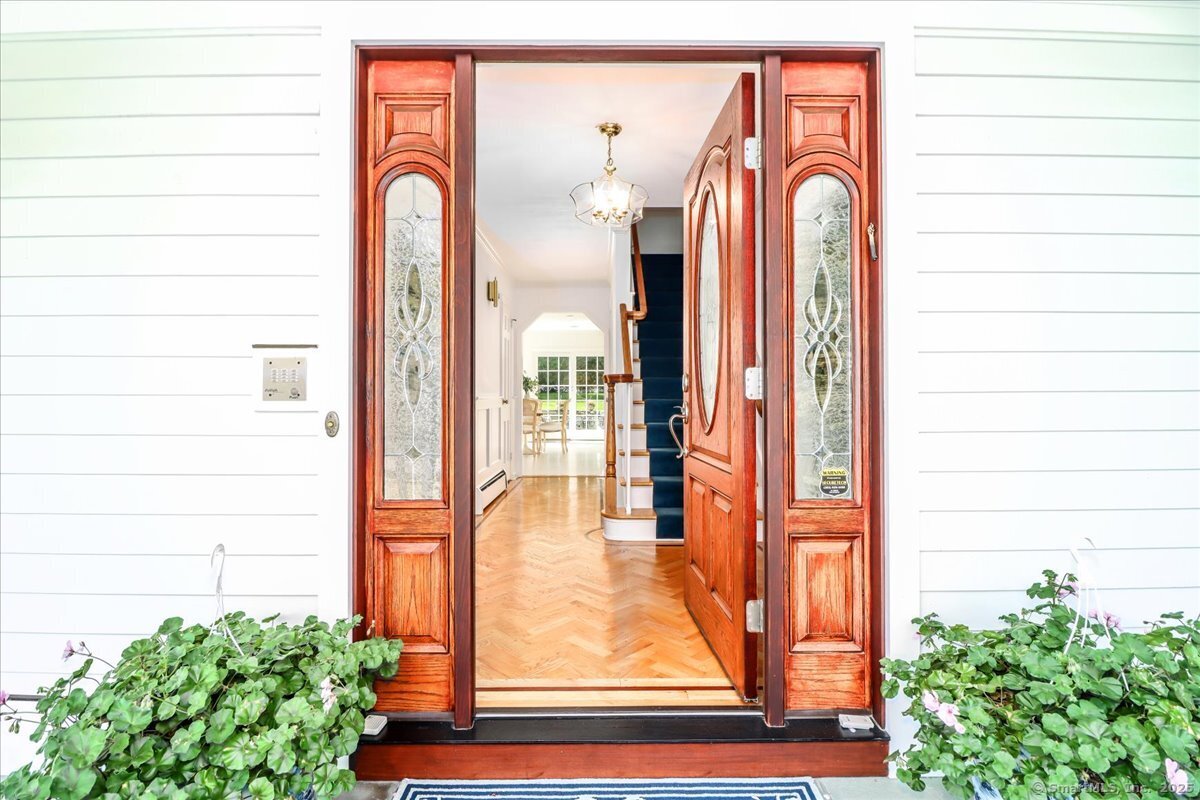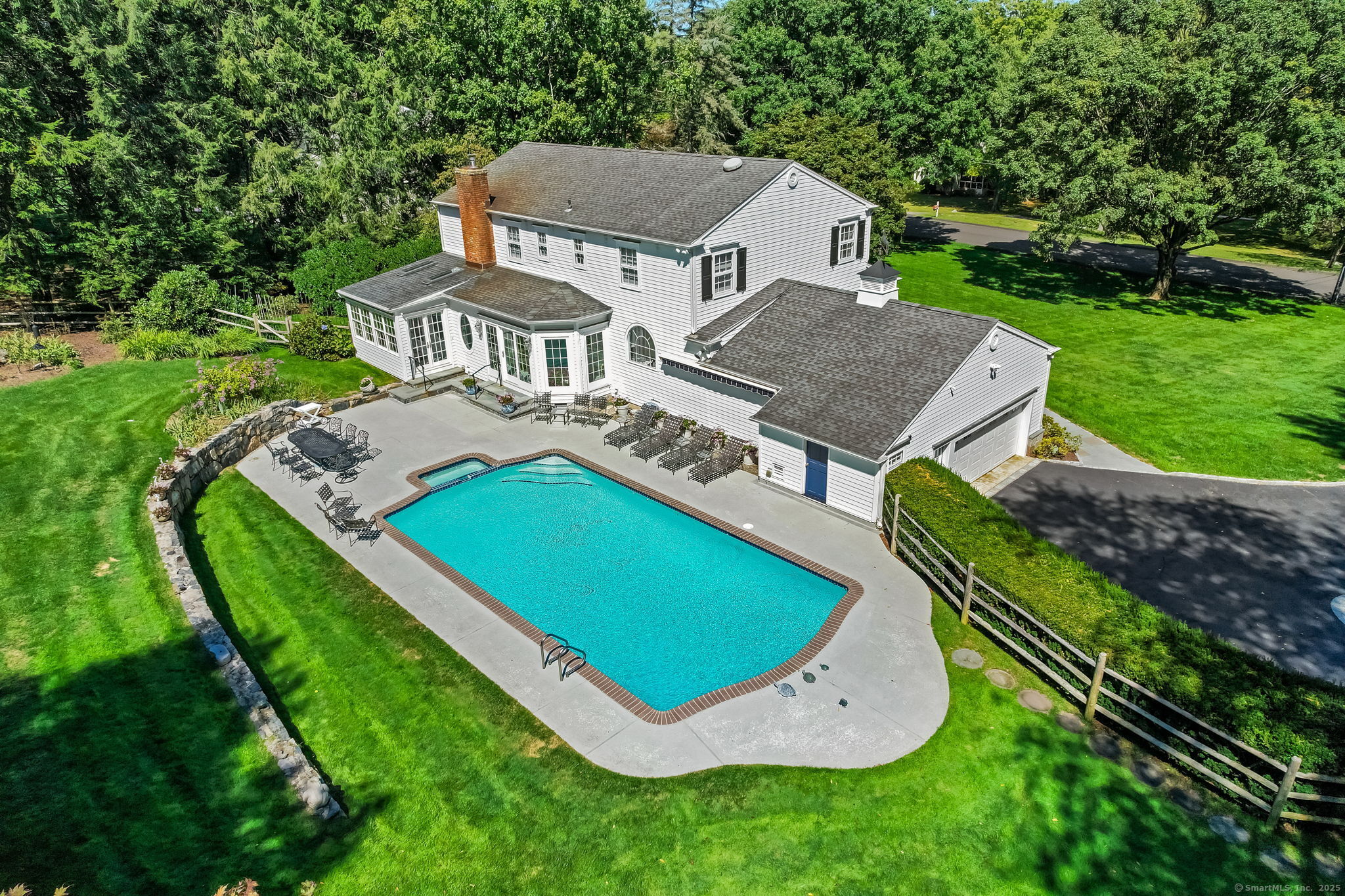 Nestled in one of North Stamford's most coveted cul-de-sac neighborhoods, come fall in love with this stunning, professionally landscaped & meticulously maintained home. Set on a picturesque park-like acre w/ heated in-ground pool, this home is perfect home for both entertaining & a private escape. A sweeping front lawn & stone walkway lead to a gracious full-length porch-the perfect spot for morning coffee or greeting neighbors. Inside, crown molding, wainscoting, & pristine hardwood floors run throughout. The foyer features stunning herringbone floors w/inlay, flanked by a spacious living room & formal dining room. The sun-drenched EIK offers side-by-side Sub-Zeros, double ovens, a large island, & abundant storage. Sliders from the dining area open to a private backyard retreat with a patio, retractable awning, & poolside changing room. A cozy family room w/fireplace & built-ins, a powder room, & a skylit sunroom w/French doors to the backyard complete the main level. Upstairs, the large primary suite includes a renovated bath & generous closets, while 3 large add'l bdrms share a hall bath. The finished LL provides versatile space for a gym, office, or playroom, plus add'l garage access. A spotless oversized garage, whole-house generator, stone walls, mature landscape, hardie board siding & fully fenced yard complete this exceptional home-minutes to downtown New Canaan, Scotts Corner, the Merritt Parkway & all Stamford has to offer. See feature sheet for add'l info.