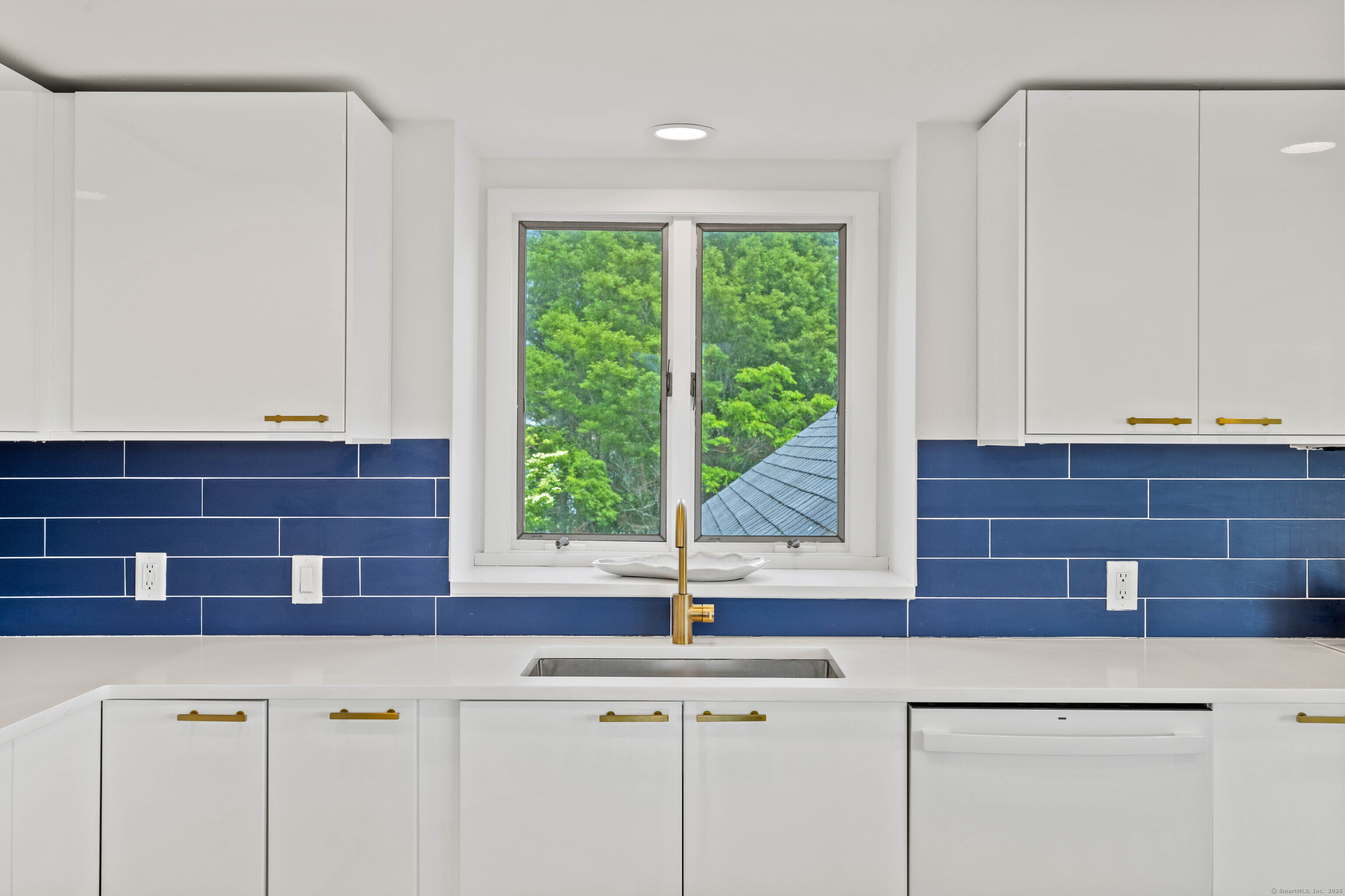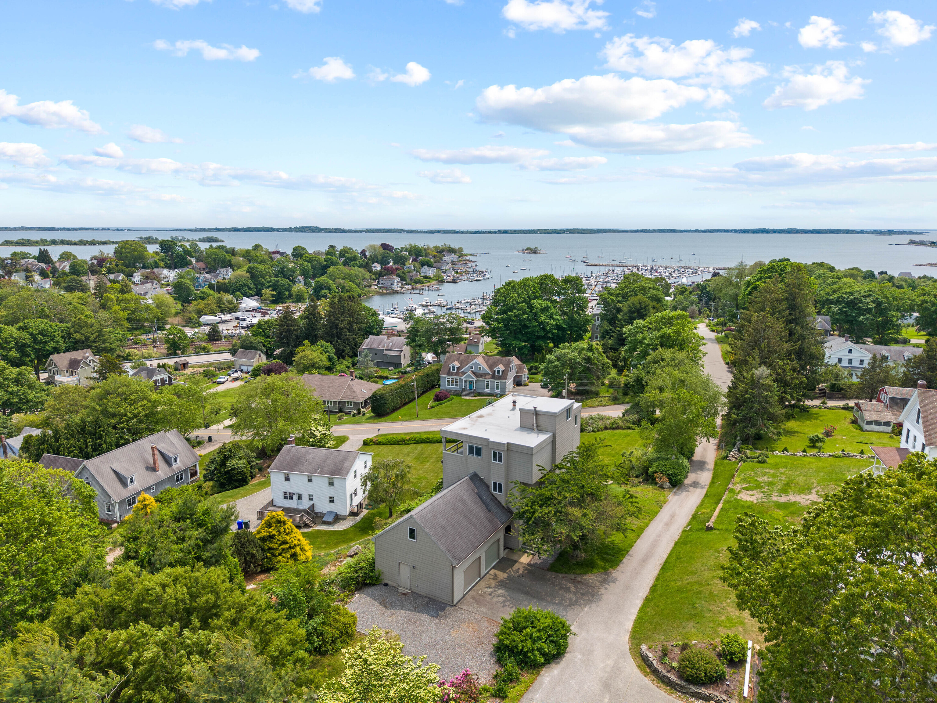 Perched above it all, enjoy treetop views of the Long Island Sound and Spicer's Marina. This architecturally striking contemporary offers soaring ceilings and walls of glass that flood the home with natural light! Inside, the open-concept kitchen and dining area feature sleek hardwood floors, modern white cabinetry, quartz countertops, a bold navy tile backsplash, chic appliances, a spacious island, and a built-in dry bar! Just a few steps down, the sunken living room offers cozy carpet, warm wood accents, and a fireplace with a granite hearth-perfect for chilly New England nights-all accentuating luxury, style, and comfort. Glass sliders throughout each room open to a breathtaking view deck-perfect for entertaining or soaking in sunsets that steal the show! At the top of the home, a crow's nest-style office provides a sun-drenched space that feels like the helm of a ship! With nearly 2,800 Sq/Ft, this 4-bedroom home includes a stunning primary suite with two walk-in closets, in-suite laundry, and a private balcony just above the main deck with more sweeping sightlines. One lower-level bedroom also offers laundry hook ups, a walk-in closet and its own balcony with built-in seating. An enormous 2-car garage with an unfinished bonus area above offers future expansion potential. Located minutes from Spicer Park and beloved waterfront dining options including Abbot's, Costello's, and Haring's. This is your front row seat to the beauty and lifestyle of the Connecticut shoreline.