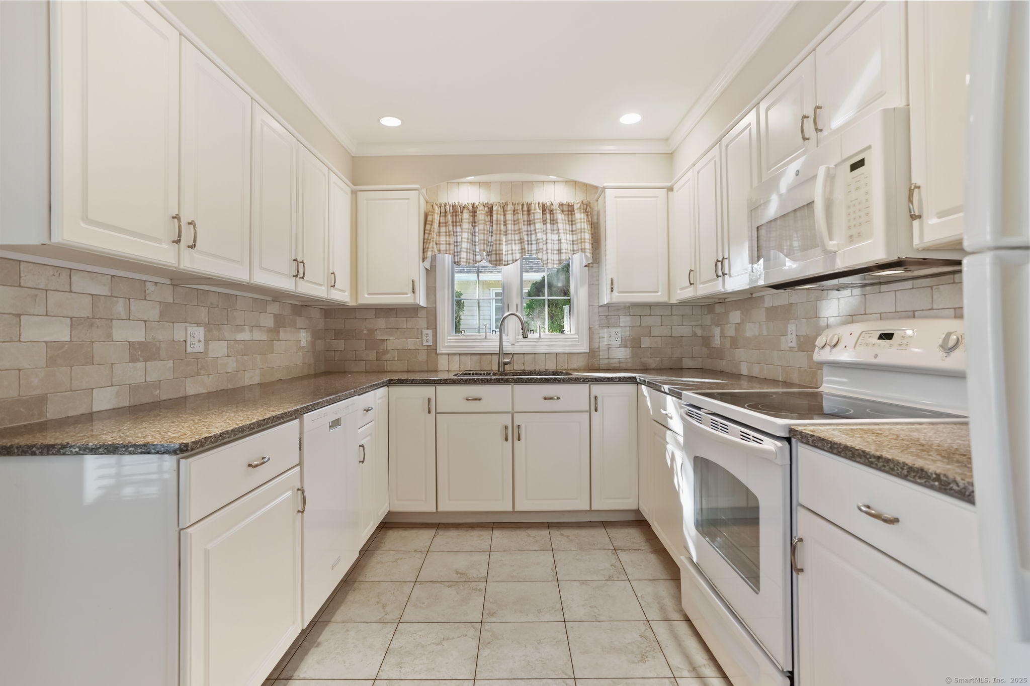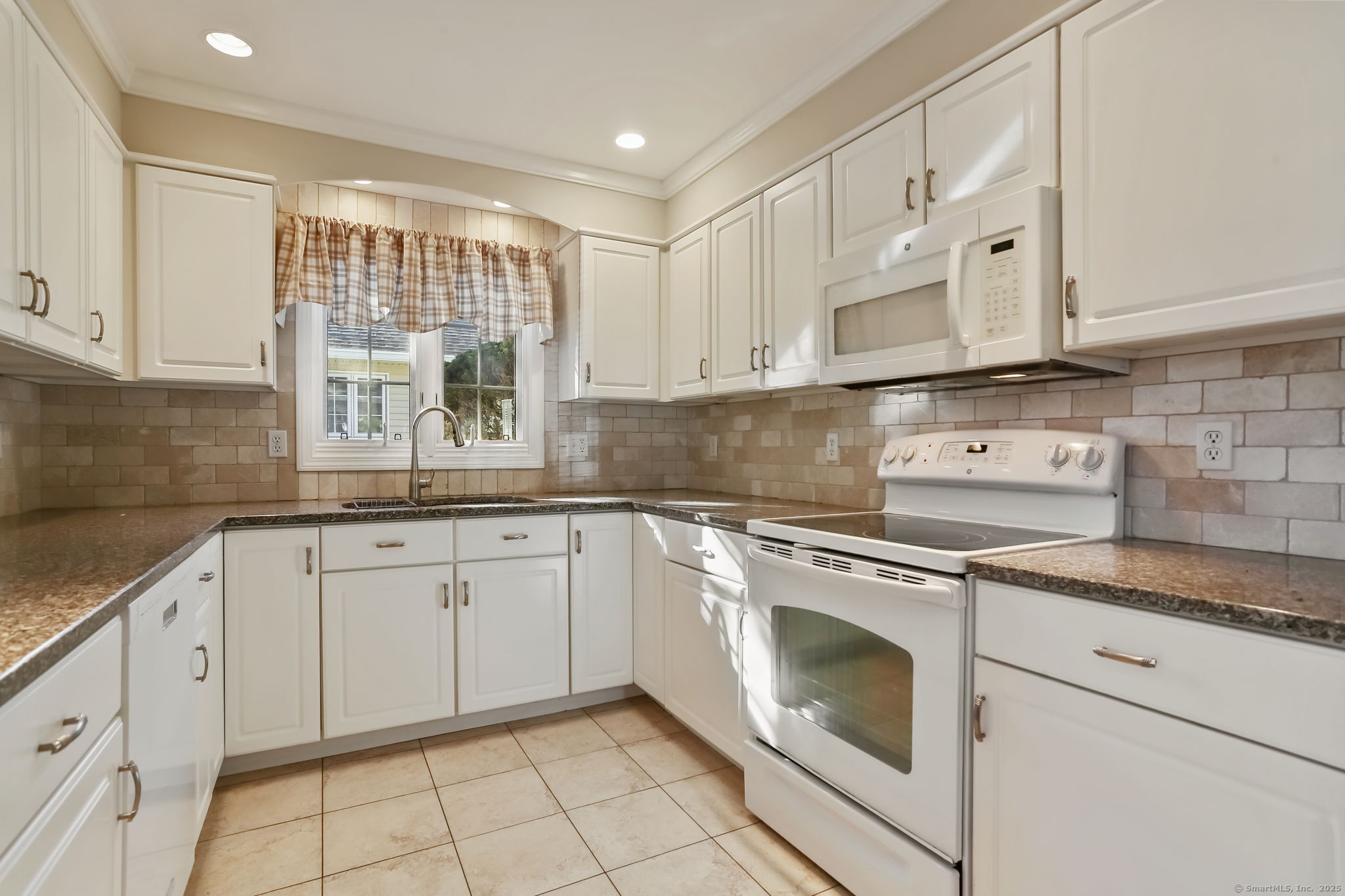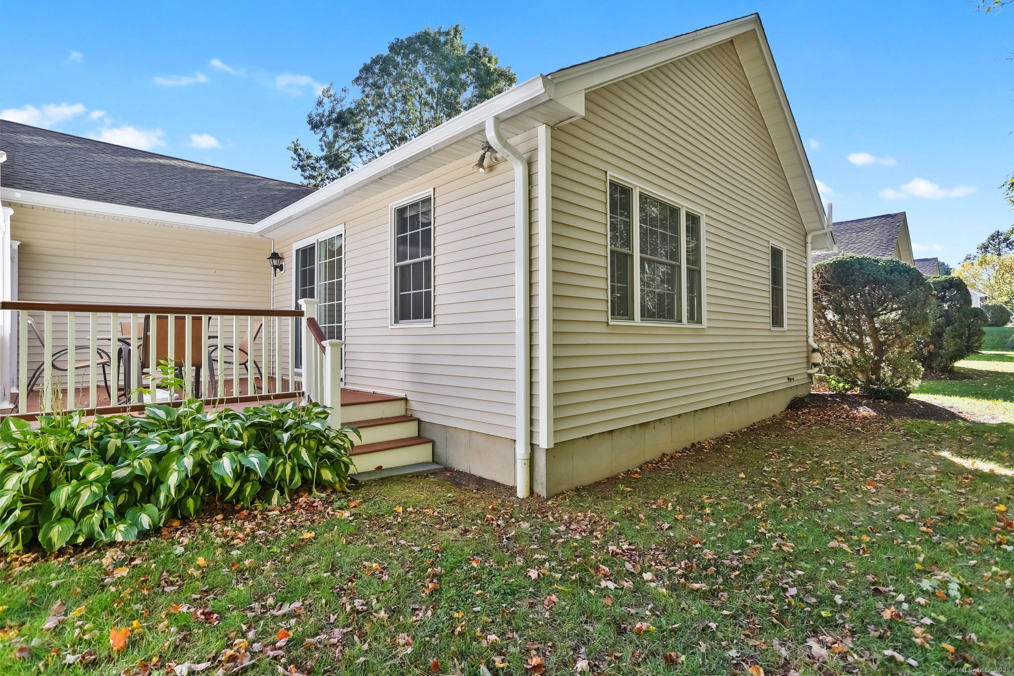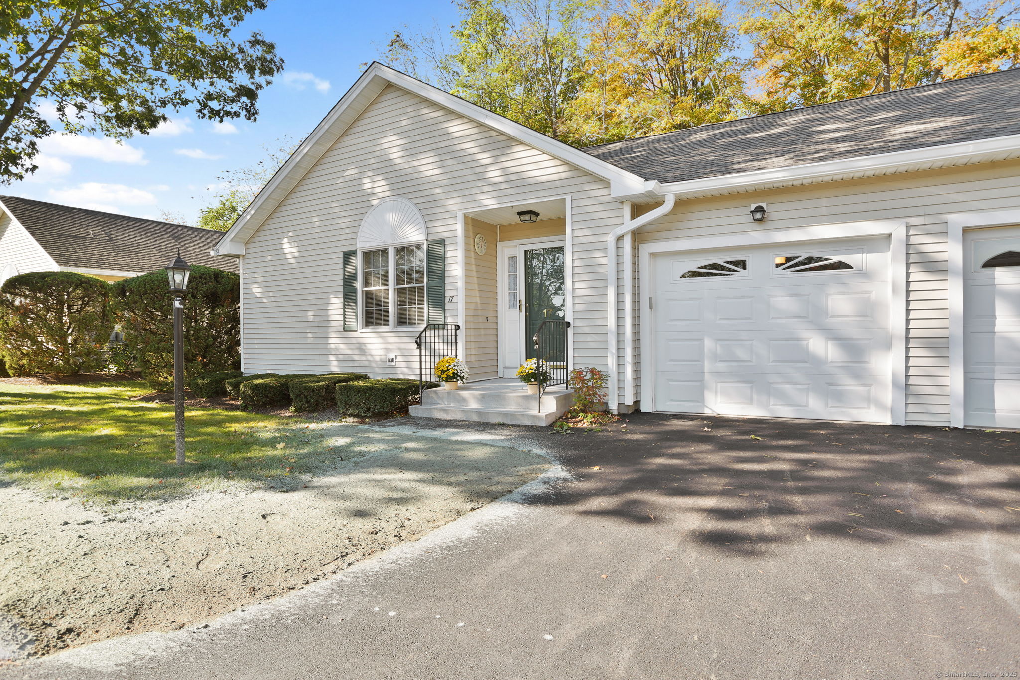 HIGHEST AND BEST BY SUNDAY, 11/2, BY 5PM. Welcome to one of the most desirable, centrally located 55+ complexes in town with meticulously manicured landscaping, and brand-new roads, roofs and gutters. Nestled in a prime location within the complex, find convenience and comfort with one-level living at its best in this freshly painted 2 BD / 2 BTH Ranch End Unit with attached garage. Inviting open floor plan, wide open tiled entryway, generously sized rooms, laminate flooring and a full unfinished basement offering plenty of storage and finishing potential. Lovely EIK features granite counters, tile backsplash, tile flooring, crown molding, recessed lighting and a pantry. Sun filled LR/DR touts vaulted ceilings and sliders that open to a private TREX deck, overlooking a serene backyard. The large primary BD showcases a vaulted ceiling, a walkin closet and a beautifully remodeled handicap accessible full bathroom with zero threshold shower and grab bars. A spacious second BD, a full hall bathroom with tub, and hall laundry area complete the main level. Brand new roof/gutters just completed in August '25, new furnace installed in December '24, and new railing at front door entry. Spacious attached garage also adds more storage. Clubhouse for community activities, meetings, games. Walk to shopping, library, town hall, concerts/fairs on the green, restaurants, post office and just a few minutes' drive to highways, mall, golf, parks, trails. Just move in and unpack!