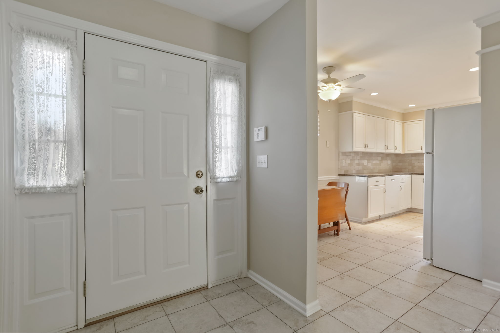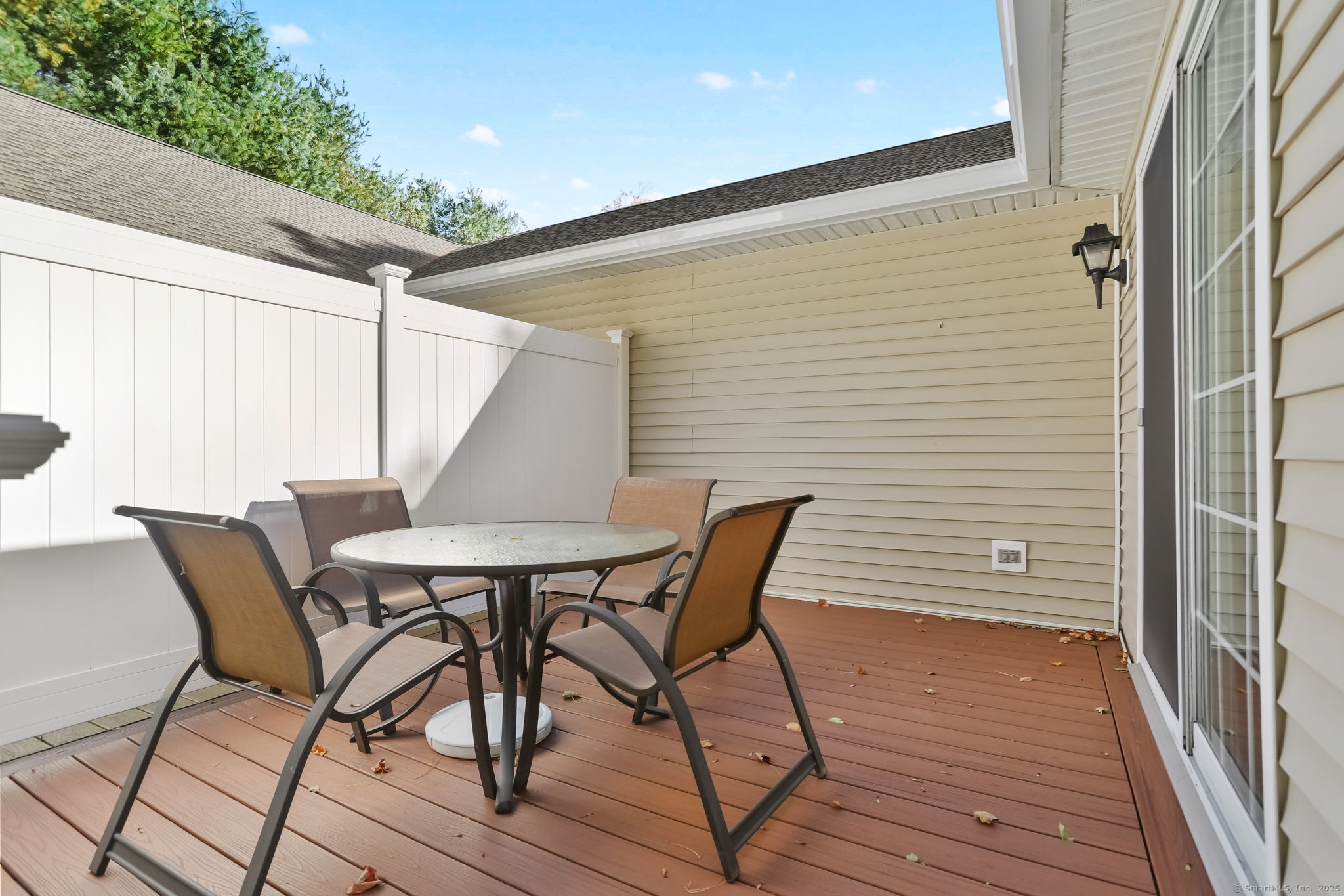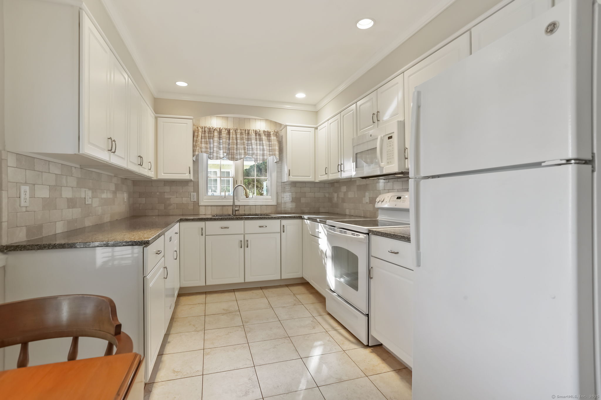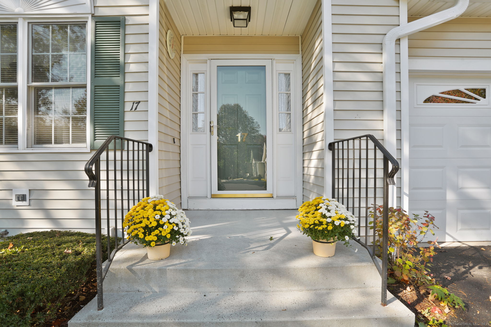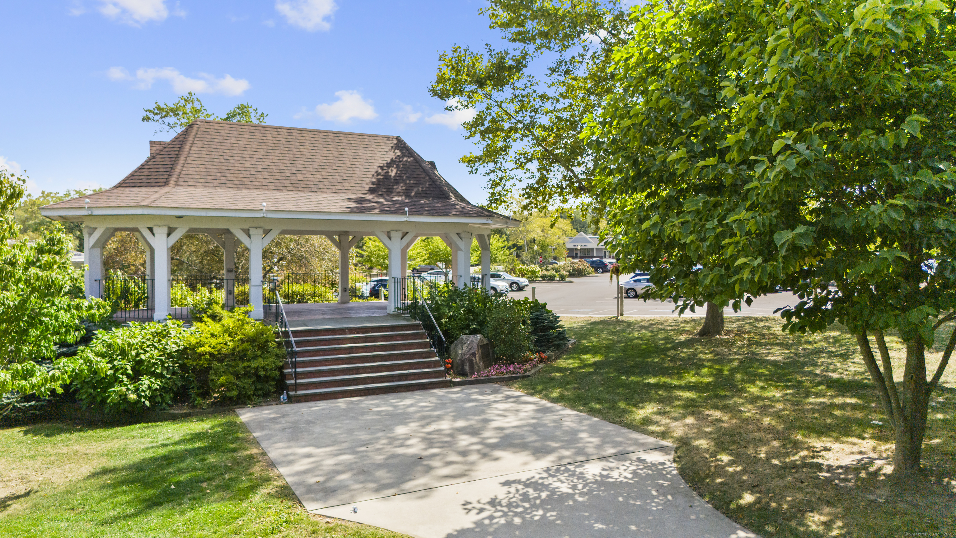 HIGHEST AND BEST BY SUNDAY, 11/2, BY 5PM. Welcome to one of the most desirable, centrally located 55+ complexes in town with meticulously manicured landscaping, and brand-new roads, roofs and gutters. Nestled in a prime location within the complex, find convenience and comfort with one-level living at its best in this freshly painted 2 BD / 2 BTH Ranch End Unit with attached garage. Inviting open floor plan, wide open tiled entryway, generously sized rooms, laminate flooring and a full unfinished basement offering plenty of storage and finishing potential. Lovely EIK features granite counters, tile backsplash, tile flooring, crown molding, recessed lighting and a pantry. Sun filled LR/DR touts vaulted ceilings and sliders that open to a private TREX deck, overlooking a serene backyard. The large primary BD showcases a vaulted ceiling, a walkin closet and a beautifully remodeled handicap accessible full bathroom with zero threshold shower and grab bars. A spacious second BD, a full hall bathroom with tub, and hall laundry area complete the main level. Brand new roof/gutters just completed in August '25, new furnace installed in December '24, and new railing at front door entry. Spacious attached garage also adds more storage. Clubhouse for community activities, meetings, games. Walk to shopping, library, town hall, concerts/fairs on the green, restaurants, post office and just a few minutes' drive to highways, mall, golf, parks, trails. Just move in and unpack!