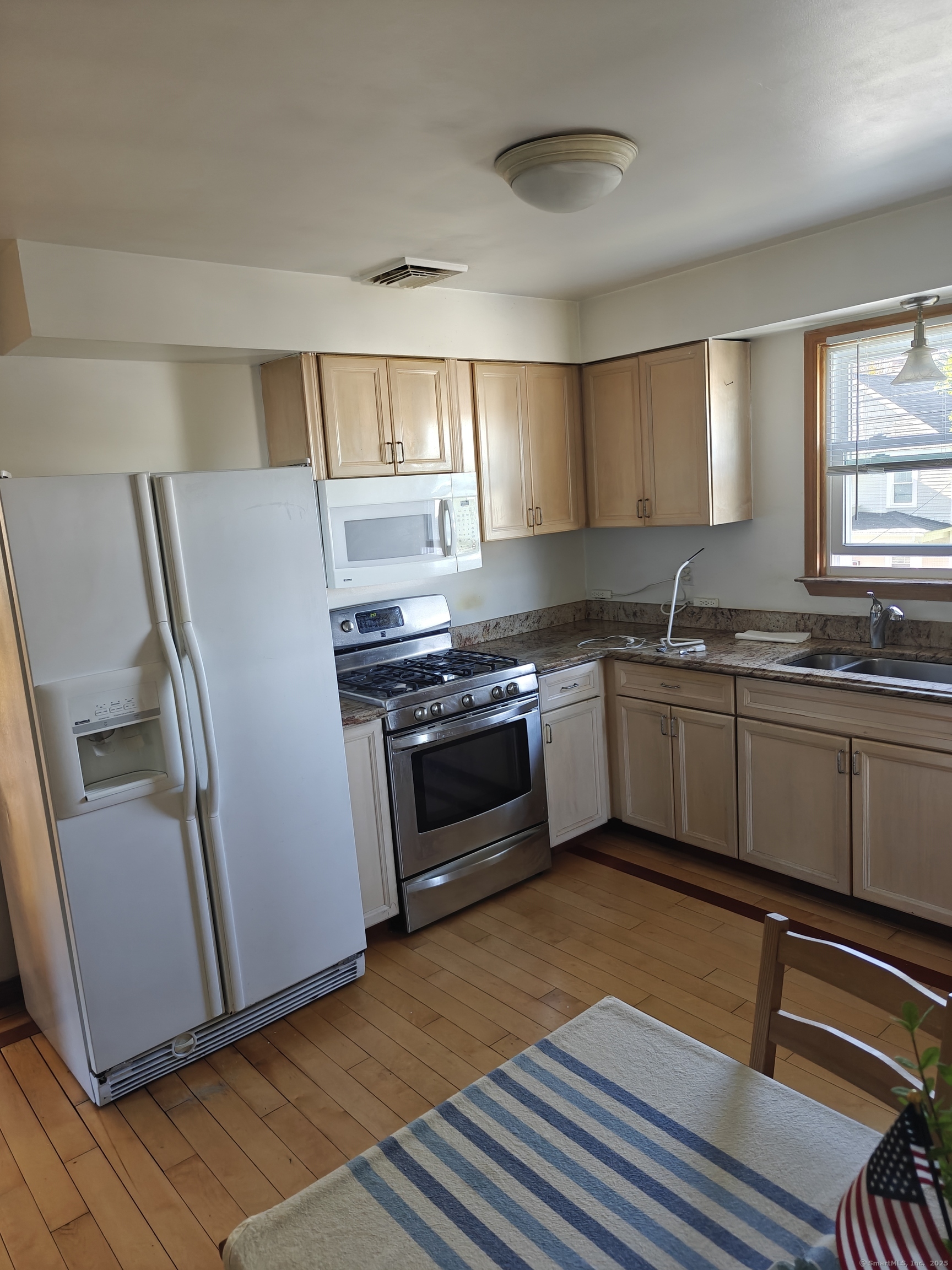 Here is your new residence. Clean and roomy 3 BR Apt. with 1288 square feet of living space. There's an eat in kitchen, gas range, less costly gas heat and dishwasher for your convenience. Cool off with C/A, plus beautiful hardwood flooring, and plenty of closet space. There's a relaxing backyard to enjoy. Sit among the flowers soak in the sun, breathe the fresh air and you're just a stroll away to a nearby Park. Forget trips to the Laundry Matt. A separate W/D for clothes is in the comfortable basement with a table and chair so you can sit and read or write your shopping list while waiting for your cleaned clothing. Updated with lots of windows for light, this is an easy commuter location to get you where you need to go! Off street parking is close to the back door. A really turn key apt. Ready for you to just move in!