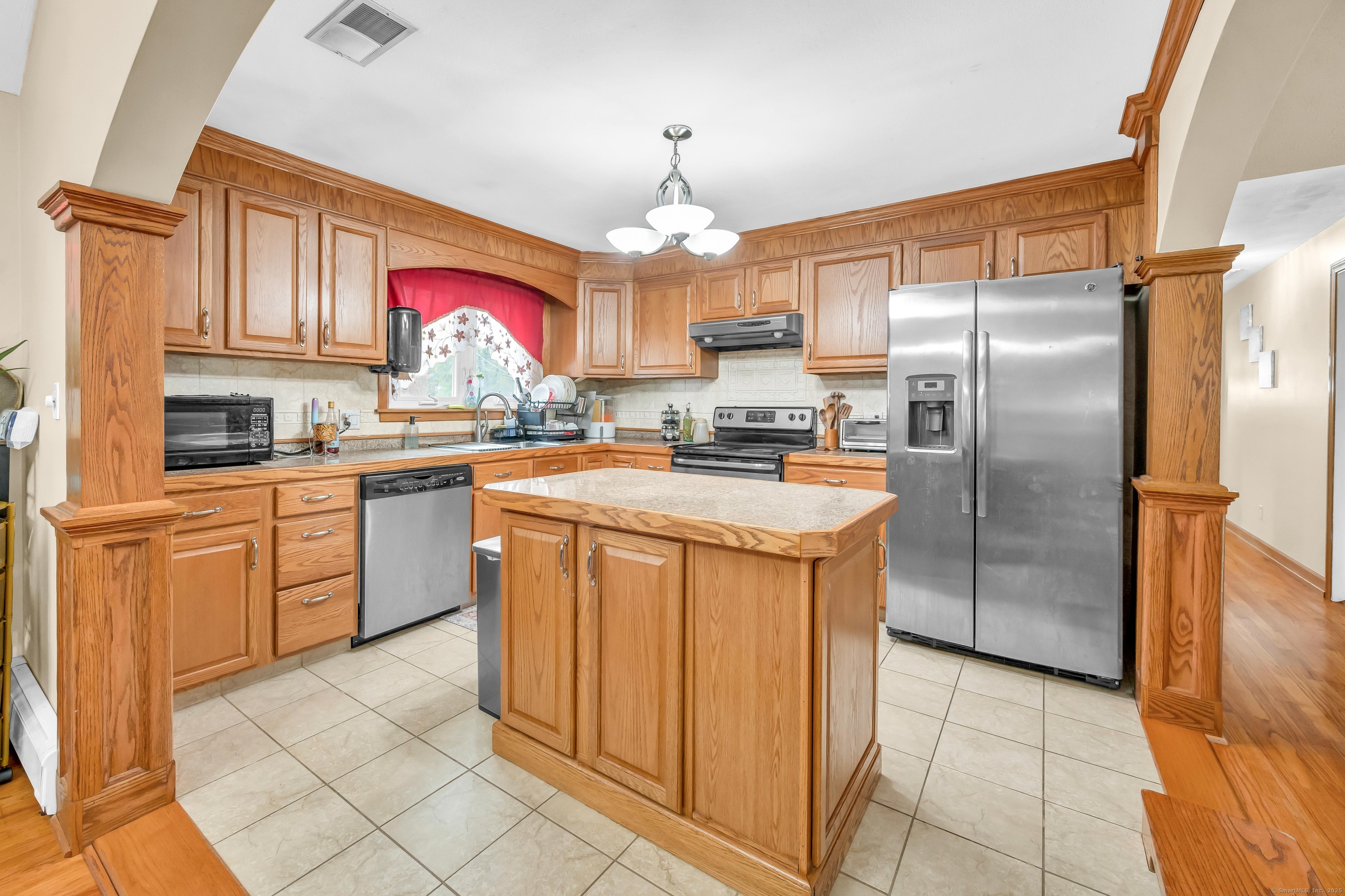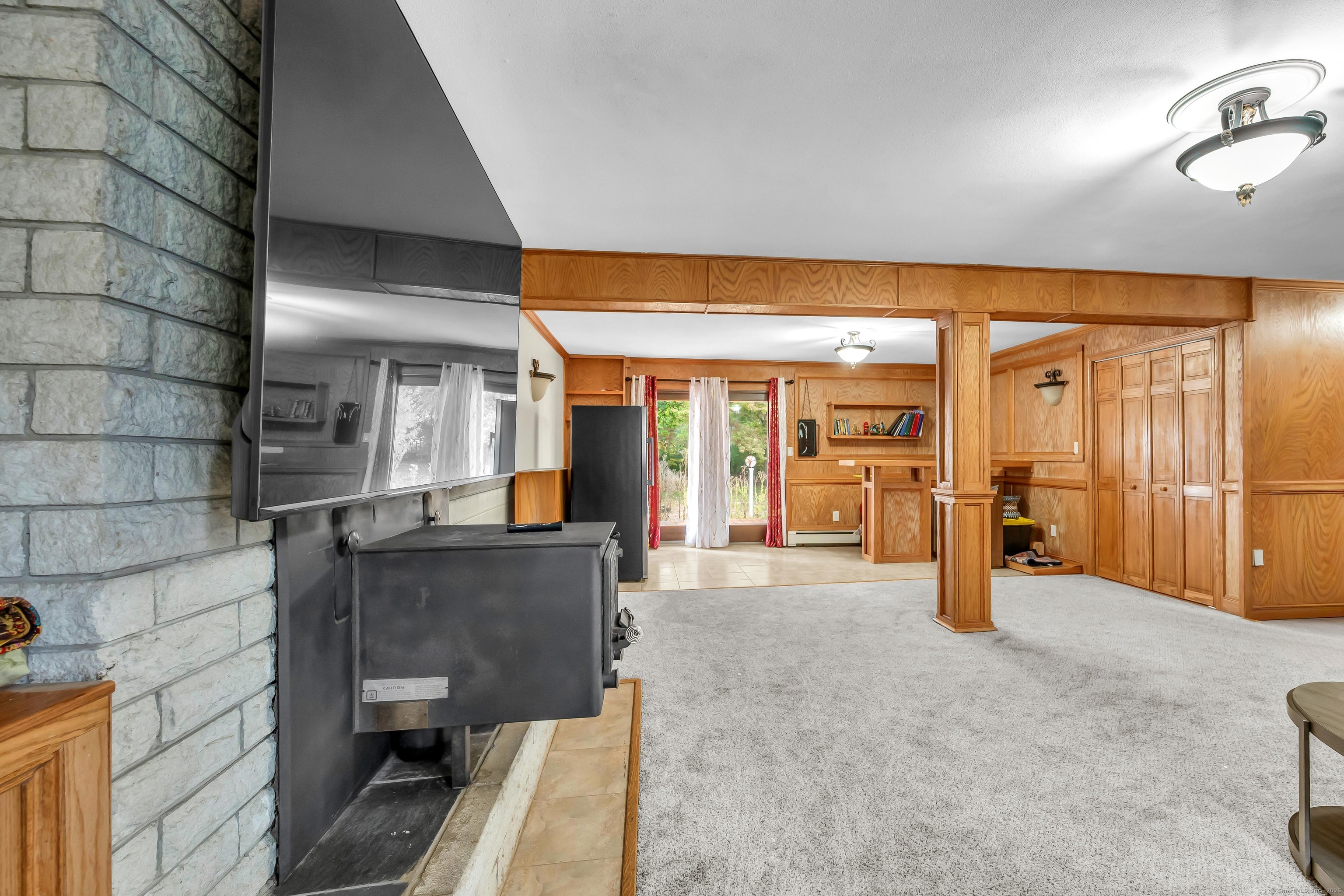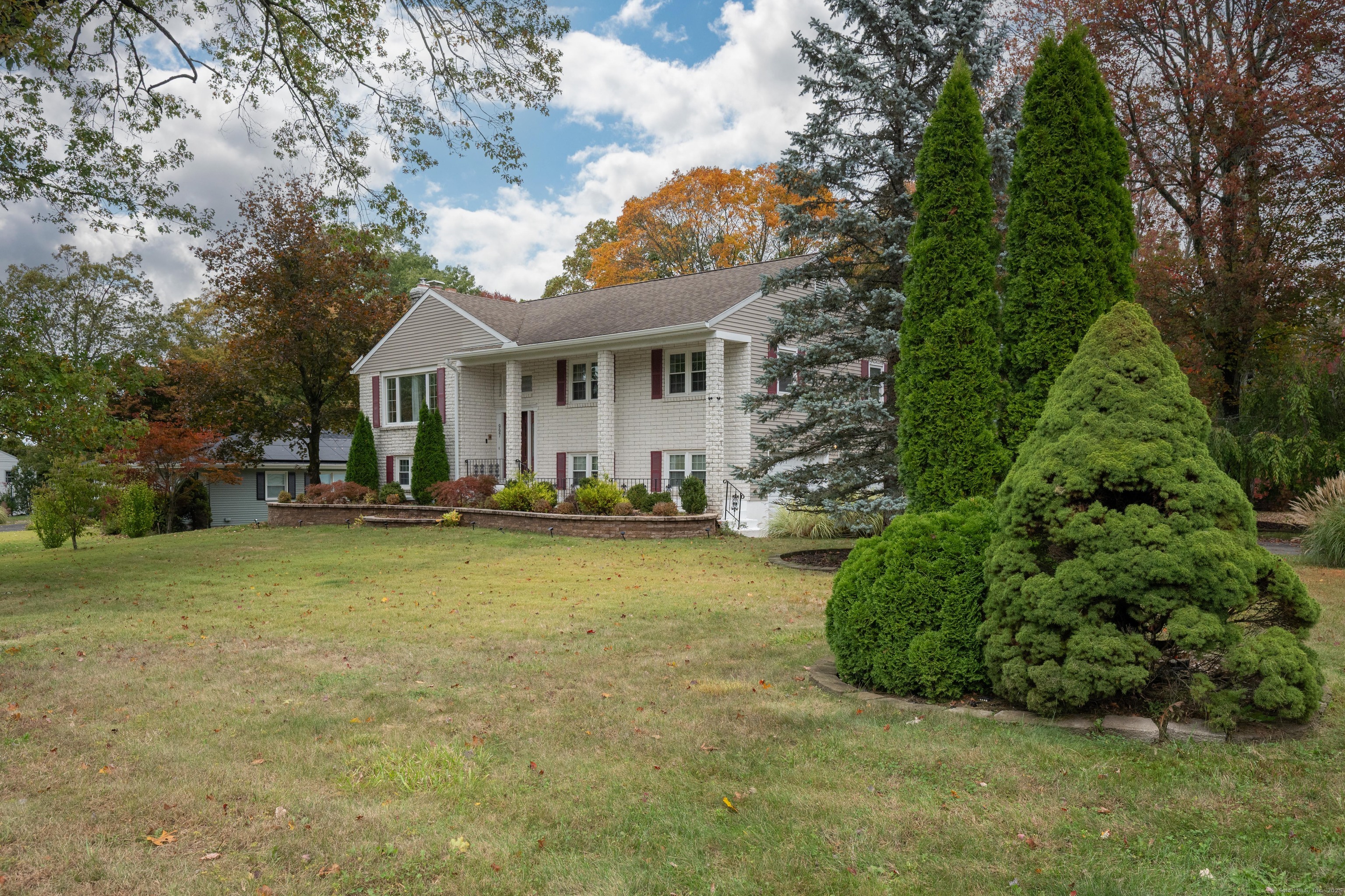 Spacious well maintained raised ranch on well manicured level corner lot waiting for its new owner to enjoy. Open bright living area features hardwood floors, cathedral ceilings and a stone fireplace. The kitchen features granite countertops, stainless steel appliances and ample cabinet space. Right off the formal dining room is a three season sunroom with views of the meticulously landscaped property where you can enjoy a morning coffee or afternoon tea. All three bedrooms are generously sized. The heated lower level features another fireplace with a wood-burning stove, wet bar, newer carpeting, additional bath, laundry, and walkout to the tiled patio. There is a large storage shed in the level backyard. The two car garage has a recessed area perfect for a work bench or storage. Public water and sewer is offered here as well.