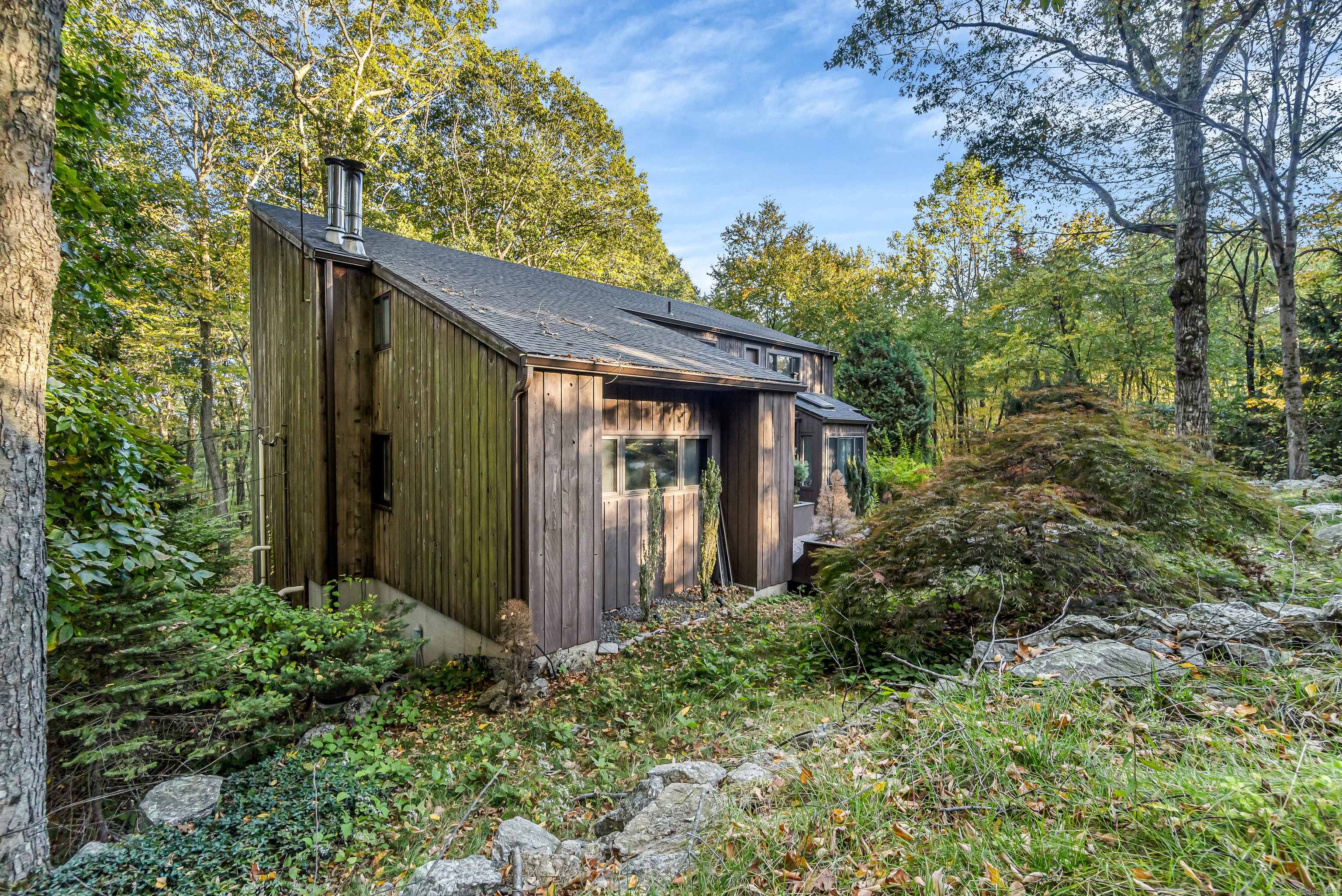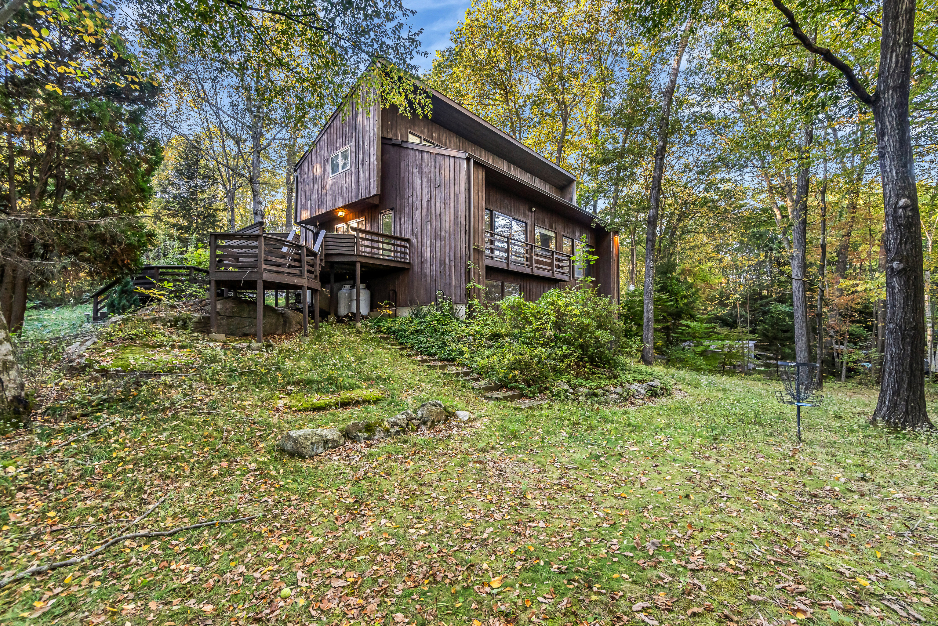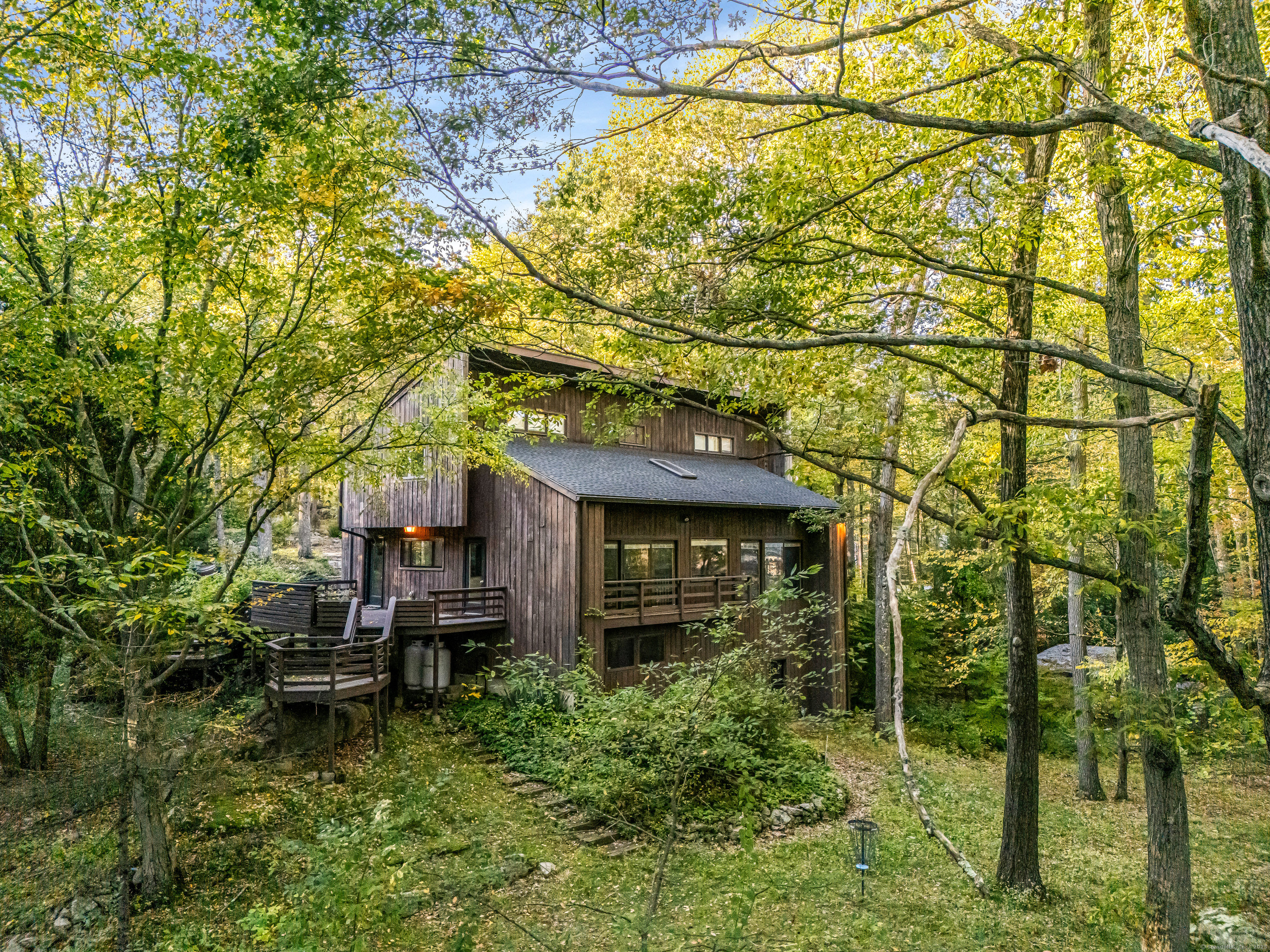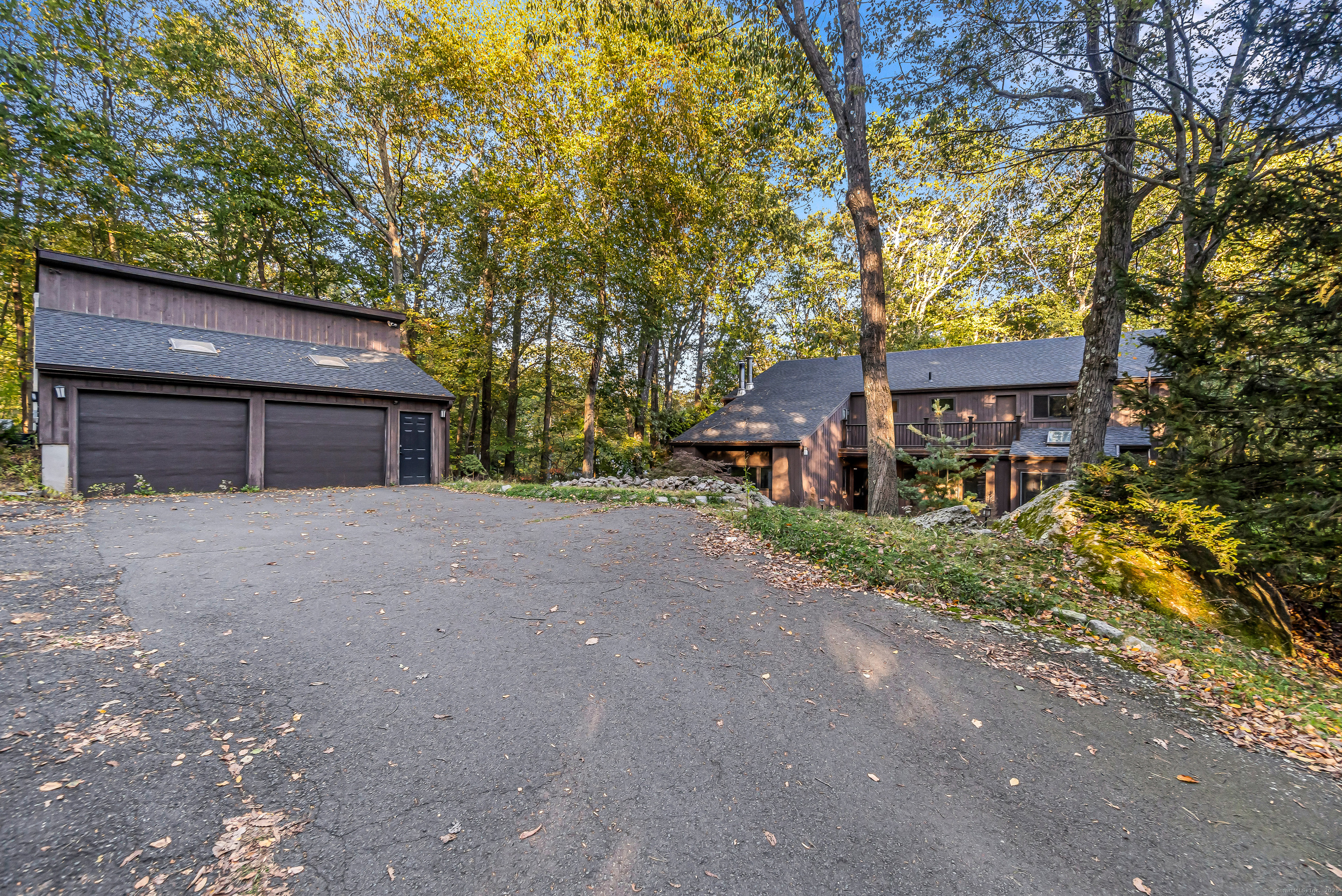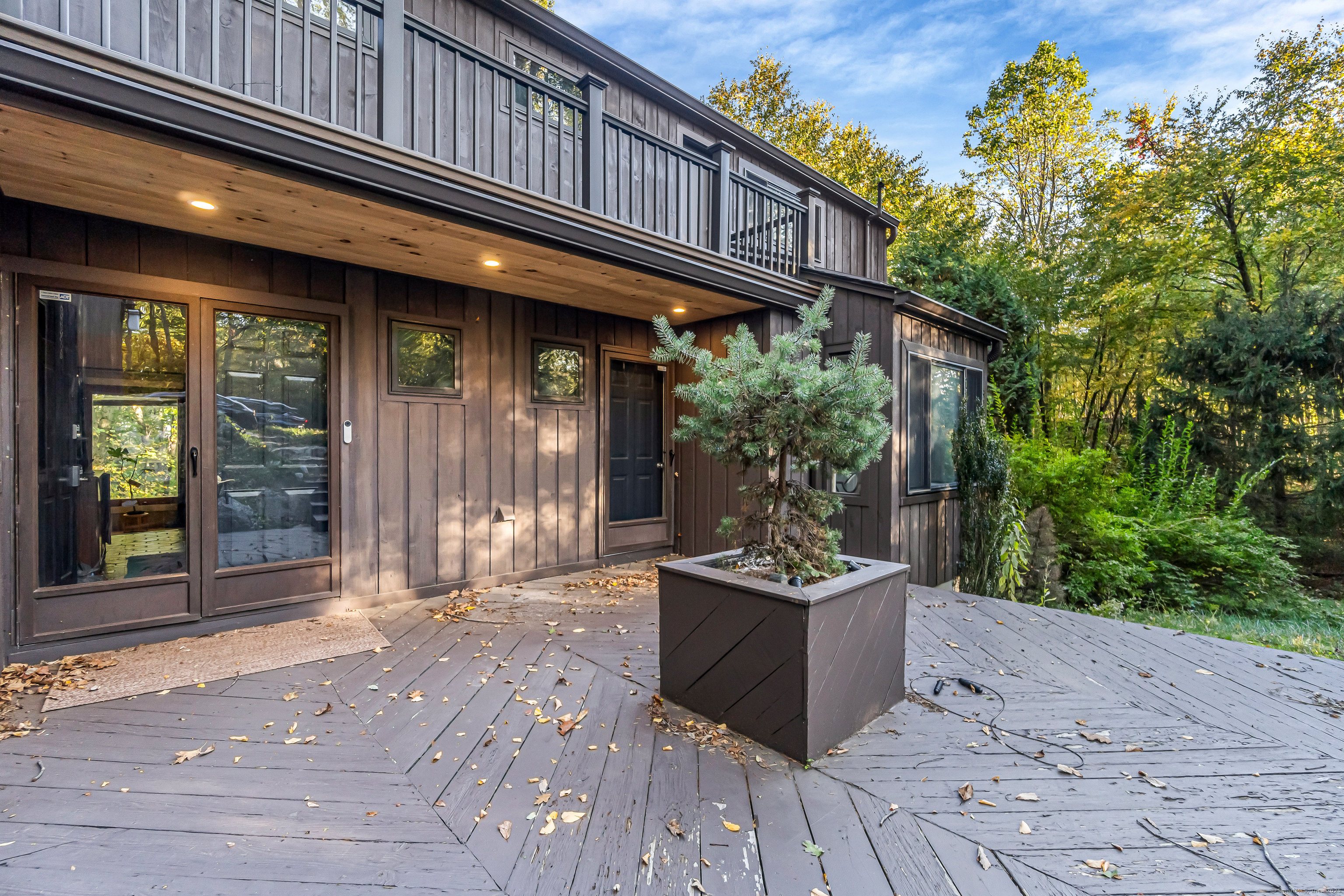 Tucked away on a peaceful cul-de-sac, this 3-bedroom, 3.5-bath Contemporary retreat blends architectural interest with warmth and function. Designed with multi-level living and dramatic sightlines, the home features a step-down living room, step-up dining area, and open staircase that brings in beautiful light and flow. Inside, you'll find vaulted ceilings, skylights, hardwood floors, and transom windows that create a bright and airy feel throughout. The spacious kitchen is ideal for the home chef - boasting granite countertops, abundant cabinetry, and high-end Jenn-Air and ASCO appliances. Upstairs, the primary suite opens to its own private deck - the perfect morning coffee spot. The finished lower level offers an additional 454 sq ft of versatile space, perfect for a recreation room, playroom, or home office. Outdoor living shines here, with multi-level decks featuring built-in seating and planters, a balcony deck off the dining room, and Pella sliders connecting indoor and outdoor spaces seamlessly. A detached two-car garage with loft/workshop provides room for hobbies, storage, or studio space. Set in a private, natural setting yet close to all local conveniences, 4 Old Gate Lane is more than a home - it's a peaceful lifestyle waiting for you.
