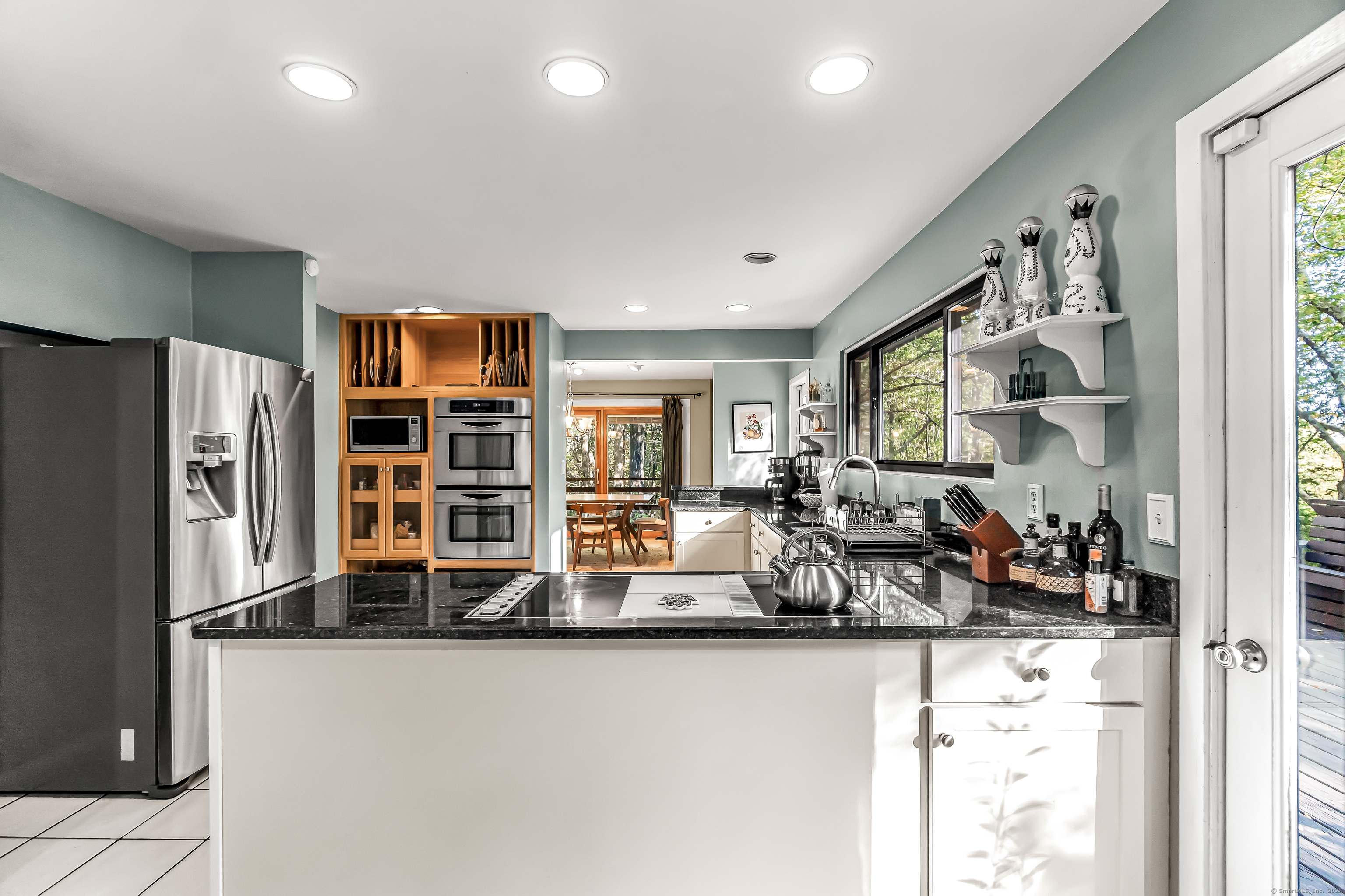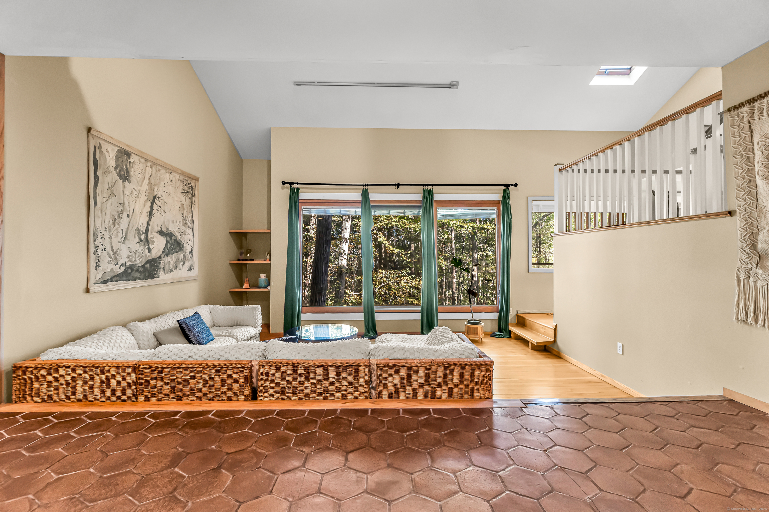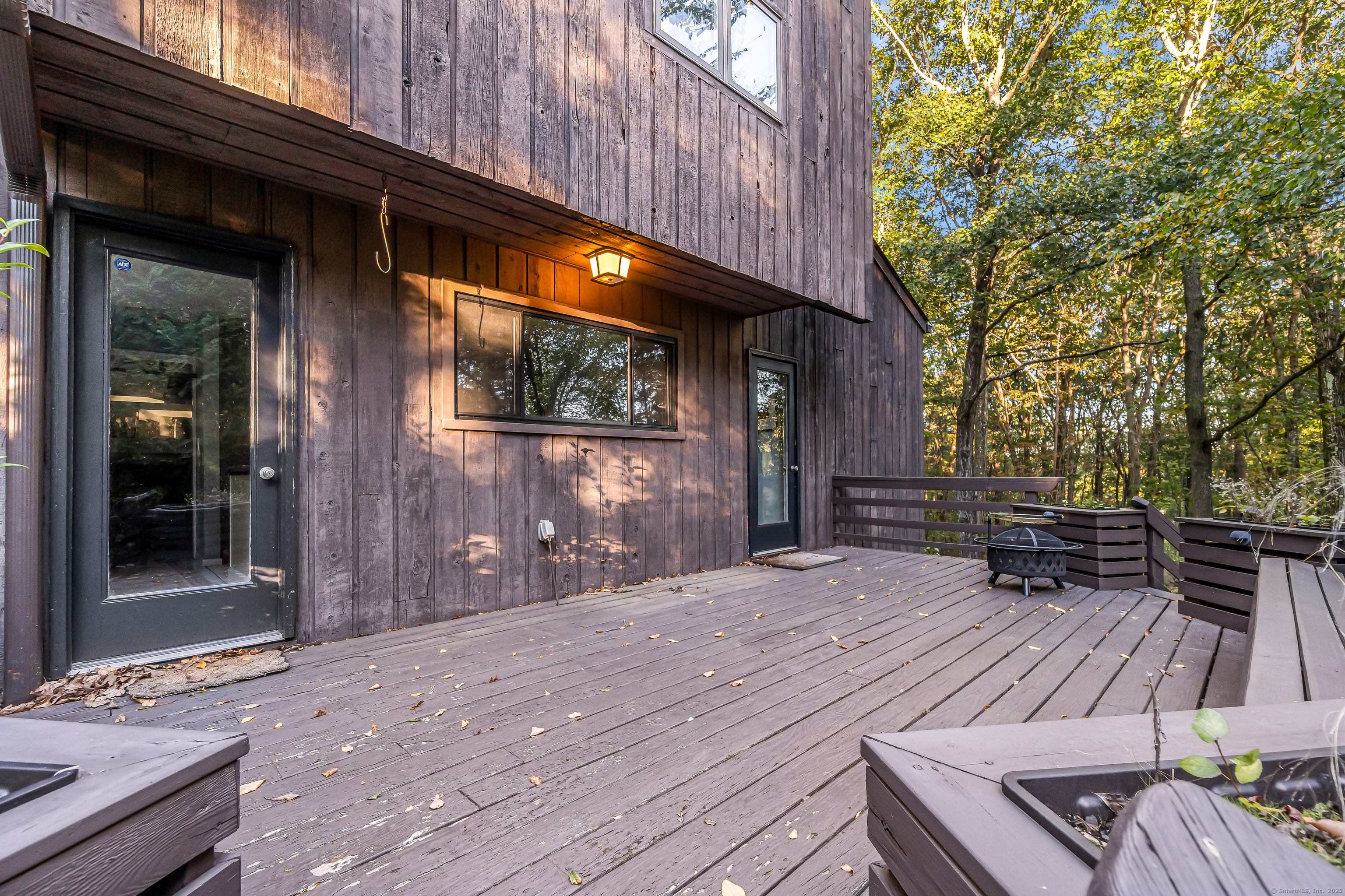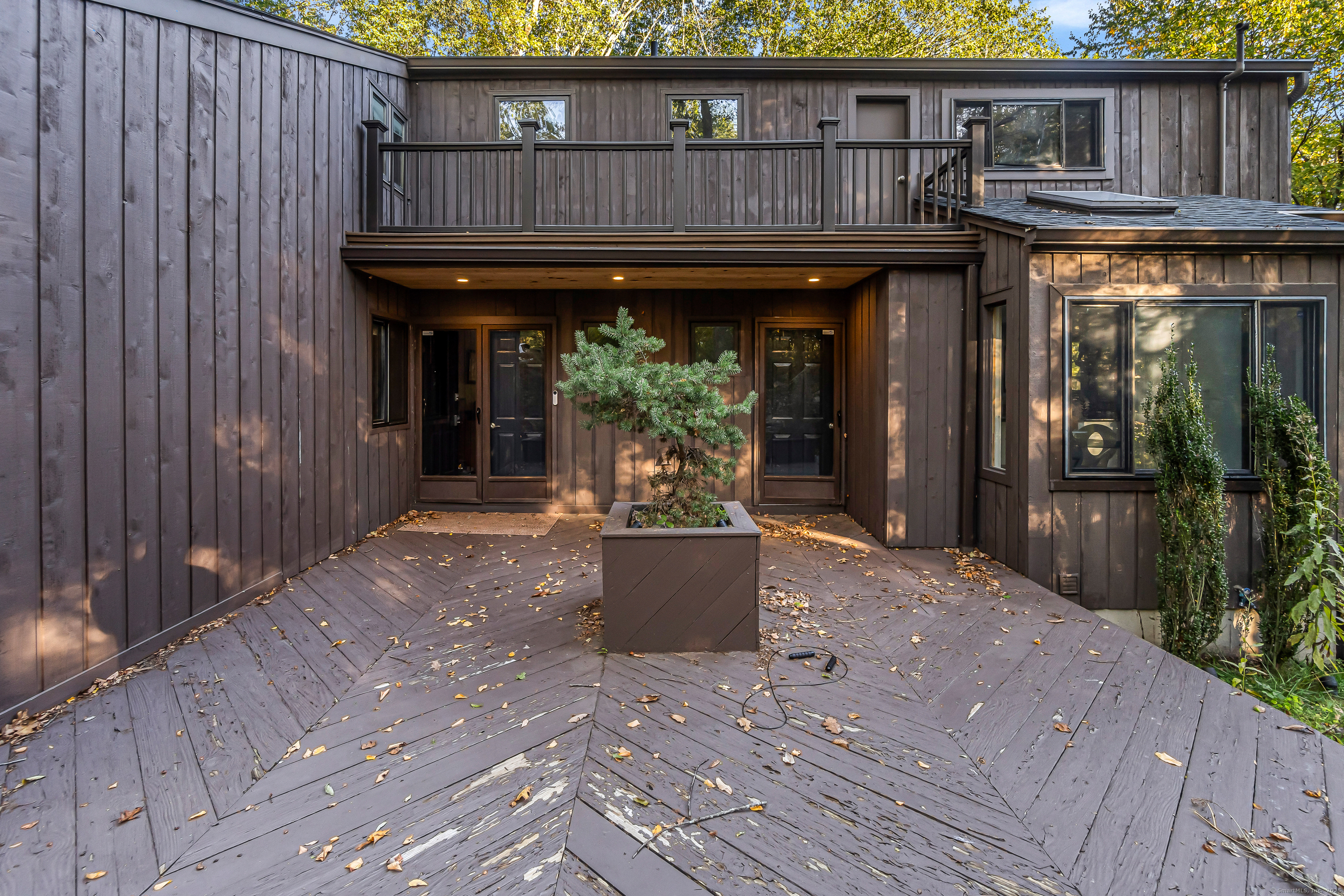 Tucked away on a peaceful cul-de-sac, this 3-bedroom, 3.5-bath Contemporary retreat blends architectural interest with warmth and function. Designed with multi-level living and dramatic sightlines, the home features a step-down living room, step-up dining area, and open staircase that brings in beautiful light and flow. Inside, you'll find vaulted ceilings, skylights, hardwood floors, and transom windows that create a bright and airy feel throughout. The spacious kitchen is ideal for the home chef - boasting granite countertops, abundant cabinetry, and high-end Jenn-Air and ASCO appliances. Upstairs, the primary suite opens to its own private deck - the perfect morning coffee spot. The finished lower level offers an additional 454 sq ft of versatile space, perfect for a recreation room, playroom, or home office. Outdoor living shines here, with multi-level decks featuring built-in seating and planters, a balcony deck off the dining room, and Pella sliders connecting indoor and outdoor spaces seamlessly. A detached two-car garage with loft/workshop provides room for hobbies, storage, or studio space. Set in a private, natural setting yet close to all local conveniences, 4 Old Gate Lane is more than a home - it's a peaceful lifestyle waiting for you.