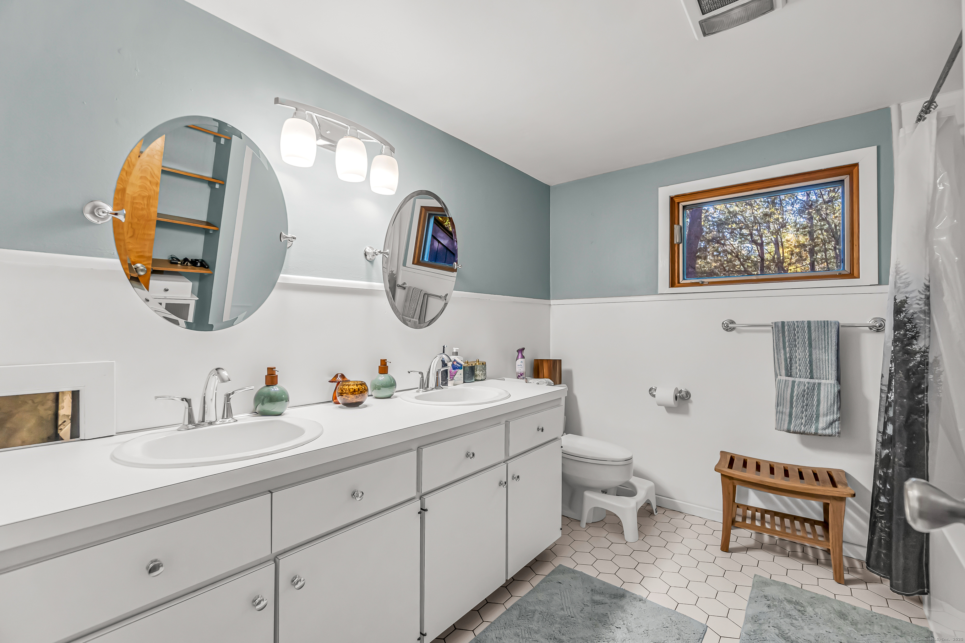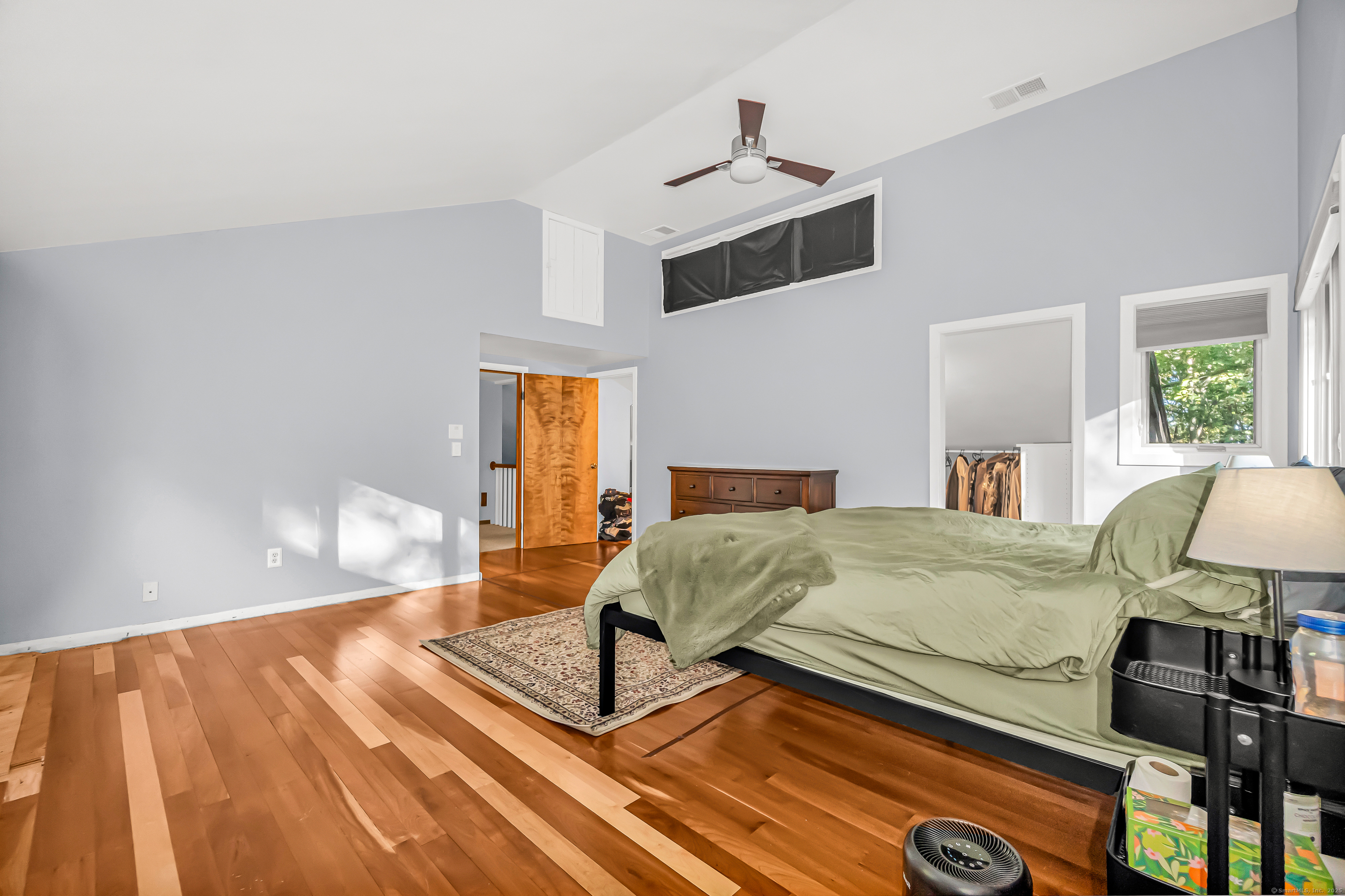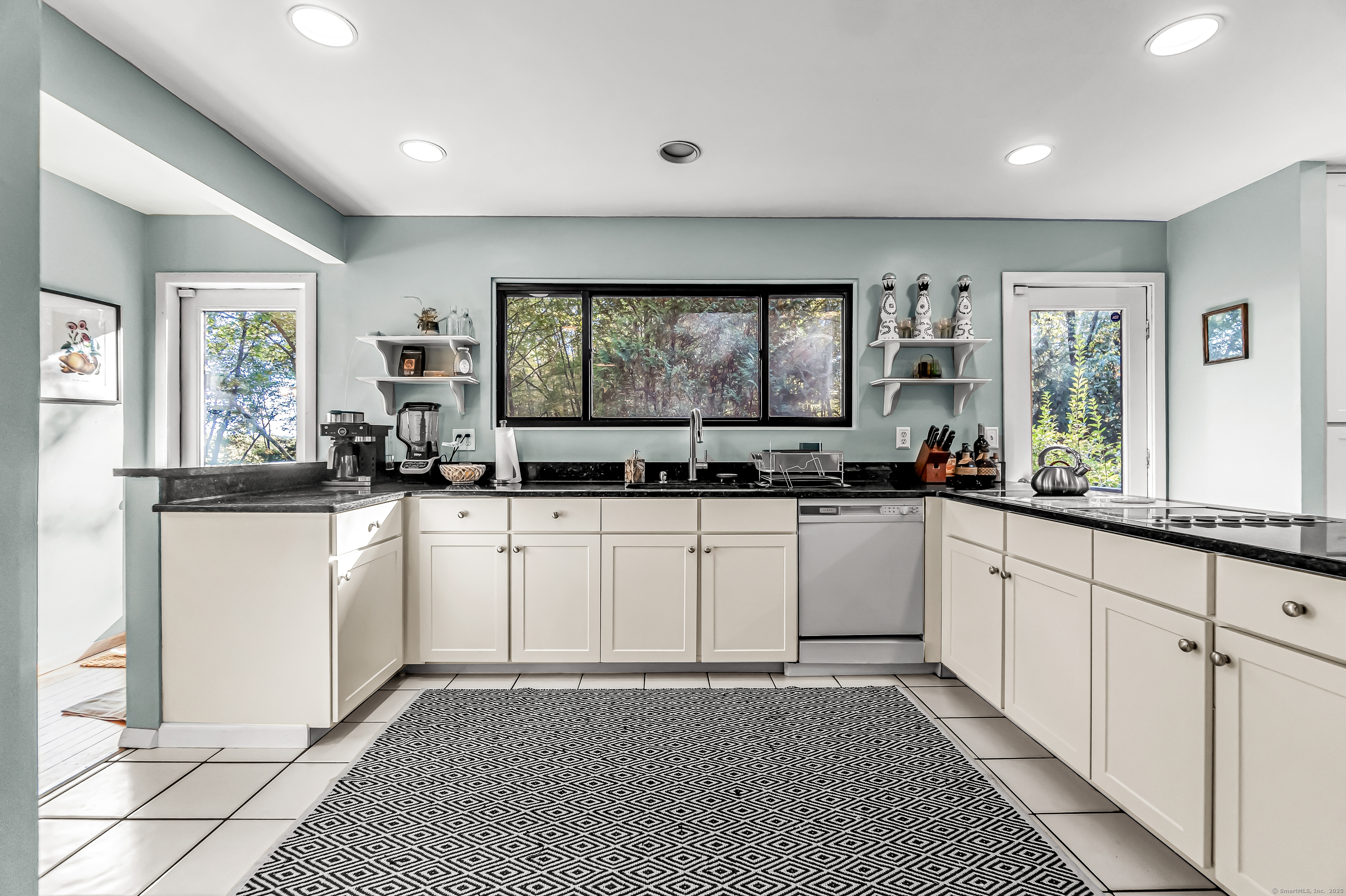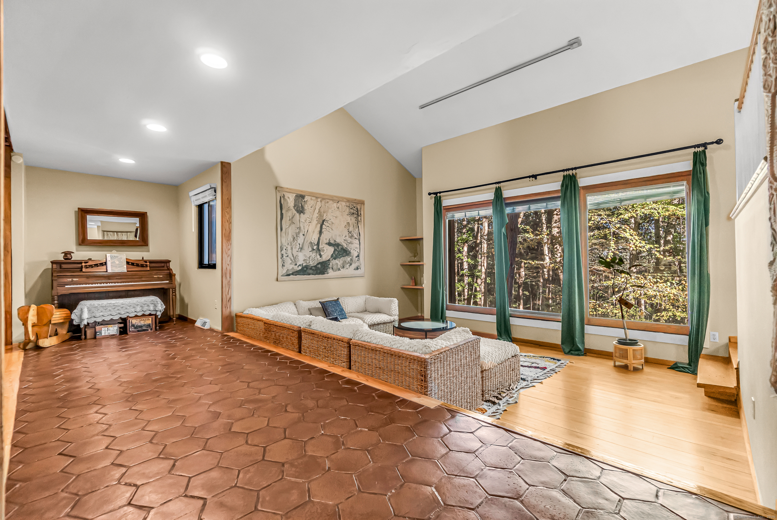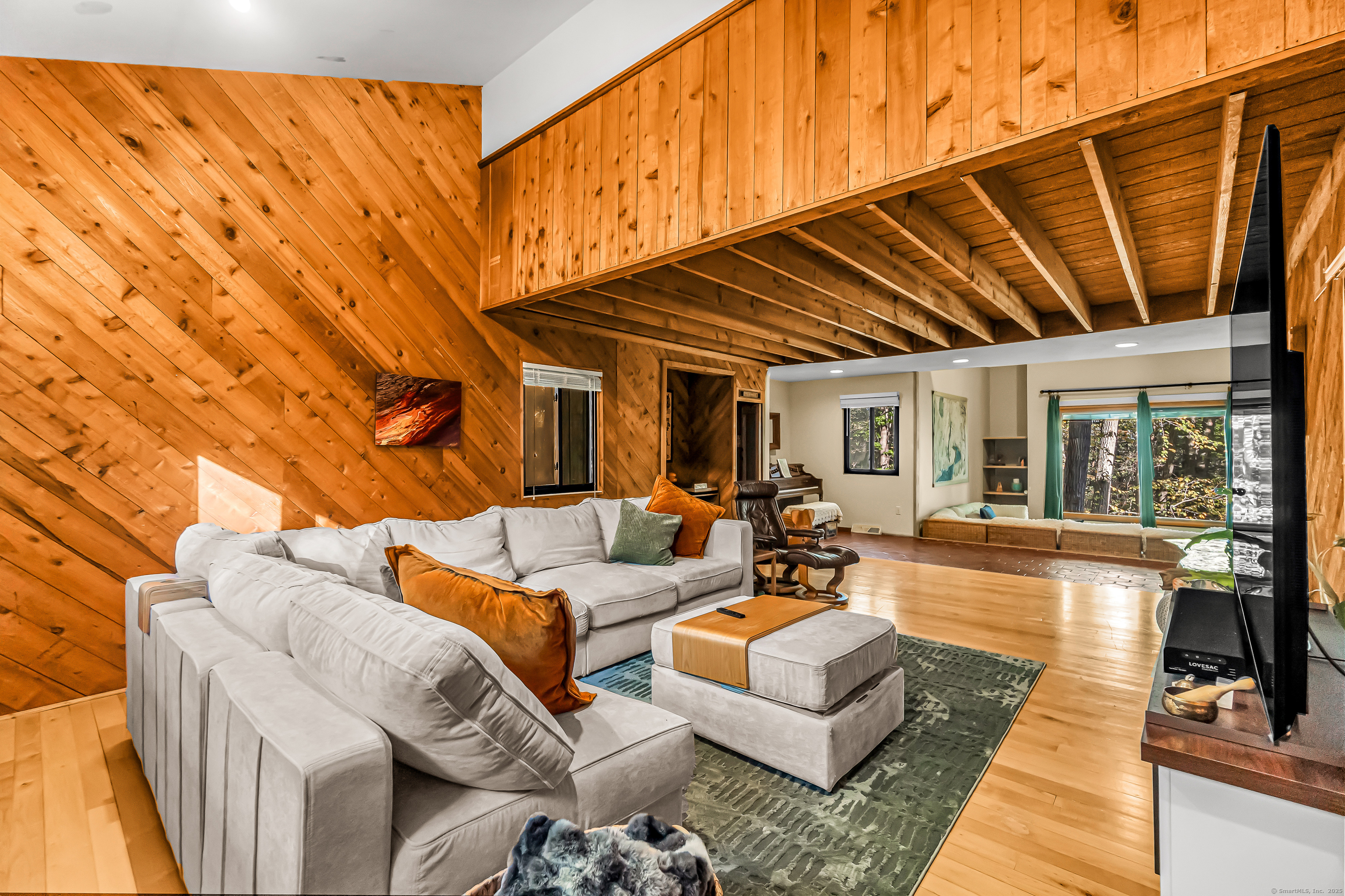 Tucked away on a peaceful cul-de-sac, this 3-bedroom, 3.5-bath Contemporary retreat blends architectural interest with warmth and function. Designed with multi-level living and dramatic sightlines, the home features a step-down living room, step-up dining area, and open staircase that brings in beautiful light and flow. Inside, you'll find vaulted ceilings, skylights, hardwood floors, and transom windows that create a bright and airy feel throughout. The spacious kitchen is ideal for the home chef - boasting granite countertops, abundant cabinetry, and high-end Jenn-Air and ASCO appliances. Upstairs, the primary suite opens to its own private deck - the perfect morning coffee spot. The finished lower level offers an additional 454 sq ft of versatile space, perfect for a recreation room, playroom, or home office. Outdoor living shines here, with multi-level decks featuring built-in seating and planters, a balcony deck off the dining room, and Pella sliders connecting indoor and outdoor spaces seamlessly. A detached two-car garage with loft/workshop provides room for hobbies, storage, or studio space. Set in a private, natural setting yet close to all local conveniences, 4 Old Gate Lane is more than a home - it's a peaceful lifestyle waiting for you.