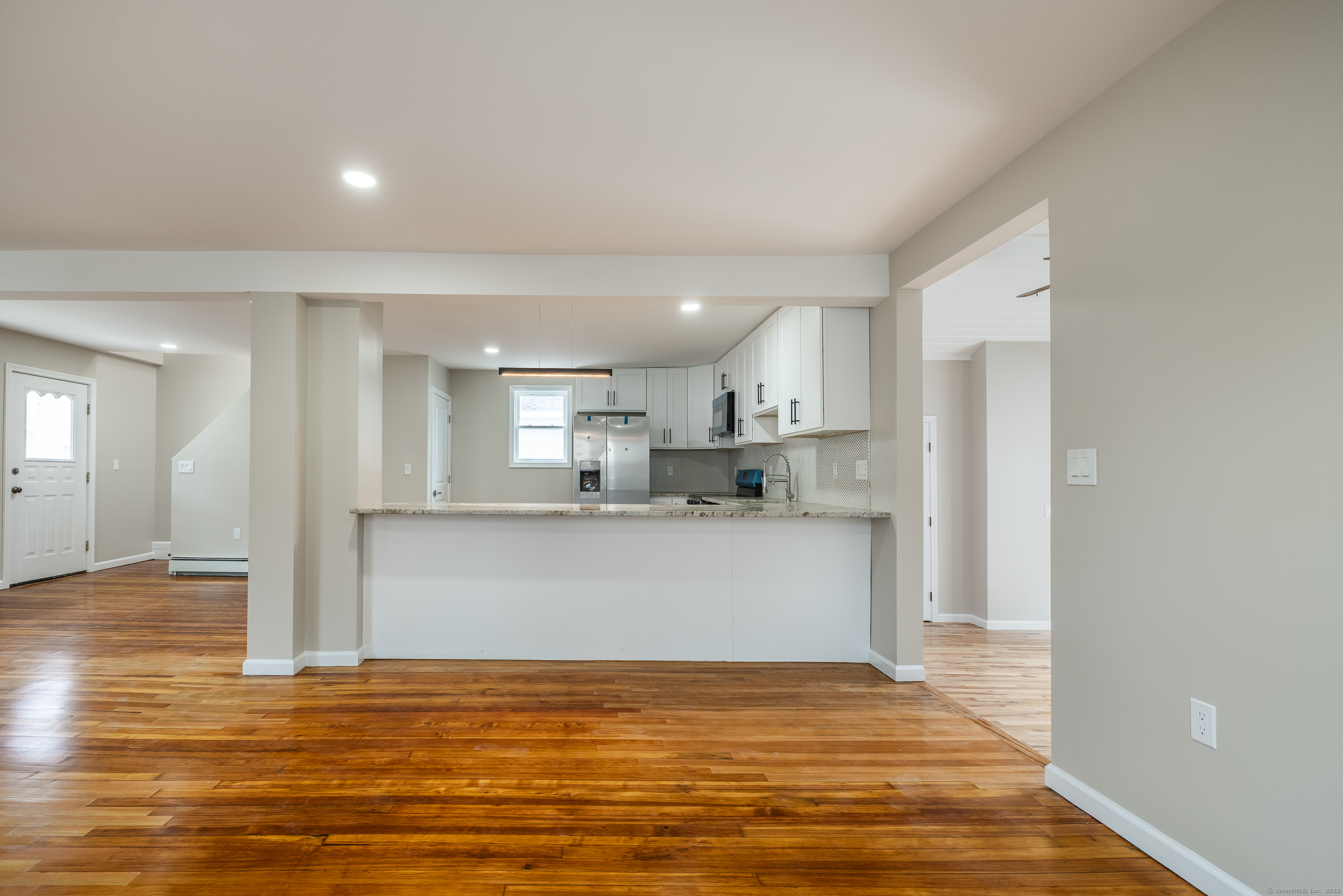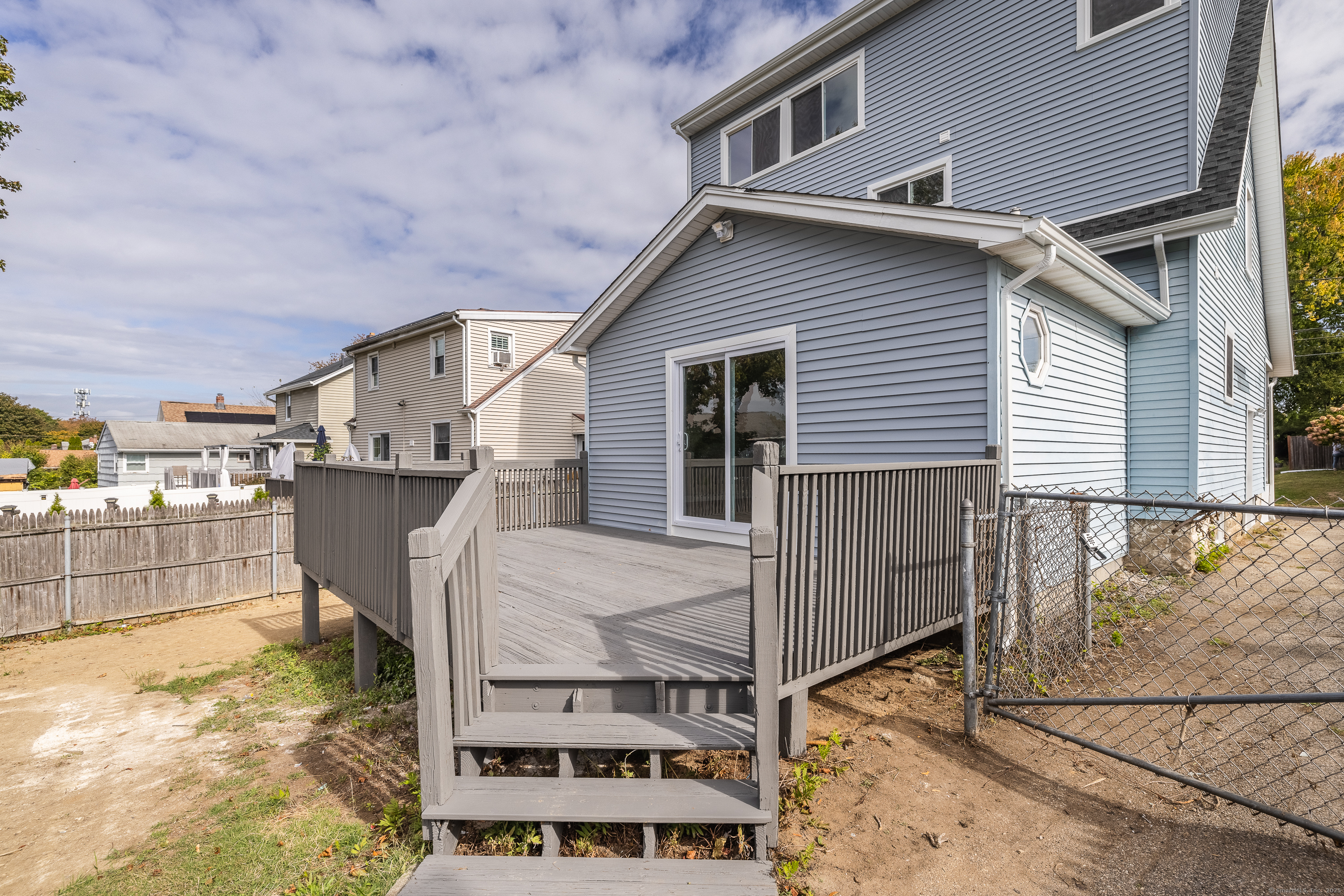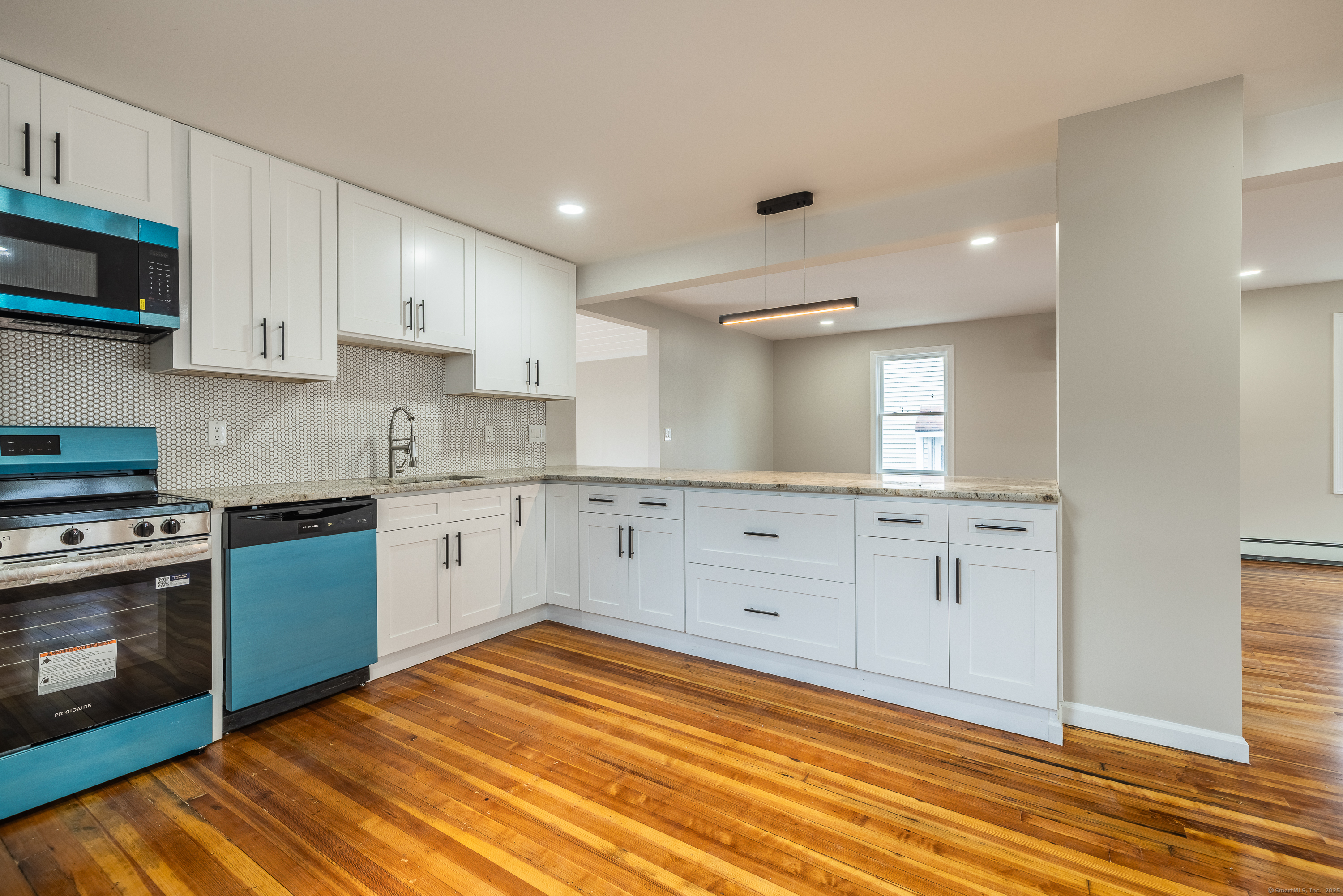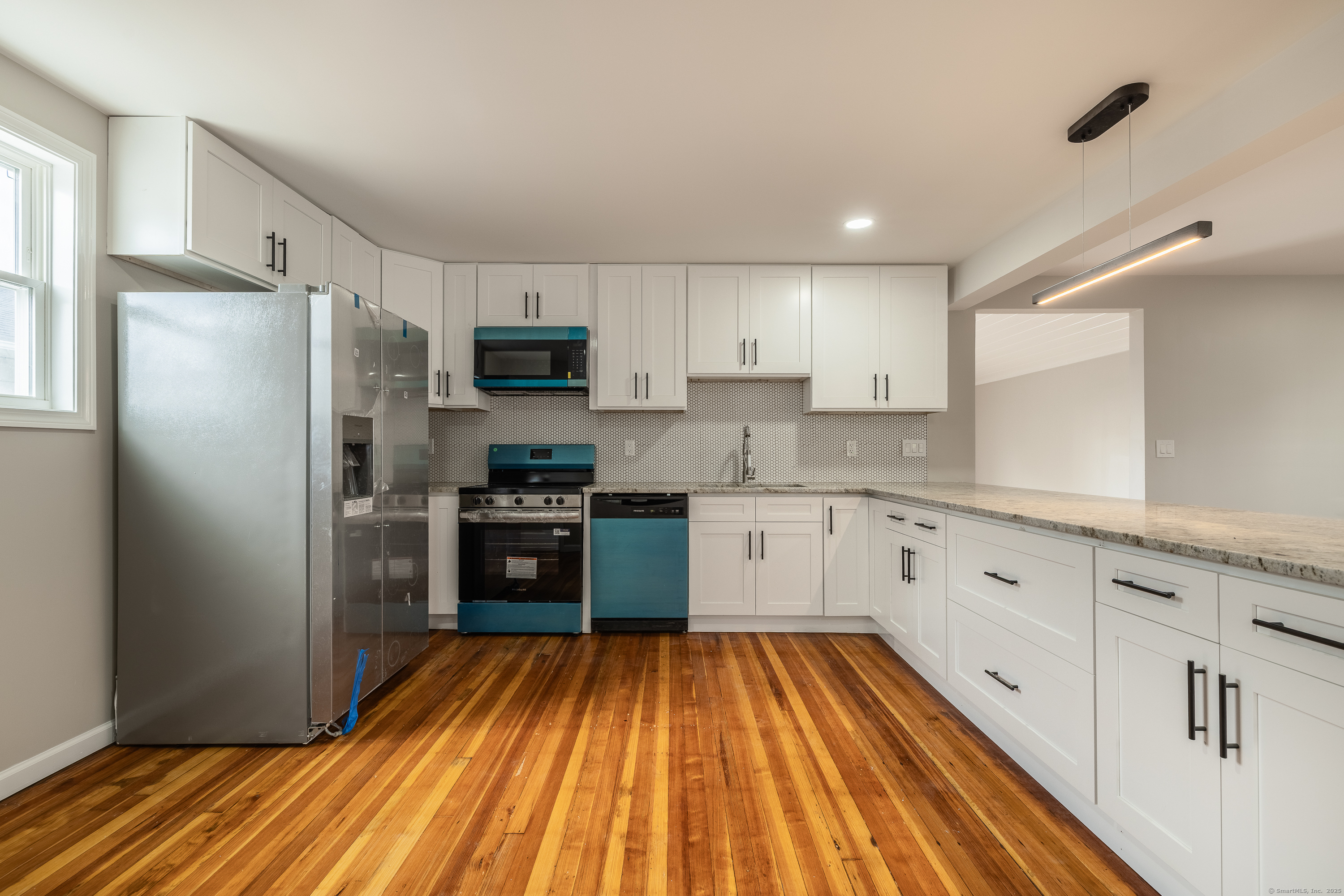 Beautifully remodeled and expanded 4 bedroom Colonial. When you first walk in you will be amazed by the open concept Living room/dining room/kitchen space this home has. The kitchen offers brand new white cabinetry with granite counter tops, gorgeous backsplash, stainless steel appliances, and a huge island that connects with the dining room area. Living room/dining room and kitchen all have new recessed lighting and a split system making this section bright and airy. From the dining area you can go to the family room with vaulted ceilings, sliders to deck and a brand new half bath with a unique black vanity. On this home 2nd level you can find 3 good size full bedroom with large mirror closet doors. A full bath with stunning finishes on tile and vanity and the designated laundry room. Both 1st and 2nd floors offer gleaming hardwood floors throughout. But wait there's MORE! This home is completed with a BRAND NEW PRIMARY ROOM with vinyl floor, new large windows, recessed lighting, walk in closet and a full bath with the latest styles in vanity and tile. This property also comes with a brand new roof, most of the windows are new, brand new oil tank. Home has a welcoming open front porch and a fenced backyard with a large deck ideal for entertaining. Home is just minutes from train station, major shopping areas and I-95. Truly a must see!