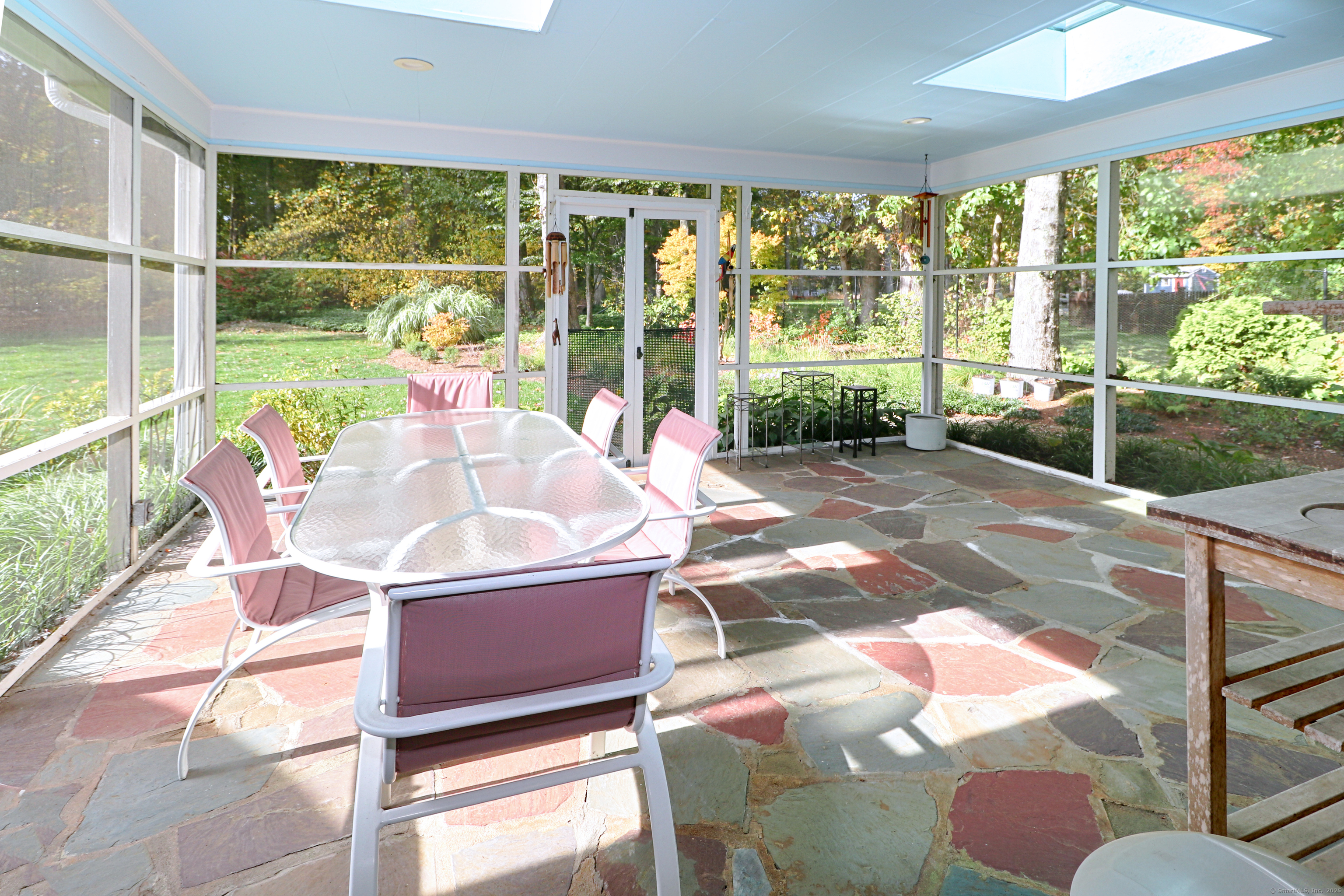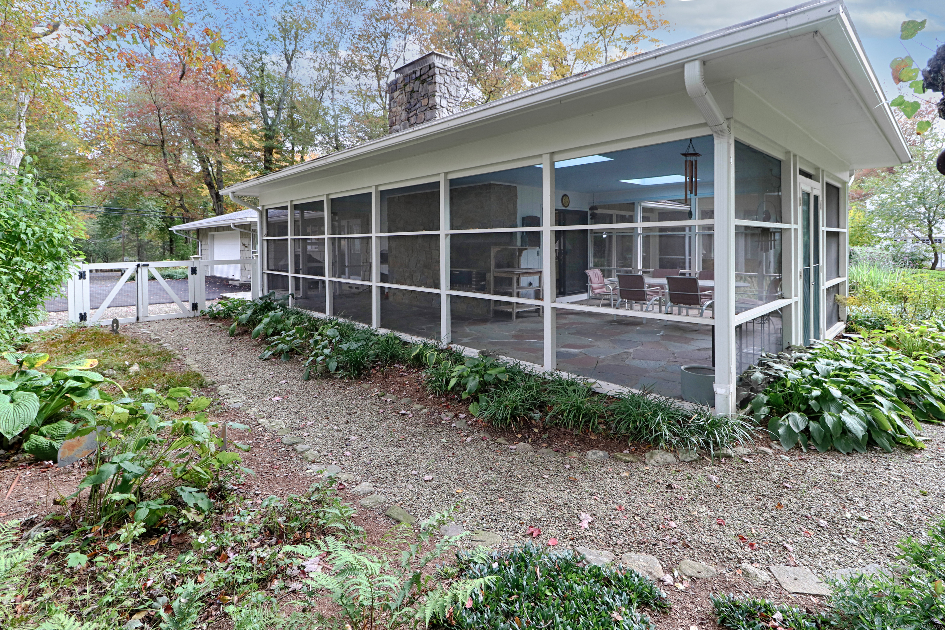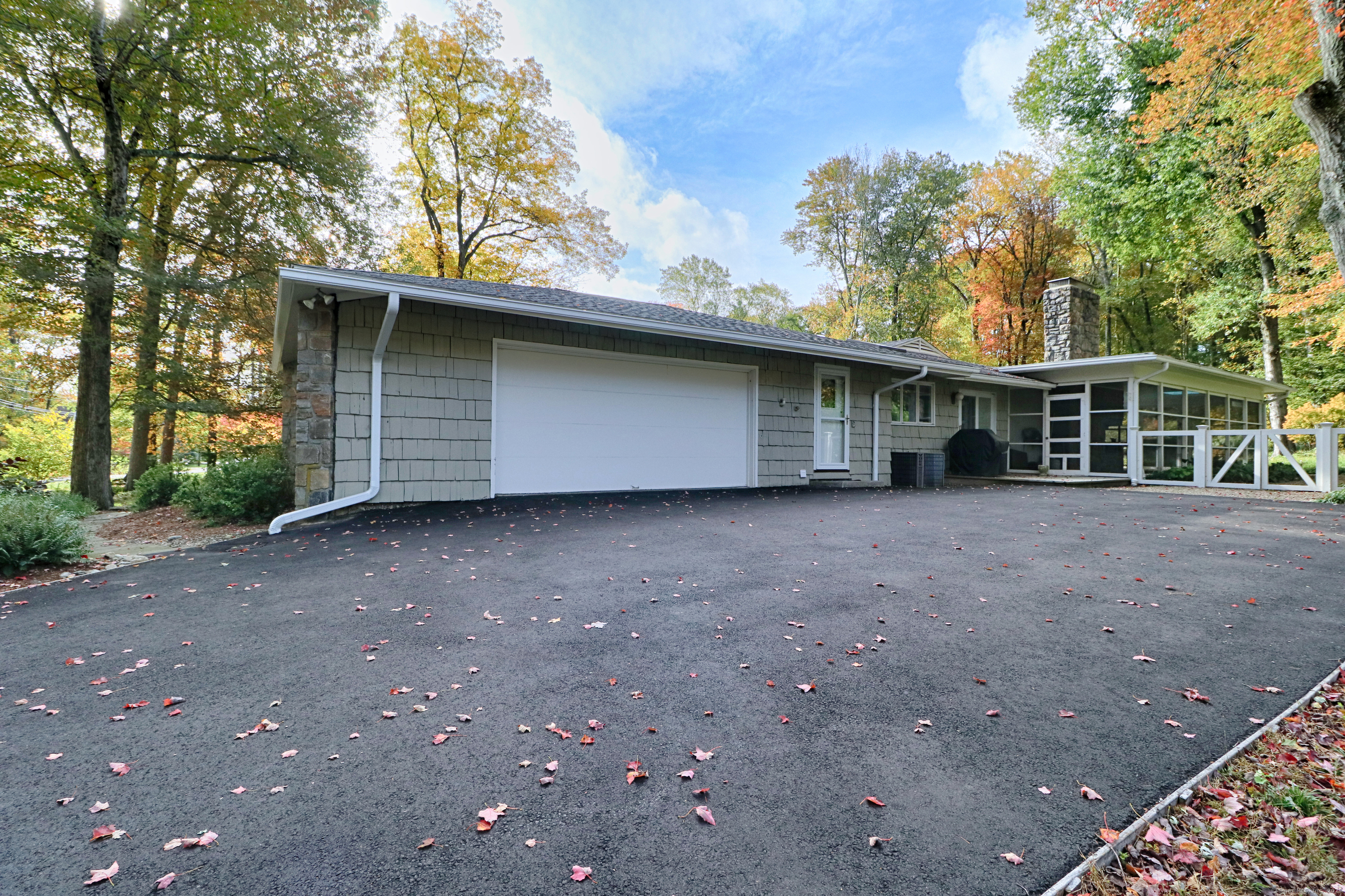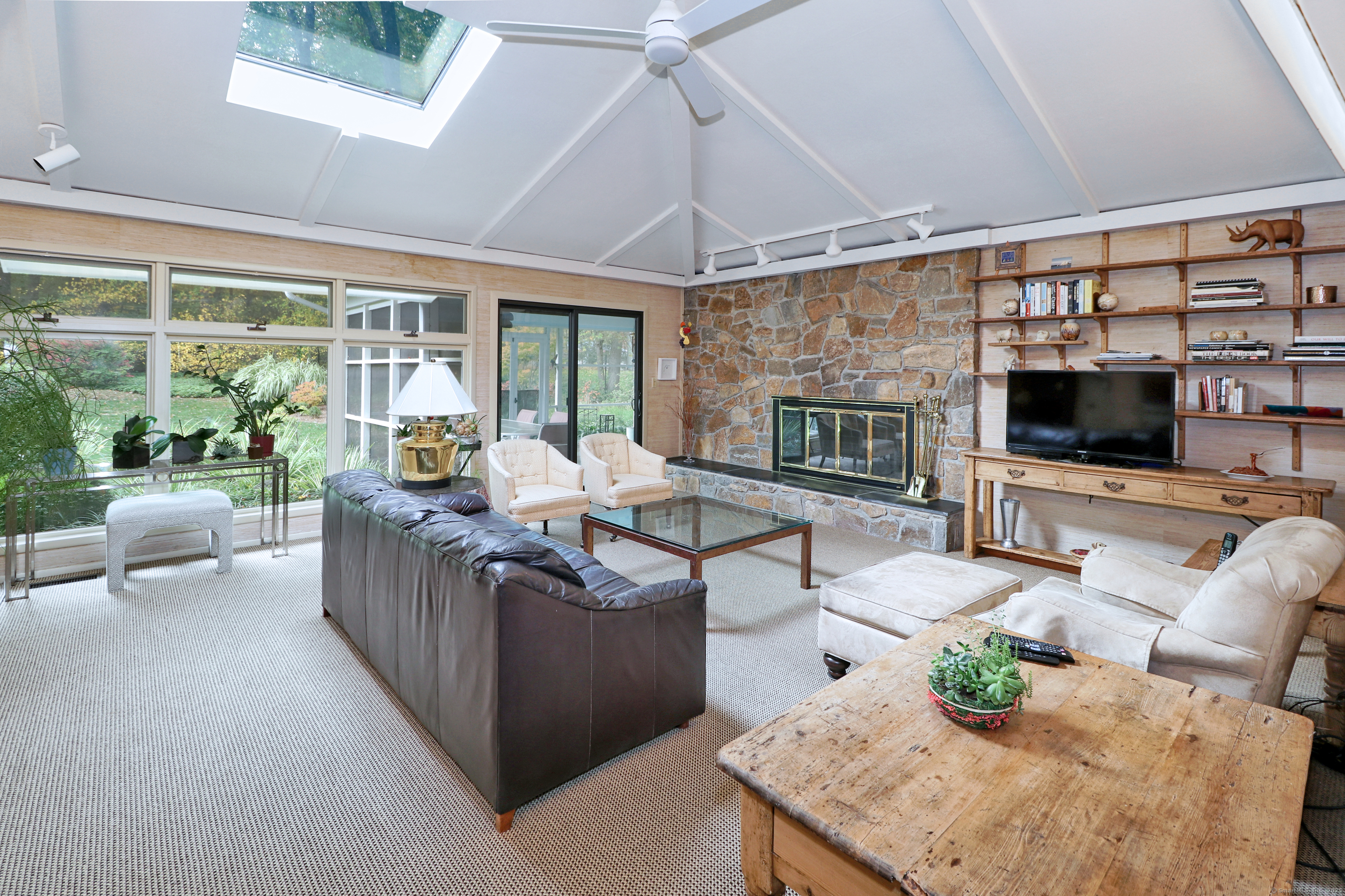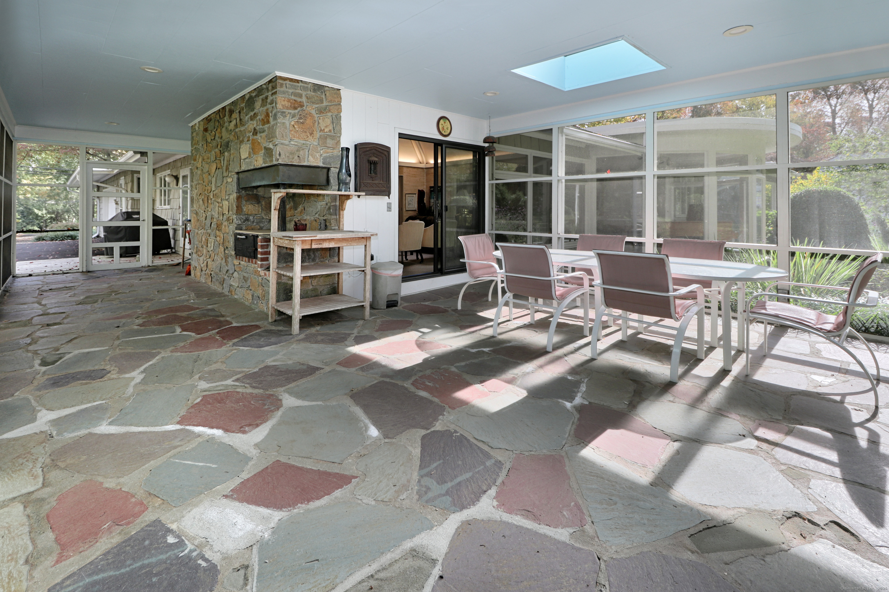 Welcome to 947 Galloping Hill Road. This true mid-century modern home was designed by the important architect Victor Civkin in 1967. This well thought out ranch has 4 bedrooms and 3 1/2 baths and is perfectly situated on a flat, private acre. Step inside the large foyer that has curved walls and a skylight. The living room is spacious with a rounded wall of floor to ceiling windows which flood the space with light. This room overlooks the professionally landscaped yard. The kitchen has white cabinets, stainless steel appliances, Subzero, granite counters, wood floor and a slider to the deck. The dining room has beautiful built-ins and a wood floor. There is also a curved wall of windows. The primary bedroom has a wall of closets, a full bath and has many windows. The other 3 bedrooms are spacious, with one having its own ensuite. The family room has a large statement-making wood burning stone fireplace and a vaulted ceiling with beams. There is a slider that connects to the screened-in porch which wraps around the house. This porch is a perfect place to entertain or enjoy quiet relaxation. The lower level is partially finished with a playroom. This home has a full house generator. The property is located in a desirable area of Fairfield. It is convenient to highways, shopping , 2 Universities, 5 beaches and Metro-North. It is a very special property and balances family functionality with modern elements! Enjoy all that Fairfield has to offer!