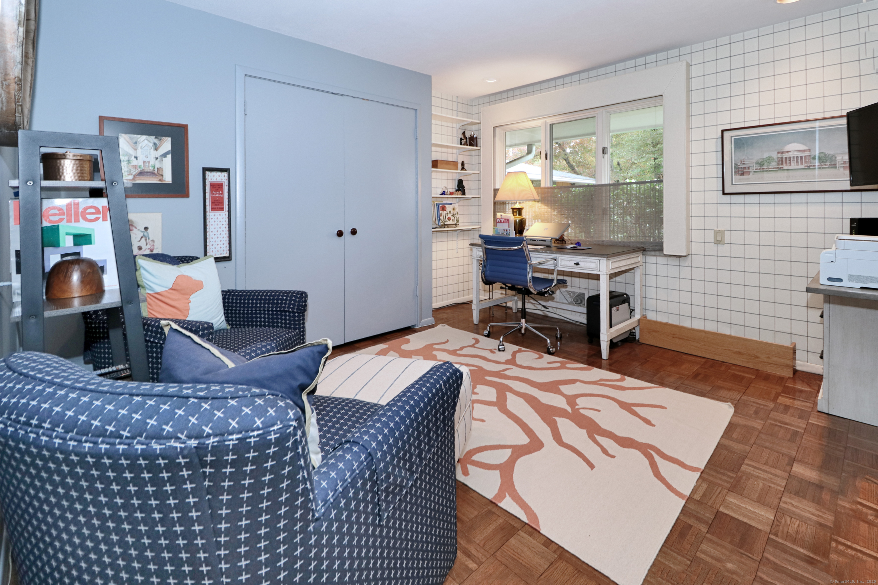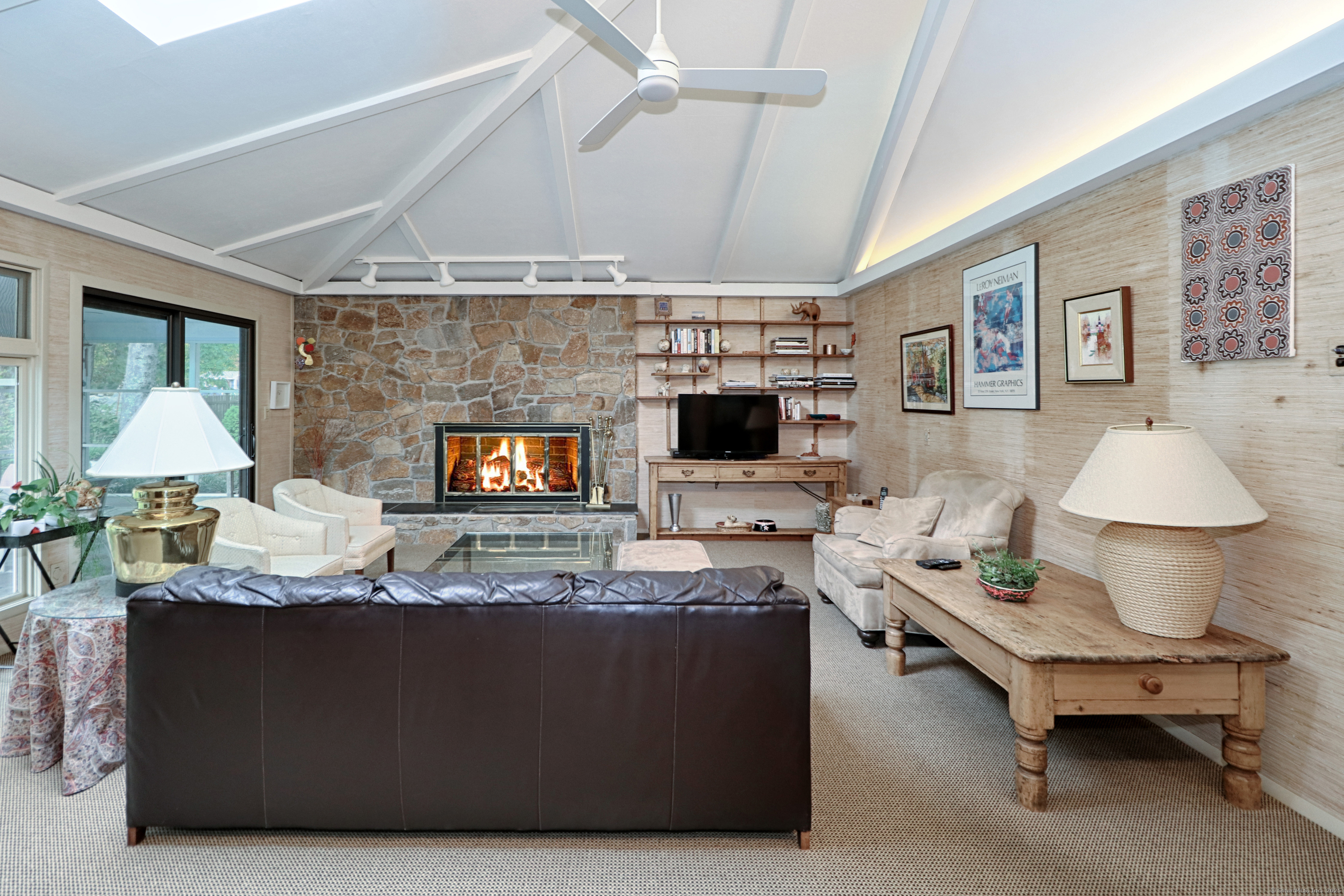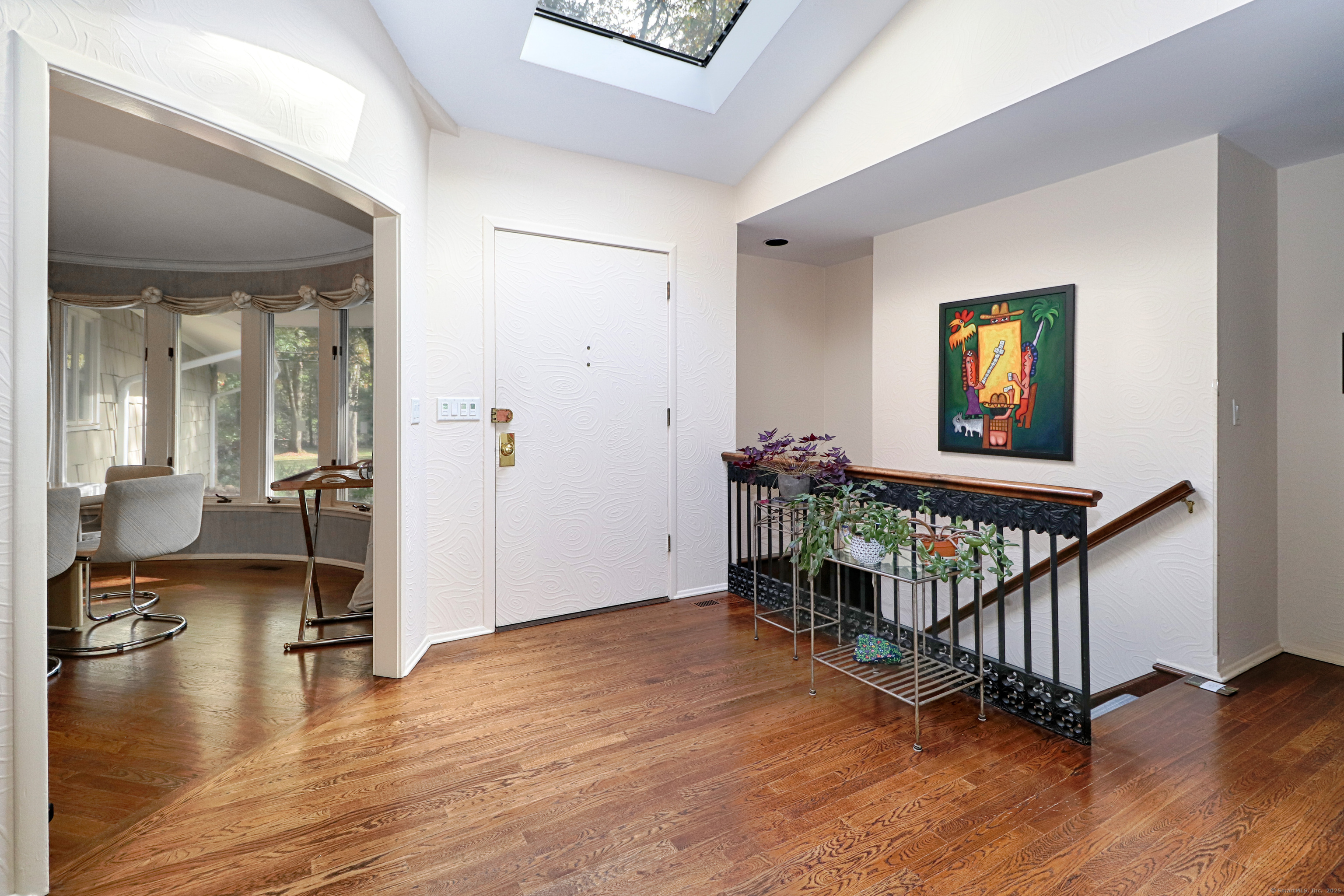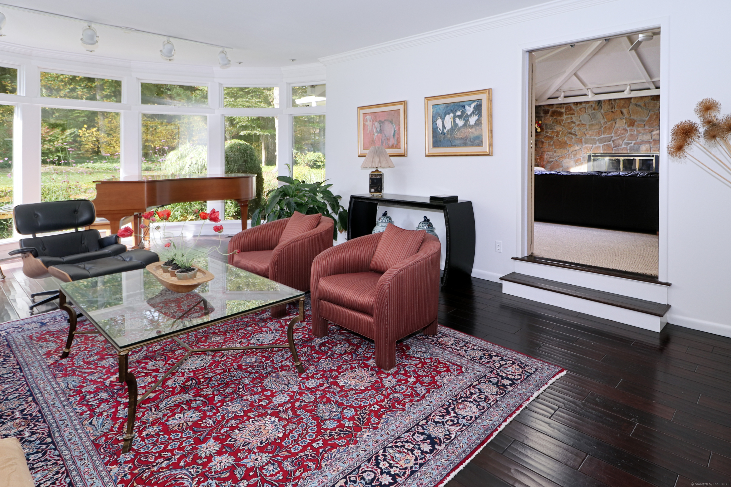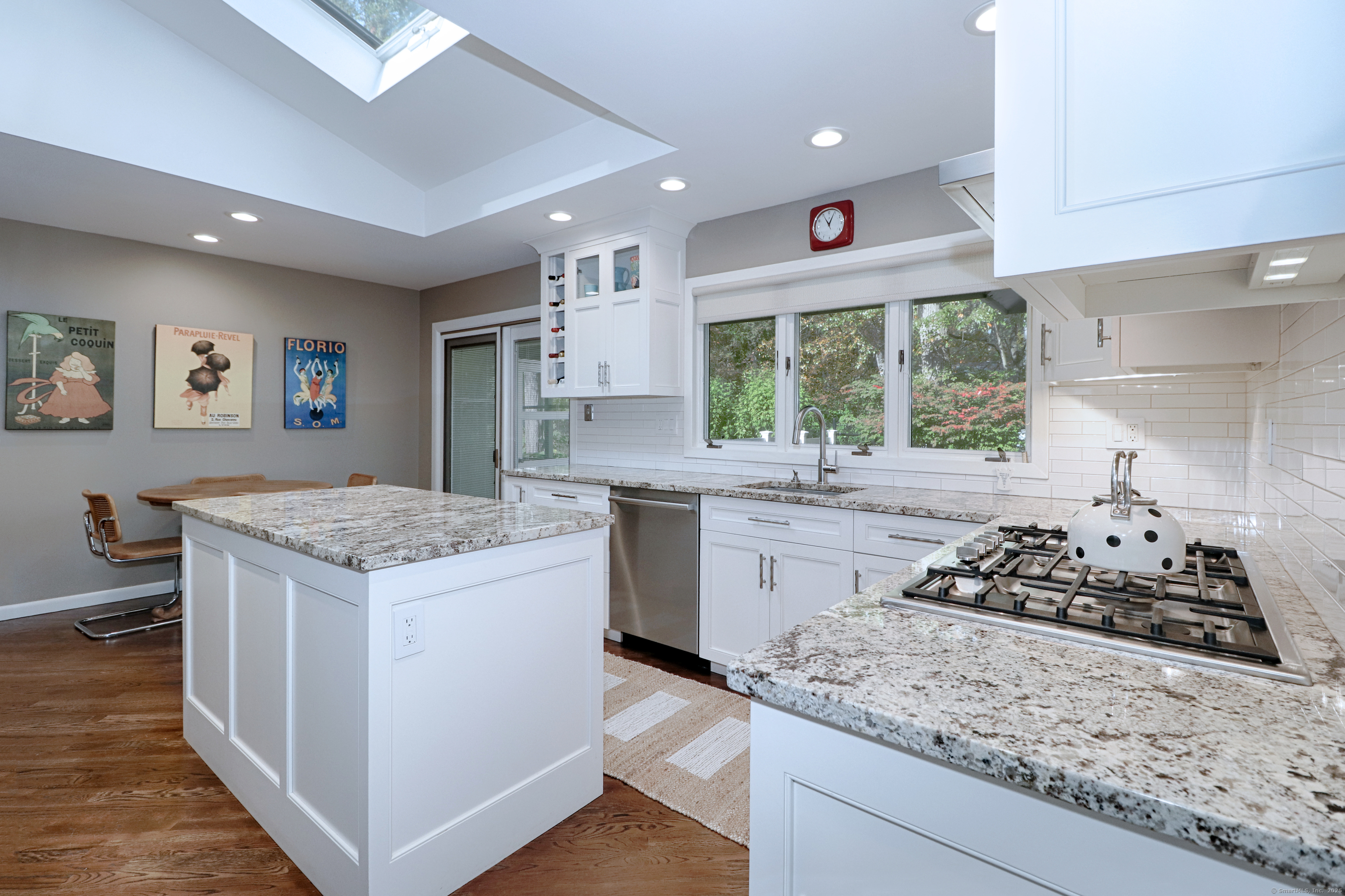 Welcome to 947 Galloping Hill Road. This true mid-century modern home was designed by the important architect Victor Civkin in 1967. This well thought out ranch has 4 bedrooms and 3 1/2 baths and is perfectly situated on a flat, private acre. Step inside the large foyer that has curved walls and a skylight. The living room is spacious with a rounded wall of floor to ceiling windows which flood the space with light. This room overlooks the professionally landscaped yard. The kitchen has white cabinets, stainless steel appliances, Subzero, granite counters, wood floor and a slider to the deck. The dining room has beautiful built-ins and a wood floor. There is also a curved wall of windows. The primary bedroom has a wall of closets, a full bath and has many windows. The other 3 bedrooms are spacious, with one having its own ensuite. The family room has a large statement-making wood burning stone fireplace and a vaulted ceiling with beams. There is a slider that connects to the screened-in porch which wraps around the house. This porch is a perfect place to entertain or enjoy quiet relaxation. The lower level is partially finished with a playroom. This home has a full house generator. The property is located in a desirable area of Fairfield. It is convenient to highways, shopping , 2 Universities, 5 beaches and Metro-North. It is a very special property and balances family functionality with modern elements! Enjoy all that Fairfield has to offer!