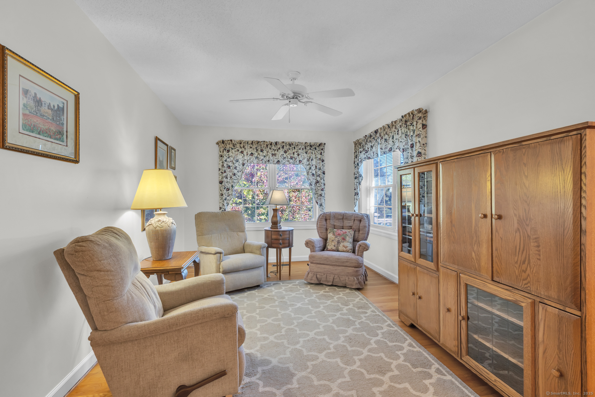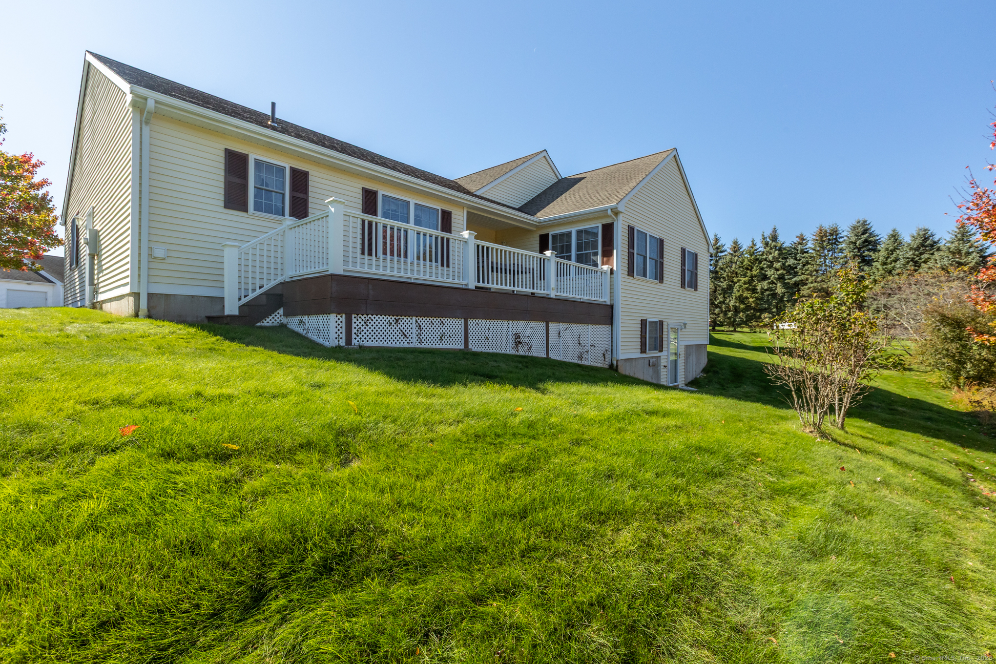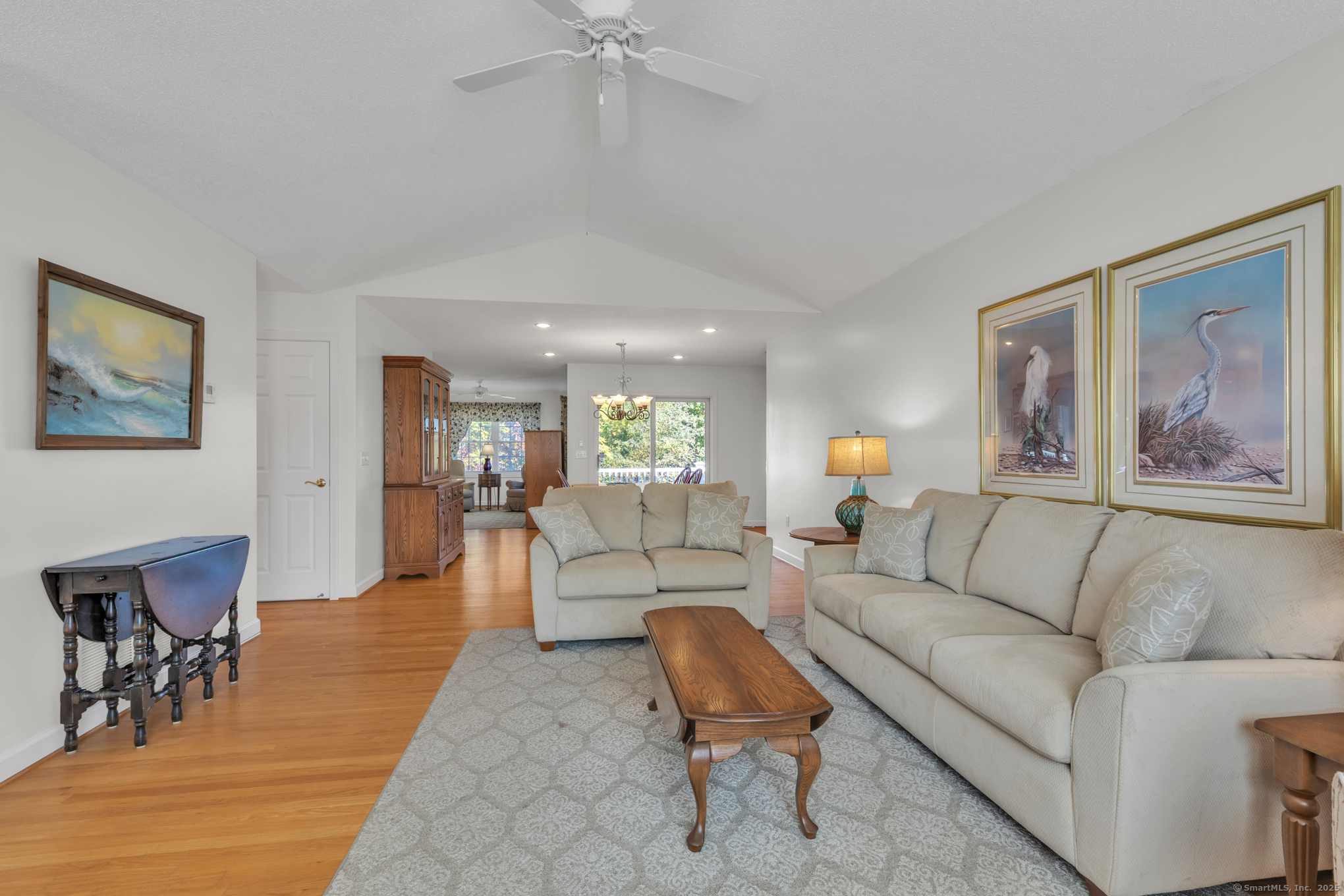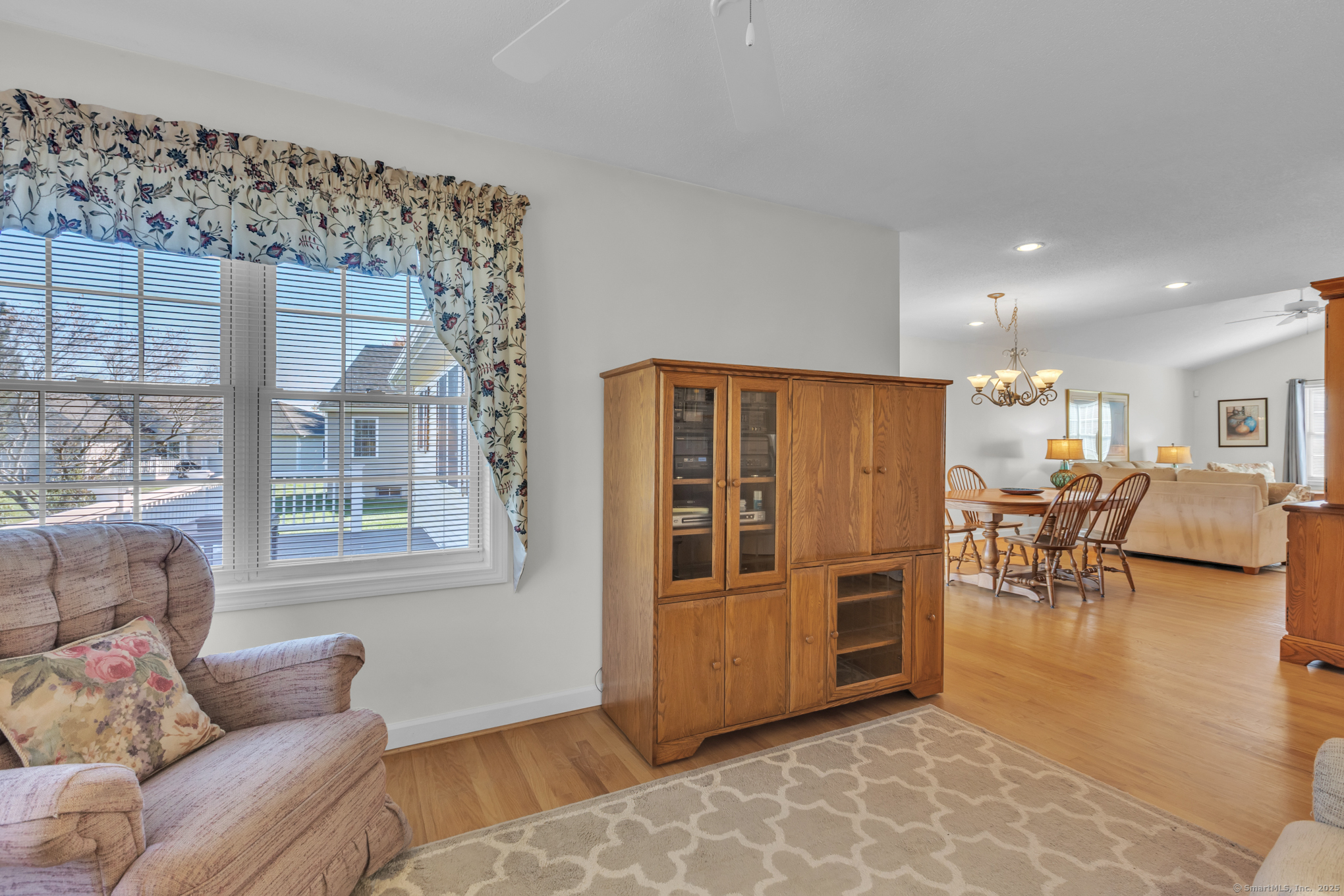Beautifully maintained 1656 sq. ft. Ranch in 55+ Quail Hollow complex. Located in a quiet portion of the complex, this home is move in ready. Professional landscaping leads to a sun-drenched front porch and foyer. The foyer opens majestically to a cathedral ceiling Living room with immaculate hardwood floors and a soothing gas log fireplace. An open design floor plan includes the adjacent Dining room with more hardwood, recessed lighting and slider access to a large private rear deck. The eat-in Kitchen is both beautiful and functional. It includes distinctive cabinetry, tiled backsplash, abundant rear facing windows and a bright and sunny dining space. The back of the house includes an Office / Sitting room and Primary bedroom that both include hardwood floors, and relaxing views of the deck and backyard. The Primary bedroom includes an oversized walk-in closet - with barn door and ceiling fan - and a nicely appointed private full bath. A second Bedroom, common full bath and an off-kitchen Laundry room complete the living space. The lower level is unfinished with walkout and provides plenty of storage and the potential for expanded recreational space.