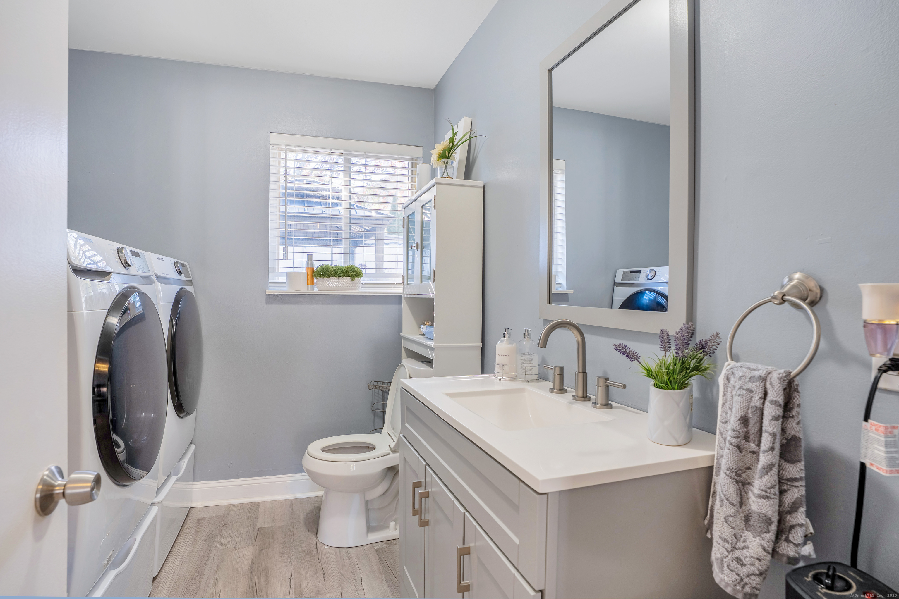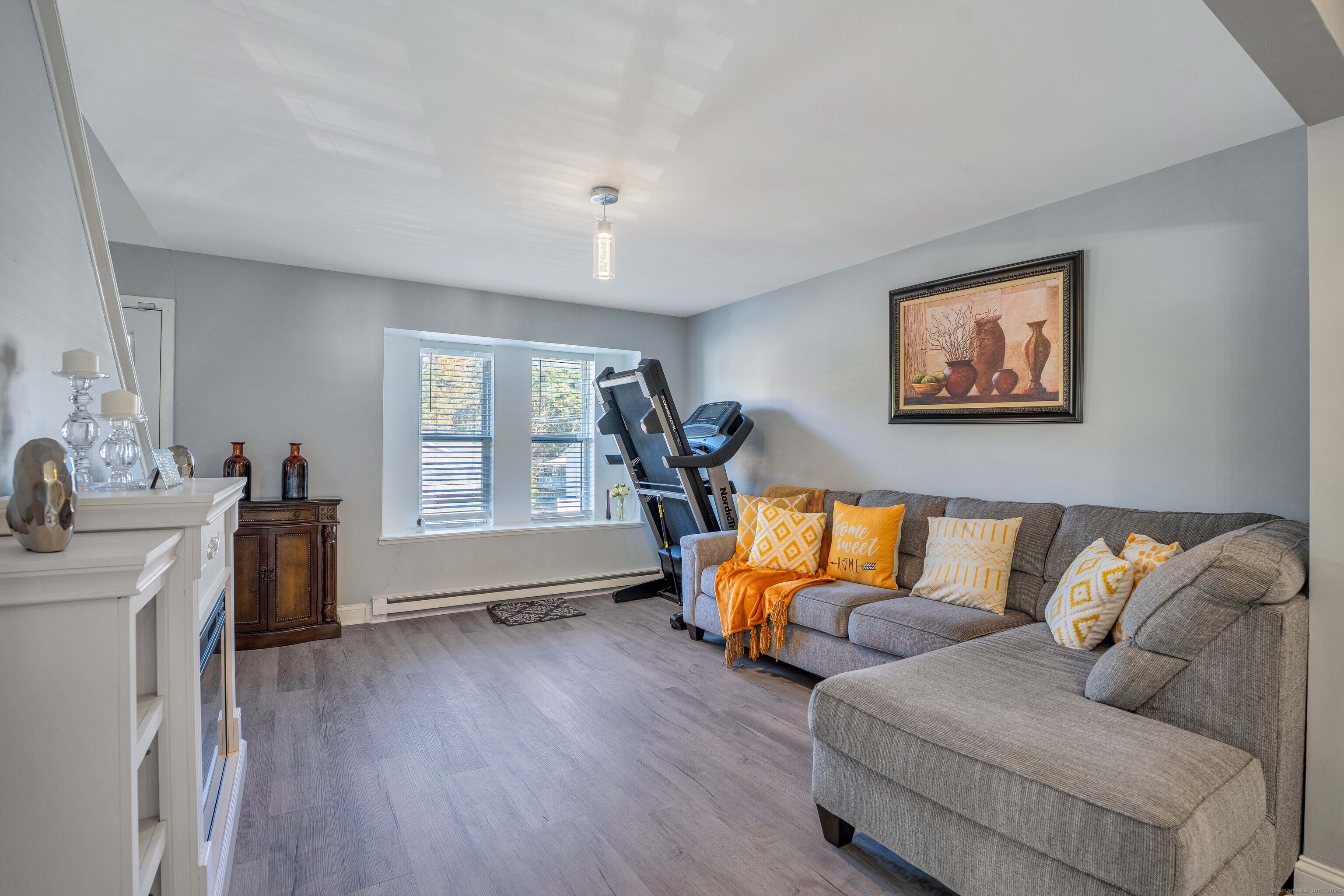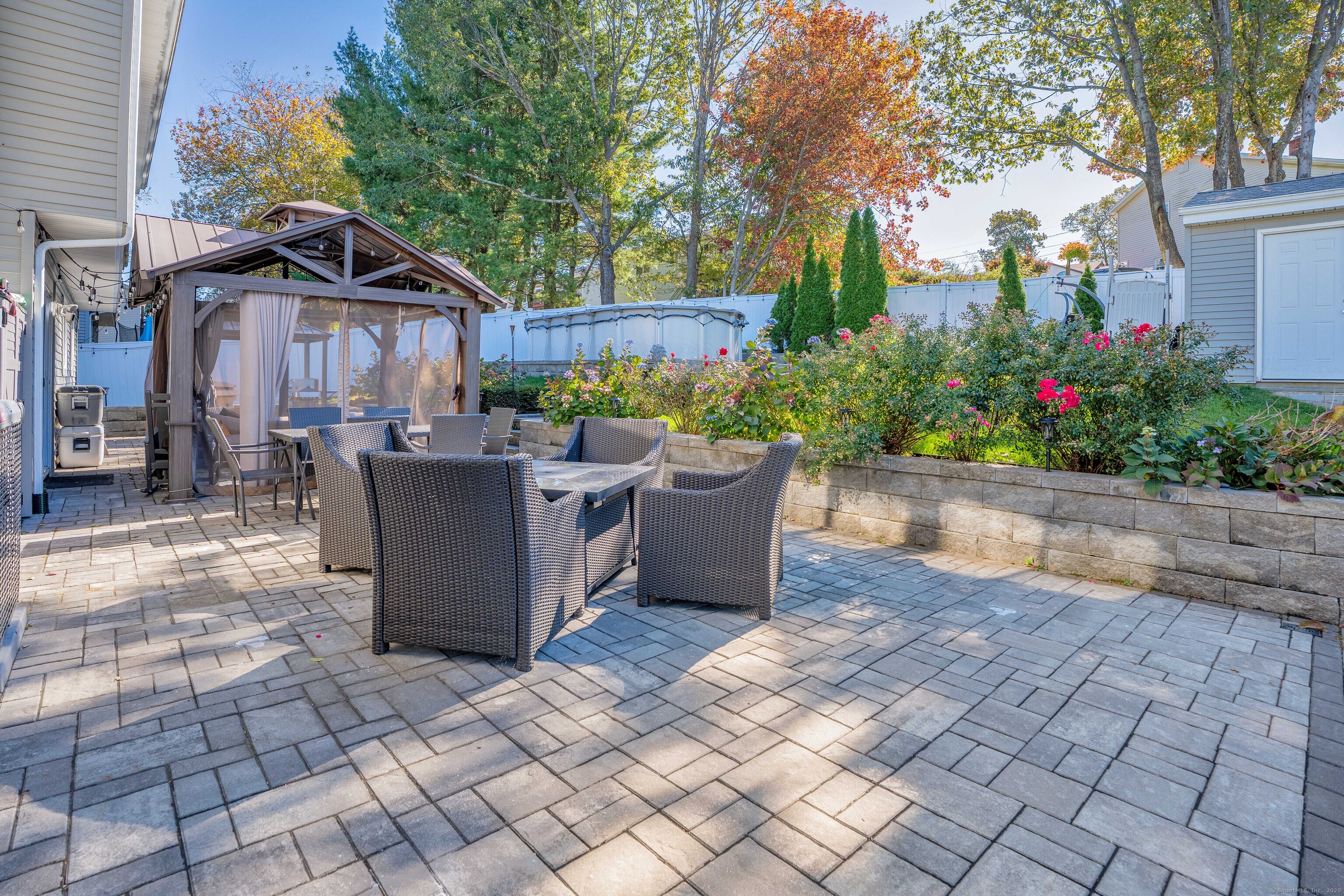 This well-maintained home in a quiet residential neighborhood offers comfortable living with thoughtful upgrades throughout. The living area features a built-in electric fireplace with a marble surround, built into a custom TV wall that includes marble accents, shelving, and the fireplace for a clean, functional setup. Luxury vinyl plank flooring runs through the main level, providing a durable and attractive finish. Electric baseboard heating is connected to solar panels for energy-efficient warmth. A forced air propane fueled heating system is also in place as a supplement to the solar. The kitchen includes a large island, stainless steel appliances, and quartz countertops, making meal prep easy and enjoyable. The primary bathroom has a soaking tub, double sink, and separate stall shower. A first-floor washer and dryer add everyday convenience. Out back, relax on the 1,100 sq ft custom paver patio around the above ground pool, all enclosed by a privacy fence for a quiet backyard escape. Practical, updated, and ready for your family.