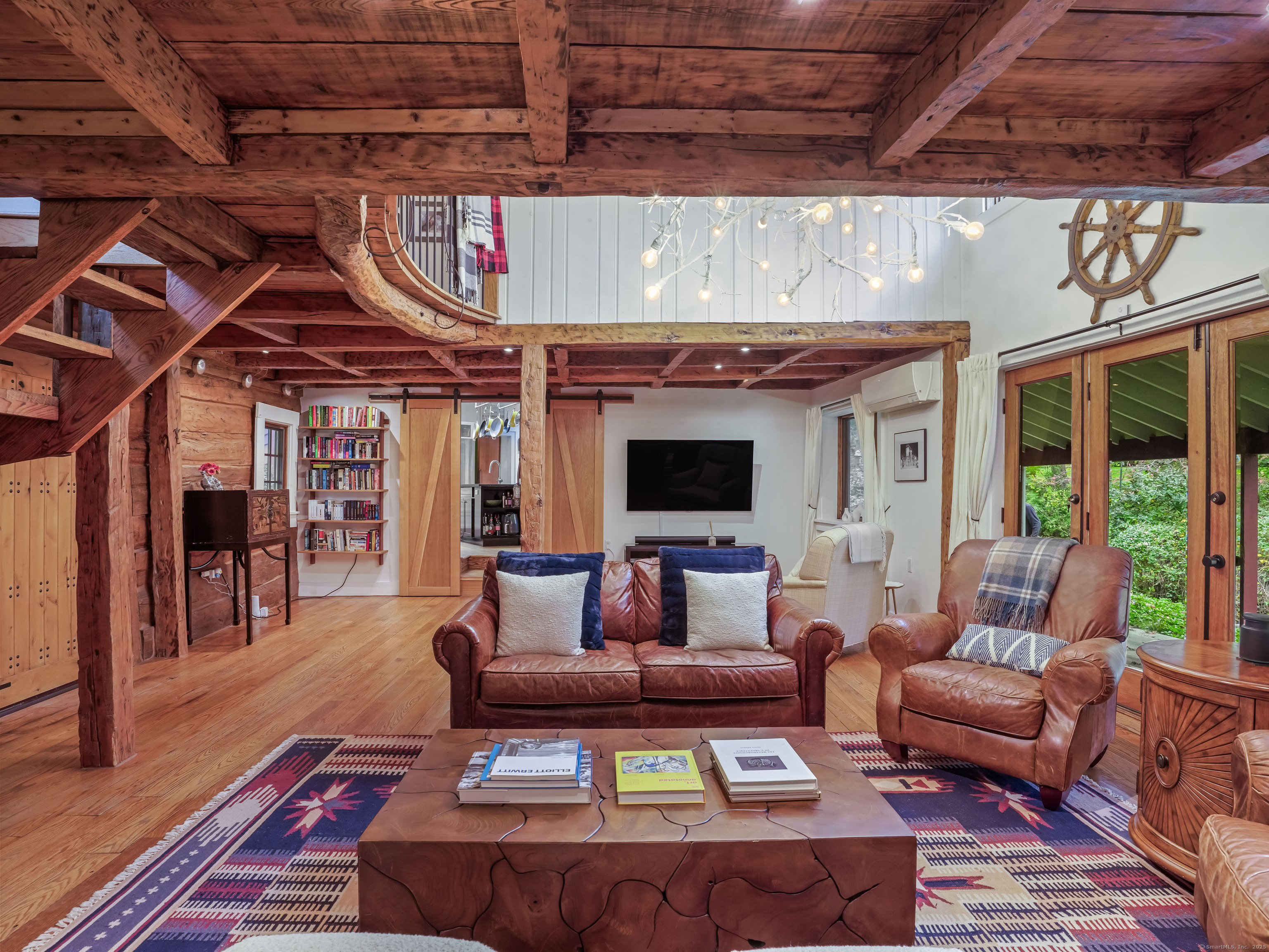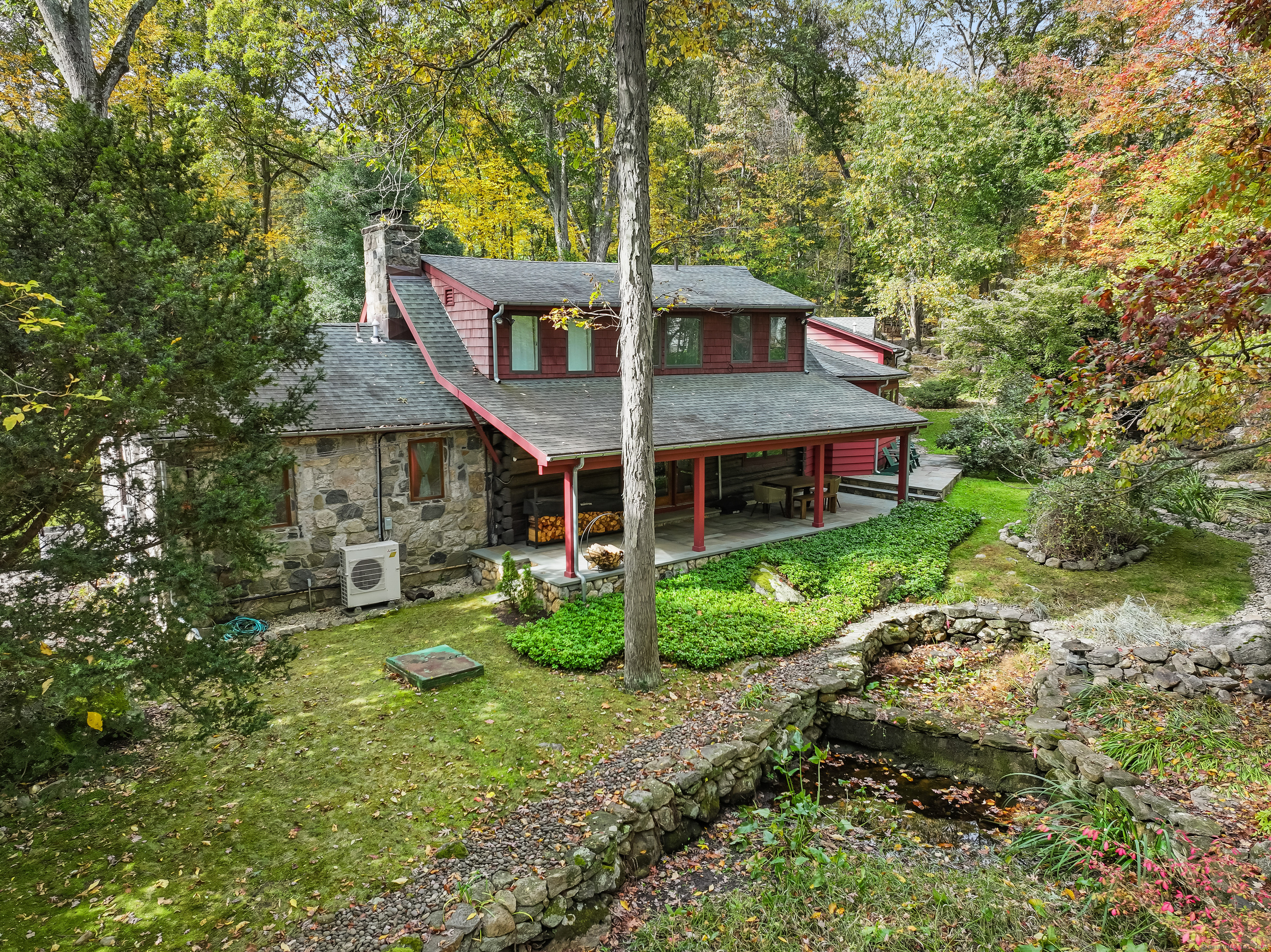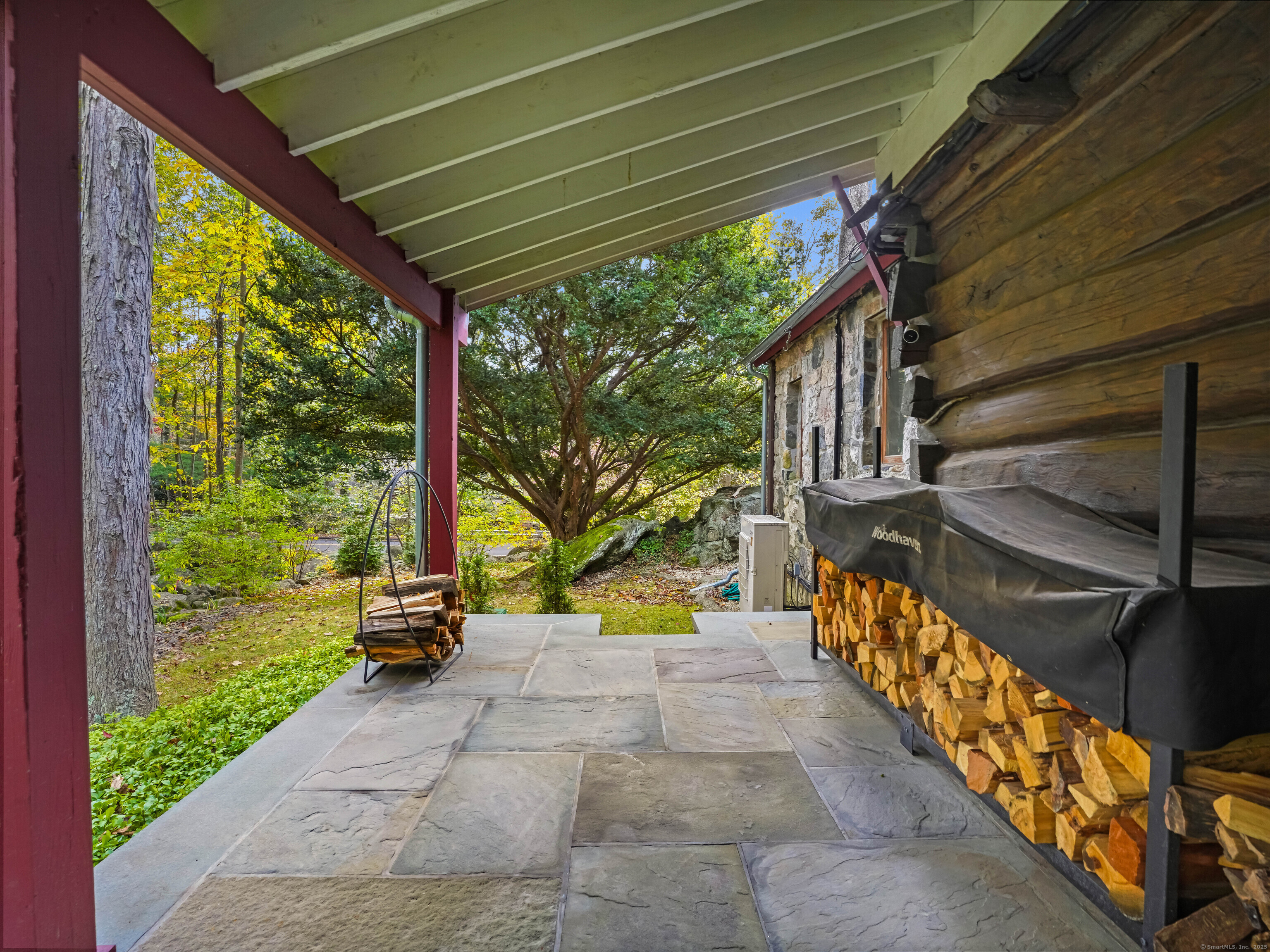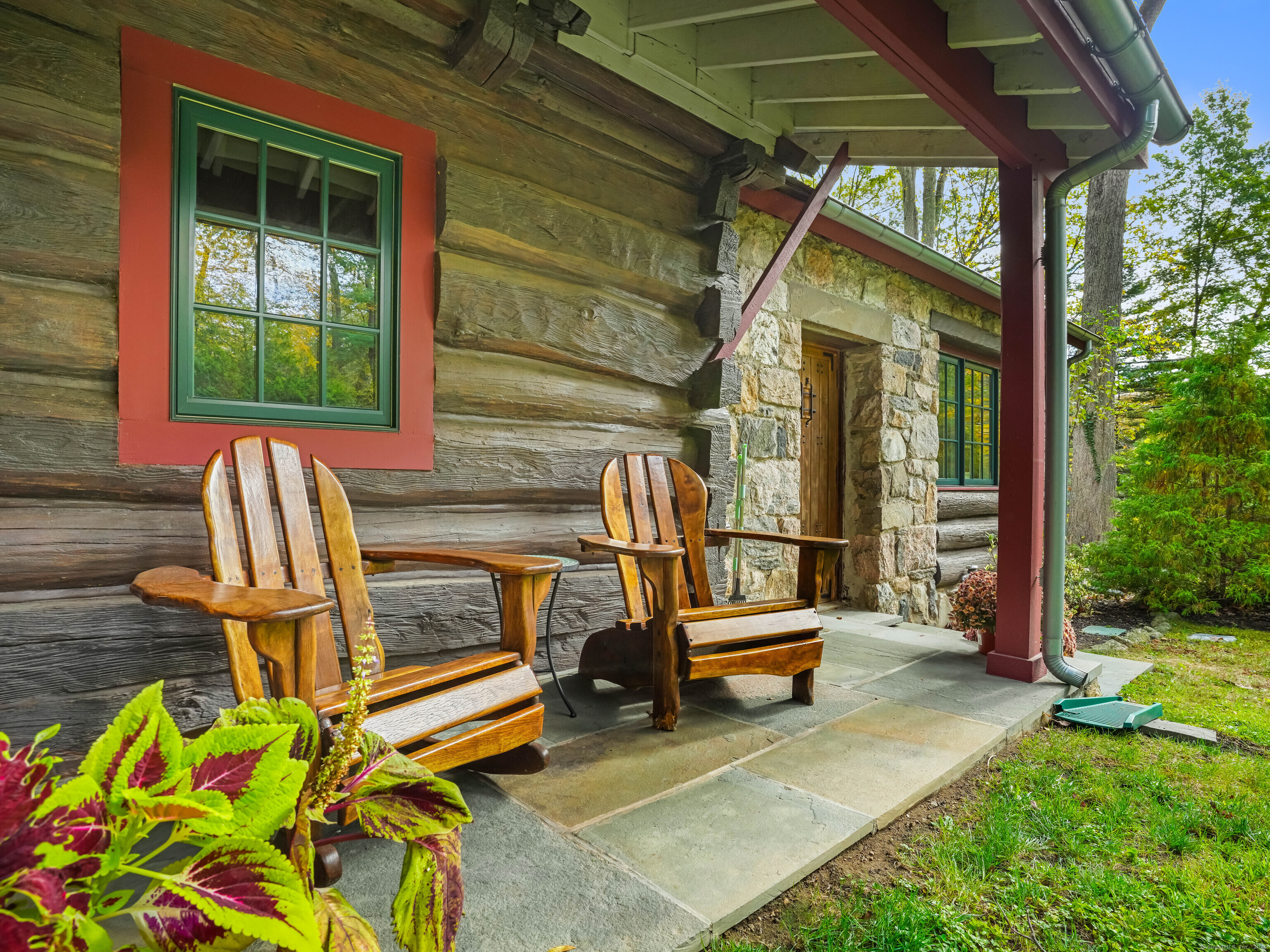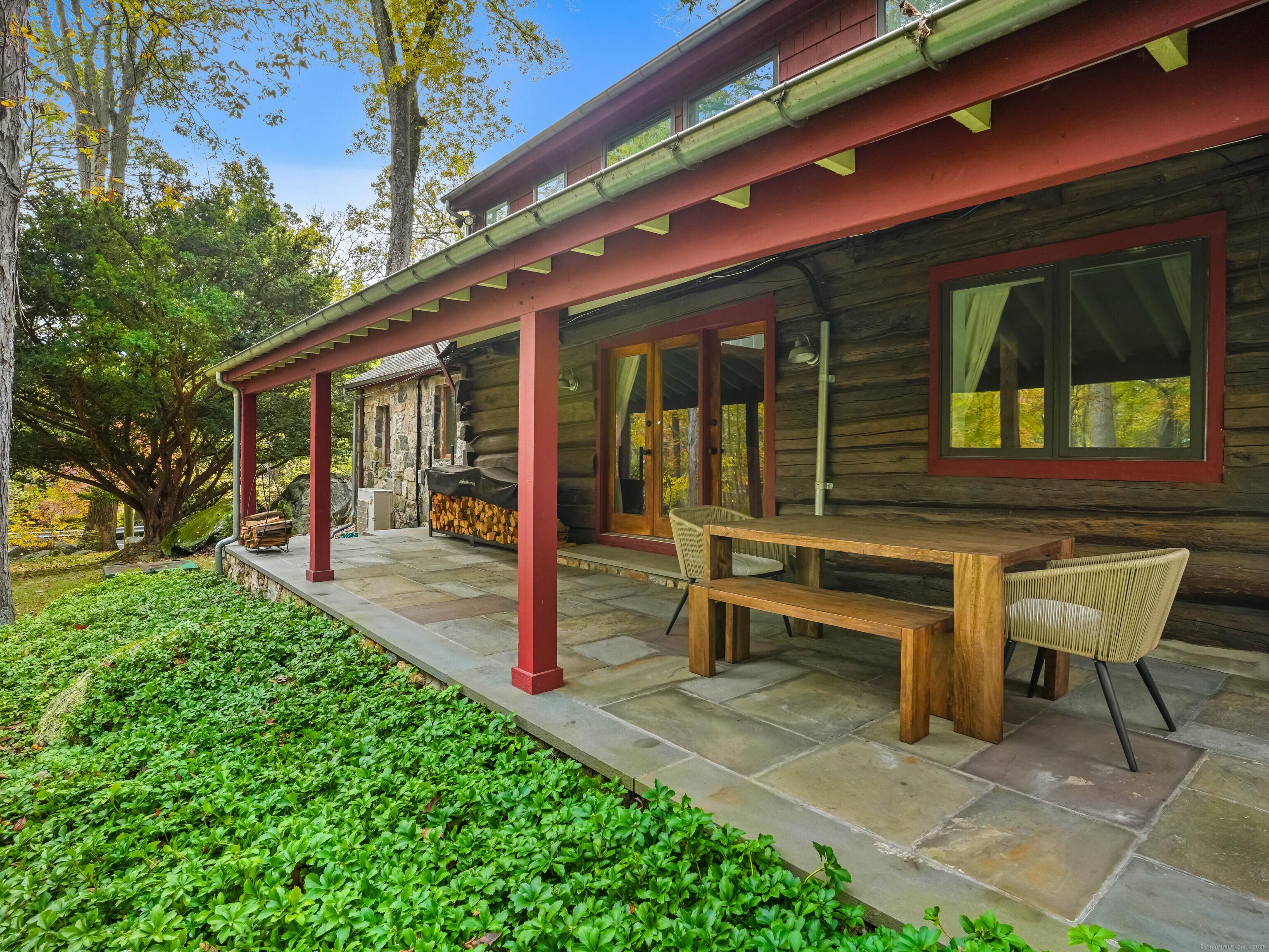 Step into living history at 400 Wire Mill Road, a one-of-a-kind log-cabin retreat once owned by Gutzon Borglum, the famed sculptor of Mount Rushmore. Built in 1877 this 3-bedroom, 2.5-bath home has been meticulously renovated from the ground up while maintaining its authentic log-cabin character blending timeless craftsmanship with modern comfort. The dramatic two-story great room showcases hand-restored logs, exposed beams, and a stunning stone fireplace opening to a covered patio and lush, landscaped grounds. The 2021 kitchen features Brazilian Negresco quartzite countertops, custom cabinetry, and top-tier appliances, while updated baths include European porcelain tile and spa-like finishes. A climate-controlled flex space-formerly a two-car garage-offers flexibility as a studio, gym, recreation room, or potential first-floor primary suite. Set on over an acre and surrounded by mature trees and stone walls, this property feels worlds away, yet it's just minutes from the Merritt Parkway, shopping, and schools. 400 Wire Mill Road is more than a home - it's a piece of Stamford's storied past, thoughtfully reimagined for modern living.