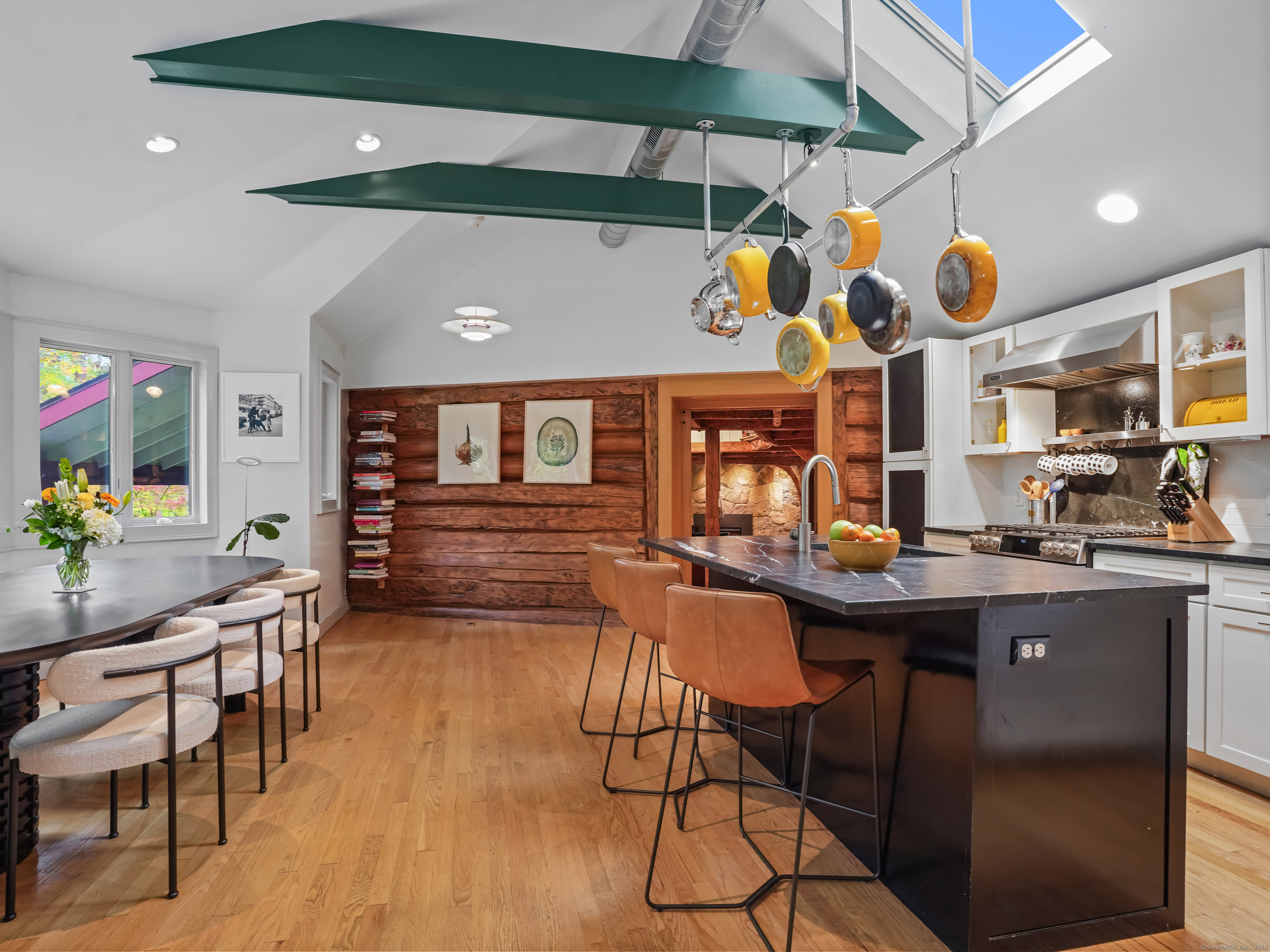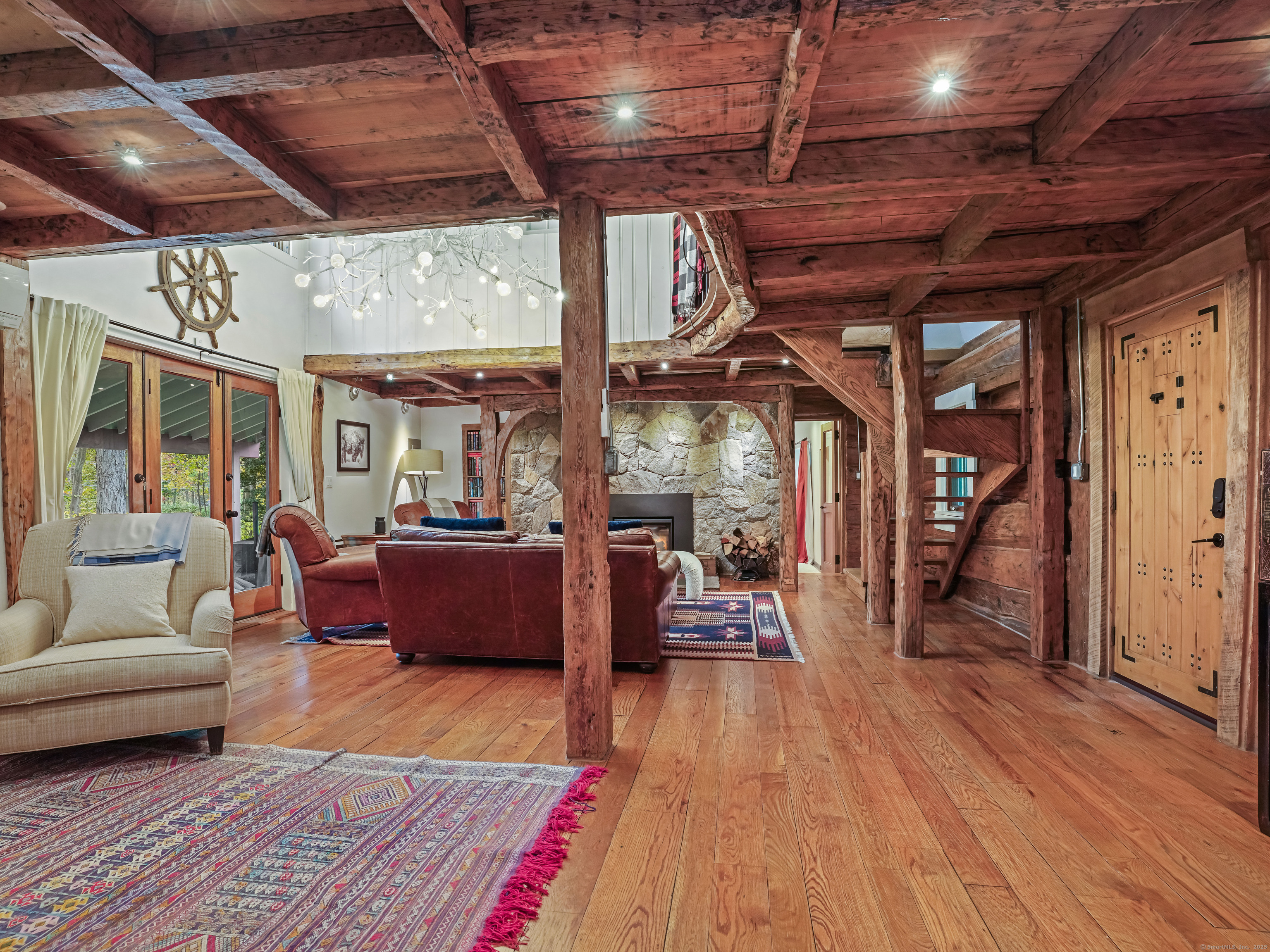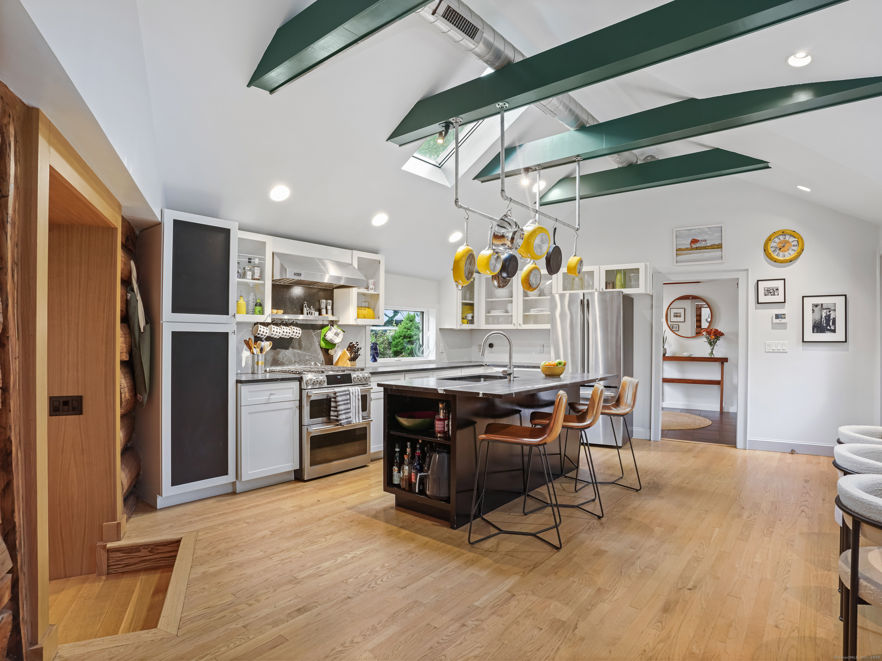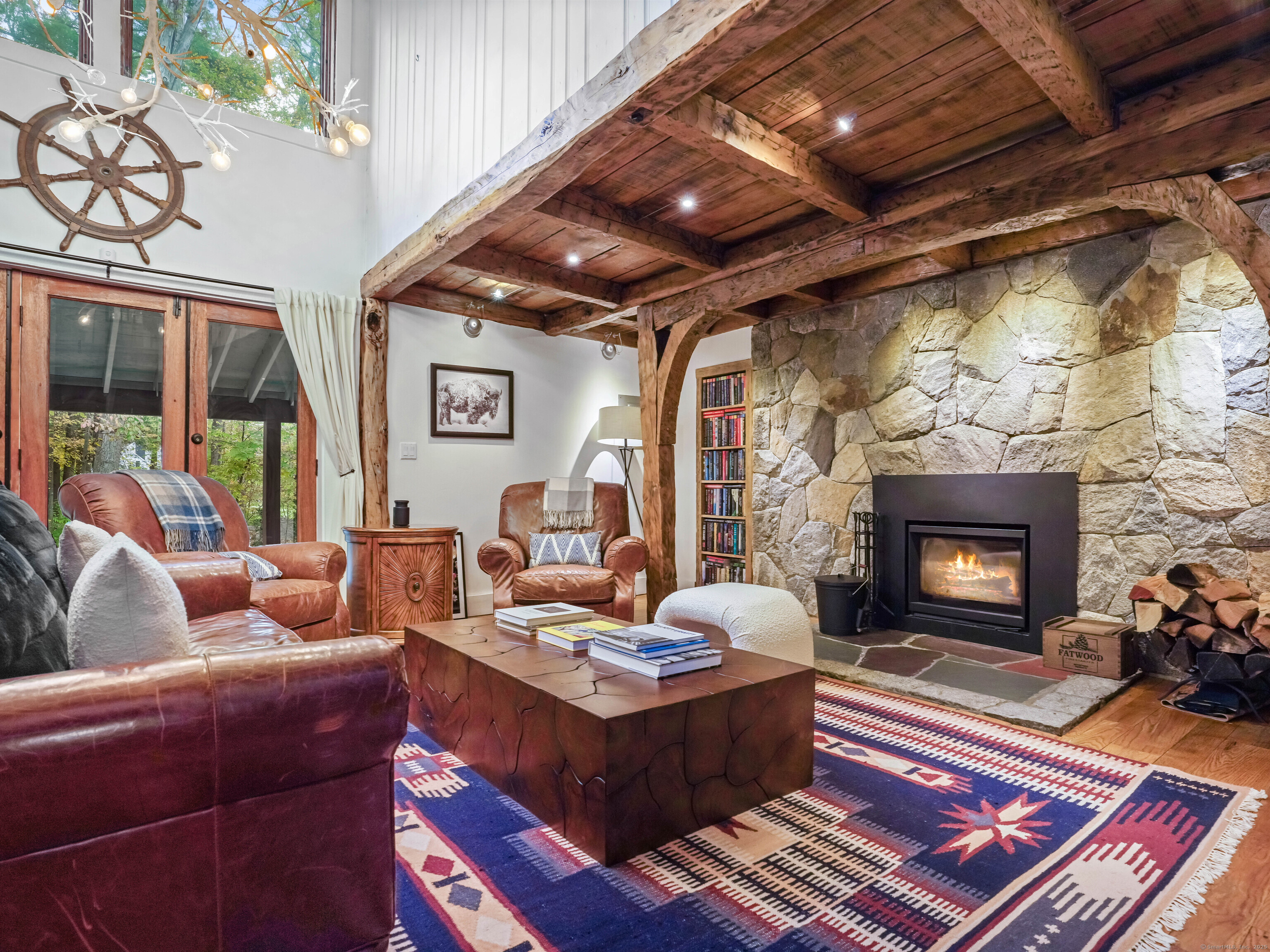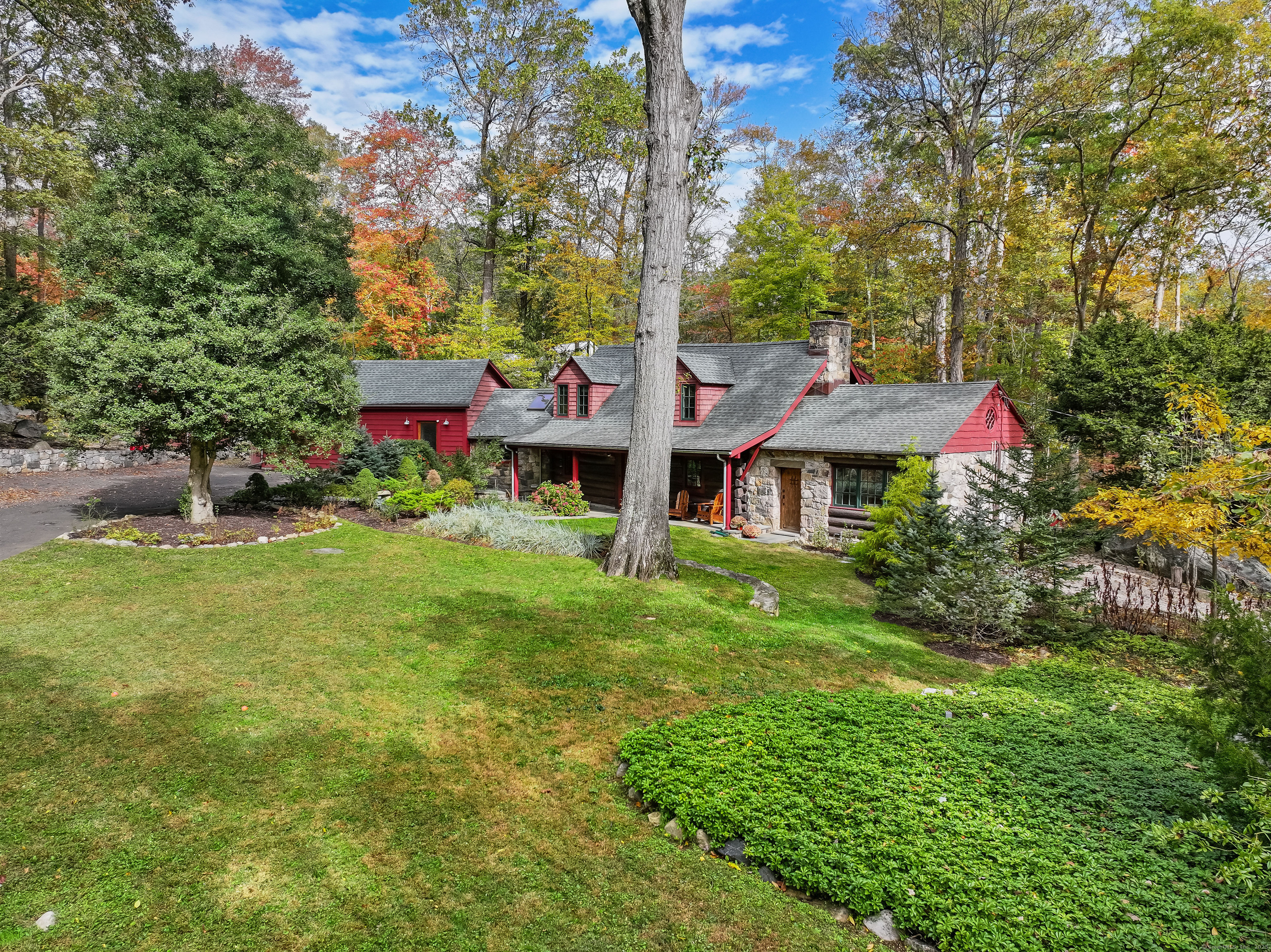 Step into living history at 400 Wire Mill Road, a one-of-a-kind log-cabin retreat once owned by Gutzon Borglum, the famed sculptor of Mount Rushmore. Built in 1877 this 3-bedroom, 2.5-bath home has been meticulously renovated from the ground up while maintaining its authentic log-cabin character blending timeless craftsmanship with modern comfort. The dramatic two-story great room showcases hand-restored logs, exposed beams, and a stunning stone fireplace opening to a covered patio and lush, landscaped grounds. The 2021 kitchen features Brazilian Negresco quartzite countertops, custom cabinetry, and top-tier appliances, while updated baths include European porcelain tile and spa-like finishes. A climate-controlled flex space-formerly a two-car garage-offers flexibility as a studio, gym, recreation room, or potential first-floor primary suite. Set on over an acre and surrounded by mature trees and stone walls, this property feels worlds away, yet it's just minutes from the Merritt Parkway, shopping, and schools. 400 Wire Mill Road is more than a home - it's a piece of Stamford's storied past, thoughtfully reimagined for modern living.