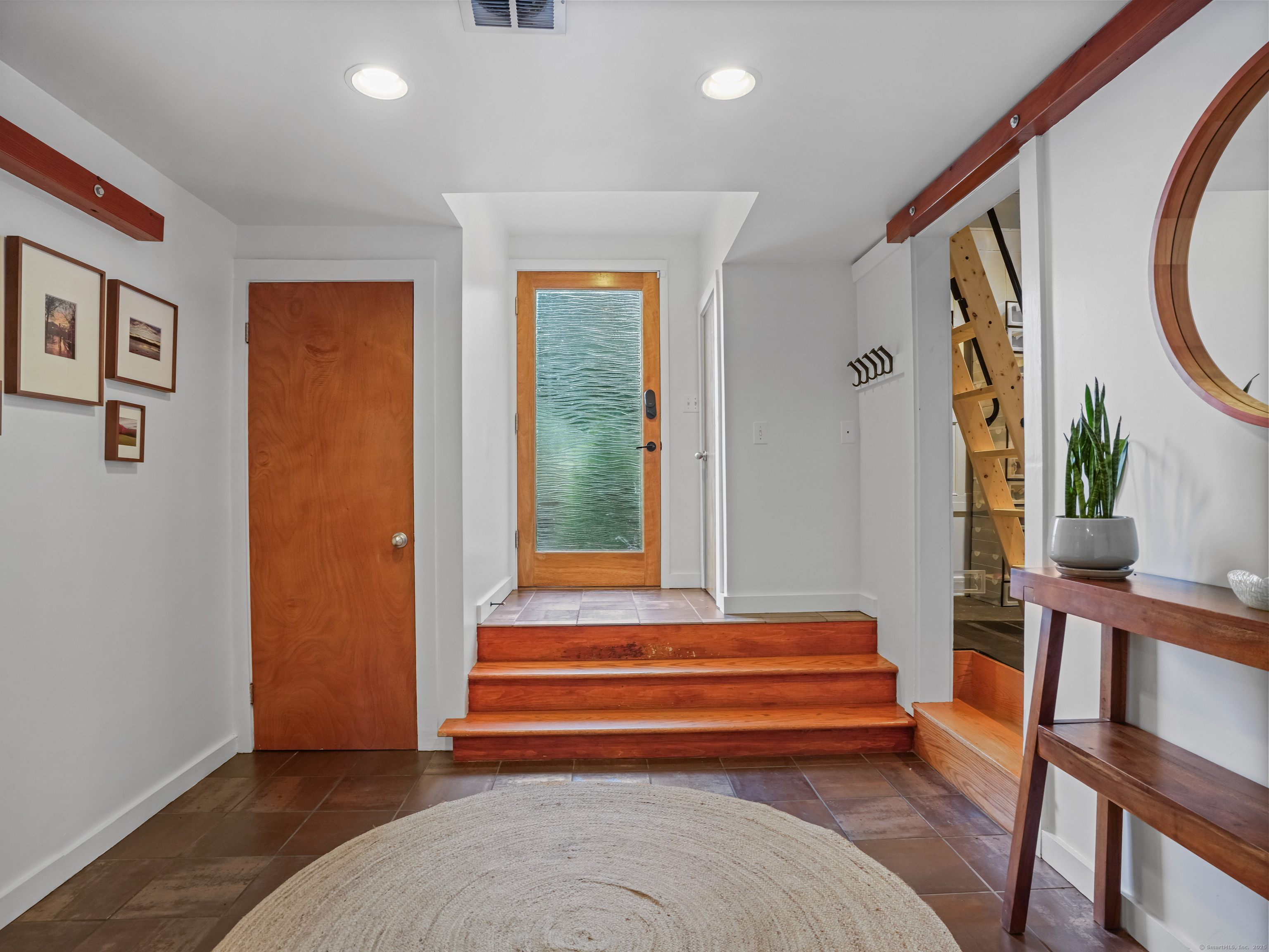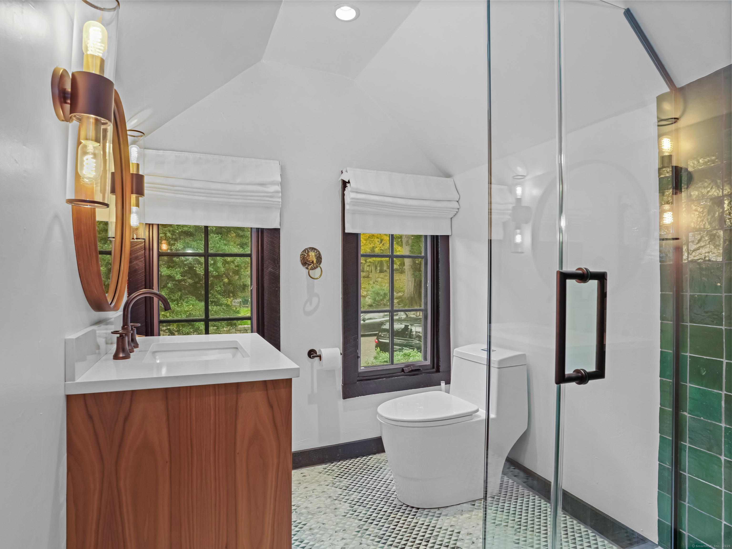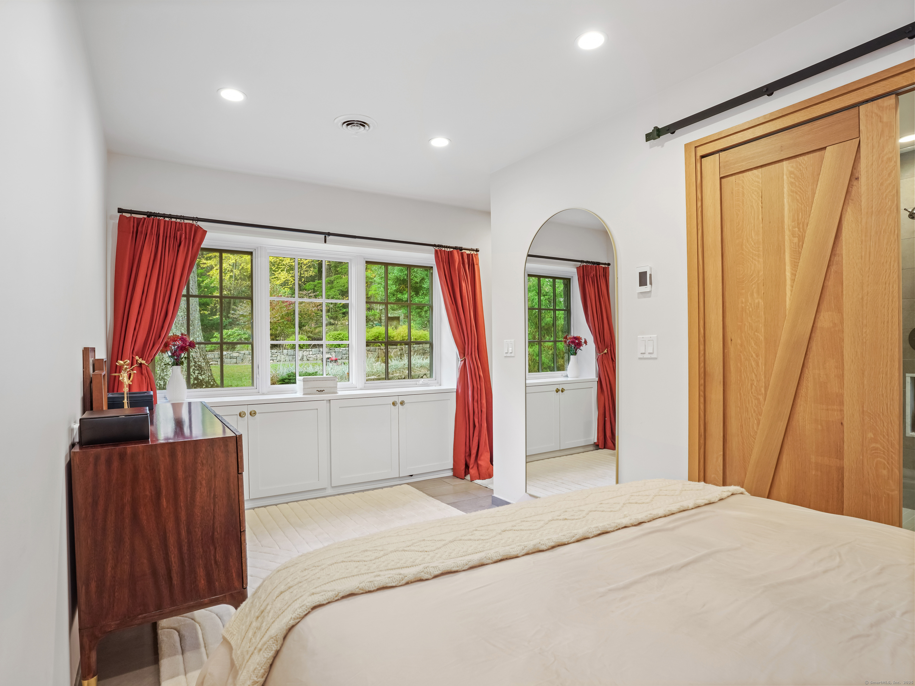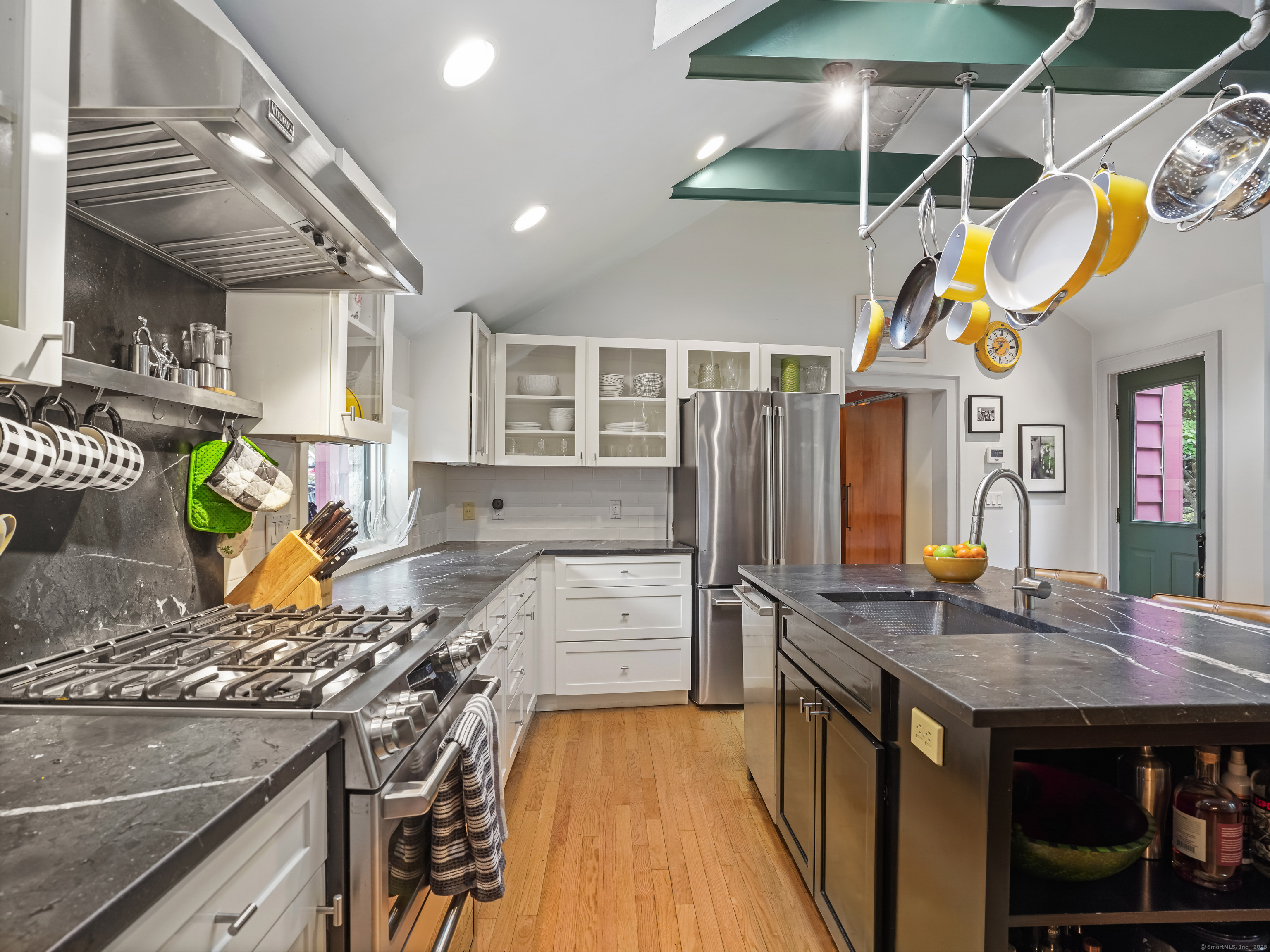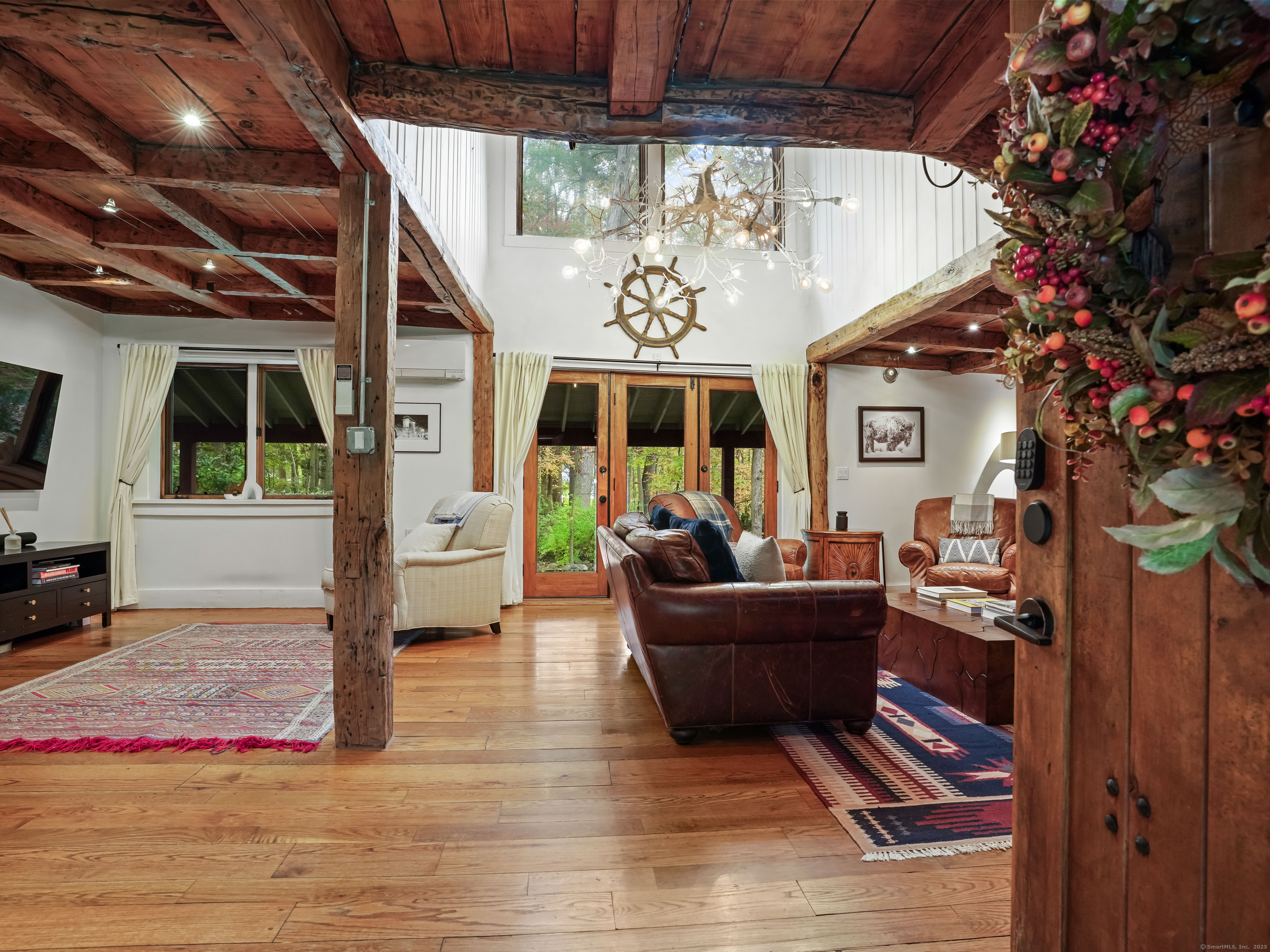 Step into living history at 400 Wire Mill Road, a one-of-a-kind log-cabin retreat once owned by Gutzon Borglum, the famed sculptor of Mount Rushmore. Built in 1877 this 3-bedroom, 2.5-bath home has been meticulously renovated from the ground up while maintaining its authentic log-cabin character blending timeless craftsmanship with modern comfort. The dramatic two-story great room showcases hand-restored logs, exposed beams, and a stunning stone fireplace opening to a covered patio and lush, landscaped grounds. The 2021 kitchen features Brazilian Negresco quartzite countertops, custom cabinetry, and top-tier appliances, while updated baths include European porcelain tile and spa-like finishes. A climate-controlled flex space-formerly a two-car garage-offers flexibility as a studio, gym, recreation room, or potential first-floor primary suite. Set on over an acre and surrounded by mature trees and stone walls, this property feels worlds away, yet it's just minutes from the Merritt Parkway, shopping, and schools. 400 Wire Mill Road is more than a home - it's a piece of Stamford's storied past, thoughtfully reimagined for modern living.