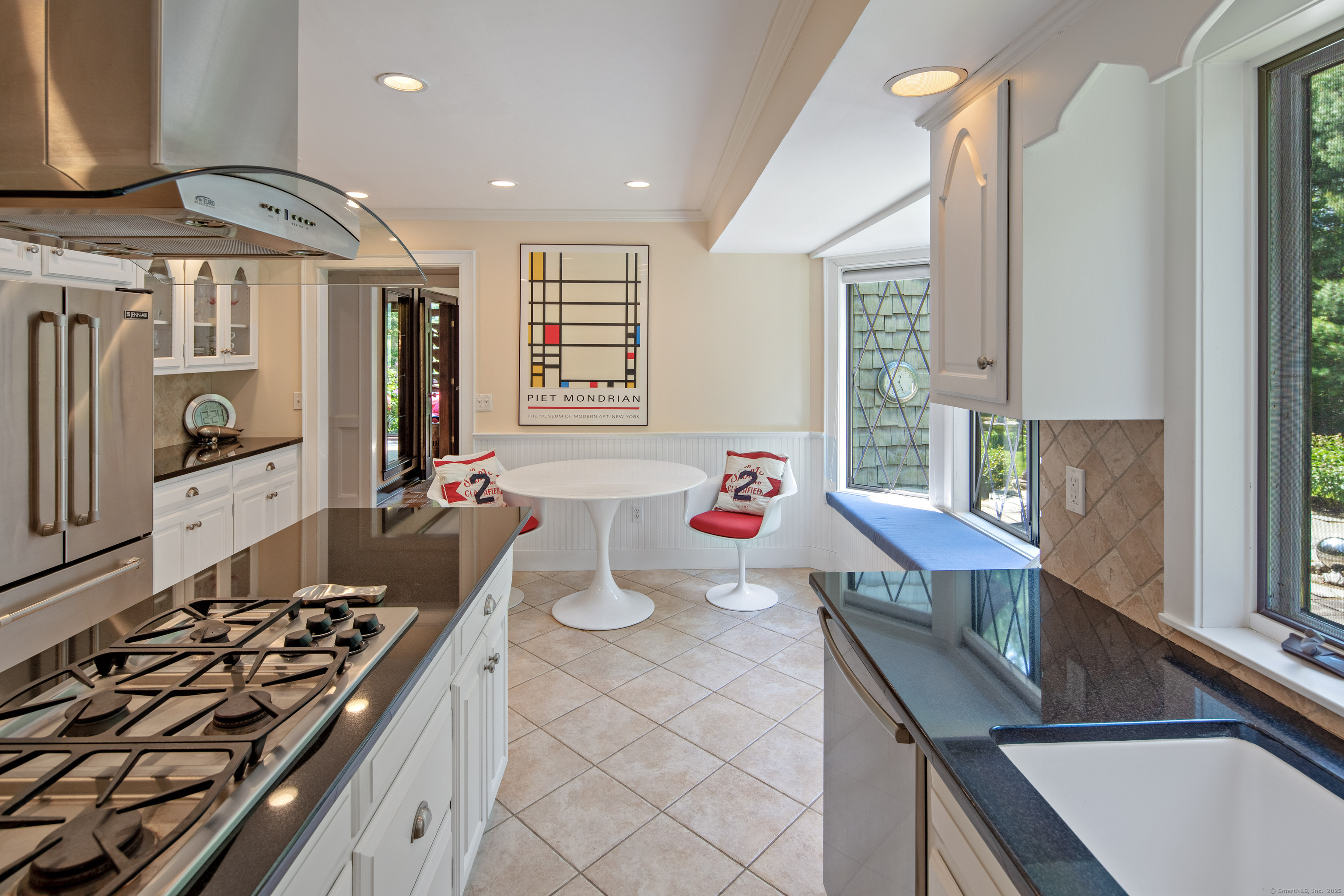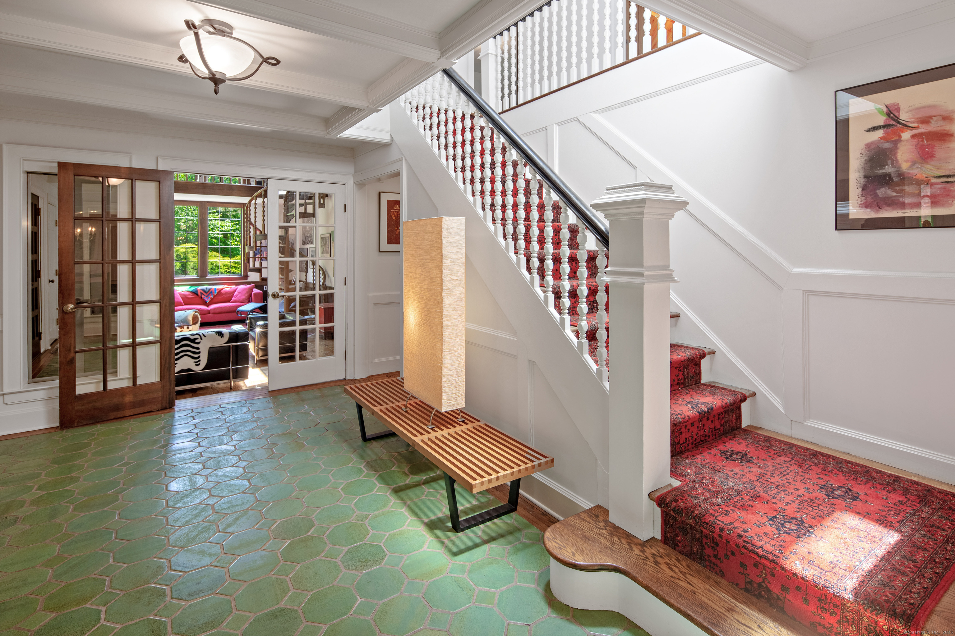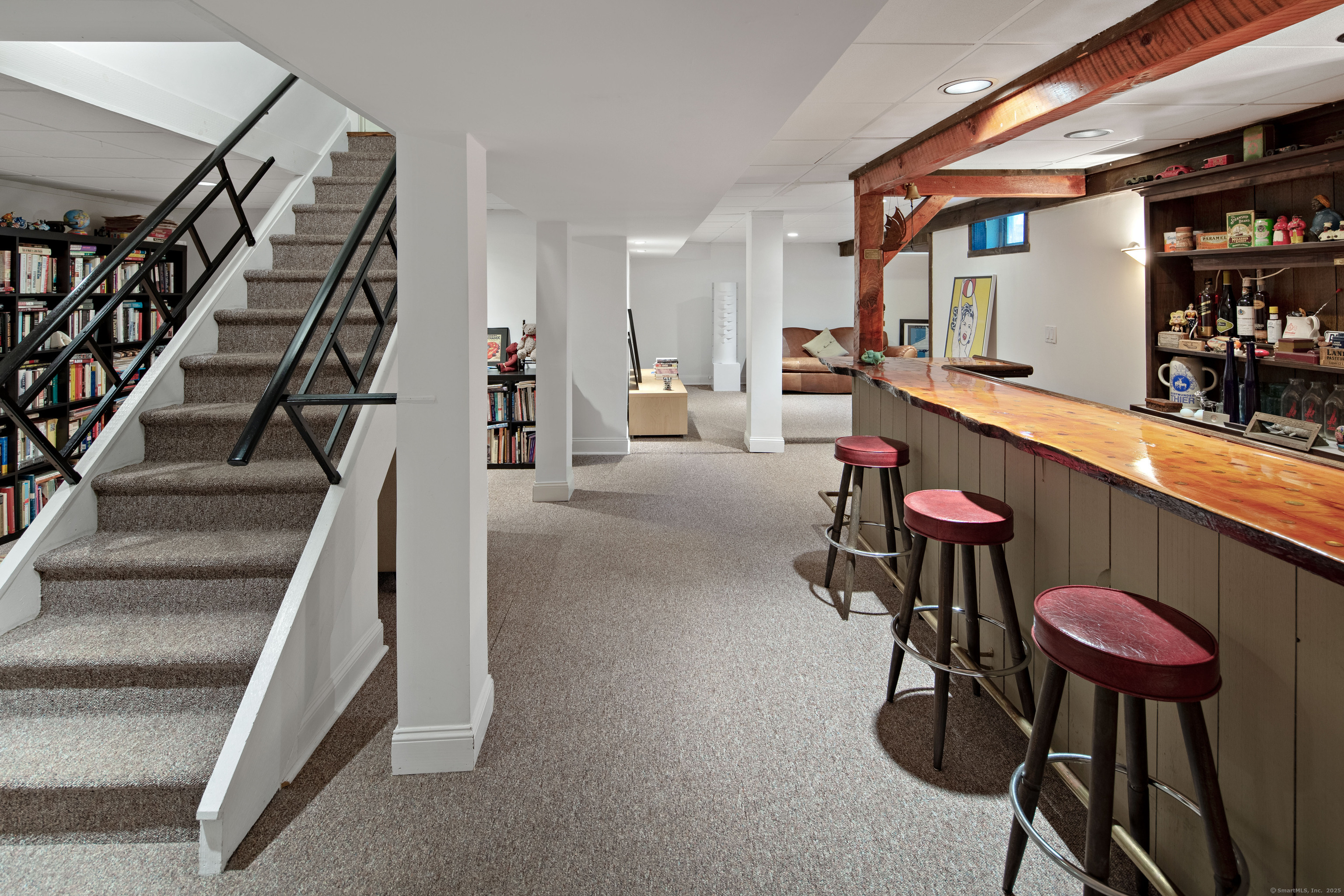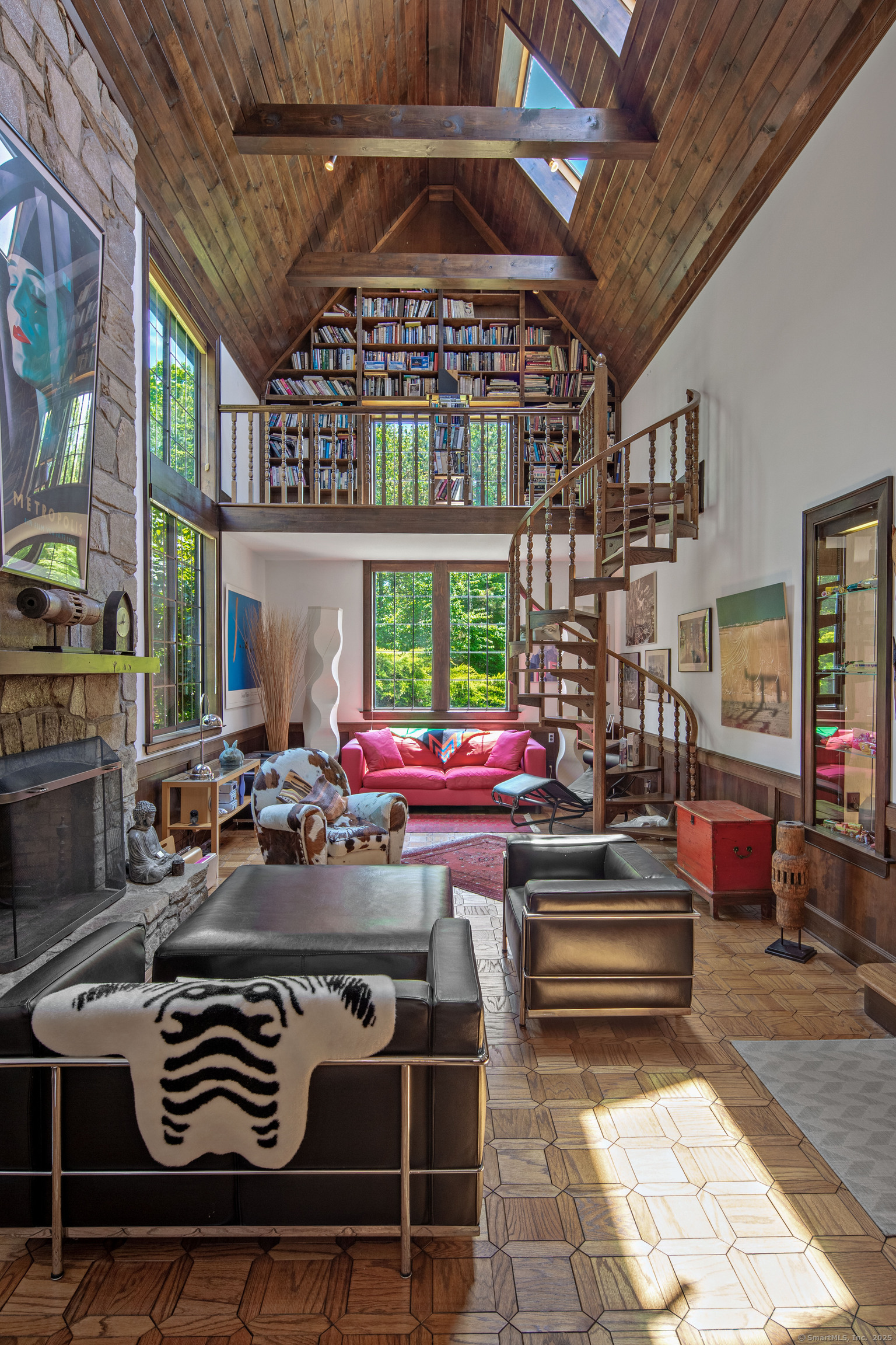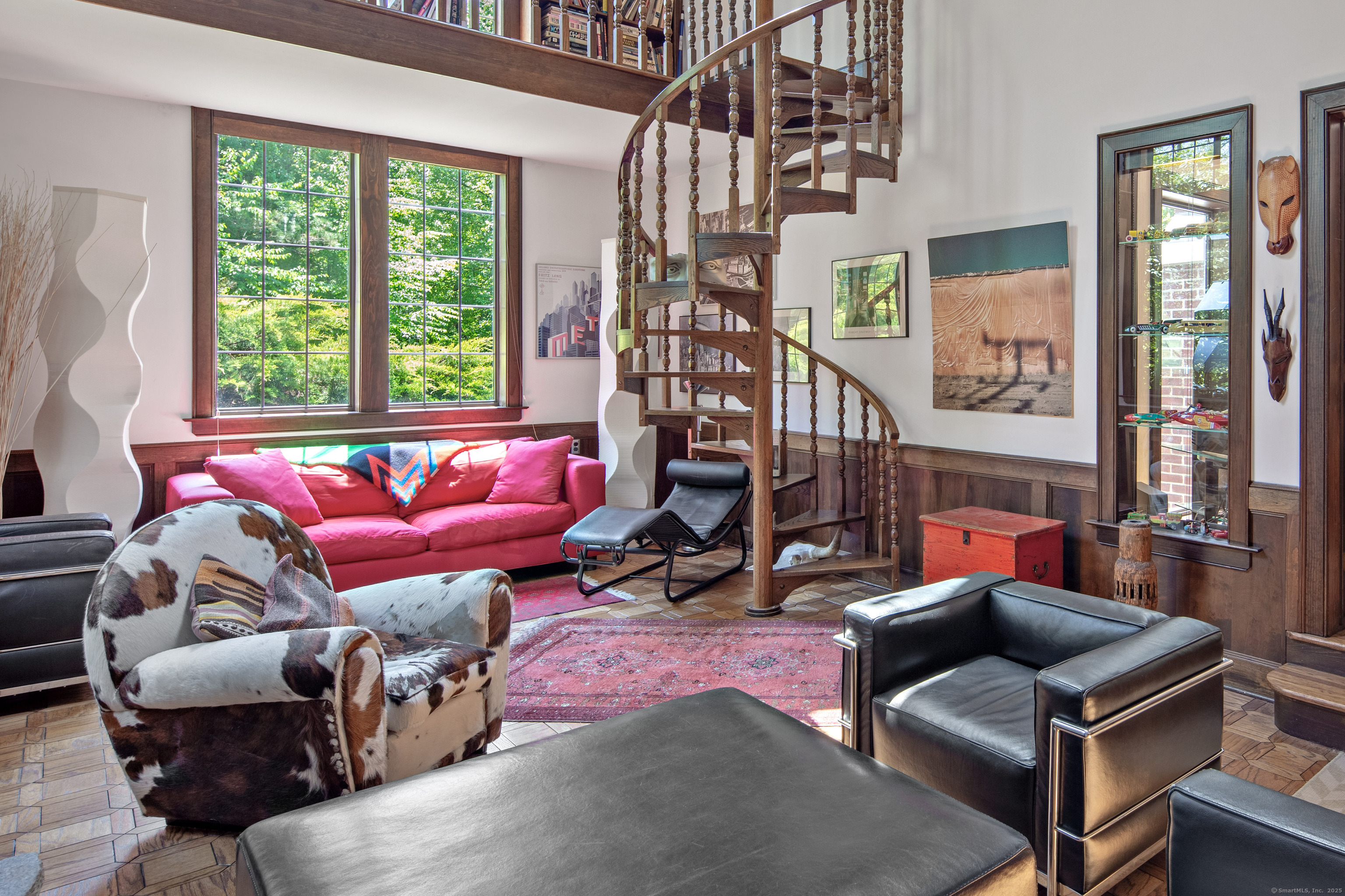 This magical 4,000 square-foot English Tudor with its loft library overlooking the 35' great room featuring a soaring stone fireplace is perfect for weekend escapes from the big city, or for gracious full-time family enjoyment. Sited on 2.65 dog-fenced acres, this home -- once featured in The New York Times -- has a rich history. Custom-designed, it 's been home to musicians and writers. Features include the great room flooded with light, soaring stone fireplace, and stairs to the bookcase-lined loft. The bright, eat-in kitchen with all new appliances features a banquette overlooking the flagstone terrace and rear property bordered by protected land. The coffered ceiling dining room is an entertainers' delight. Closeby is a cozy den with a raised hearth fireplace, and powder room. The center entry hall has two closets and full-length mirrors. The 2nd level includes the master suite with dressing room, clawfoot tub and steam shower. There are three other bedrooms with generous closets, and a full bath with double sinks. The finished lower level includes a family room, gym, imported English pub, and laundry room. This extraordinary property with recent exterior renovations is just 15 minutes to the Merritt, 20 minutes to Westport, and an hour to Grand Central.