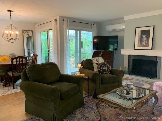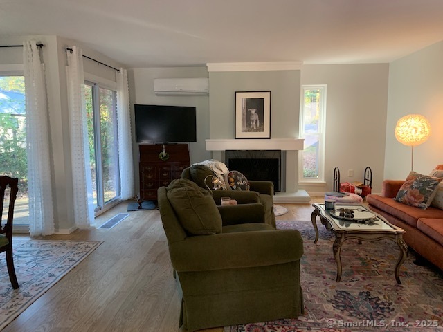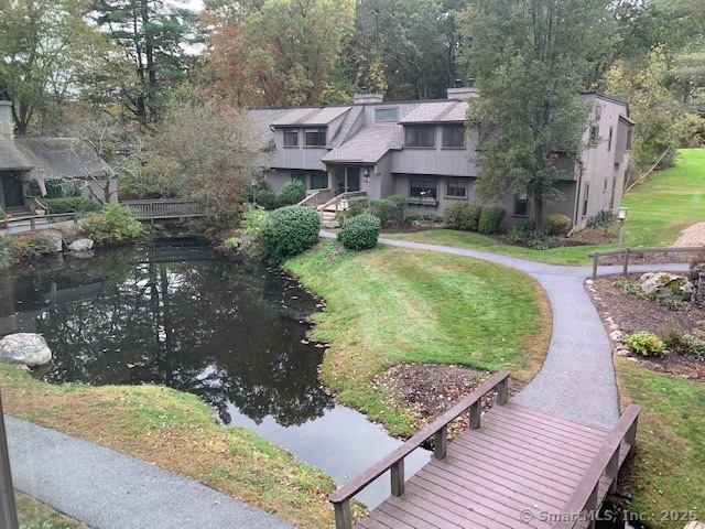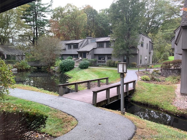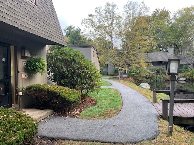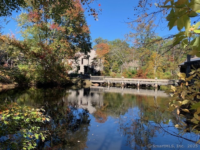 Rare - private - completely updated end unit overlooking pond and babbling brook in serene bright setting. This 2 BR, 1.5 BA, end unit with 1,365' sf of living space has recently undergone many upgrades. The living and dinning rooms are combined to form an open floor plan with a fireplace and double sliders leading out to a patio that overlooks a very private and serene pond. Engineered hardwood floors were just installed throughout the entire main level, new hot water heater, the entire unit was freshly painted with earth toned colors, the kitchen has newer cabinets, stainless steel appliances, new light fixtures and granite countertops. Both bathrooms underwent entire updating, all the windows and sliders were replaced with double pane thermo insulated glass. In addition to the installation of baseboard heating units there are 3 LG Mini Split units providing energy saving heating and cooling. Farmington Woods is a gated community with a 18-hole Championship USTA golf course with a full-service restaurant & clubhouse, tennis, paddleball, and pickleball courts, swimming pools, community gardens, miles of sidewalks for safe walking and jogging. The monthly HOA is $474.58, Xfinity cable/internet is $54.19, Minimum restraurant is $35, and the Quarterly district tax is $508.27.