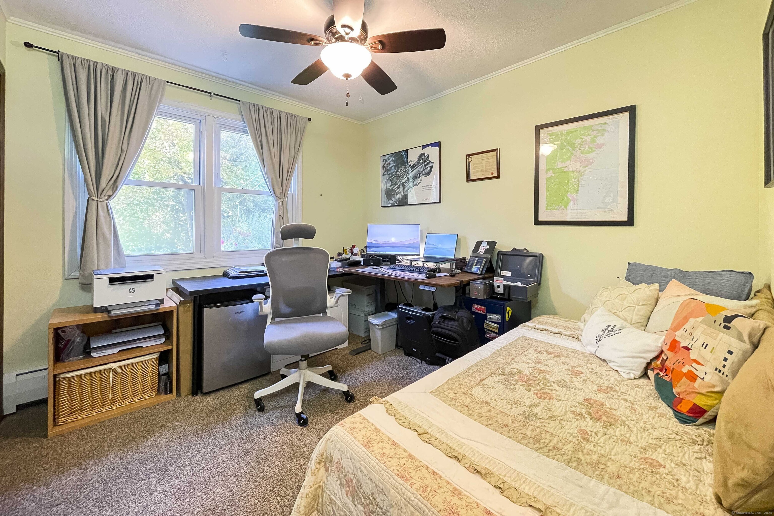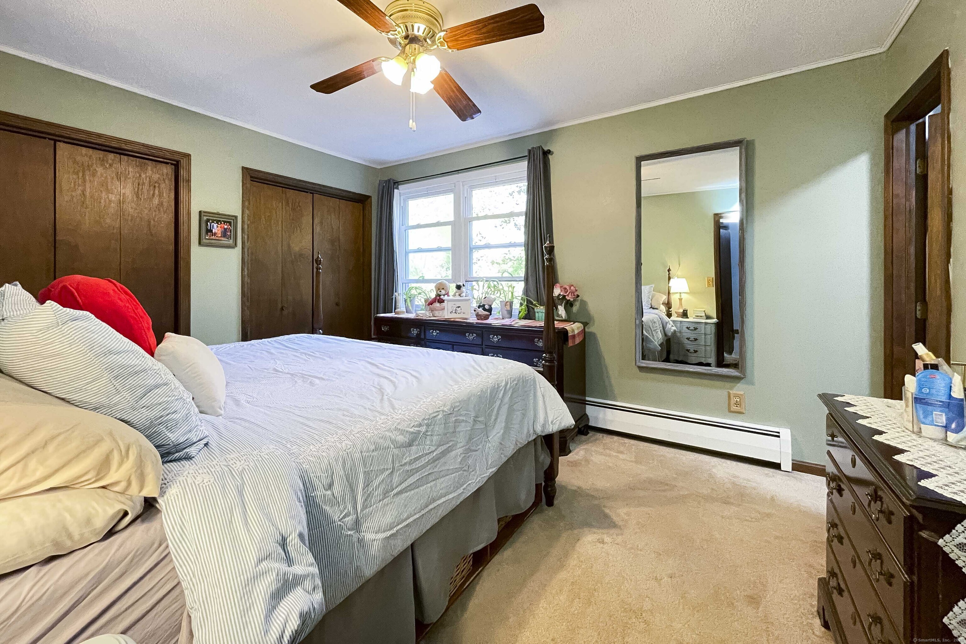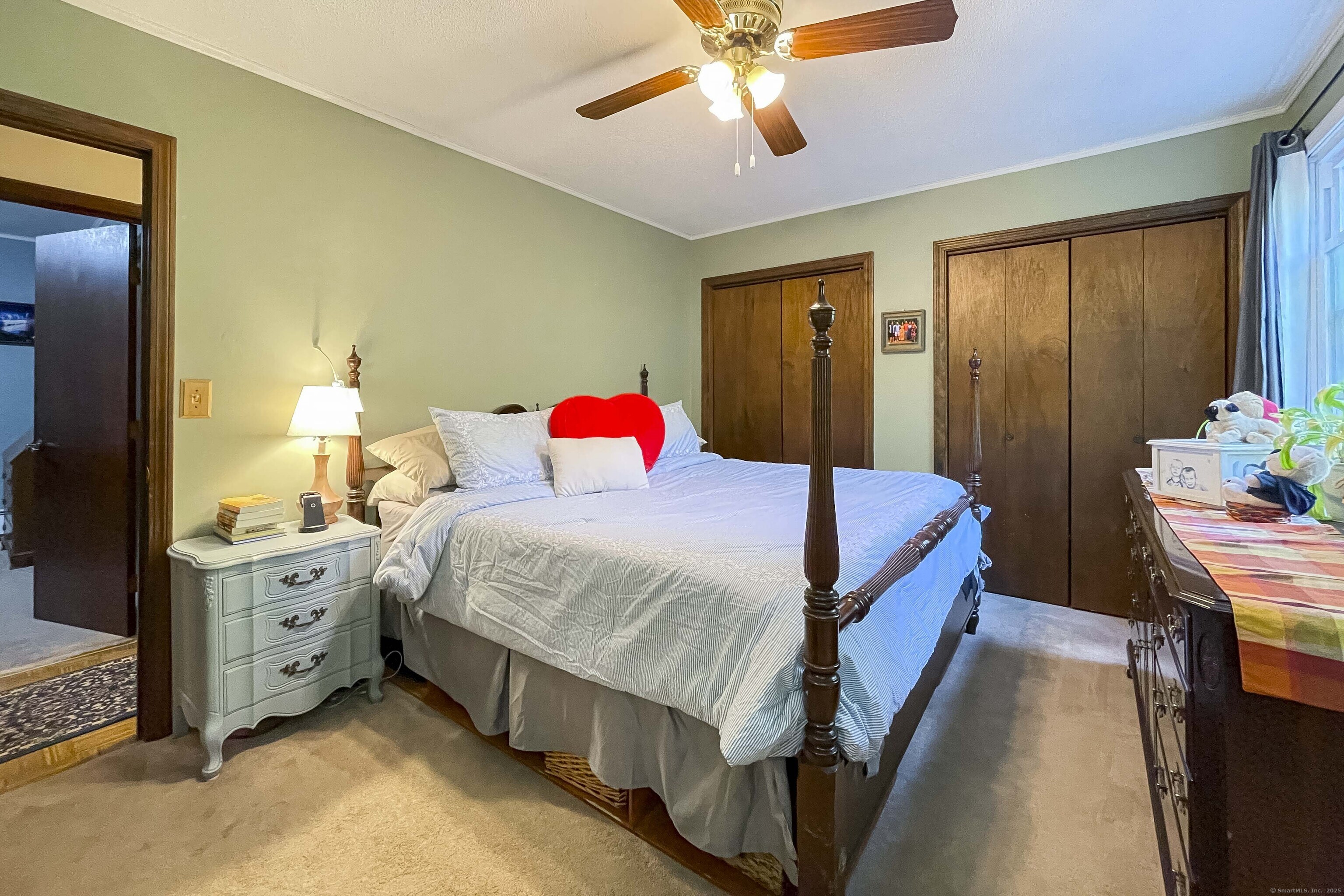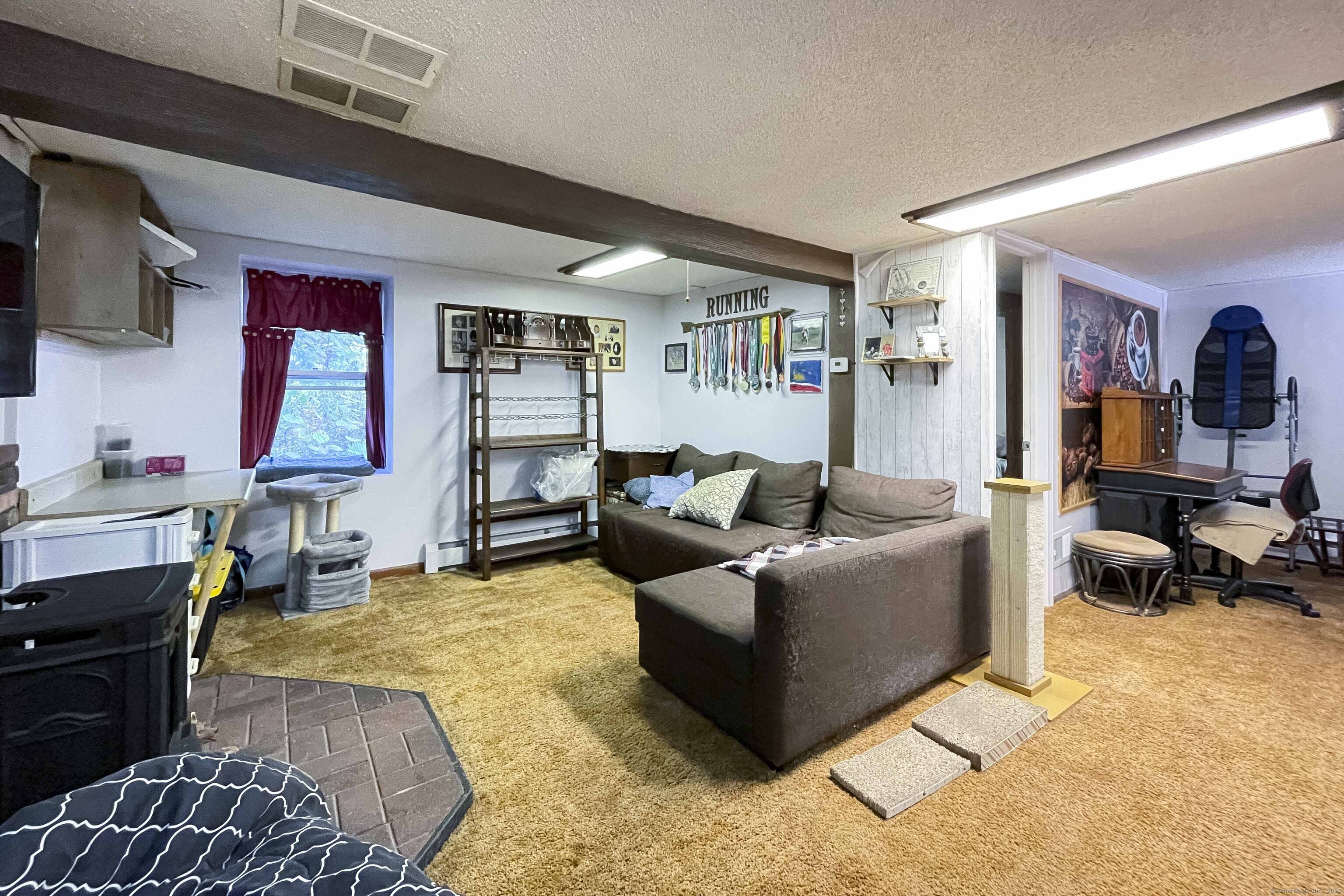 Pretty ranch home offers all the charm of a cozy cottage with the space you'll need for comfortable living. Set on nearly 3/4 acre private lot, this home features a partially finished walk-out lower level, efficient natural-gas heating, and two car garage. Step into the open main living space with dining area featuring a vaulted ceiling, skylights, toasty gas-log stove, and built-in shelving. The kitchen with stainless steel appliances and newly tiled floor leads to the three main-level bedrooms, including a primary suite with full bath and two closets. A mudroom/office area leads to the lower level consisting of a spacious den with another cozy gas-log stove, a separate room being used as a bedroom, and laundry room. Step outside to enjoy the lovely private yard with plenty of room for gardening, play, or simply relaxing in nature. Only one mile from Quinnipiac University, Sleeping Giant Park and the Farmington Canal Trail! Welcome Home!