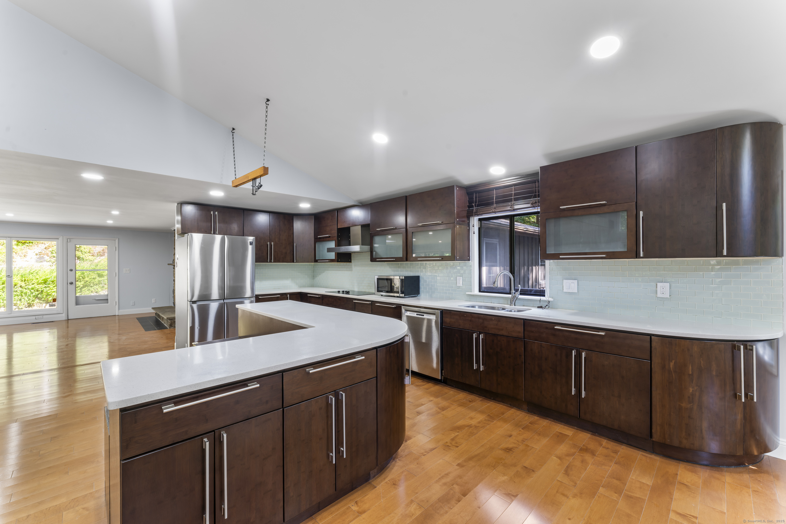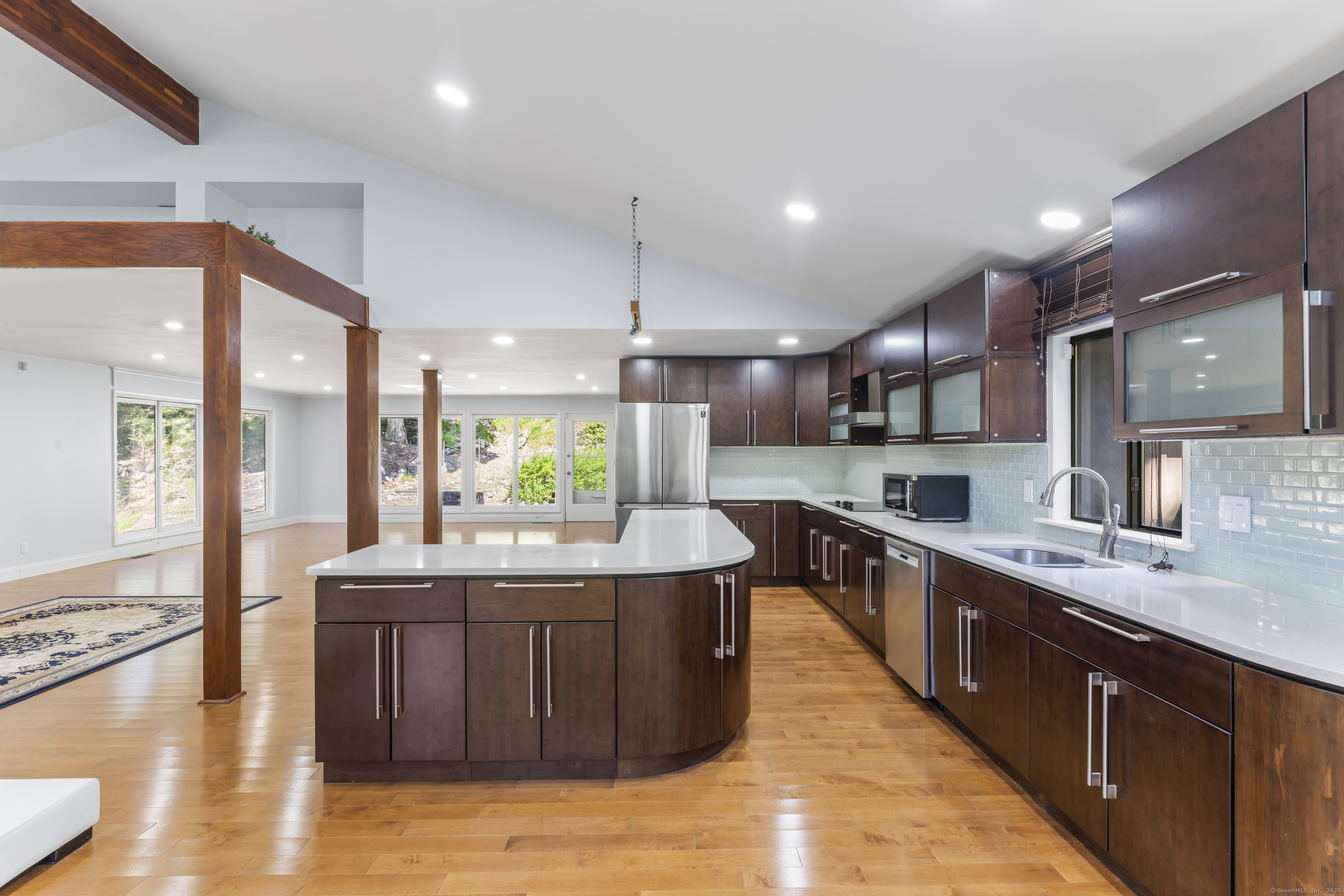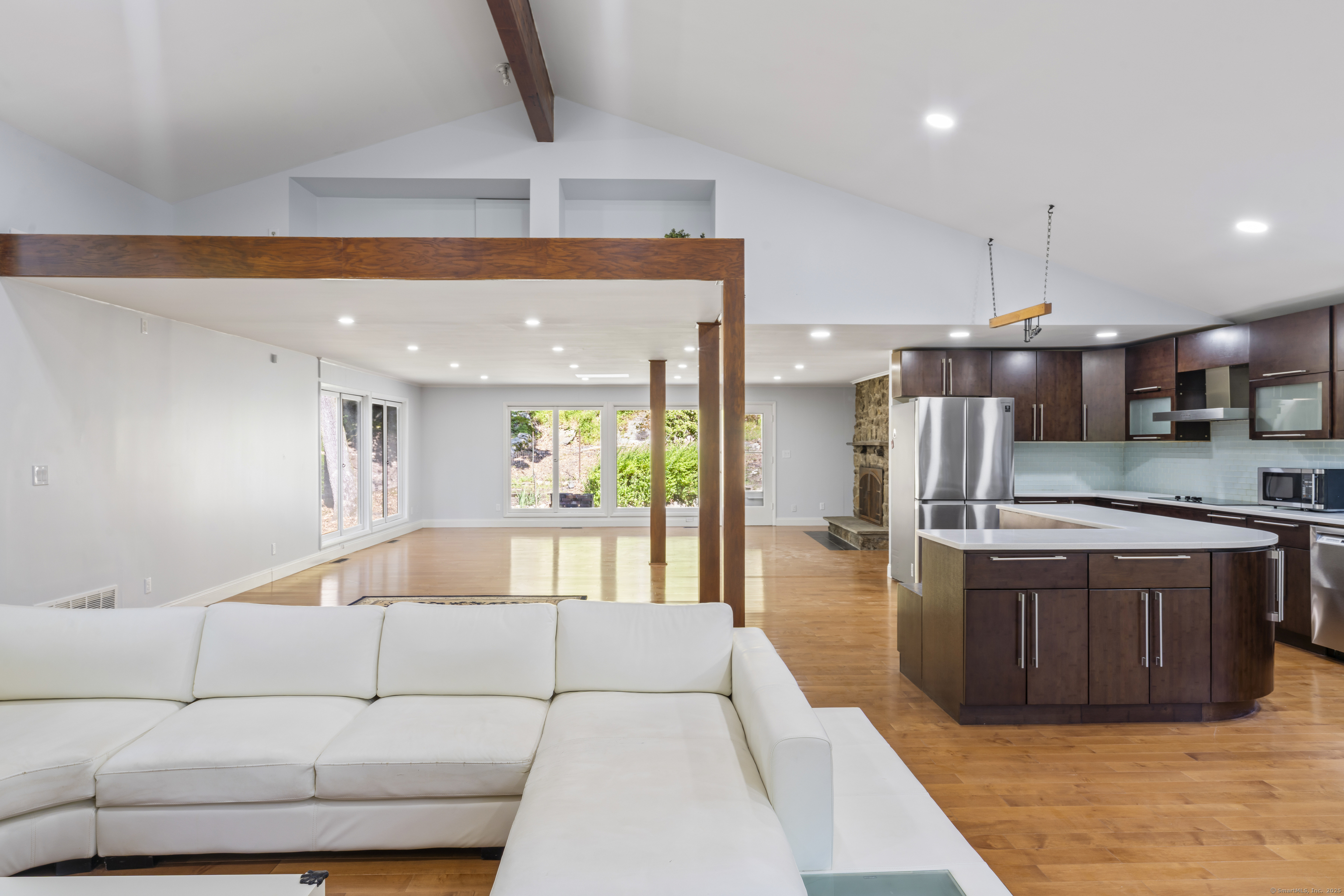 Tucked into the quiet elegance of Lower Easton, 83 Buck Hill Road blends mid-century modern design with thoughtful contemporary updates. Set on 3+ private wooded acres, this striking ranch offers light-filled living and serene views throughout. The main level features a dramatic great room with vaulted ceilings, exposed beams, and oversized windows that invite the outdoors in. A chef's kitchen with custom cabinetry, stainless steel appliances, and an oversized island flows into open dining and living areas-ideal for entertaining. The spacious primary suite includes treetop views and an updated en-suite bath. Two additional bedrooms share a modern full bath, plus there's a guest powder room, laundry/mudroom, and a partially finished lower level with fireplace perfect for a gym, playroom, or media room. Enjoy the expansive wraparound deck, two fireplaces, and room to expand or garden-all just minutes from the Merritt Parkway, hiking trails, farm stands, and top-rated schools and commute to NYC!