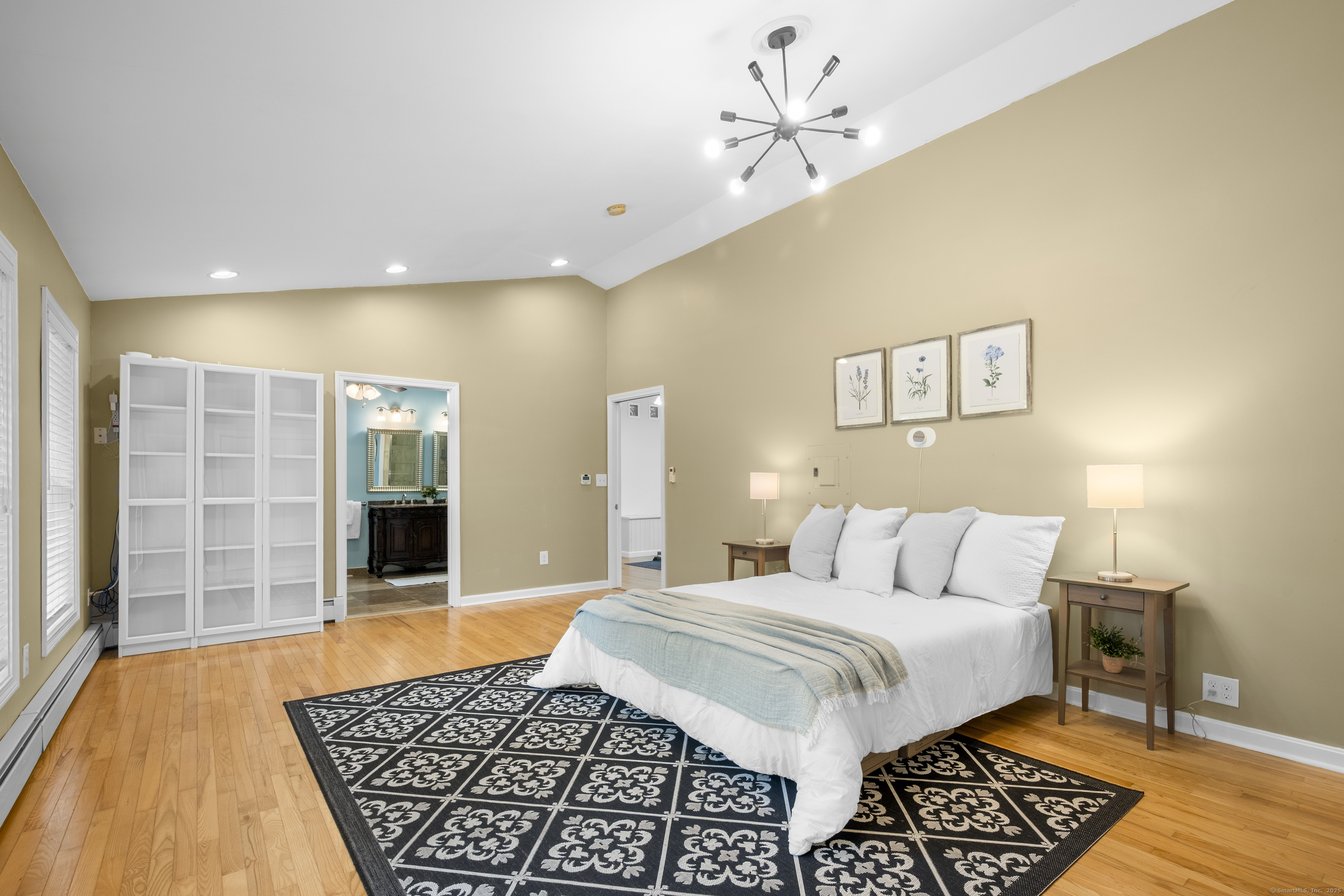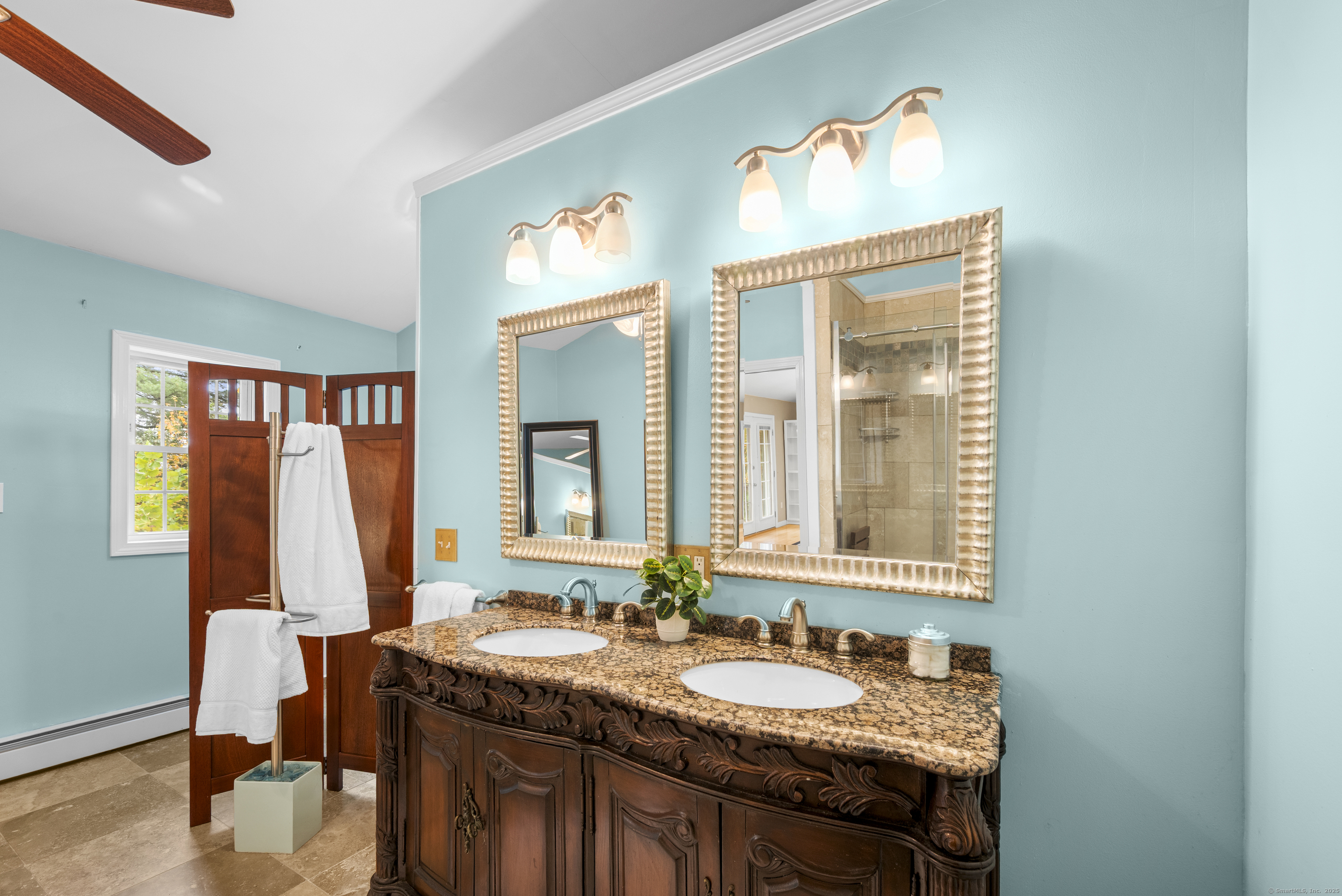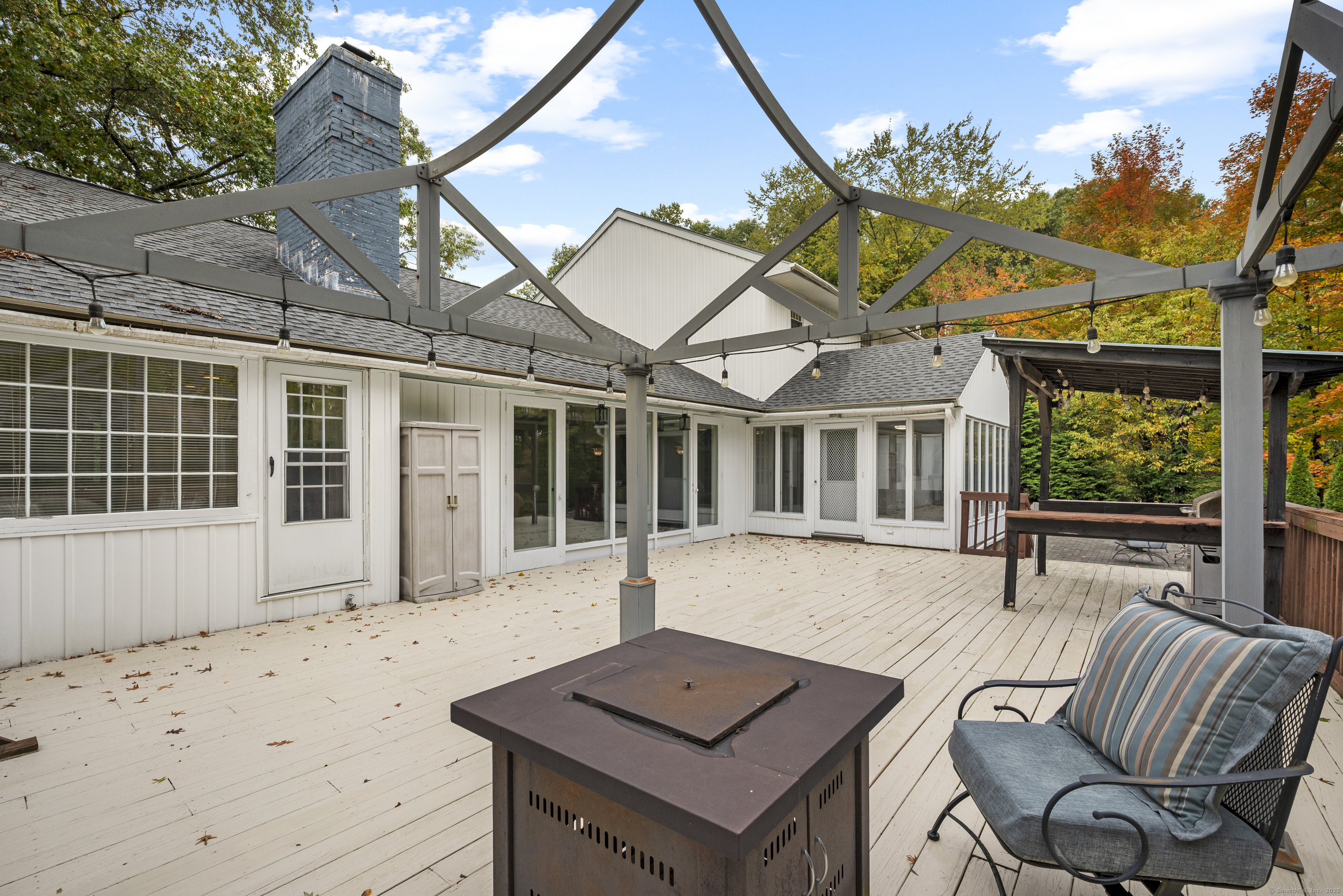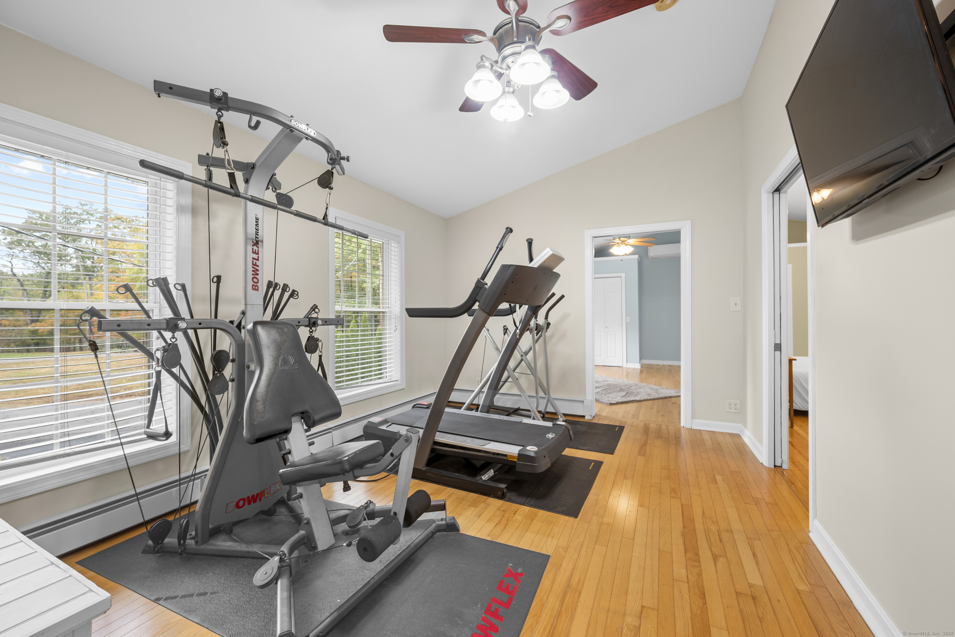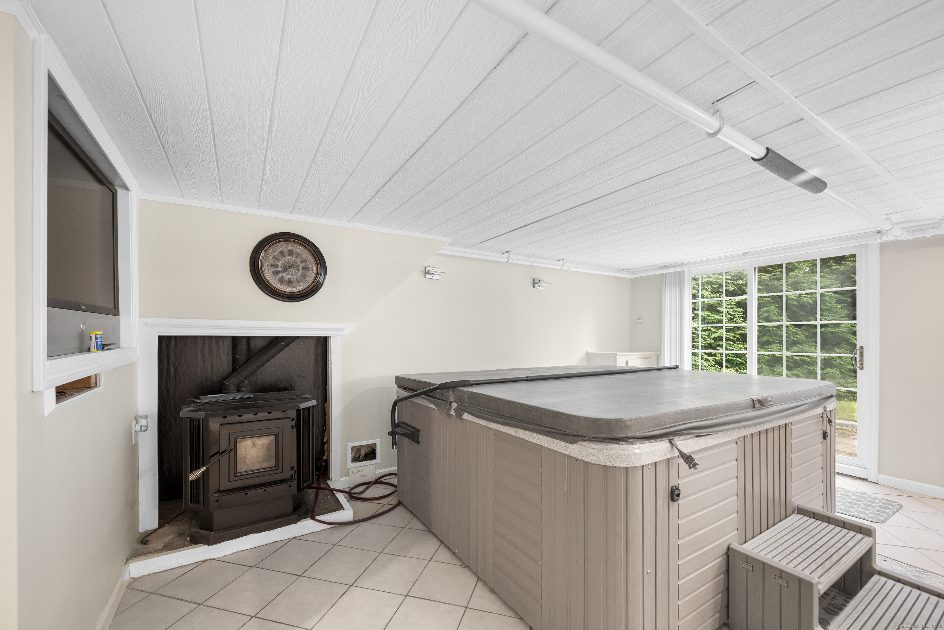 Tucked away on a quiet cul-de-sac just minutes from vibrant West Hartford Center, this expansive 5-bedroom, 3 full and 2 half bath home offers space, comfort, and modern upgrades in one of the area's most desirable locations. Hardwood floors run throughout the home, complementing a spacious living room with a fireplace and oversized glass doors that open to a private deck-perfect for entertaining or relaxing. The kitchen opens to a large, heated sunroom filled with natural light. The primary suite has two large closets, en-suite with walk-in shower and double vanity, and a private balcony overlooking the back patio. A second bedroom, half bath, and a dedicated exercise room round out the upper level. Downstairs, find three additional generously sized bedrooms-one with its own en-suite bathroom and another with a cozy wood-burning fireplace. A full bathroom with walk-in shower serves the main floor. The fully finished basement spans the entire footprint of the home and includes a pool table, hot tub, kitchenette, and additional bathroom. Modern upgrades include owned solar panels with a Tesla Powerwall battery for whole-house backup, a new roof (2023), and new air conditioning and heat pump systems. Close to amenities such as shopping, dining, and the West Hartford reservoir. Don't miss your chance to own this home in an unbeatable West Hartford location!