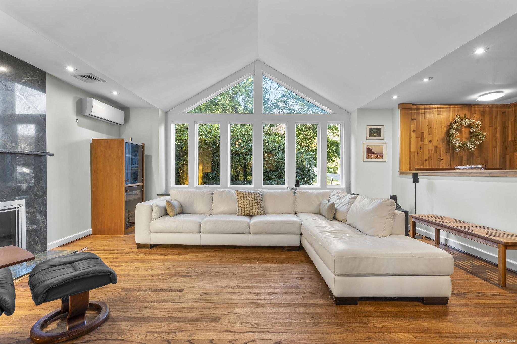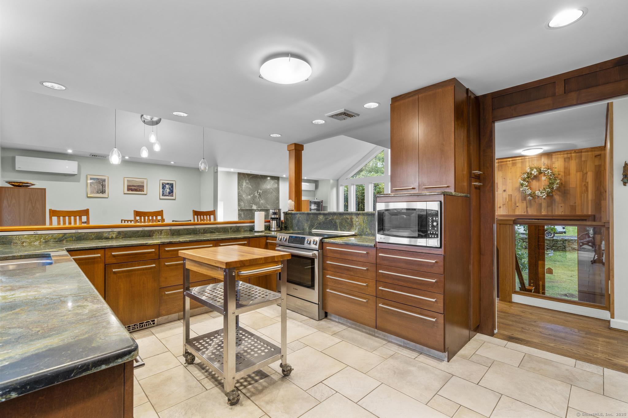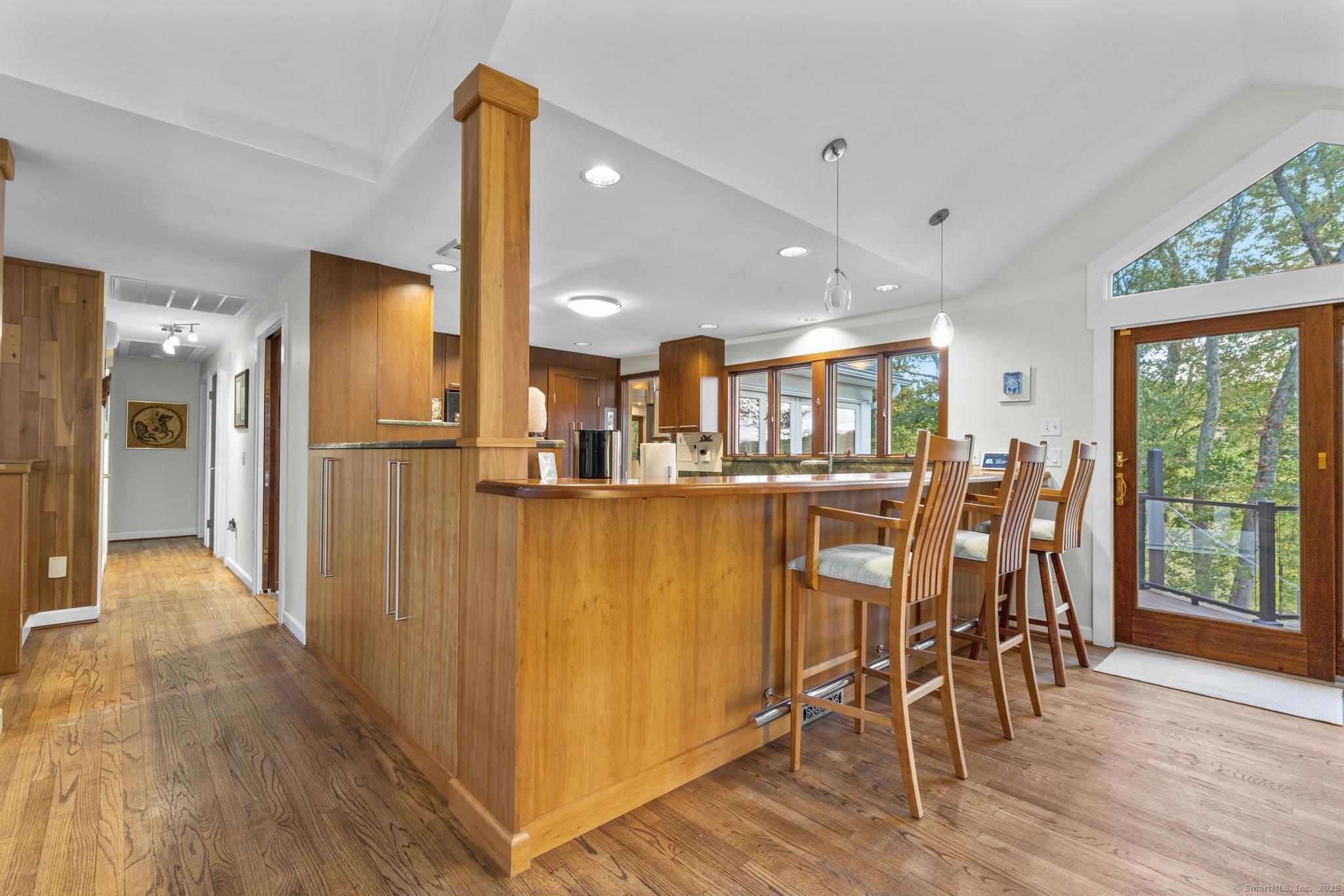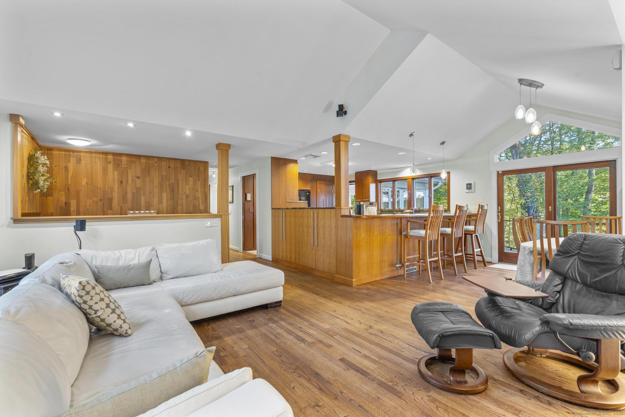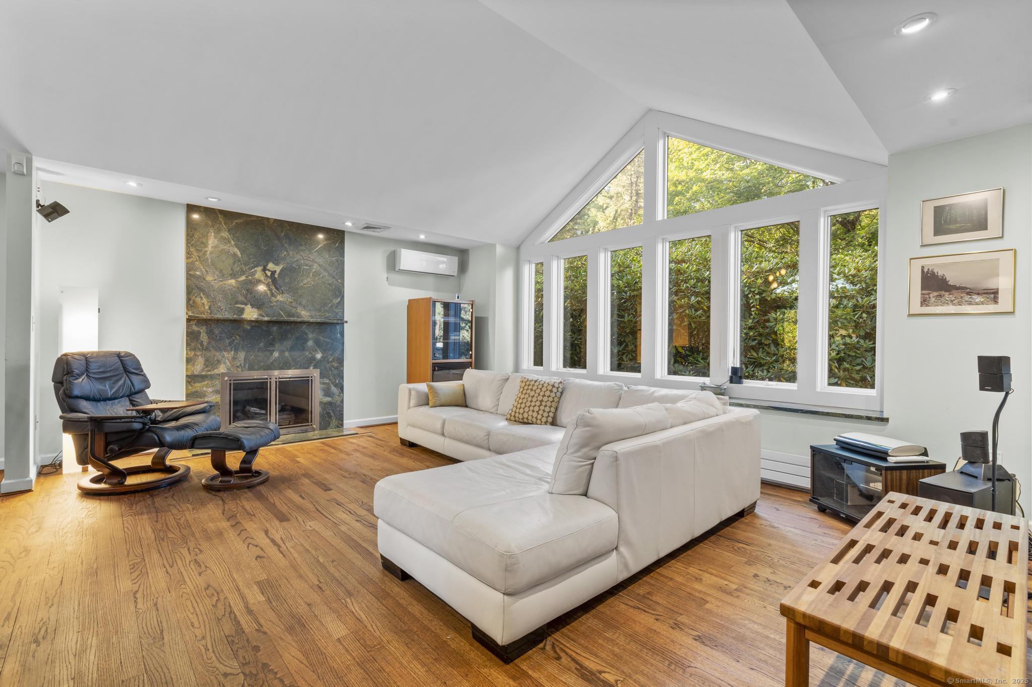 Welcome to your own retreat - a lovingly renovated raised ranch on a lush, artfully landscaped lot. With a 2car garage, wood shed, enclosed shed, garden enclosure, and two expansive decks (with underdeck drainage to keep below spaces dry), this home marries functionality and beauty. Step through the 10 glass entry doors into a space bathed in natural light. The living & dining rooms soar under cathedral ceilings (added by architect Sheldon Crosby, AIA) and present seasonal views of mature trees and a pond. A bay windowand walls of glass draw the outside in. The hardwood floors (refinished in walnutoiled oak) extend seamlessly throughout the living area, hall, and three bedrooms. The heart of the home is the gourmet kitchen - designed for social cooking. A 2 thick cherry bar counter connects cooks to guests. WoodMode cabinetry features clever storage: corner carousels, mixer pullouts (with builtin outlet), pullout recycle bins, and dovetailed drawers. The counters: imported Indian Rainforest granite slabs that are durable and elegant. High end builtin appliances include Bosch convection oven, induction cooktop, Bosch dishwasher, GE Profile microwave, and Amana Frenchdoor fridge. Porcelain tile floors with ashlar pattern add refinement underfoot. Cozy touches abound: two propane gas fireplaces with Rainforest granite surrounds; a Scandinavian Morso wood stove in the sunroom Runtal hydronic baseboard and towelwarmer systems in key rooms; central air, three split AC