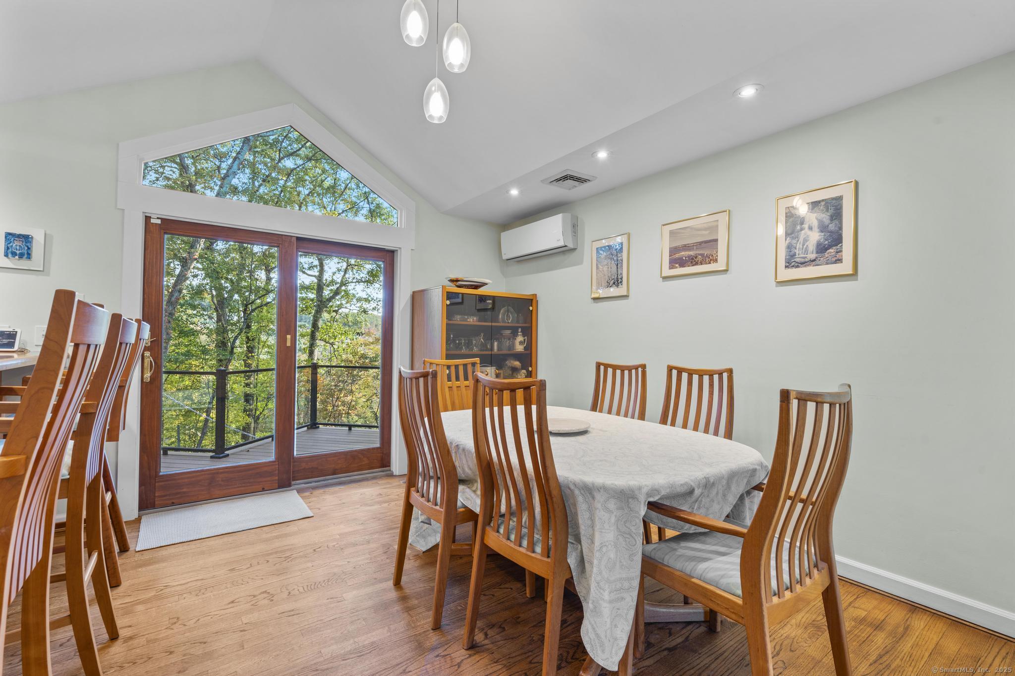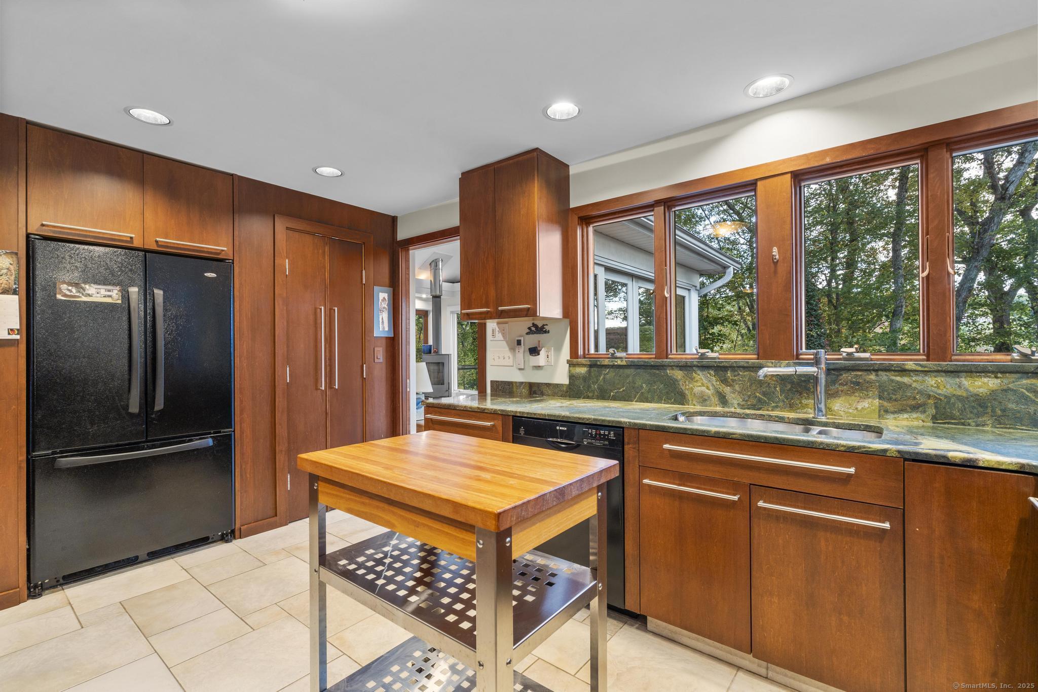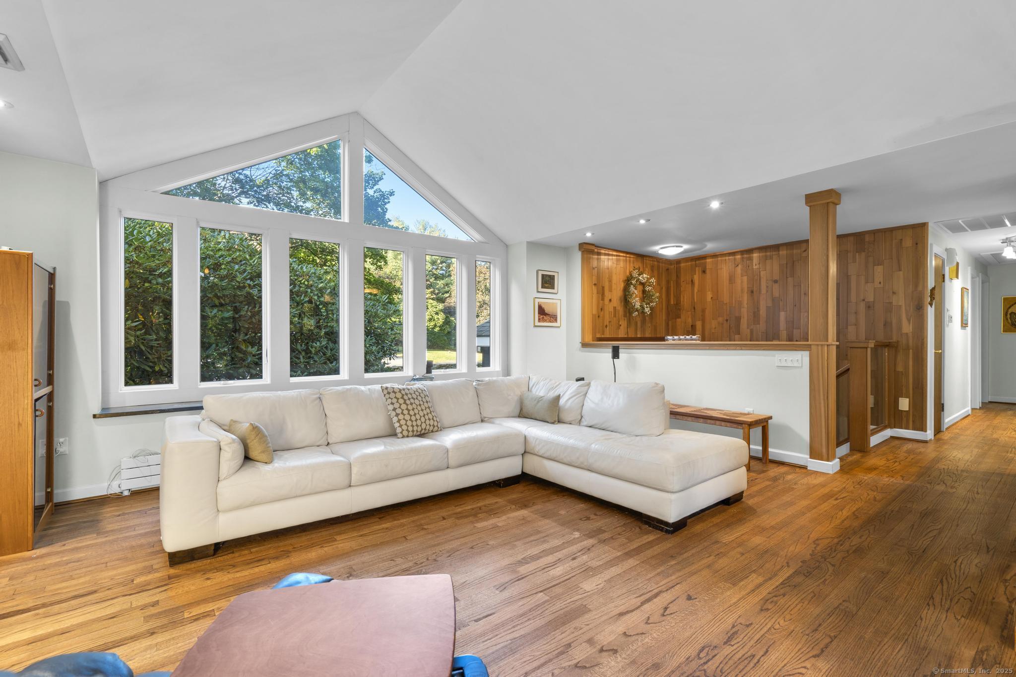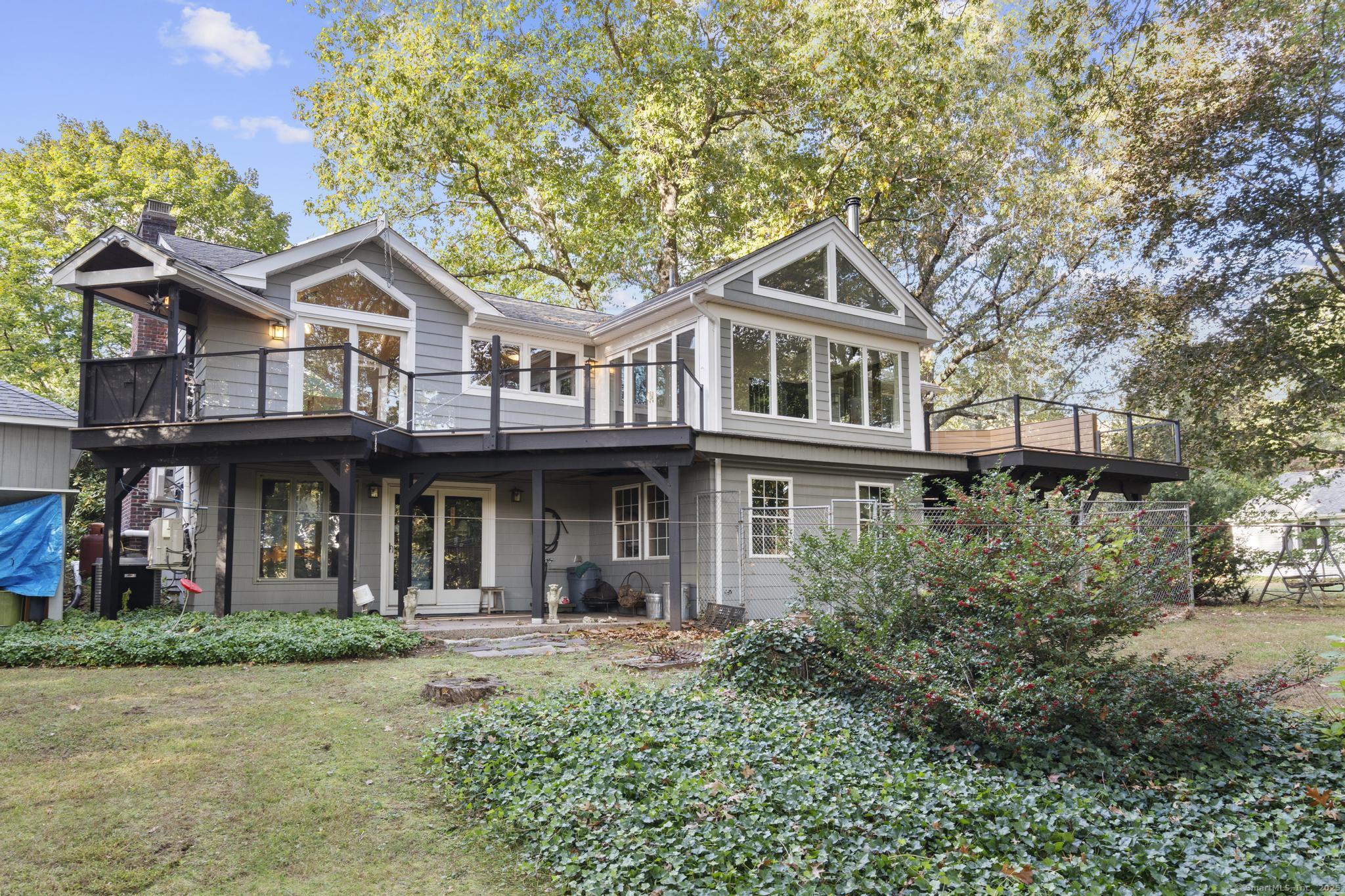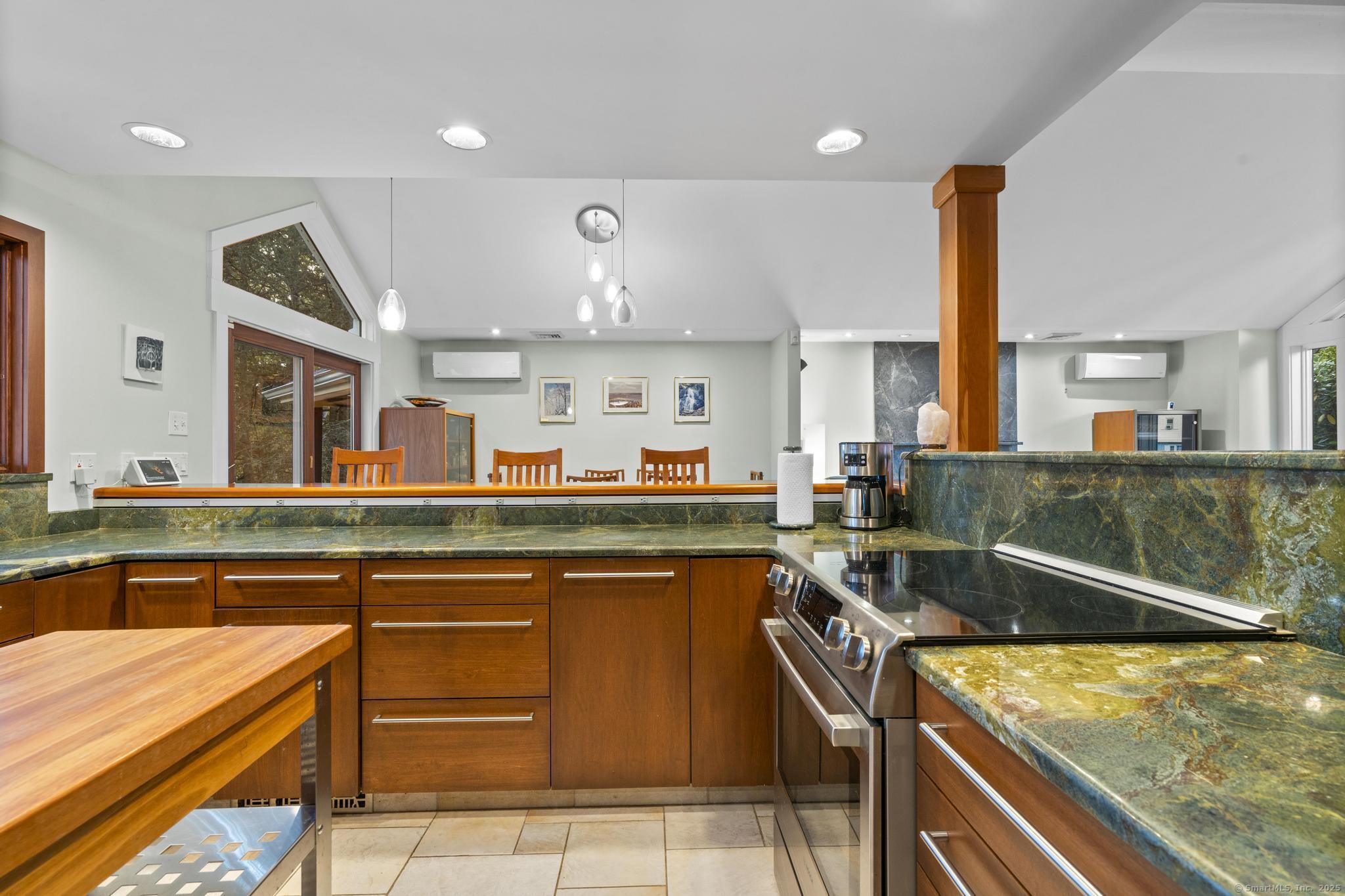 Welcome to your own retreat - a lovingly renovated raised ranch on a lush, artfully landscaped lot. With a 2car garage, wood shed, enclosed shed, garden enclosure, and two expansive decks (with underdeck drainage to keep below spaces dry), this home marries functionality and beauty. Step through the 10 glass entry doors into a space bathed in natural light. The living & dining rooms soar under cathedral ceilings (added by architect Sheldon Crosby, AIA) and present seasonal views of mature trees and a pond. A bay windowand walls of glass draw the outside in. The hardwood floors (refinished in walnutoiled oak) extend seamlessly throughout the living area, hall, and three bedrooms. The heart of the home is the gourmet kitchen - designed for social cooking. A 2 thick cherry bar counter connects cooks to guests. WoodMode cabinetry features clever storage: corner carousels, mixer pullouts (with builtin outlet), pullout recycle bins, and dovetailed drawers. The counters: imported Indian Rainforest granite slabs that are durable and elegant. High end builtin appliances include Bosch convection oven, induction cooktop, Bosch dishwasher, GE Profile microwave, and Amana Frenchdoor fridge. Porcelain tile floors with ashlar pattern add refinement underfoot. Cozy touches abound: two propane gas fireplaces with Rainforest granite surrounds; a Scandinavian Morso wood stove in the sunroom Runtal hydronic baseboard and towelwarmer systems in key rooms; central air, three split AC