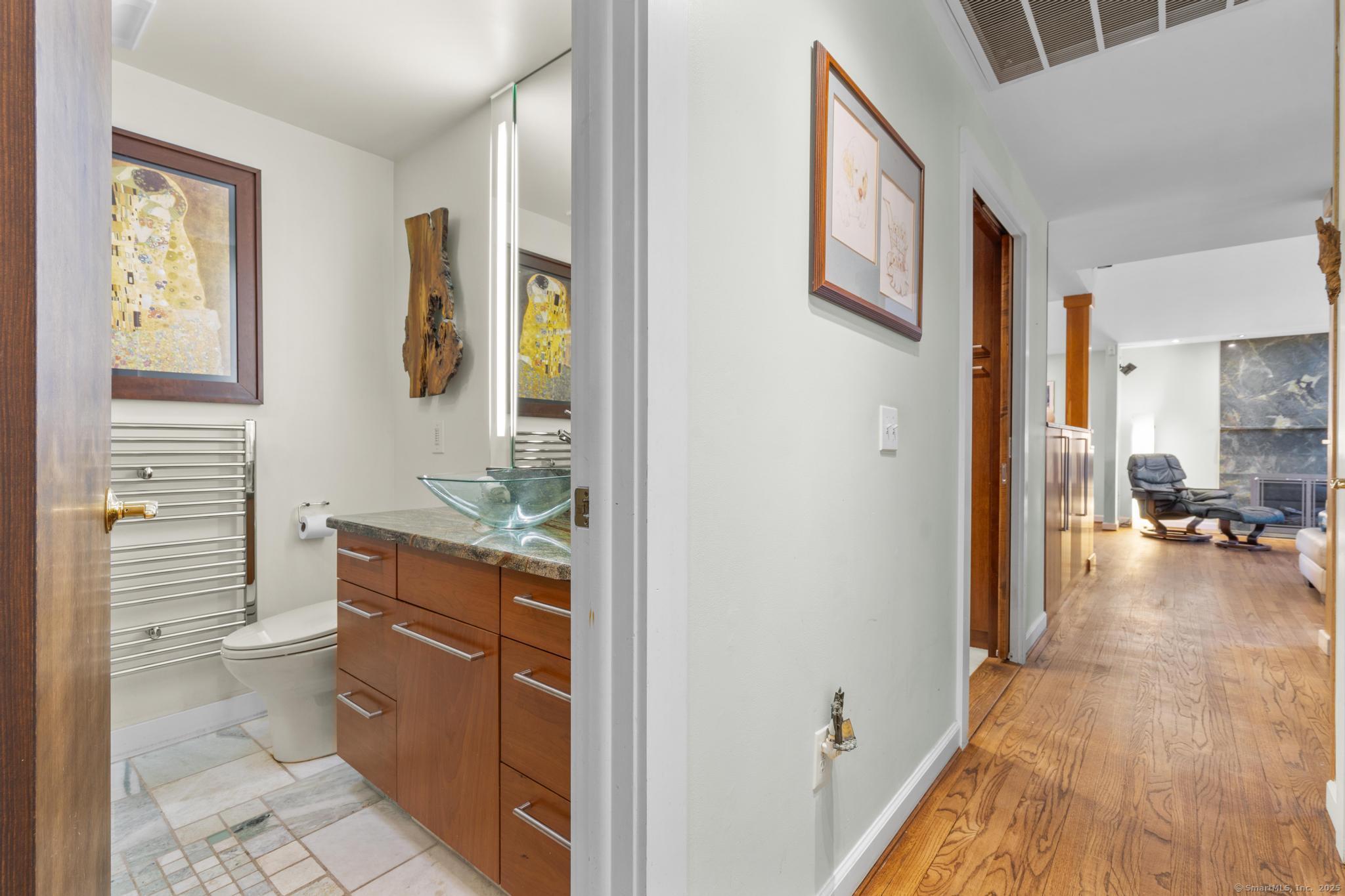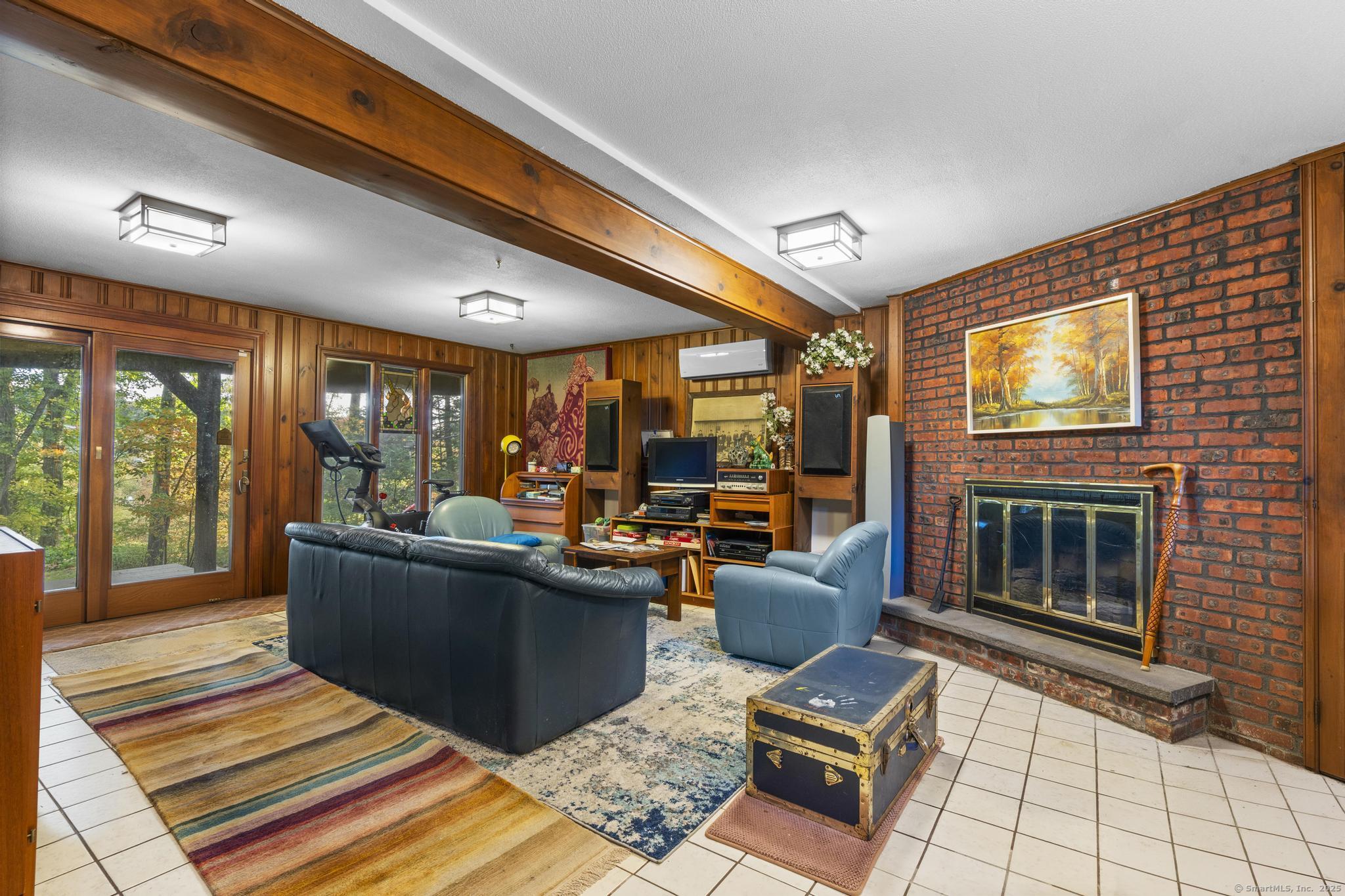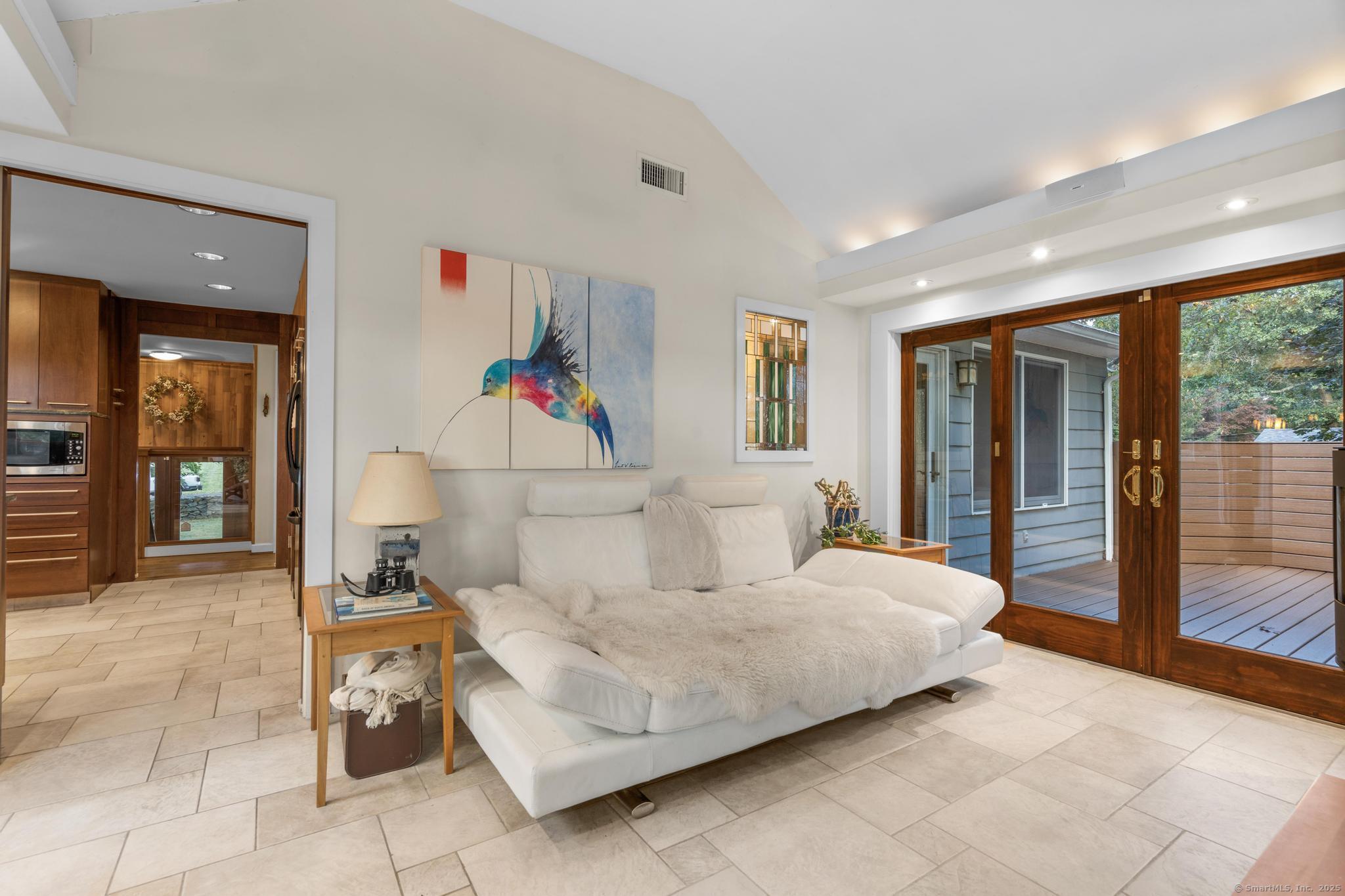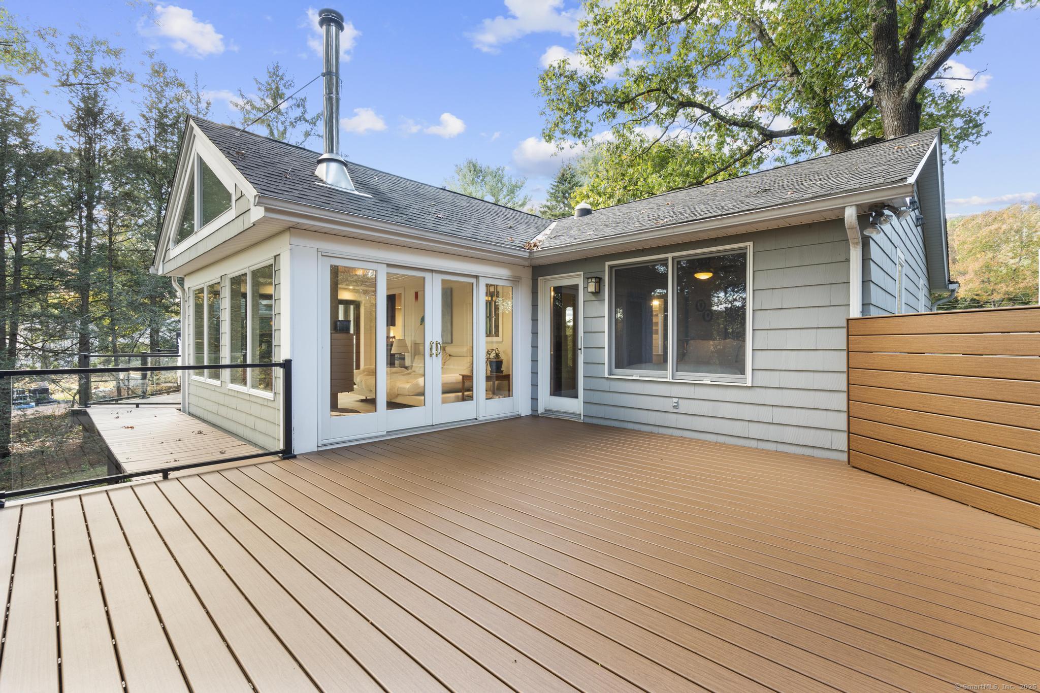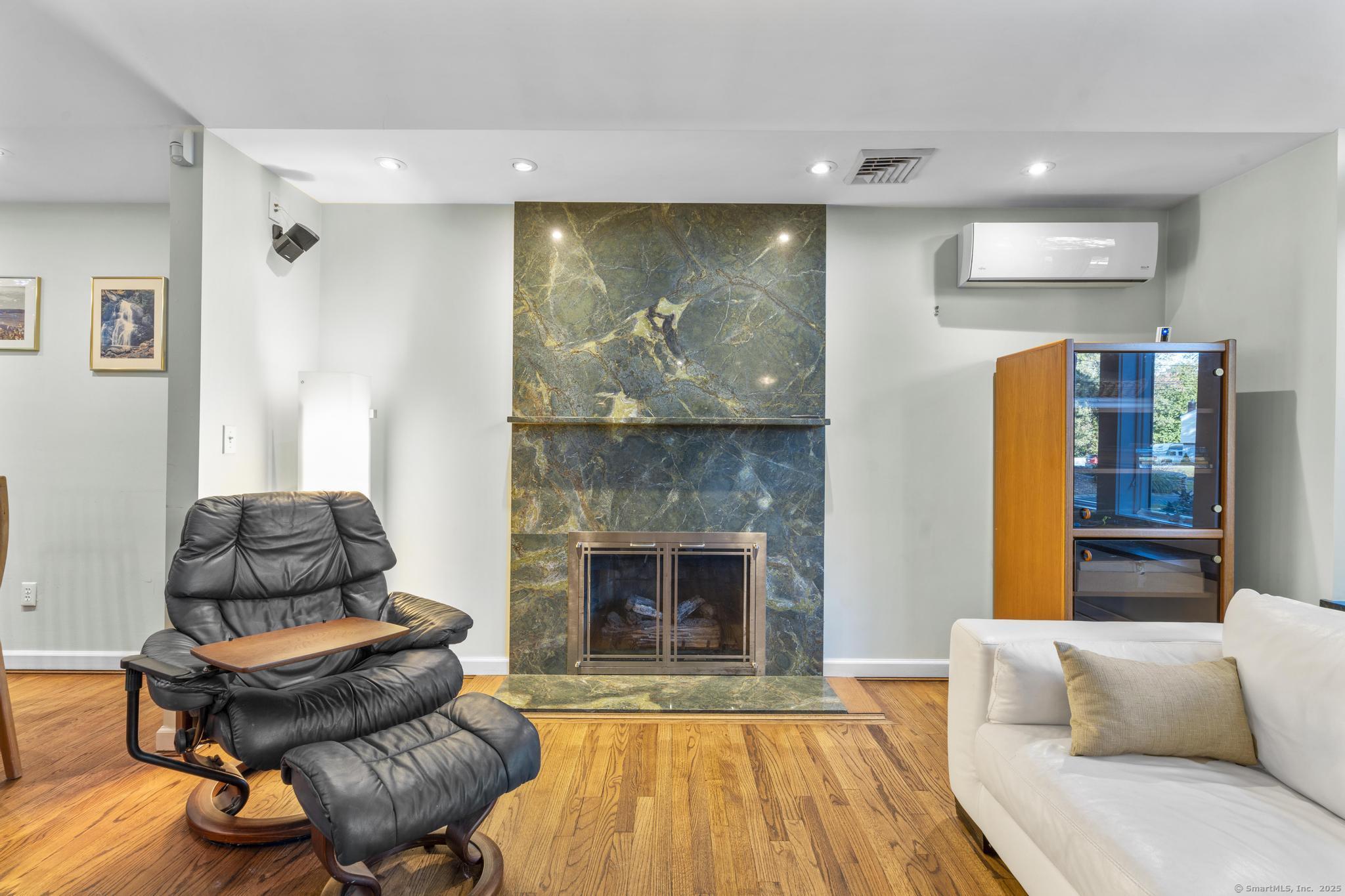 Welcome to your own retreat - a lovingly renovated raised ranch on a lush, artfully landscaped lot. With a 2car garage, wood shed, enclosed shed, garden enclosure, and two expansive decks (with underdeck drainage to keep below spaces dry), this home marries functionality and beauty. Step through the 10 glass entry doors into a space bathed in natural light. The living & dining rooms soar under cathedral ceilings (added by architect Sheldon Crosby, AIA) and present seasonal views of mature trees and a pond. A bay windowand walls of glass draw the outside in. The hardwood floors (refinished in walnutoiled oak) extend seamlessly throughout the living area, hall, and three bedrooms. The heart of the home is the gourmet kitchen - designed for social cooking. A 2 thick cherry bar counter connects cooks to guests. WoodMode cabinetry features clever storage: corner carousels, mixer pullouts (with builtin outlet), pullout recycle bins, and dovetailed drawers. The counters: imported Indian Rainforest granite slabs that are durable and elegant. High end builtin appliances include Bosch convection oven, induction cooktop, Bosch dishwasher, GE Profile microwave, and Amana Frenchdoor fridge. Porcelain tile floors with ashlar pattern add refinement underfoot. Cozy touches abound: two propane gas fireplaces with Rainforest granite surrounds; a Scandinavian Morso wood stove in the sunroom Runtal hydronic baseboard and towelwarmer systems in key rooms; central air, three split AC