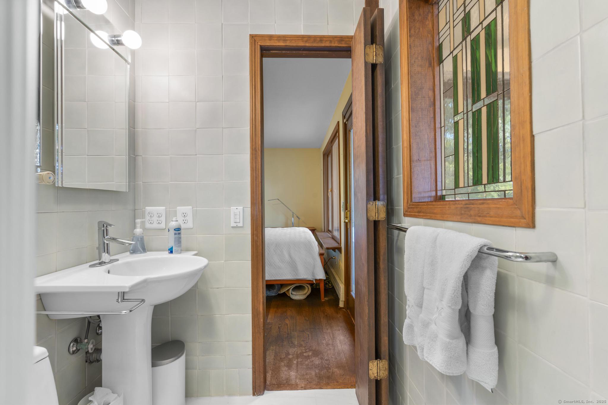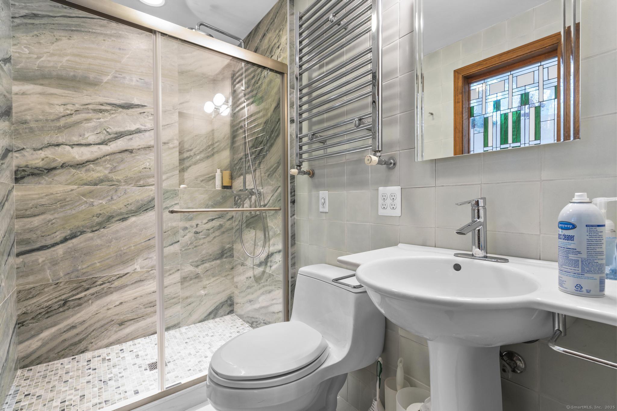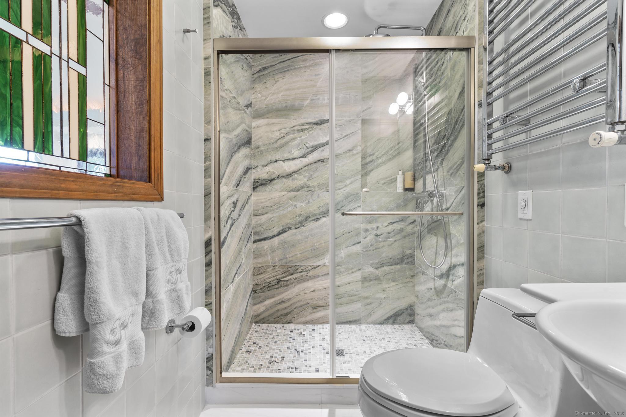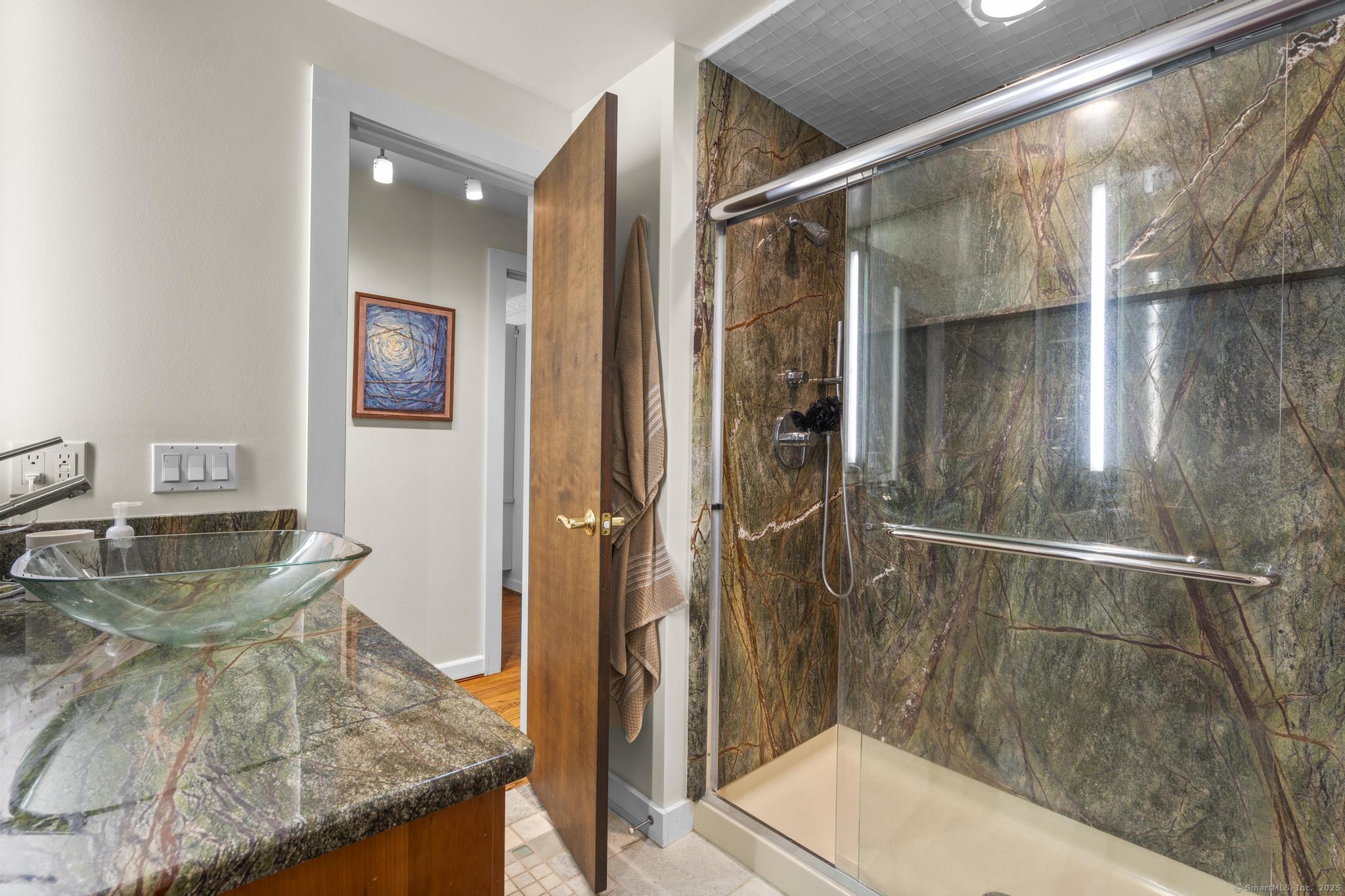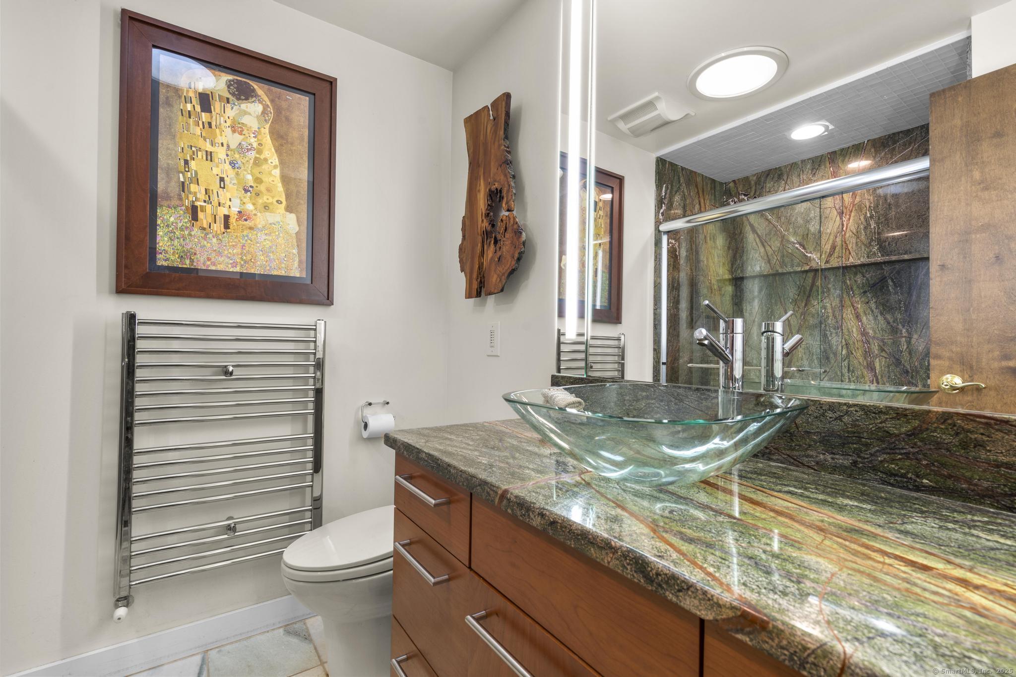 Welcome to your own retreat - a lovingly renovated raised ranch on a lush, artfully landscaped lot. With a 2car garage, wood shed, enclosed shed, garden enclosure, and two expansive decks (with underdeck drainage to keep below spaces dry), this home marries functionality and beauty. Step through the 10 glass entry doors into a space bathed in natural light. The living & dining rooms soar under cathedral ceilings (added by architect Sheldon Crosby, AIA) and present seasonal views of mature trees and a pond. A bay windowand walls of glass draw the outside in. The hardwood floors (refinished in walnutoiled oak) extend seamlessly throughout the living area, hall, and three bedrooms. The heart of the home is the gourmet kitchen - designed for social cooking. A 2 thick cherry bar counter connects cooks to guests. WoodMode cabinetry features clever storage: corner carousels, mixer pullouts (with builtin outlet), pullout recycle bins, and dovetailed drawers. The counters: imported Indian Rainforest granite slabs that are durable and elegant. High end builtin appliances include Bosch convection oven, induction cooktop, Bosch dishwasher, GE Profile microwave, and Amana Frenchdoor fridge. Porcelain tile floors with ashlar pattern add refinement underfoot. Cozy touches abound: two propane gas fireplaces with Rainforest granite surrounds; a Scandinavian Morso wood stove in the sunroom Runtal hydronic baseboard and towelwarmer systems in key rooms; central air, three split AC