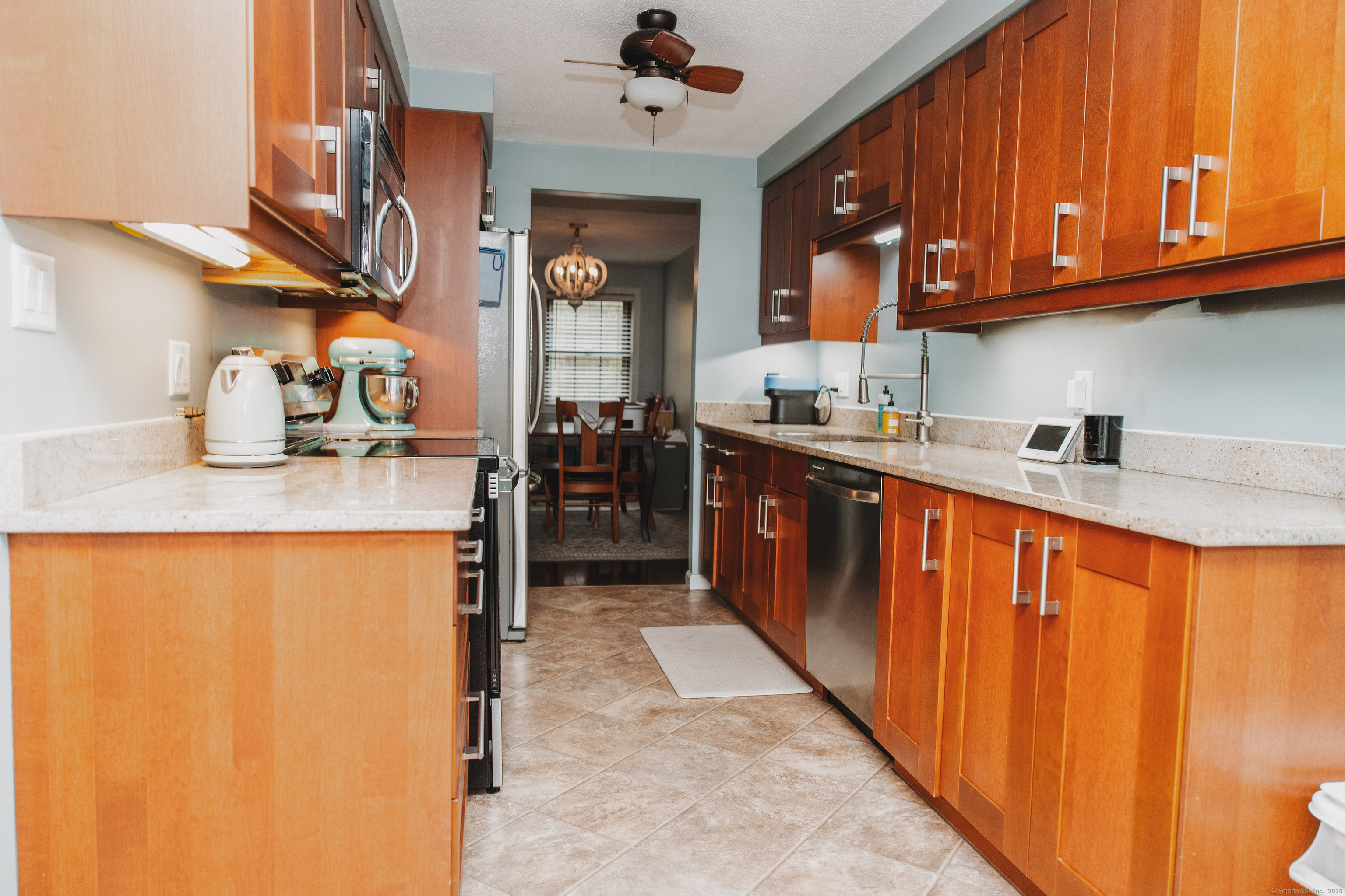 ADORABLE TOWNHOUSE TUCKED AWAY IN A FANTASTIC MERIDEN NEIGHBORHOOD! Walk right in from your private carport directly into the main level with lovely hardwood floors! Get ready to show off your culinary expertise in your eat-in kitchen that features granite countertops and stainless steel appliances! Spacious living room is perfect for hosting game night with friends OR have a quiet night streaming your favorite show, a half bath rounds out the main level. Retire to second level to find and enjoy 2 bedrooms and full bath. Make the partially finished basement all your own which includes laundry room. Relax out on the deck with a glass of lemonade and soak up the sun! In ground pool is perfect for hot summer days. Property includes a pond and playground just a short walk away from the front door. Conveniently located near Hunters Golf Course, shopping centers, restaurants, parks and SO much more!
