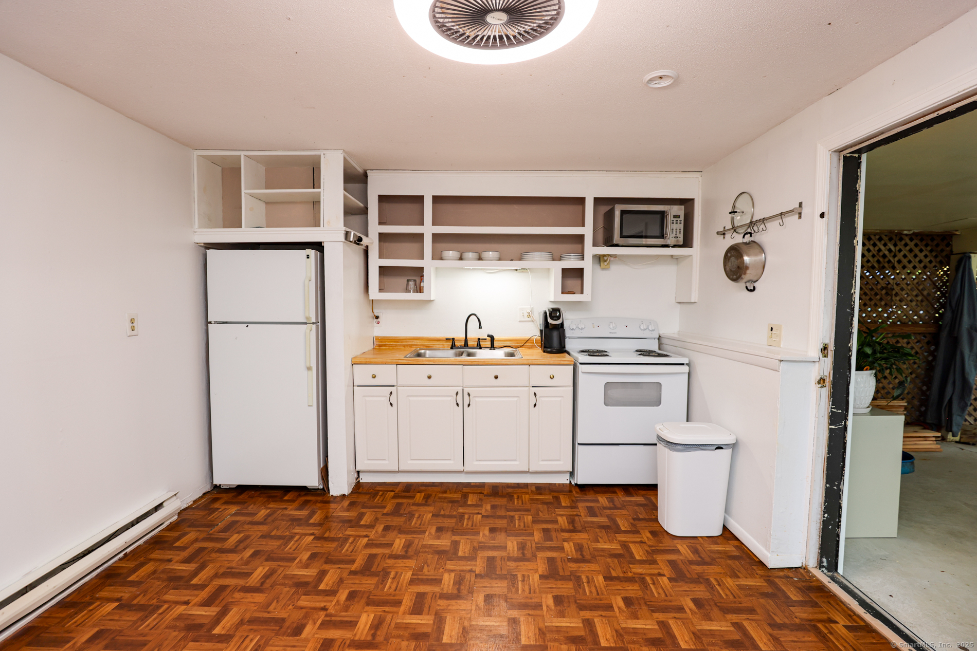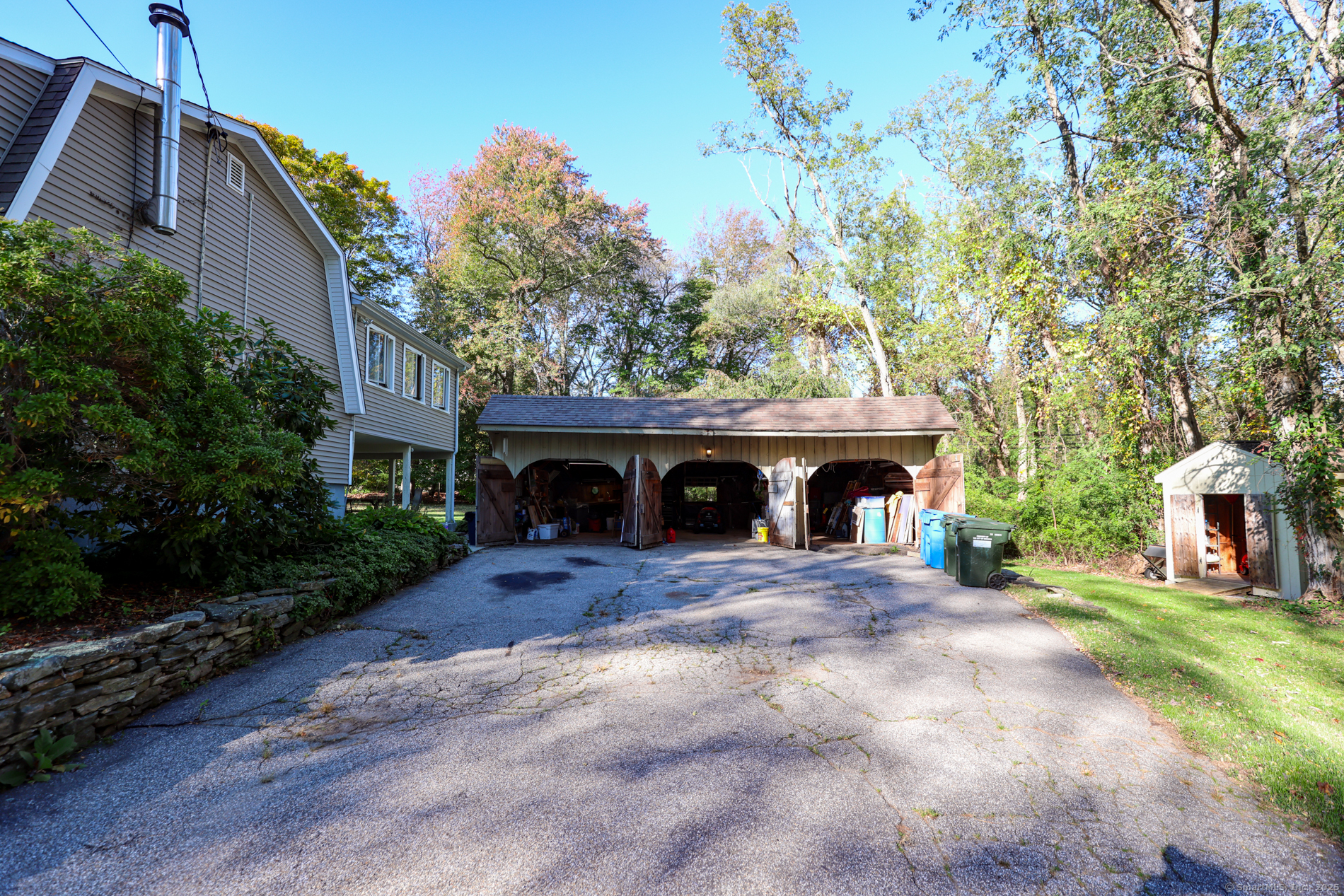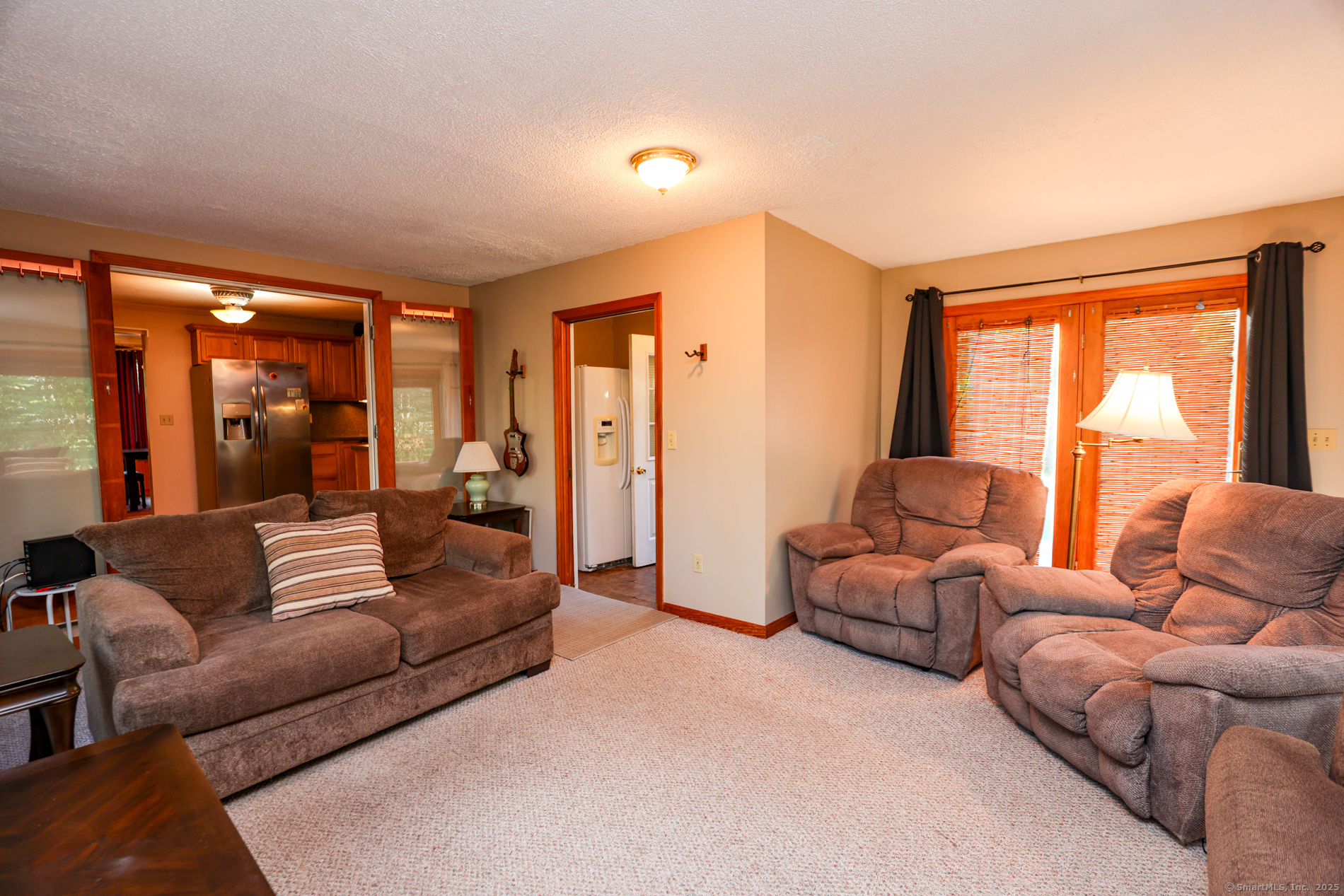 Welcome to 38 White Plains Road - a beautifully maintained raised ranch (this two-family home lives like a single-family with an in-law) on 1.38 acres in a peaceful, tree-lined country setting. Designed for comfort and flexibility, this home offers two complete living spaces that function seamlessly together - ideal for multi-generational living, extended family, or guests who want their own space. The main level features two bedrooms, an eat-in kitchen, a living room currently used as a dining room, and a bright family-room addition with a window seat and access to the deck. The spacious primary can easily be converted back into two separate rooms for added versatility. The lower level provides a full in-law setup with its own kitchen, living room, two bedrooms, flex space, bath, laundry, and a walkout to the patio. Outdoors, enjoy the in-ground pool, fire pit, and plenty of storage in the three-car carriage-style garage and large shed with electricity. Surrounded by mature trees, this property blends privacy, comfort, and timeless New England charm. Note: Property will not qualify for government financing because of the garage's condition.