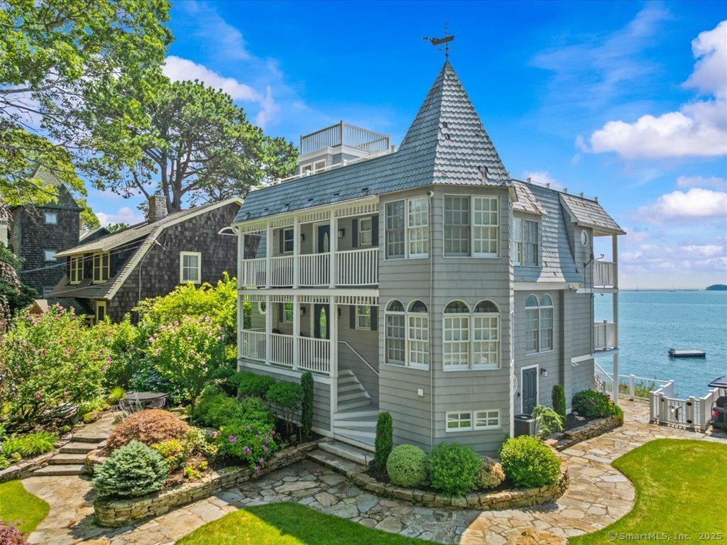 Spectacular waterfront estate! Unparalleled views of Long Island Sound & Duck Island + your own private sandy beach with 72' of frontage! 61 Grove Way is on the market for the first time in 29 years! Stately Victorian exterior aesthetic, designed to maximize the experience of waterfront living on every level of the home. Spacious open-concept remodeled interior living spaces blend elegance with functionality. State-of-the-art kitchen w/ heated floors, granite counters, gas range, high-end appliances, large island & sunny turret breakfast nook is a natural gathering place. Open Living/Dining Area w/ hardwood floors, floor-to-ceiling glass walls & large sliding doors allow sunlight to flood every corner while providing uninterrupted vistas of the shimmering water. Expansive covered decks extend from the house creating outdoor living spaces perfect for lounging, entertaining, or simply soaking in the serenity of the setting. Upper level offers 3 bedrooms designed as personal retreats. Master suite w/ glass sliders to water-facing balcony and bathroom w/ heated floor, stall shower & double sinks. Second bedroom also w/ glass sliders to share the covered deck. This level includes a 3rd bedroom, a cozy turret sitting room & front-facing covered deck. Ascend to the 3rd level for exquisite views of Long Island Sound from the rooftop terrace.