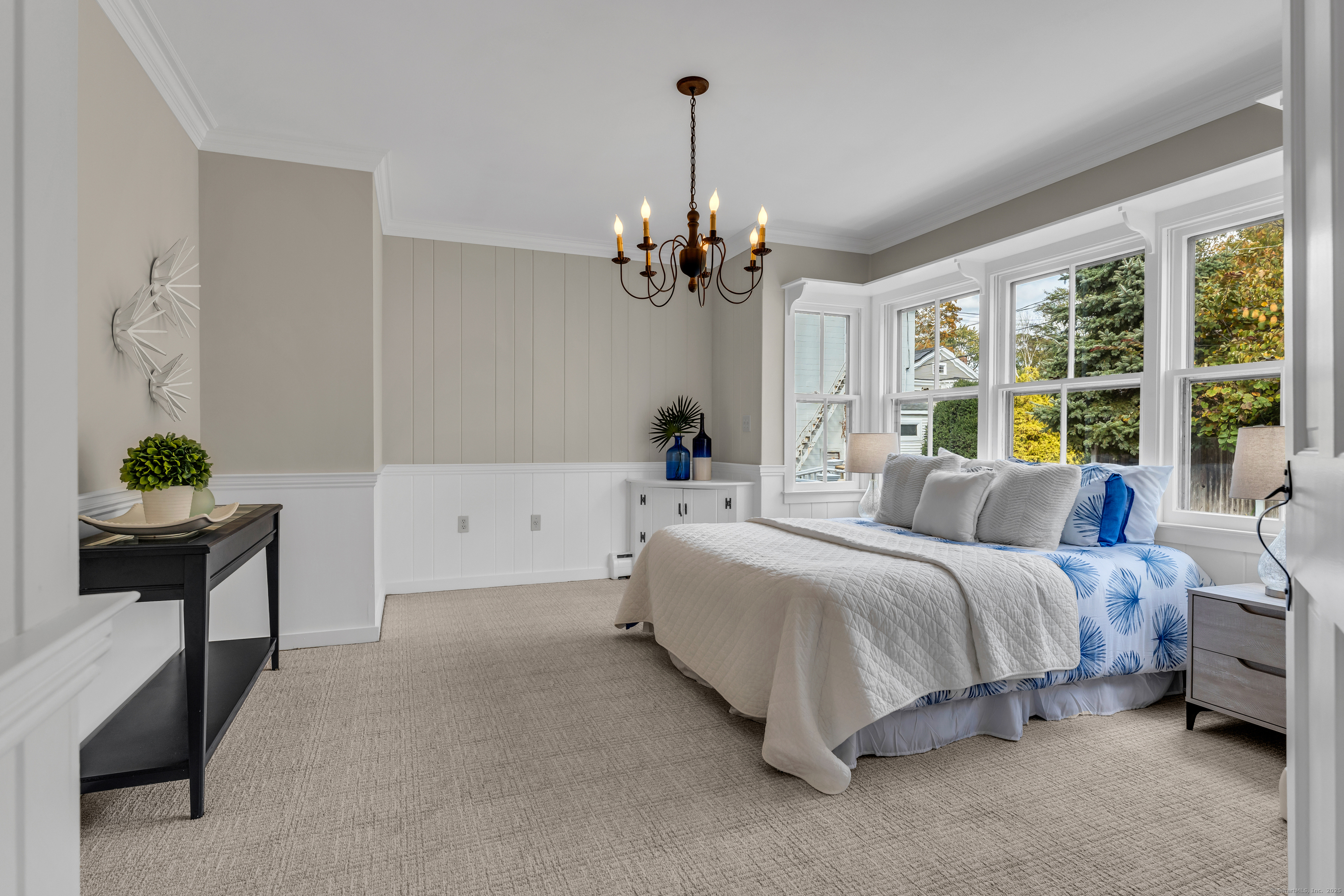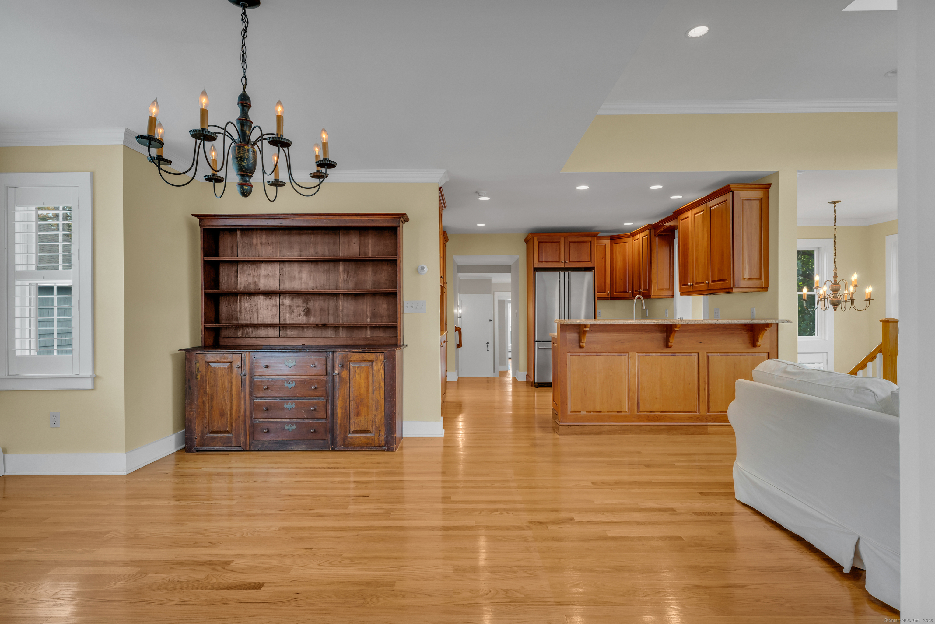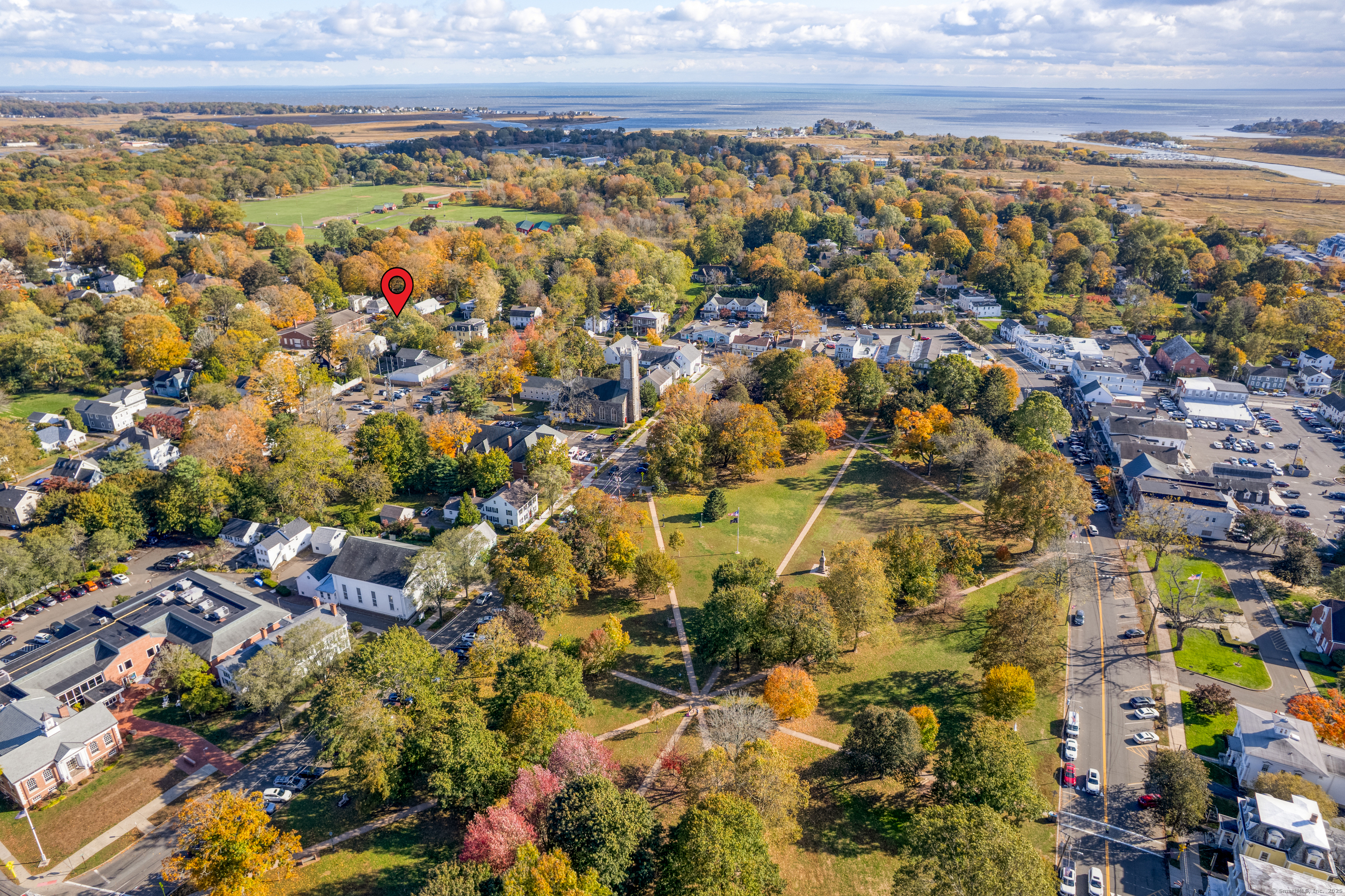 Built in 1845, this in-town colonial is located four doors down from the Guilford Green. Originally, a single-family home, it was a two-family dwelling for many years and more recently, a combined residence and home law office, it could now be either a one-family home, a two-family home or a home office. It includes a stunning first floor consisting of a formal living room, dining Room, family room, first floor bedroom, full bath with shower in tub and room for a nicely sized kitchen which would need to be installed. There is a stairwell to the second floor and a bonus room and mudroom providing access to both a fenced-in yard and the attached large garage. Two rooms on the first floor have fireplaces that have not been used by the current owner but could potentially be reopened if desired. The first floor is also served by a town approved ramp entrance. In 2006 the previous three-room second floor was significantly expanded by a Nelson Denny designed additions including a great room consisting of a large living room with high (10'to 14') ceilings, lots of windows and a belvedere providing natural light, as well as a gas fireplace, floor to ceiling bookshelves and cabinetry. The second floor can be reached by either a stairwell from the front door or a second stairwell providing access from the living room to a covered patio, fenced side yard and parking area. The dining area in the great room is equally spacious and perfect for either intimate meals or large dinner parties.