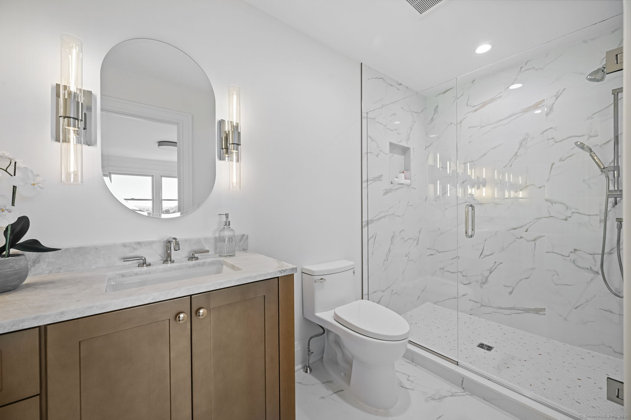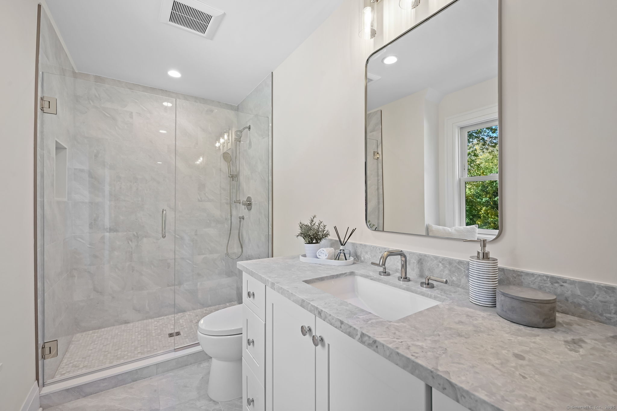 A masterclass in modern luxury, this breathtaking Ridgefield estate has been meticulously reimagined by premier builder Thomas Sturges Construction, achieving a rare balance of architectural brilliance, refined comfort, and energy efficiency, all set against awe-inspiring panoramic 50-mile views of the Hudson River Valley. Completely transformed, the residence unveils a sophisticated open-concept design where wide-plank oak floors, walls of glass and impeccable craftsmanship define every space. The chef's kitchen is a showpiece of form and function with natural stone counters, custom cabinetry and professional-grade Viking appliances seamlessly flowing into a chic dining area and luminous living room anchored by a sleek gas fireplace. The main-level primary suite is a private sanctuary, offering dual walk-in closets and a spa bath worthy of a five-star retreat. Upstairs, two additional ensuite bedrooms showcase exquisite finishes and elevated comfort. The lower level extends the living experience with a full in-law or au pair suite, complete with separate entrance, laundry and a stunning family room framed by stone-accented walls. Outdoor living is redefined with tiered decks, a granite patio, Wagner pool and spa and a romantic gazebo set amid manicured grounds. Great NYC commute. Perfectly sited minutes from Ridgefield's boutique shops, acclaimed dining and cultural attractions. An exceptional residence embodying the pinnacle of modern elegance and timeless craftsmanship!