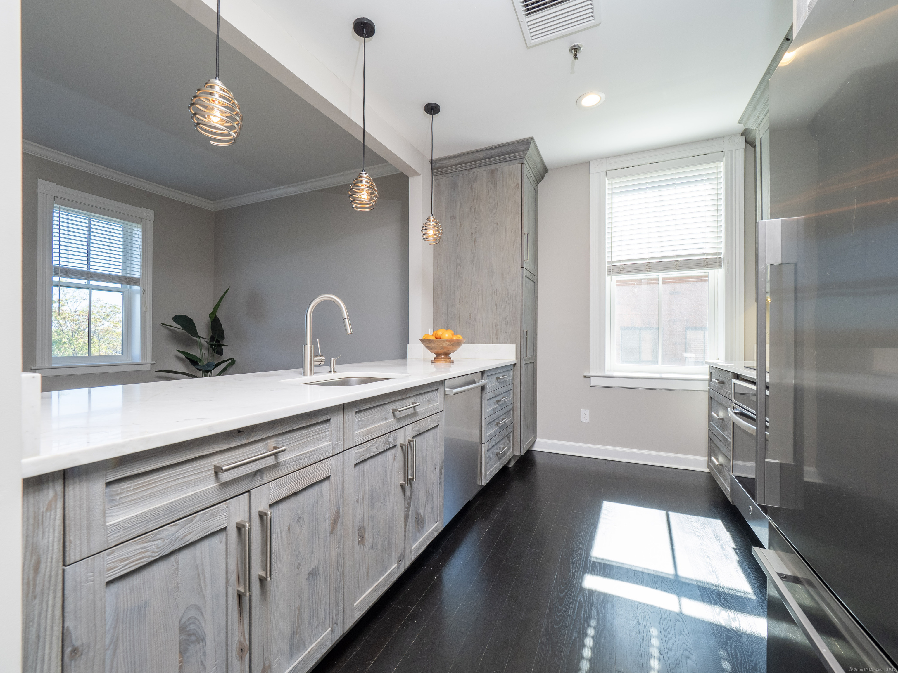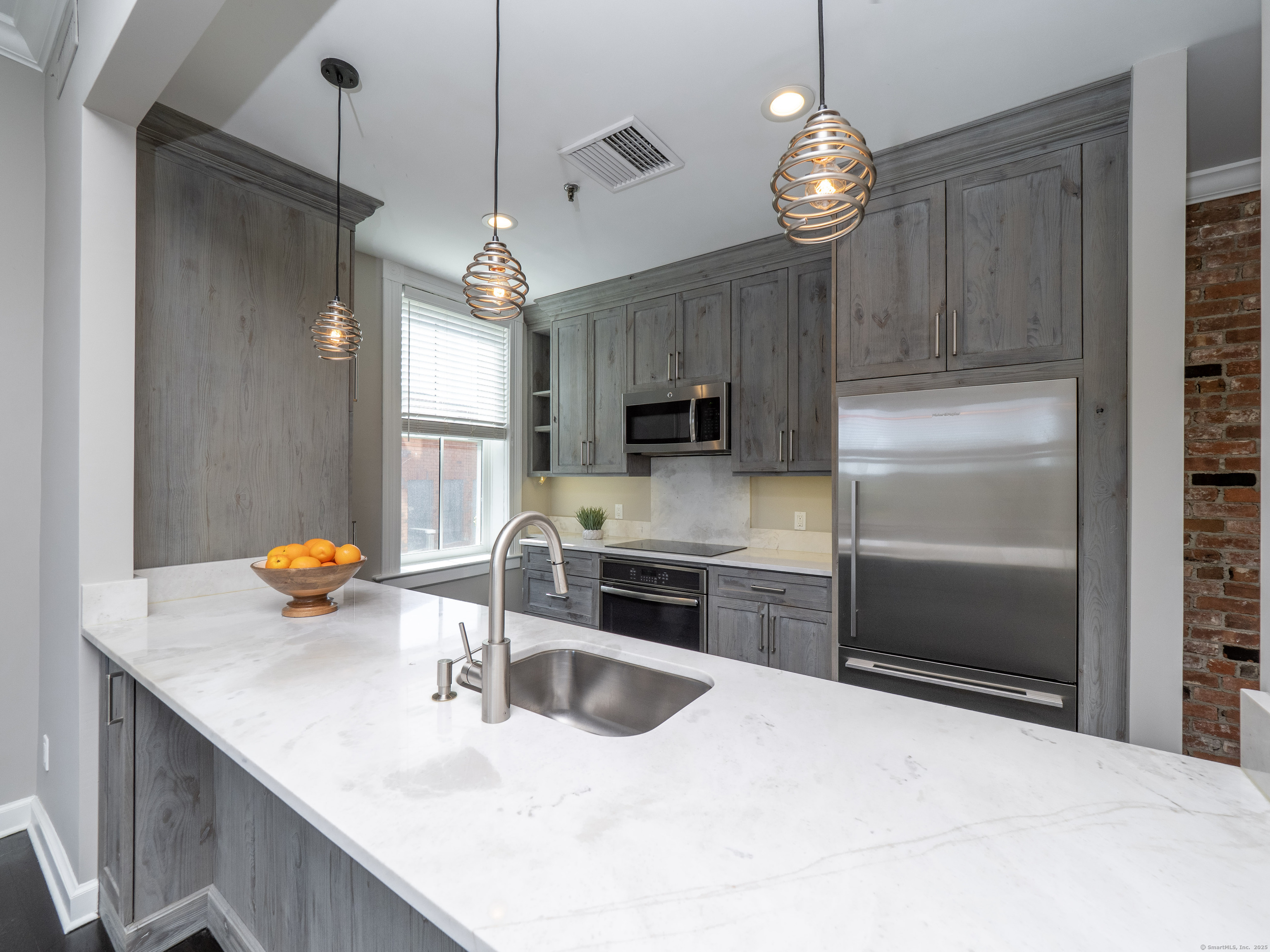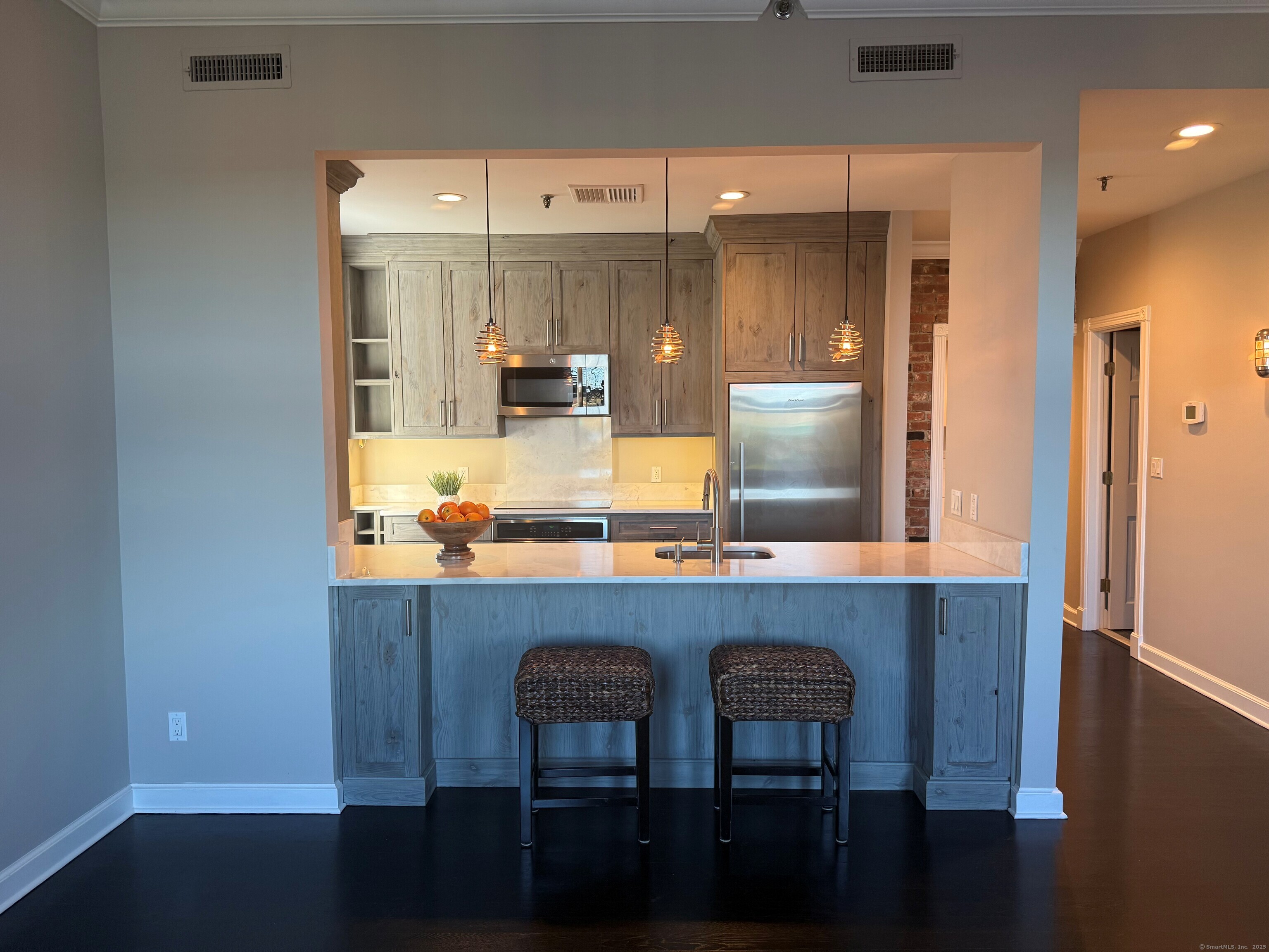 Stylish and sun-drenched 1BR, 1.5BA condo offering 832 SF of open-concept living with water views and soaring 9'+ ceilings. Oversized windows and hardwood floors throughout create a bright, airy atmosphere. The renovated kitchen boasts Quartzite countertops, high-end stainless steel appliances, and ample cabinetry, flowing seamlessly into a spacious living/dining area ideal for entertaining. The generously sized primary suite features an updated full bath and excellent closet space. Additional highlights include a welcoming front foyer, in-unit laundry with full size machines, updated mechanicals (2023), and abundant storage. Enjoy being just steps from eclectic restaurants, boutique shops, art galleries, the Maritime Aquarium, and the scenic waterfront. A modern, move-in ready home in the heart of vibrant South Norwalk. Just minutes to the South Norwalk train station and major highways for an effortless commute. Ideal for first-time buyers, investors, or weekend city dwellers seeking a vibrant community lifestyle. Turnkey and ready to impress! SELLER WILL CREDIT FOR ONE YEAR OF SPECIAL ASSESSMENT