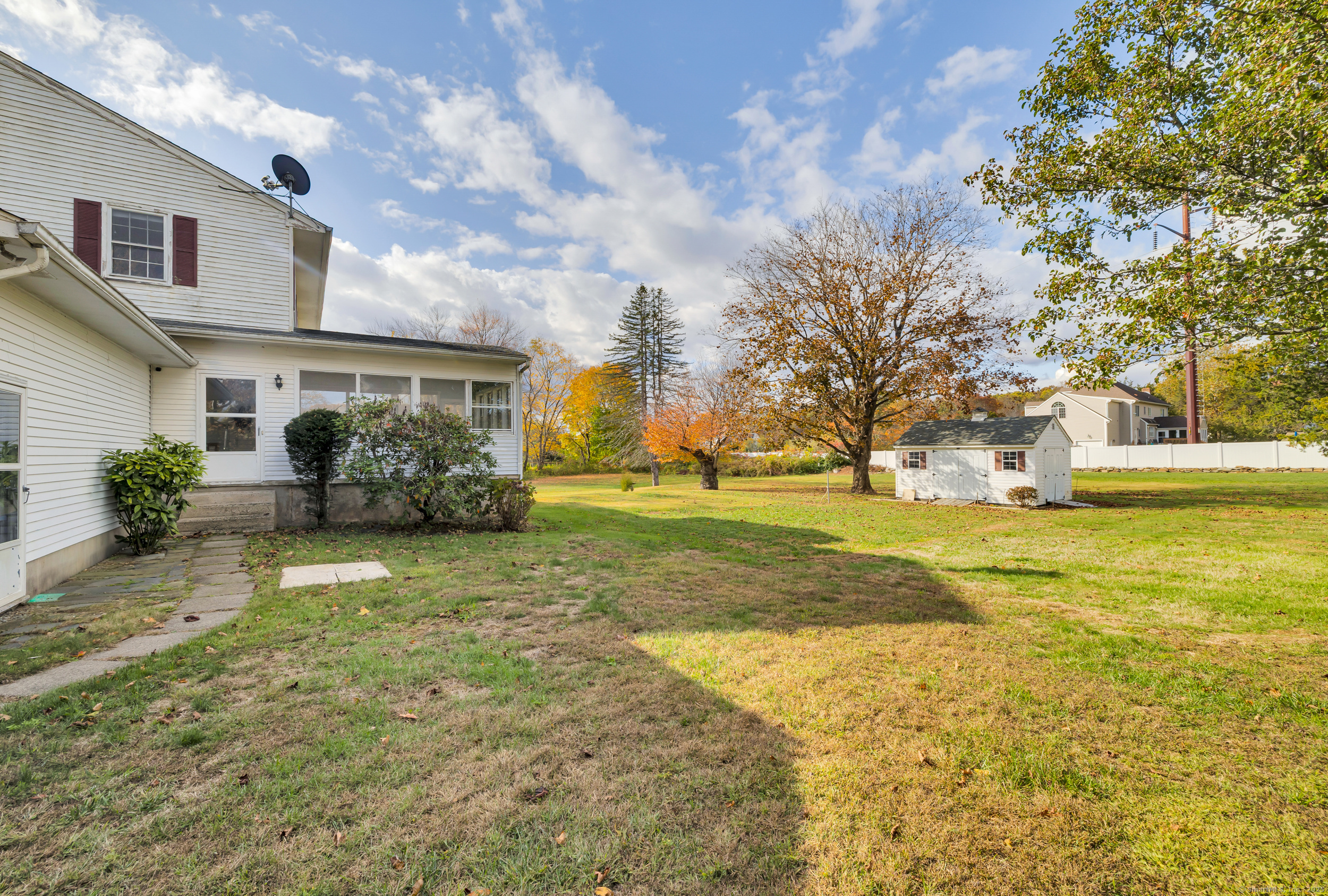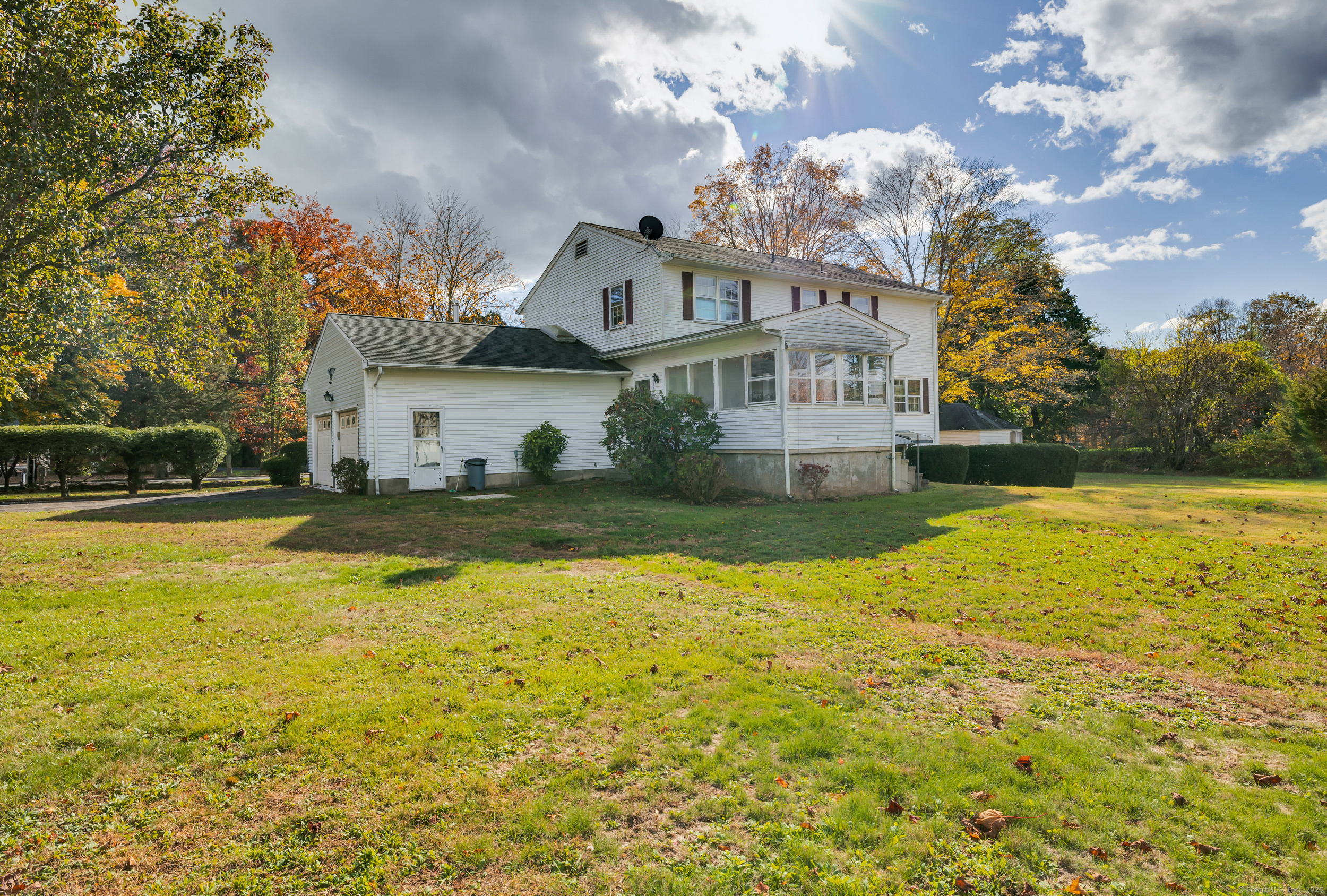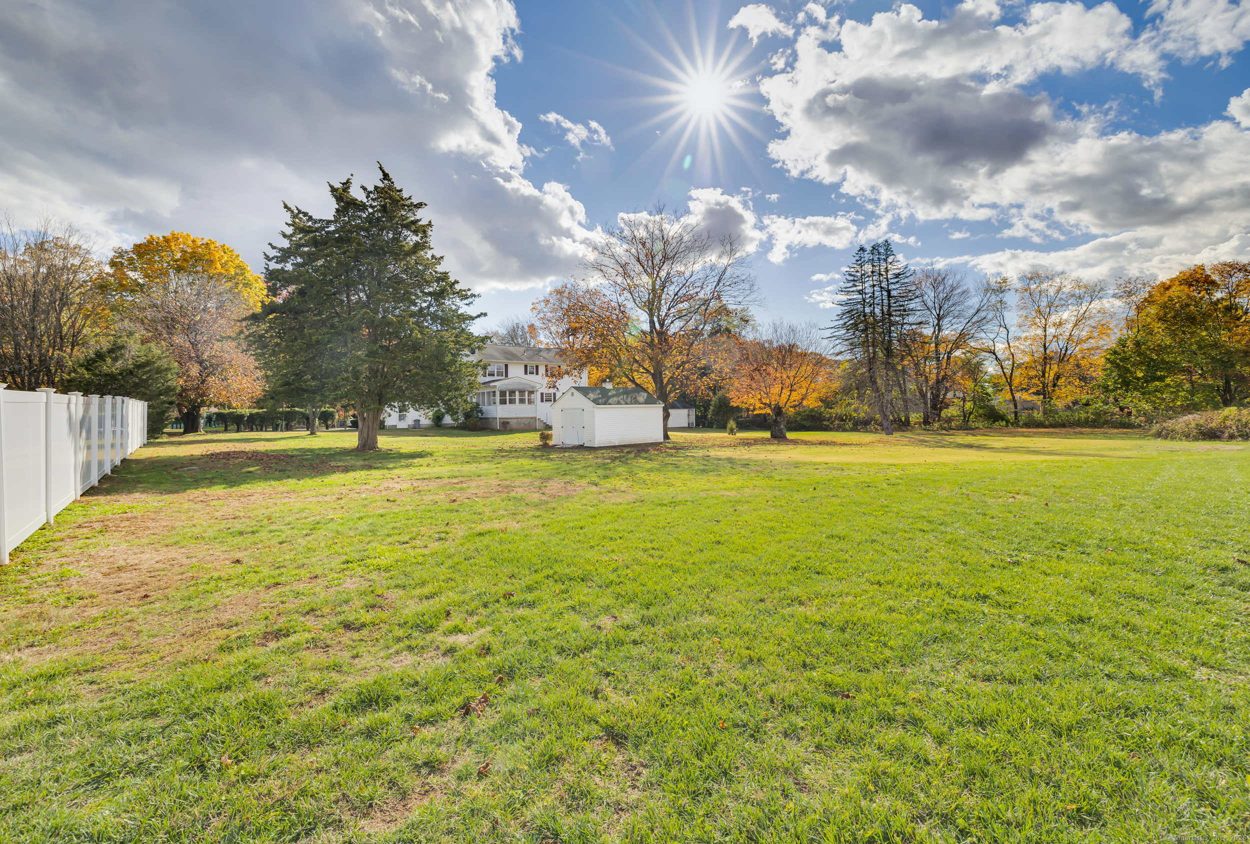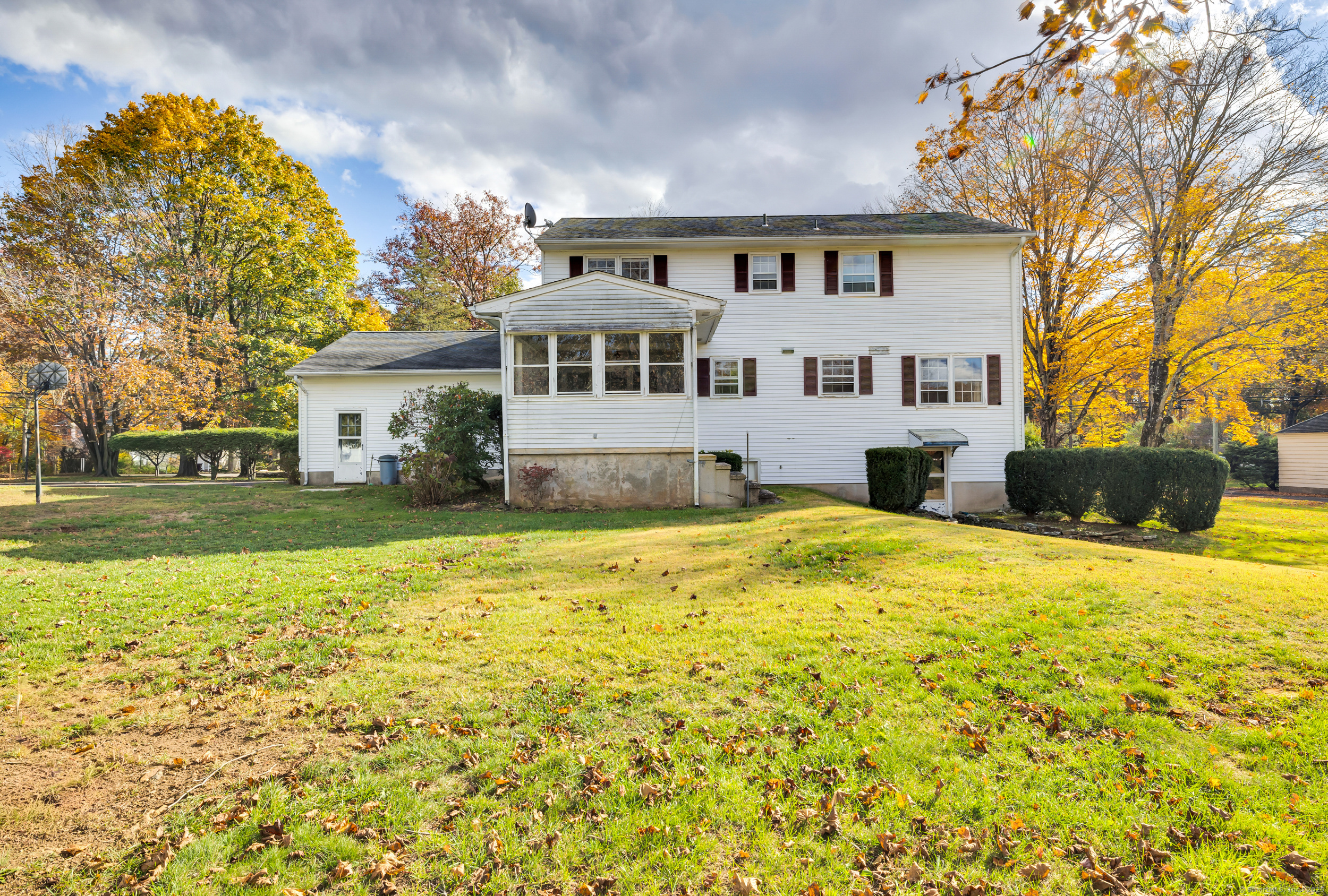 Looking for privacy and space close to town? This classic Colonial offers 4 bedrooms, 2 full baths, and sits on a level .90-acre lot. The main level features a bright living room with a wood-burning fireplace and a large picture window overlooking the front yard, flowing easily into the dining room. The kitchen includes a breakfast bar and built-in pantry storage. A spacious family room with a cozy wood stove and skylight fills the space with natural light, while the adjoining sunporch, featuring two exterior doors, opens to the backyard. Upstairs, you'll find four bedrooms, all with hardwood floors (including one currently carpeted), and a full bath with double sinks and a tub/shower combo. The large, level lot provides ample space for outdoor entertaining, gardening, or play. Additional highlights include a 2-car garage, full walk-out basement with laundry area (washer & dryer convey) and utility sink, plus an outdoor storage shed. While the home would benefit from updating, it offers an excellent opportunity to personalize and create your dream home in a desirable location. Conveniently noted just minutes from Guilford's historic town center and the Green, with quick and easy access to I-95 and Metro North, and 15 minutes to downtown New Haven and Yale. Bring your vision and make this special property shine!