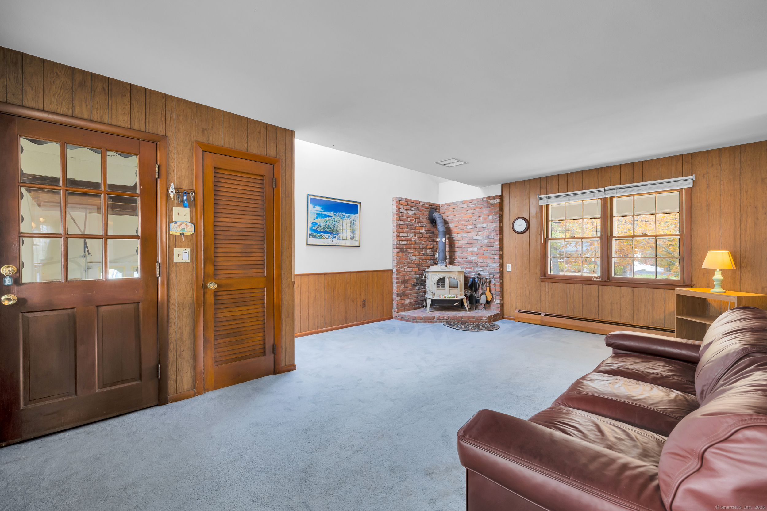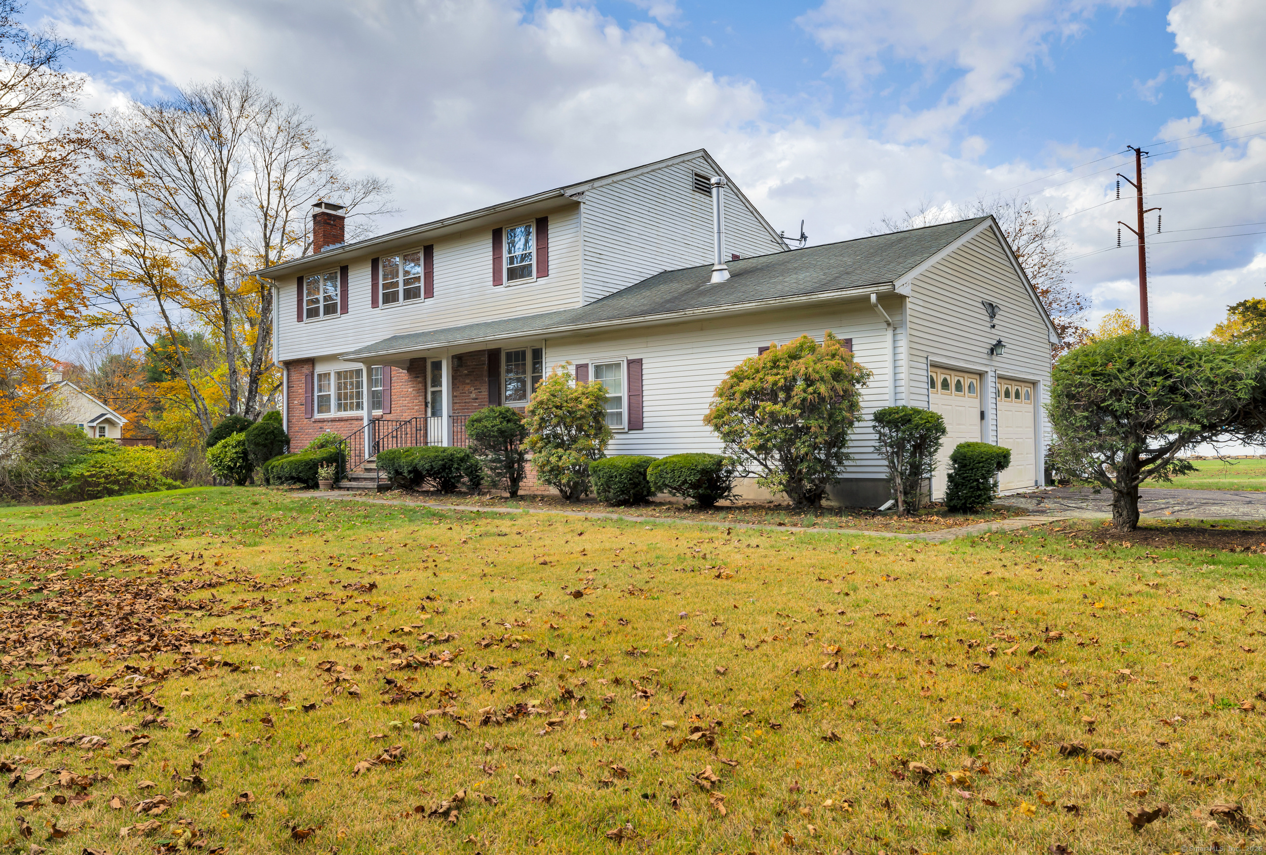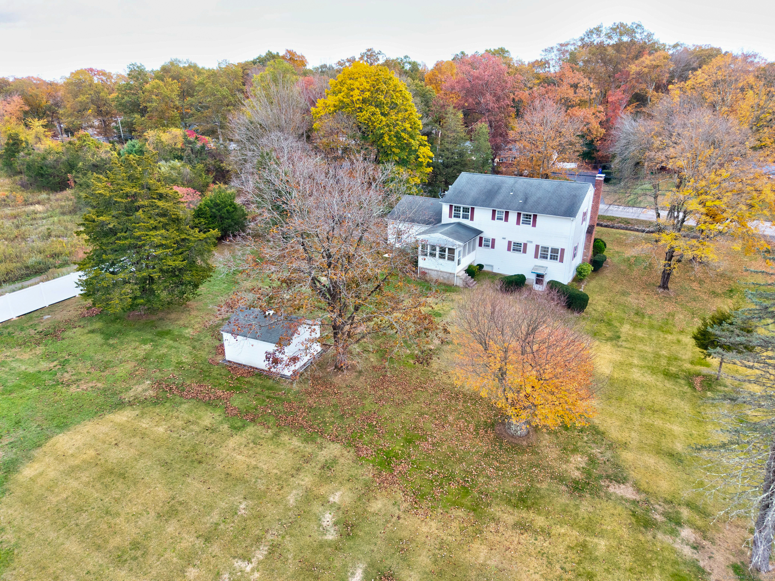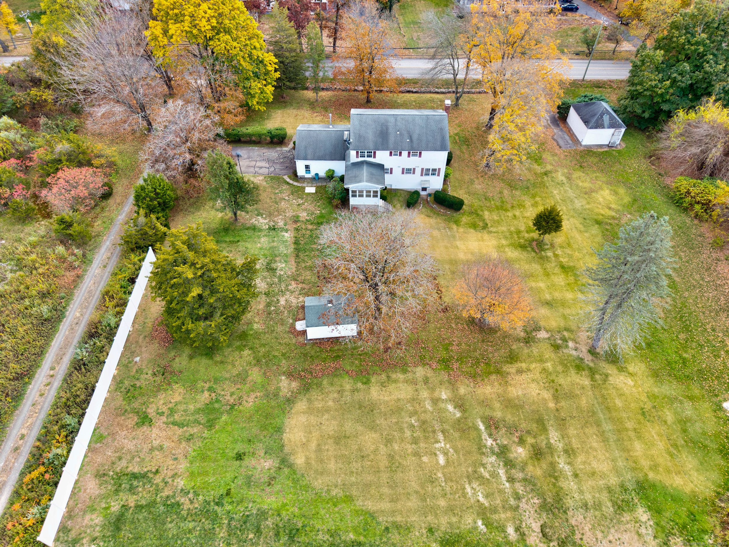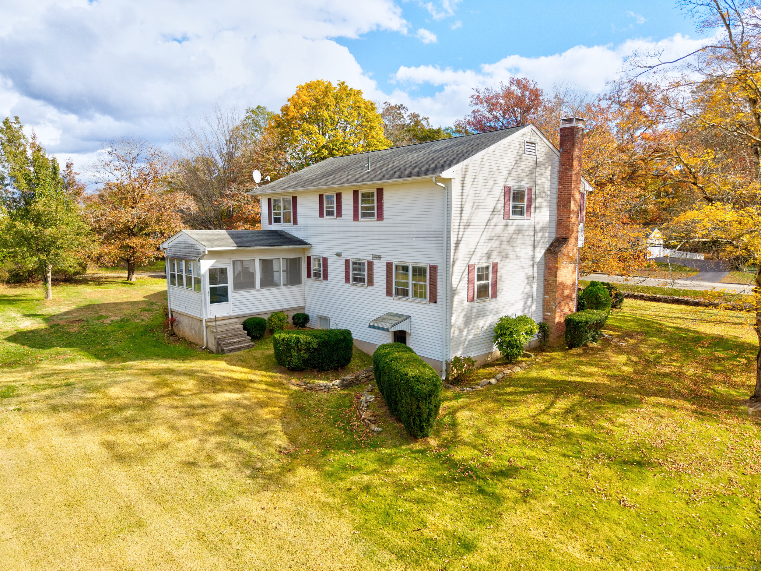 Looking for privacy and space close to town? This classic Colonial offers 4 bedrooms, 2 full baths, and sits on a level .90-acre lot. The main level features a bright living room with a wood-burning fireplace and a large picture window overlooking the front yard, flowing easily into the dining room. The kitchen includes a breakfast bar and built-in pantry storage. A spacious family room with a cozy wood stove and skylight fills the space with natural light, while the adjoining sunporch, featuring two exterior doors, opens to the backyard. Upstairs, you'll find four bedrooms, all with hardwood floors (including one currently carpeted), and a full bath with double sinks and a tub/shower combo. The large, level lot provides ample space for outdoor entertaining, gardening, or play. Additional highlights include a 2-car garage, full walk-out basement with laundry area (washer & dryer convey) and utility sink, plus an outdoor storage shed. While the home would benefit from updating, it offers an excellent opportunity to personalize and create your dream home in a desirable location. Conveniently noted just minutes from Guilford's historic town center and the Green, with quick and easy access to I-95 and Metro North, and 15 minutes to downtown New Haven and Yale. Bring your vision and make this special property shine!