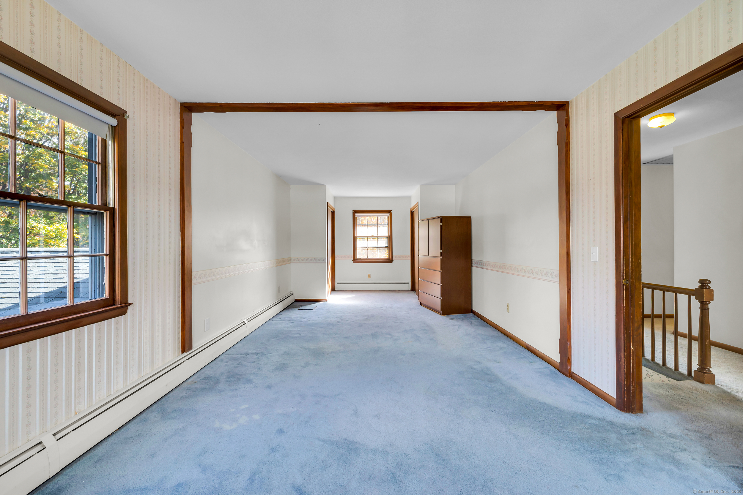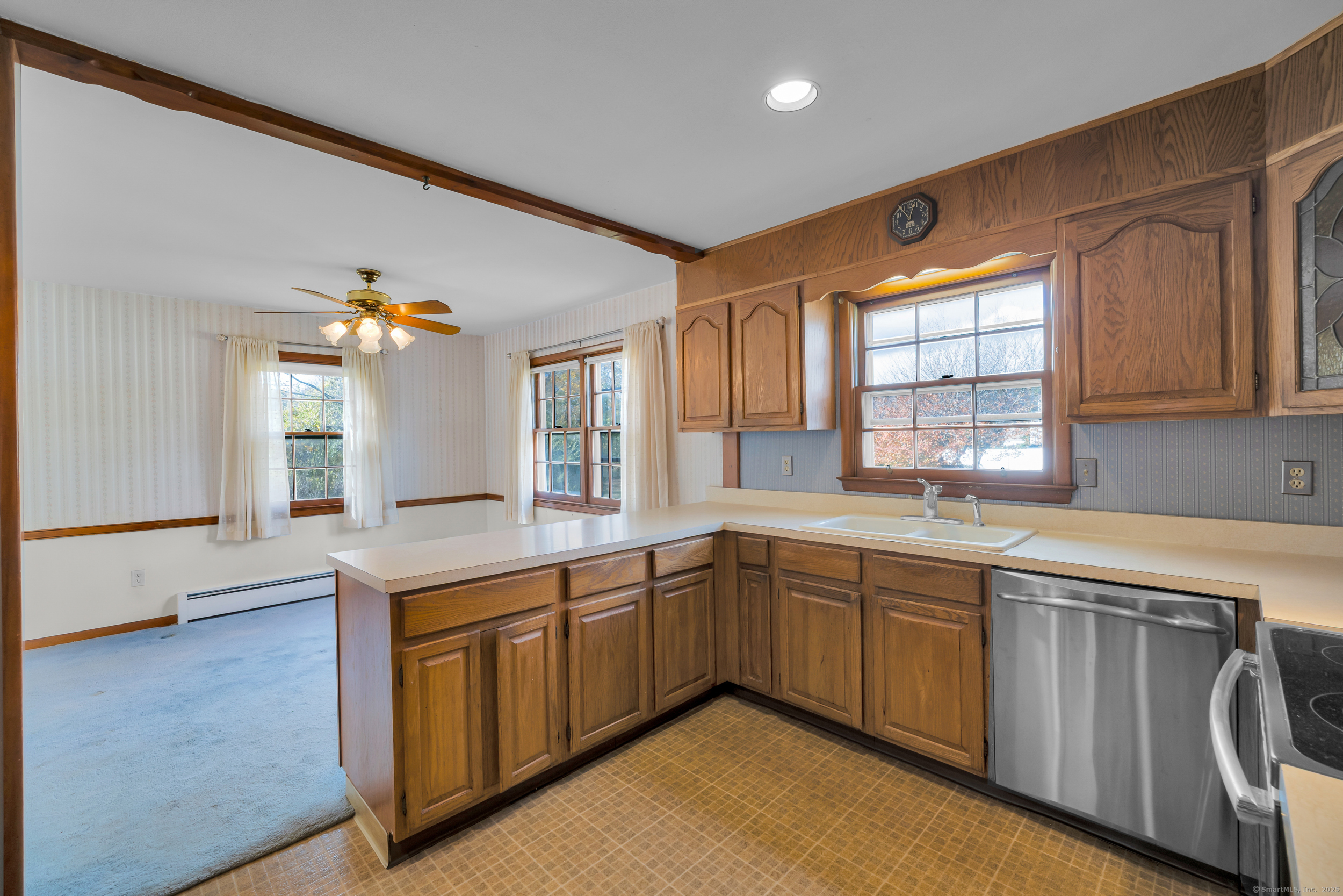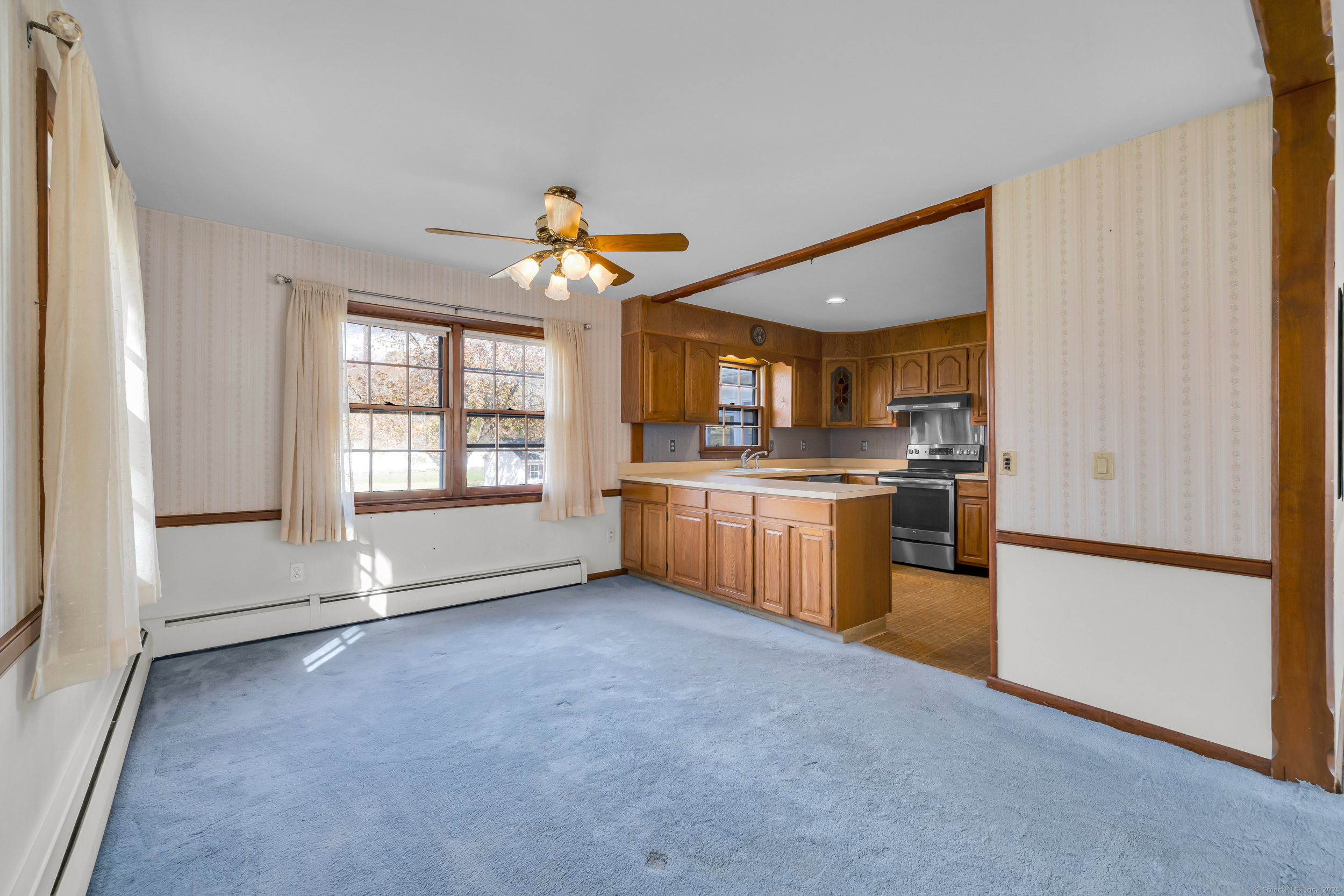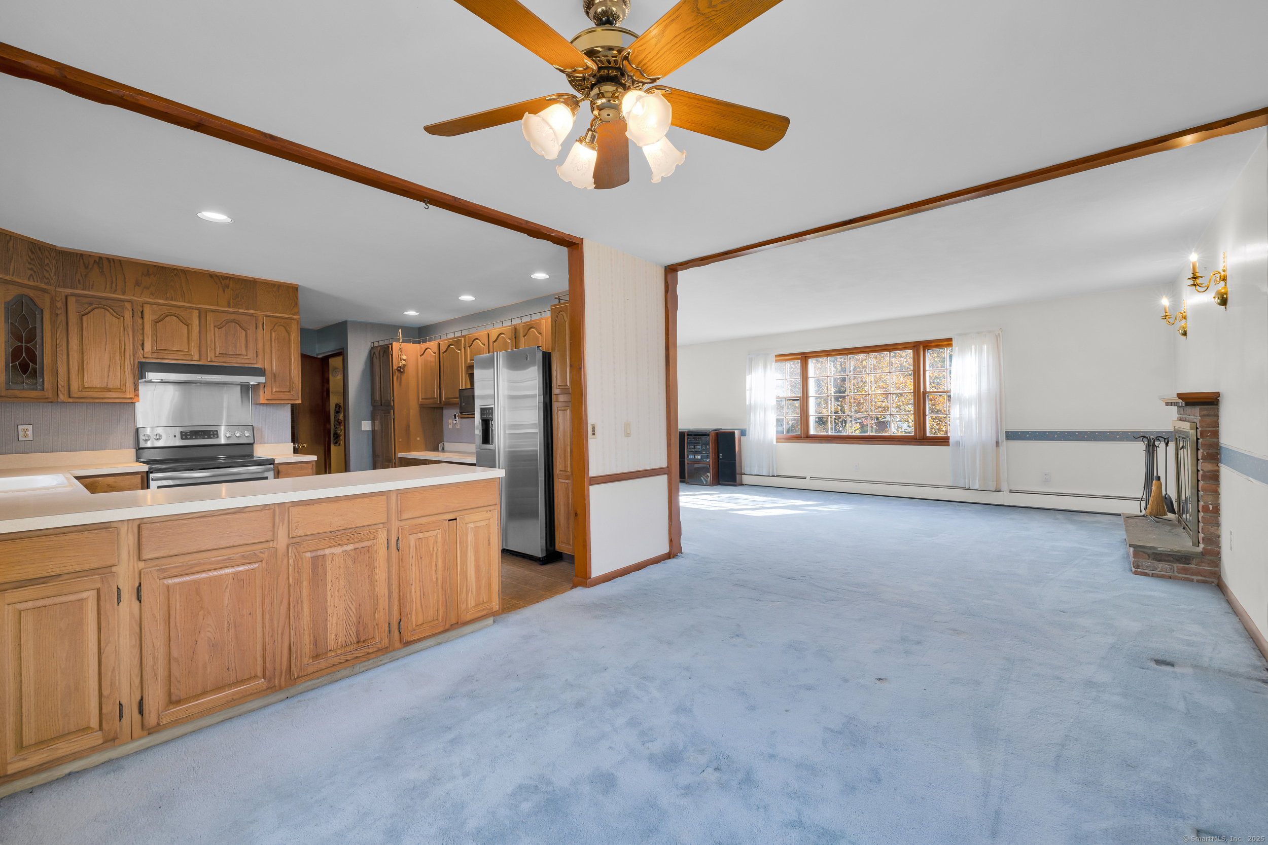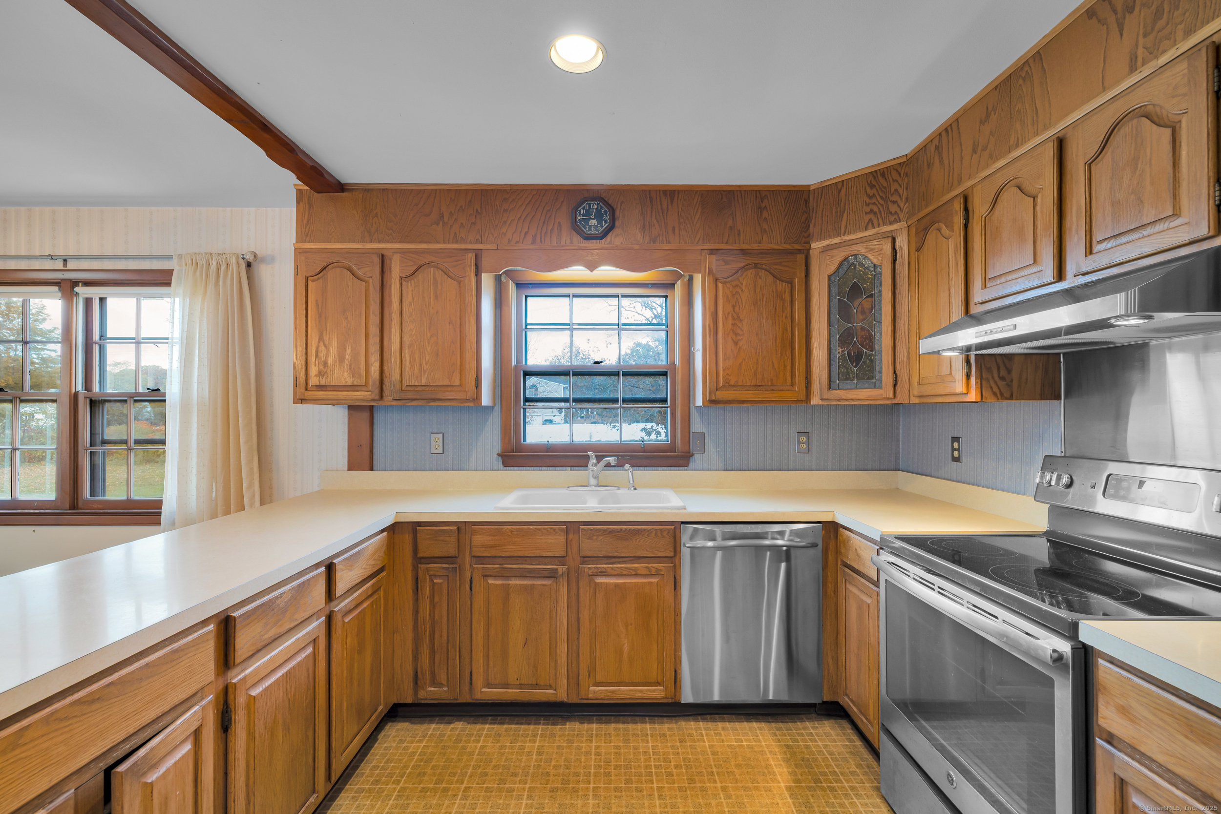Looking for privacy and space close to town? This classic Colonial offers 4 bedrooms, 2 full baths, and sits on a level .90-acre lot. The main level features a bright living room with a wood-burning fireplace and a large picture window overlooking the front yard, flowing easily into the dining room. The kitchen includes a breakfast bar and built-in pantry storage. A spacious family room with a cozy wood stove and skylight fills the space with natural light, while the adjoining sunporch, featuring two exterior doors, opens to the backyard. Upstairs, you'll find four bedrooms, all with hardwood floors (including one currently carpeted), and a full bath with double sinks and a tub/shower combo. The large, level lot provides ample space for outdoor entertaining, gardening, or play. Additional highlights include a 2-car garage, full walk-out basement with laundry area (washer & dryer convey) and utility sink, plus an outdoor storage shed. While the home would benefit from updating, it offers an excellent opportunity to personalize and create your dream home in a desirable location. Conveniently noted just minutes from Guilford's historic town center and the Green, with quick and easy access to I-95 and Metro North, and 15 minutes to downtown New Haven and Yale. Bring your vision and make this special property shine!