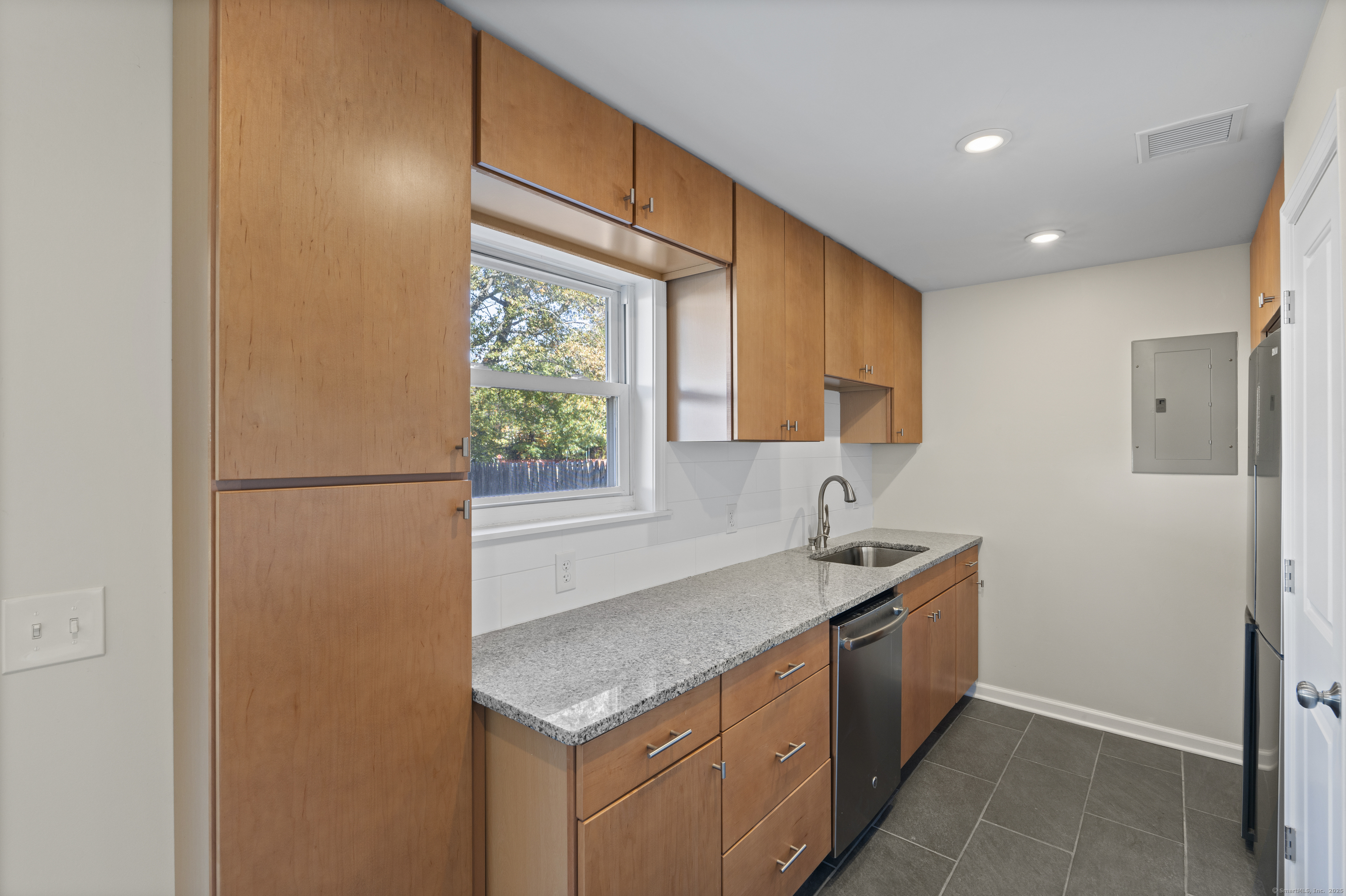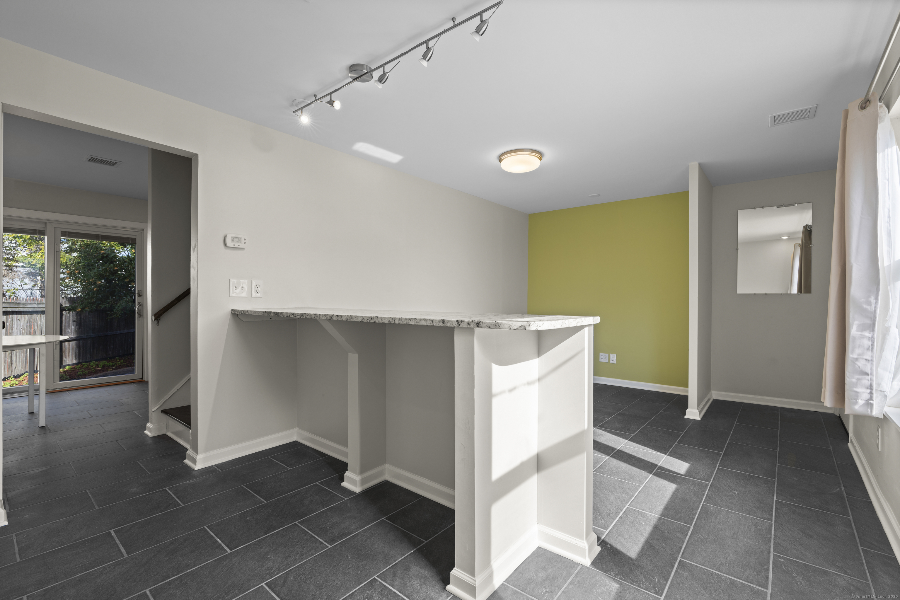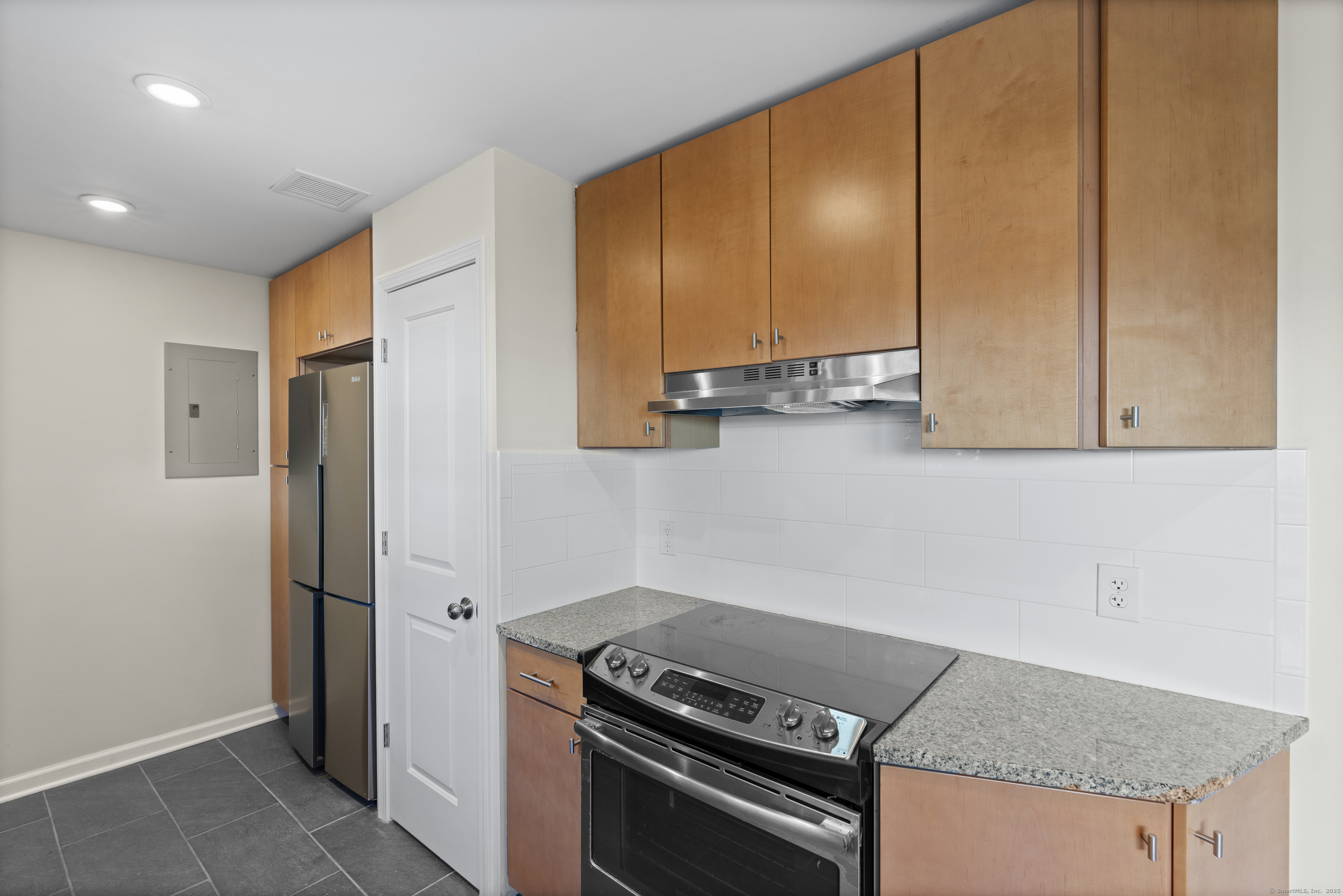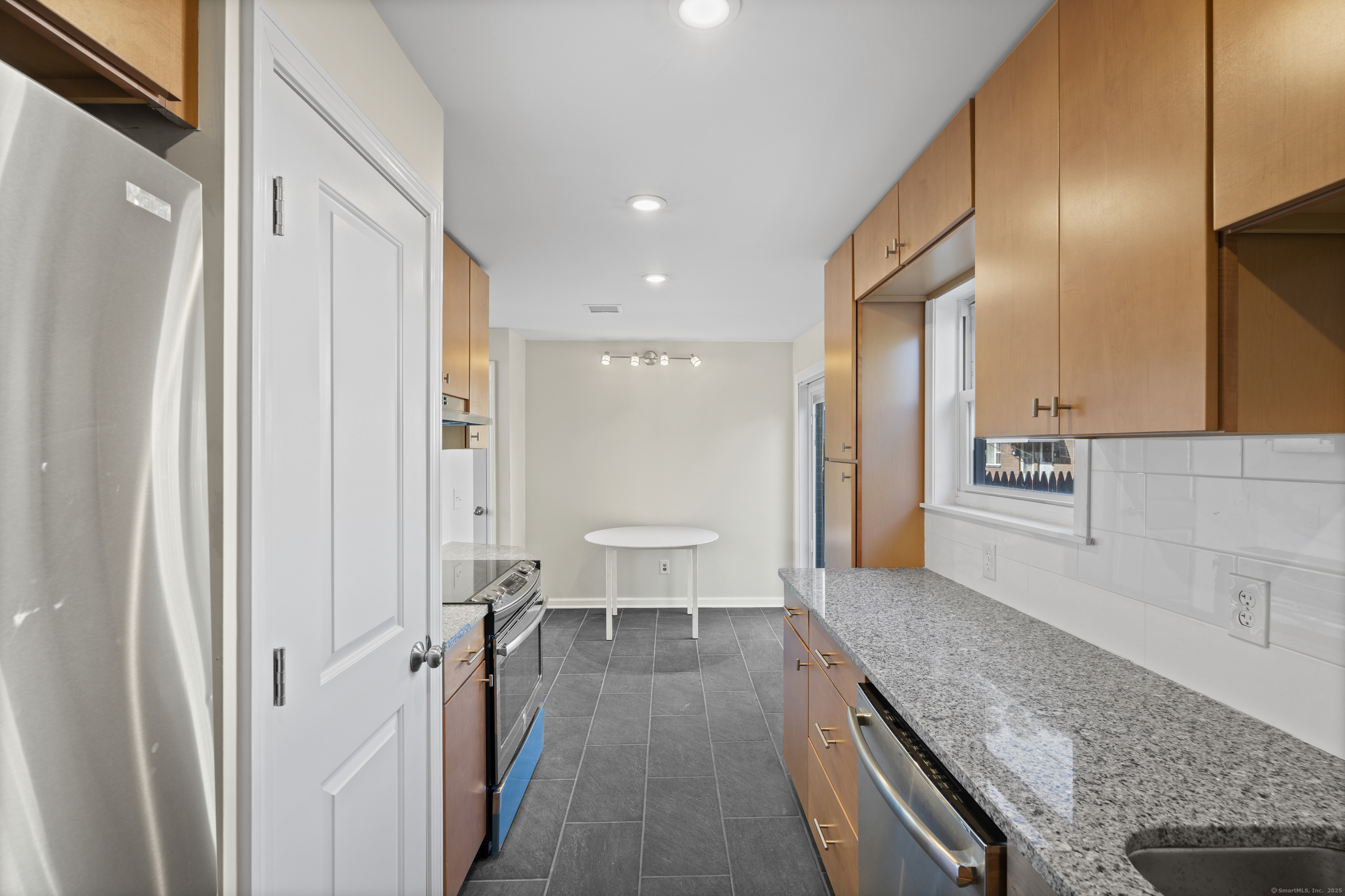 Welcome home to this beautifully renovated end unit townhouse-style condo in a quiet, well-maintained complex of just 33 units. Every inch has been updated for modern comfort and style. The first level features all-new tile flooring, fresh paint, modern lighting, and a bright, open living area with a granite-topped breakfast bar. The kitchen is a showstopper - complete with brand new cabinets, granite countertops, stainless steel appliances, and a sunny eat-in area. Sliders lead to your private, fenced-in patio shaded by a beautiful persimmon tree - perfect for morning coffee or evening relaxation. An updated half bath completes the main level. Upstairs, you'll find rich dark hardwood floors, new lighting, and fresh paint throughout. There are two spacious bedrooms, including one with a large walk-in closet, and an updated full bath with modern finishes. The laundry area is conveniently located upstairs and includes a brand new washer/dryer and built-in cabinetry for extra storage. Additional highlights include central air conditioning (a rare find in the complex!) Enjoy designated parking, an in-ground pool, and close proximity to shopping, restaurants, highways, Yale University, & more! Move right in and enjoy turnkey living!
