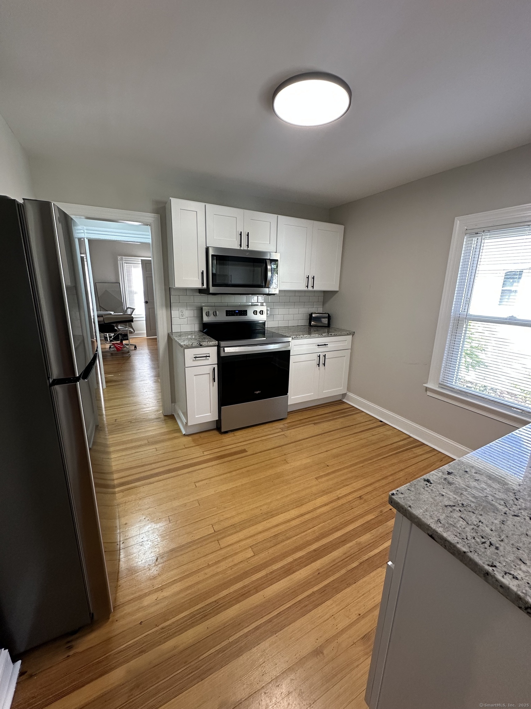 Spacious and fully renovated, this 3-bedroom, 1-bathroom apartment offers comfortable living with thoughtful upgrades throughout. The kitchen and bathroom have been completely remodeled with brand-new appliances and fixtures, and the entire unit has been freshly painted. You'll find hardwood floors throughout, new LED lighting, and updated door hardware throughout the space. Enjoy the convenience of off-street parking for two cars, along with an on-site EV charger. The large, fenced-in backyard features a small rock patio perfect for outdoor relaxation, grilling or entertaining. Additional improvements include a newly redone driveway, Roof, and Common area's making this move-in ready home as functional as it is stylish. $2850/Month - HEAT INCLUDED IN RENT. Grass, Snow, Trash, Water, and Sewer also included. 8 minute Walk to Main Street Middletown close to shops, restaurants, Wesleyan, Middlesex Hospital, Tate's + More. Easy access to Rte 91 and Rte 9.