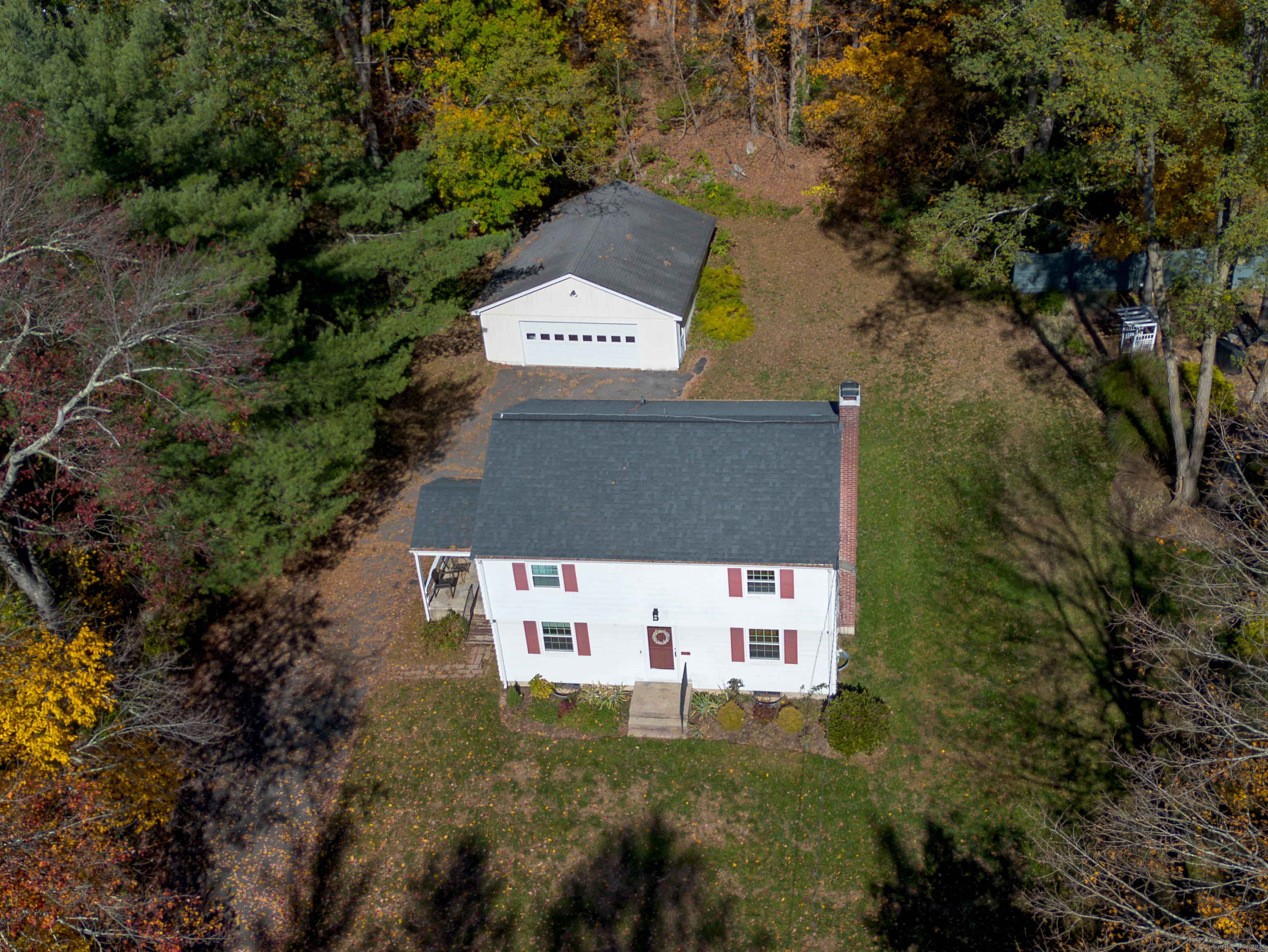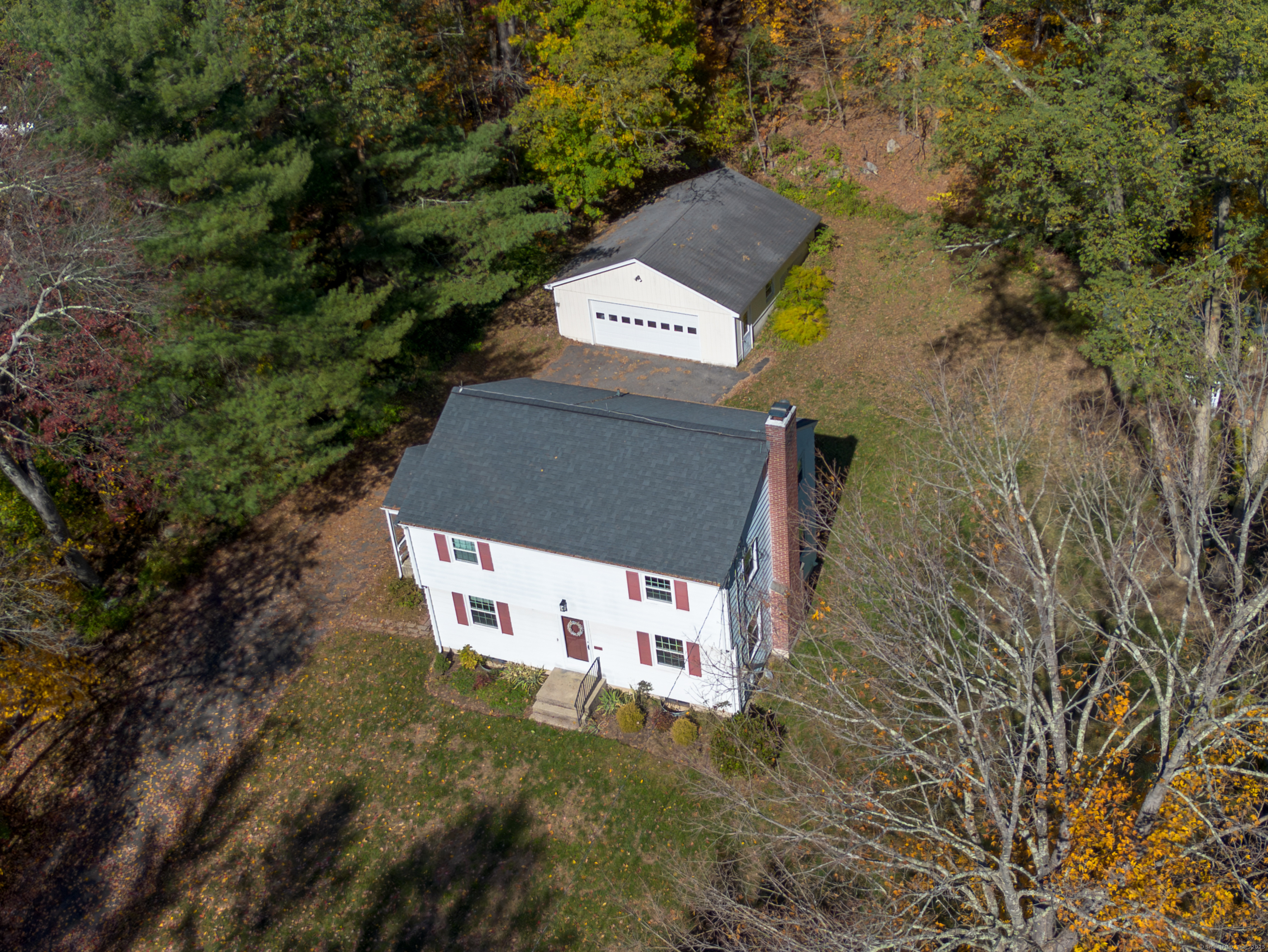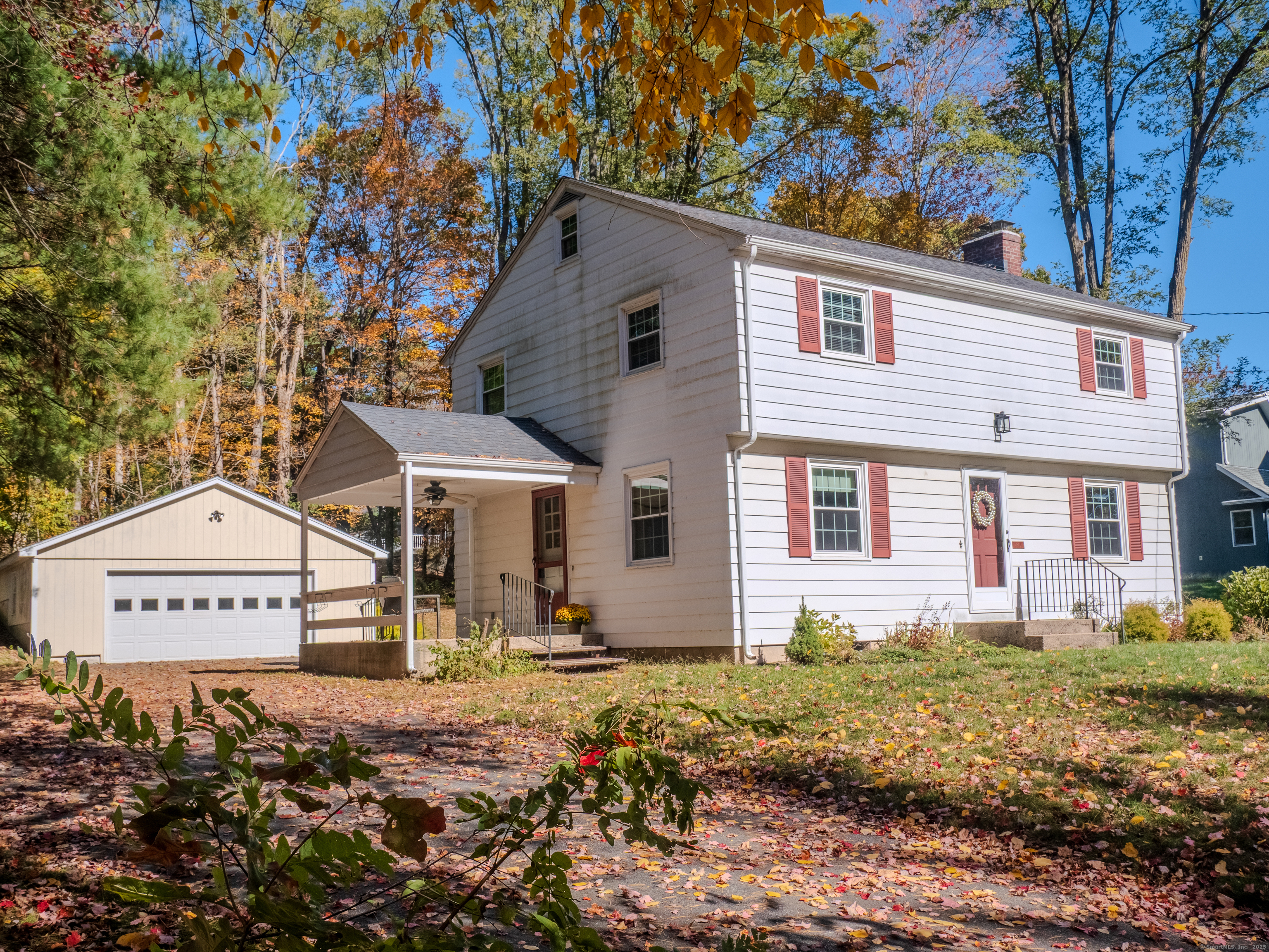 Welcome home to this charming colonial set on a serene lightly wooded private lot. Enjoy the weather on the covered porch or the nice private backyard. The interior of the home features a floorpan great for entertaining and hardwood flooring in the living room, dining room, and all 4 bedrooms. On the main level you will find a large living room with a cozy brick fireplace as well as a nice sized dining room right off the kitchen and a full bath. The kitchen features built in shelving as well as a sunny dining area and access to the covered porch as well as a nostalgic dutch door. The upper level hosts the spacious and sun filled primary bedroom. Three additional bedrooms and a full bath complete this level. The unfinished lower level with an additional fireplace has ample storage and is equipped with a generator hook up making it convenient to add a generator in the future. Additional space in the walk up attic offers many possibilities. Huge detached garage with additional unfinished space. So much potential in this home...don't miss out on this opportunity to make it your own. Conveniently located to public/private schools, library, shops, dining, walking trails, Farmington River, interstates & more. Schedule a private tour today. Recent improvements and upgrades include Newer roof, furnace and windows. Home is being sold "As Is." A great opportunity to make this home your own and experience all the charm of Collinsville and the Farmington Valley.