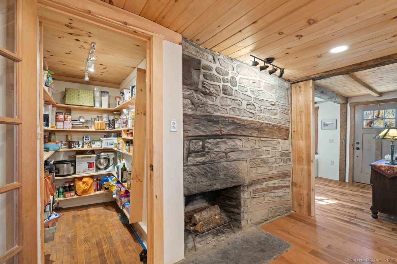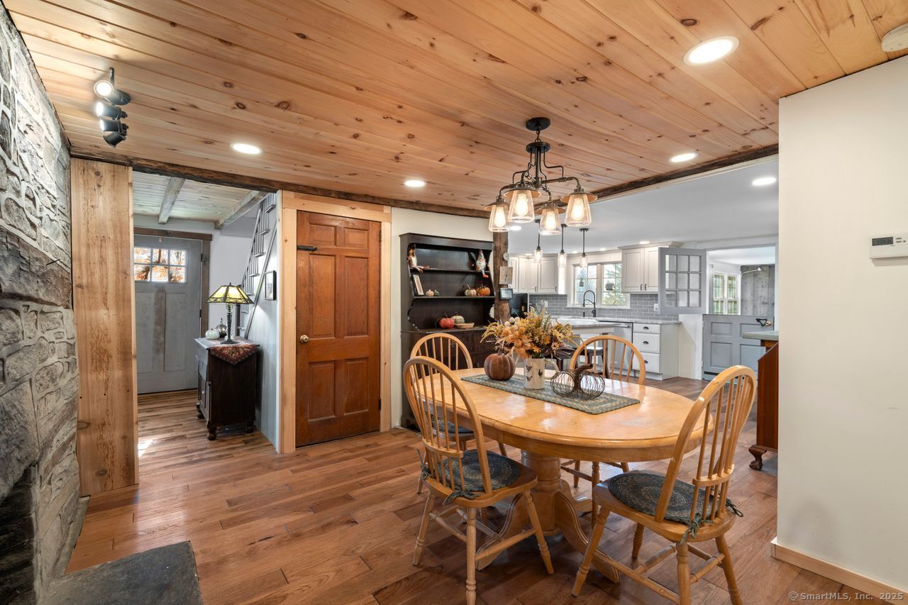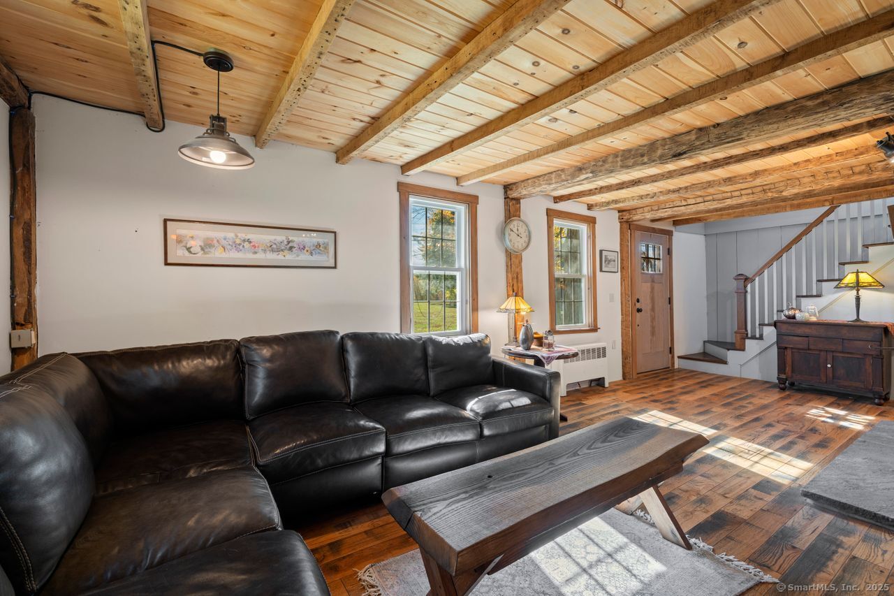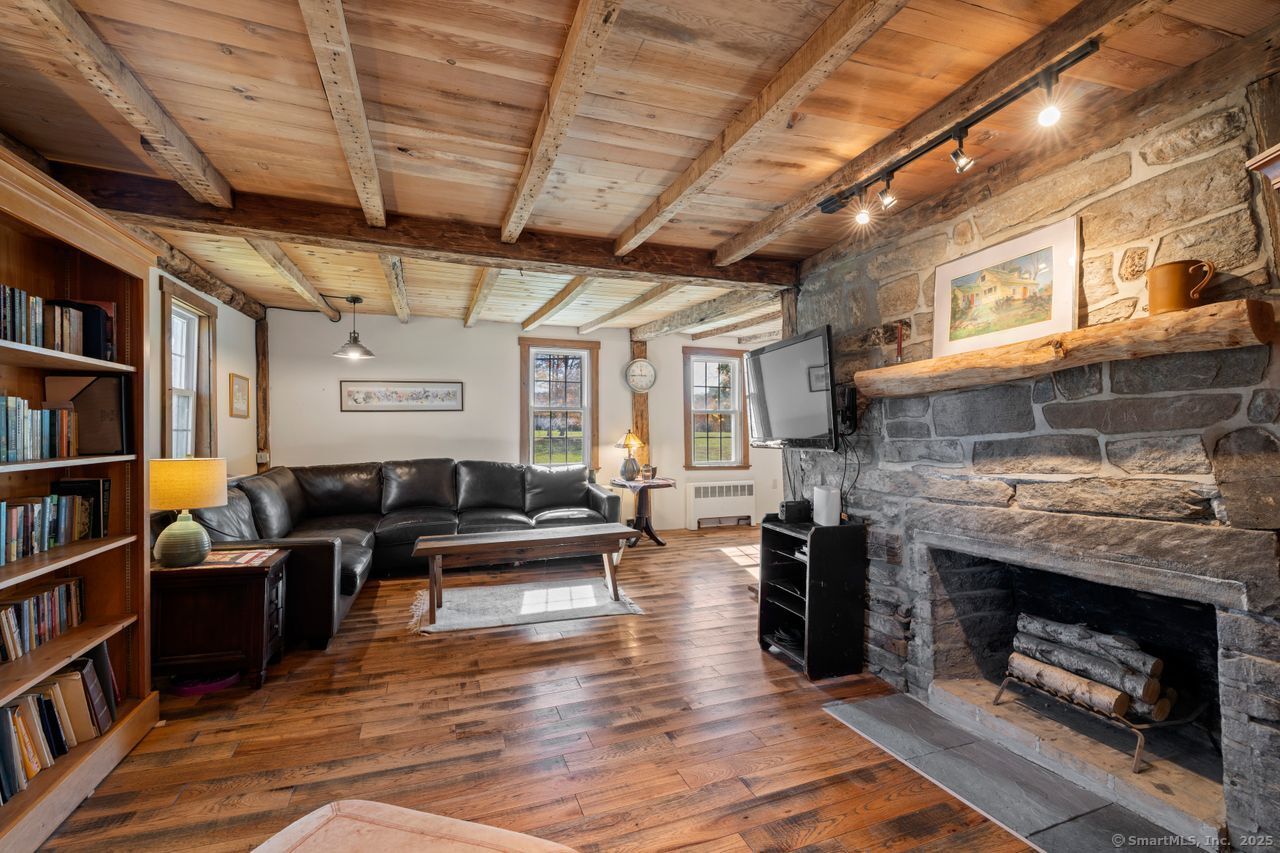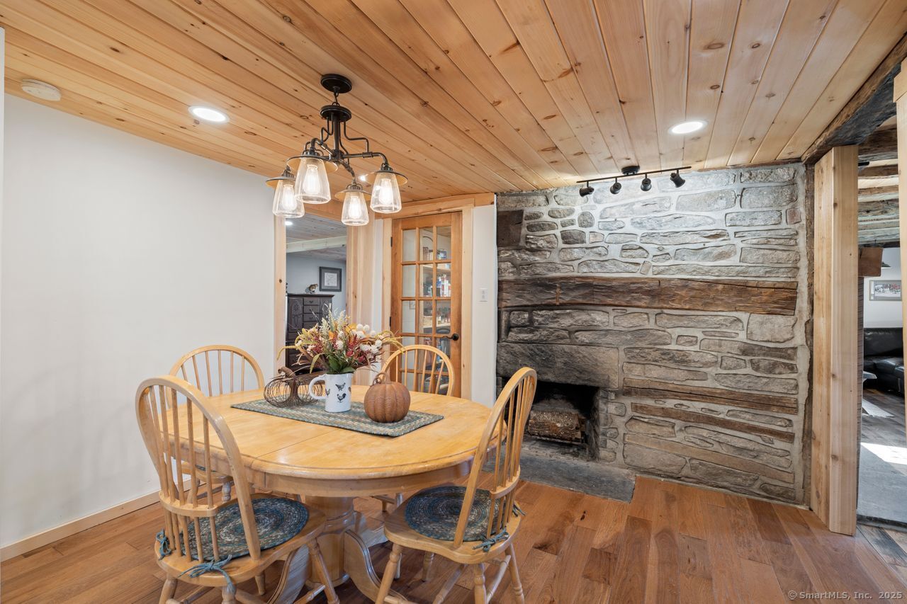 Prepare to be amazed! This circa 1740 Cape has been beautifully renovated and thoughtfully transformed while preserving all the warmth and charm that New Englanders cherish in an antique home. The central chimney anchors the home with three working fireplaces, including one with a wood stove. The kitchen features granite countertops, stainless steel appliances (including a gas range), a breakfast bar for casual meals, and a custom coffee bar topped with a concrete counter. The dining area showcases hardwood floors and its own working fireplace, creating the perfect setting for cozy gatherings. Both the living room and study boast hickory floors, exposed beams, and fireplaces that make each space feel inviting and comfortable. The first-floor primary suite includes a walk-in closet and a luxurious full bath with a soaking tub, double sinks, and a tiled shower. A half bath and sunroom complete the main level. Upstairs, you'll find two additional bedrooms, a full bath, and a laundry room, along with several hallway closets, including a cedar closet, for added storage. Set on 2.4 level, fenced acres, the property offers a stone patio, garden area, chicken coop, and pasture-a true countryside retreat that blends historic character with modern comfort.