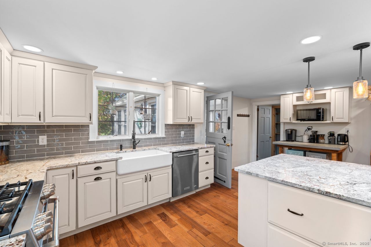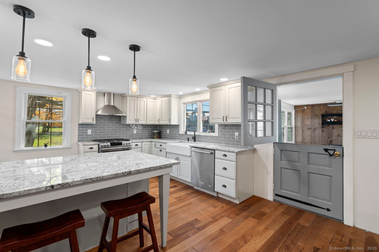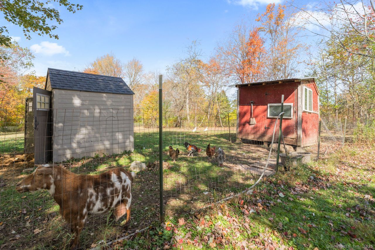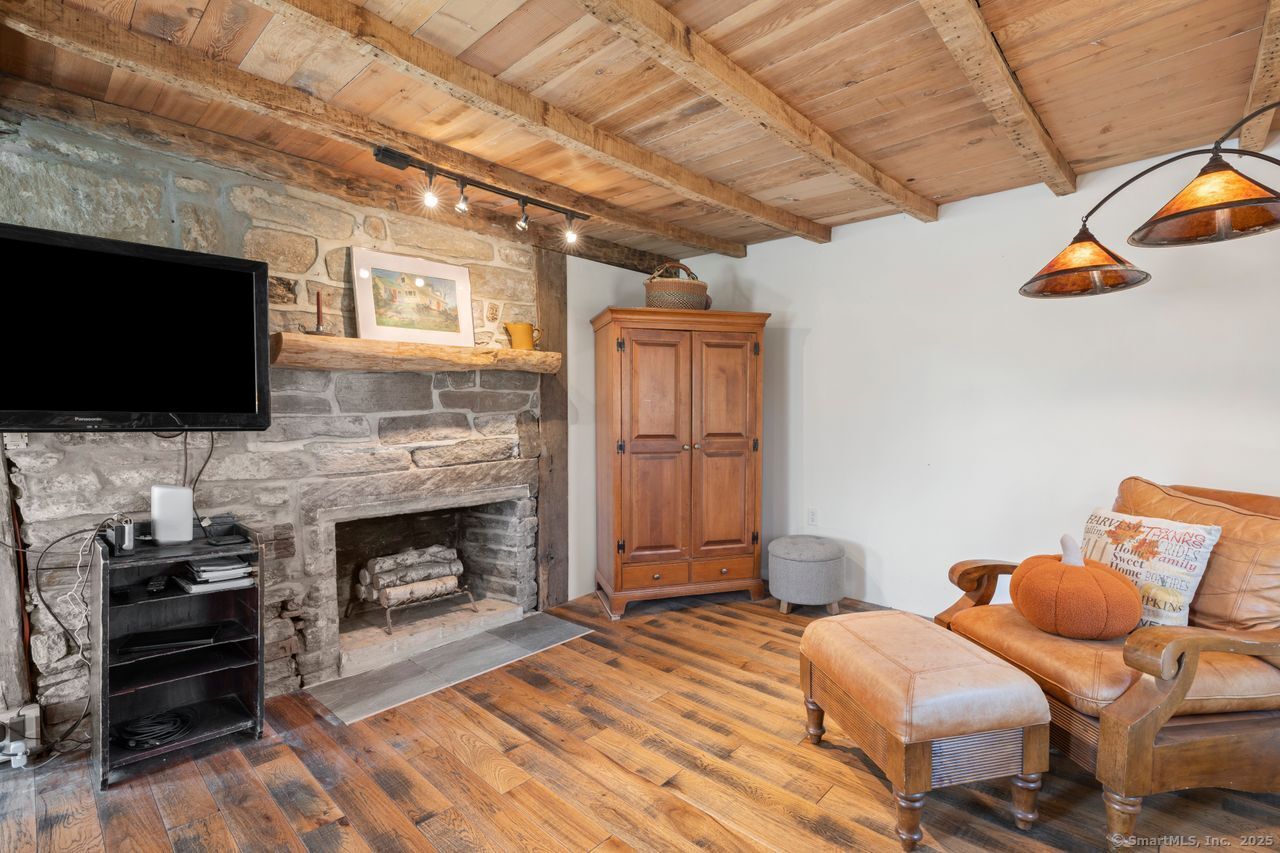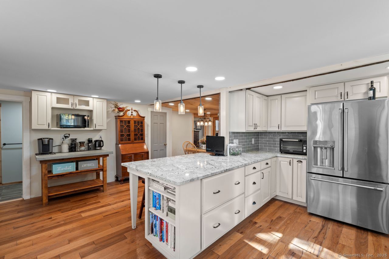 Prepare to be amazed! This circa 1740 Cape has been beautifully renovated and thoughtfully transformed while preserving all the warmth and charm that New Englanders cherish in an antique home. The central chimney anchors the home with three working fireplaces, including one with a wood stove. The kitchen features granite countertops, stainless steel appliances (including a gas range), a breakfast bar for casual meals, and a custom coffee bar topped with a concrete counter. The dining area showcases hardwood floors and its own working fireplace, creating the perfect setting for cozy gatherings. Both the living room and study boast hickory floors, exposed beams, and fireplaces that make each space feel inviting and comfortable. The first-floor primary suite includes a walk-in closet and a luxurious full bath with a soaking tub, double sinks, and a tiled shower. A half bath and sunroom complete the main level. Upstairs, you'll find two additional bedrooms, a full bath, and a laundry room, along with several hallway closets, including a cedar closet, for added storage. Set on 2.4 level, fenced acres, the property offers a stone patio, garden area, chicken coop, and pasture-a true countryside retreat that blends historic character with modern comfort.