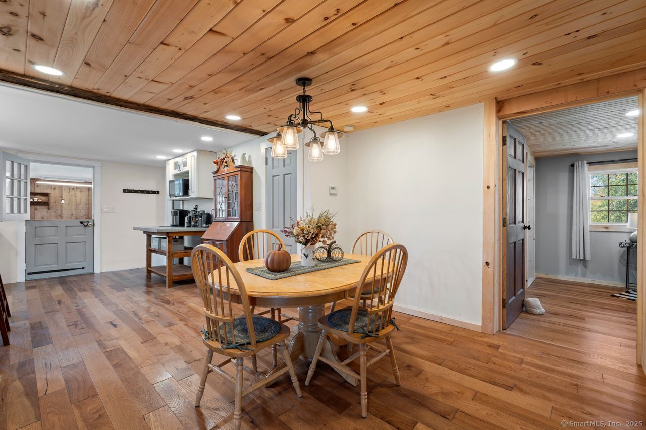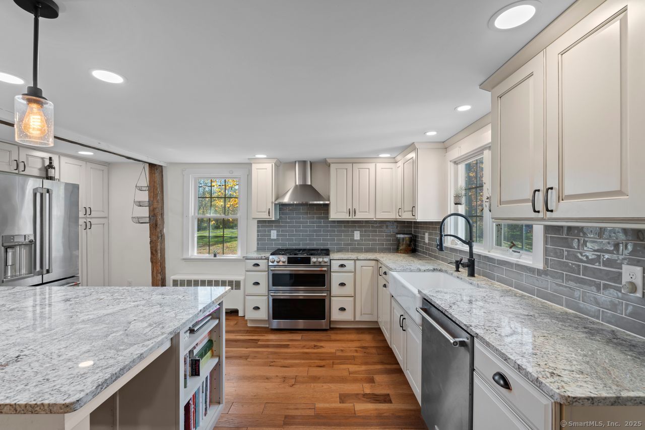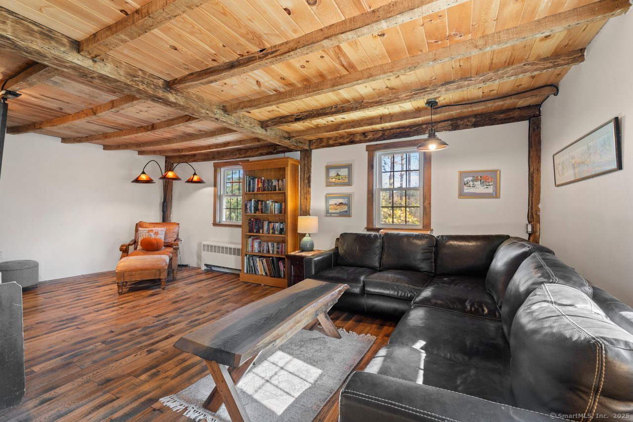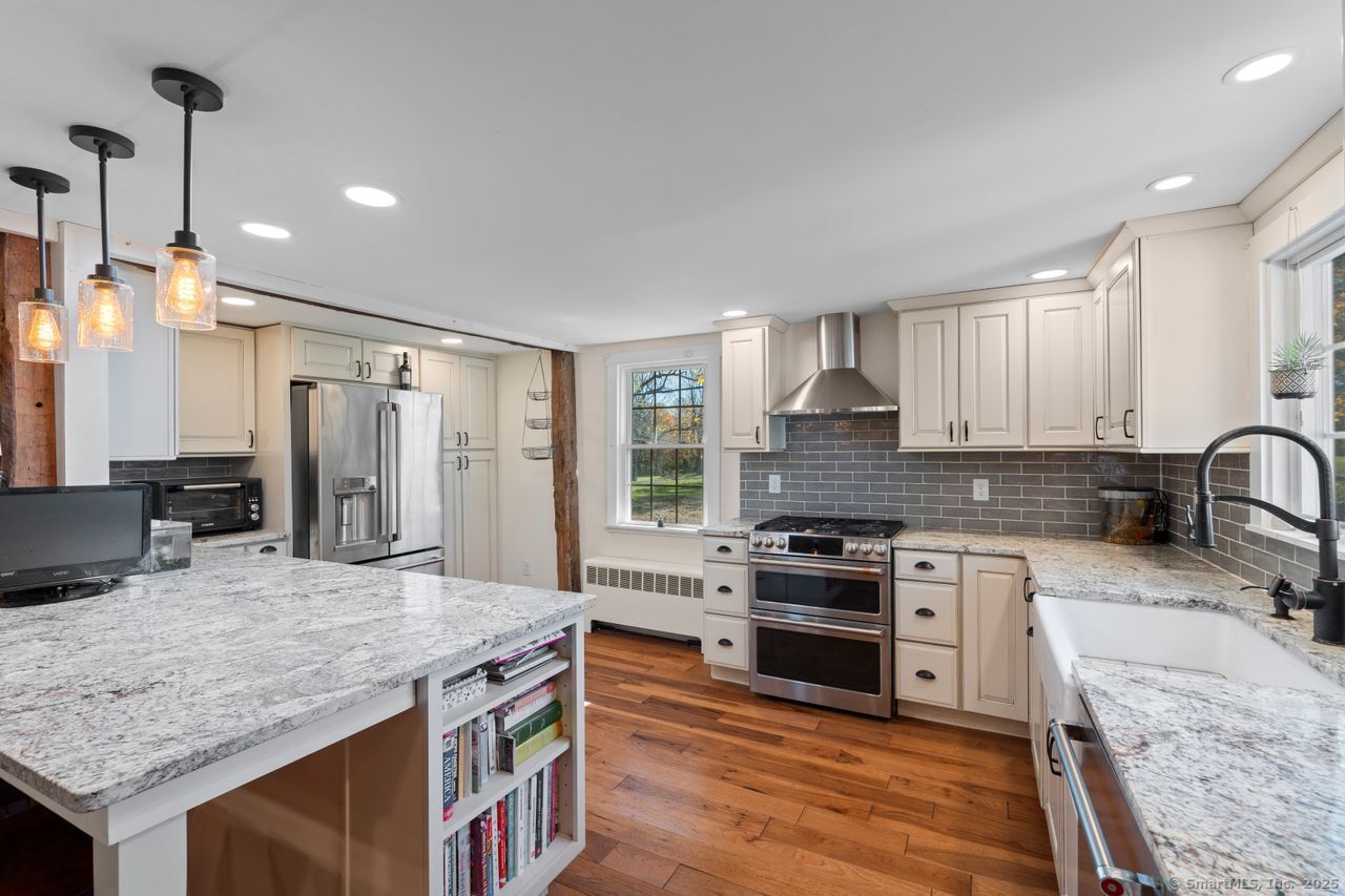 Prepare to be amazed! This circa 1740 Cape has been beautifully renovated and thoughtfully transformed while preserving all the warmth and charm that New Englanders cherish in an antique home. The central chimney anchors the home with three working fireplaces, including one with a wood stove. The kitchen features granite countertops, stainless steel appliances (including a gas range), a breakfast bar for casual meals, and a custom coffee bar topped with a concrete counter. The dining area showcases hardwood floors and its own working fireplace, creating the perfect setting for cozy gatherings. Both the living room and study boast hickory floors, exposed beams, and fireplaces that make each space feel inviting and comfortable. The first-floor primary suite includes a walk-in closet and a luxurious full bath with a soaking tub, double sinks, and a tiled shower. A half bath and sunroom complete the main level. Upstairs, you'll find two additional bedrooms, a full bath, and a laundry room, along with several hallway closets, including a cedar closet, for added storage. Set on 2.4 level, fenced acres, the property offers a stone patio, garden area, chicken coop, and pasture-a true countryside retreat that blends historic character with modern comfort.