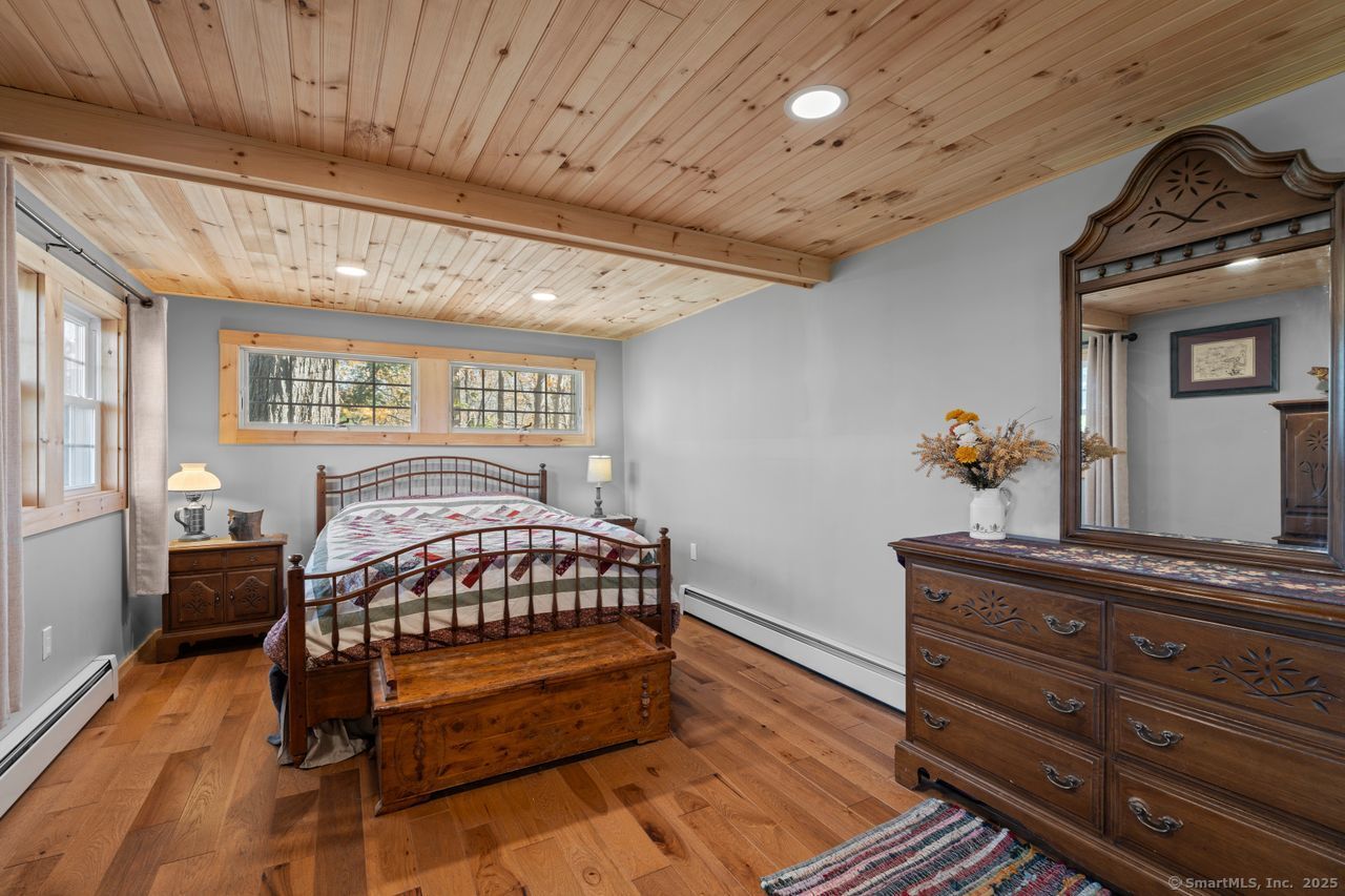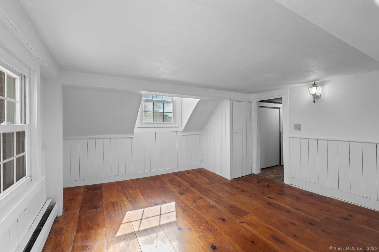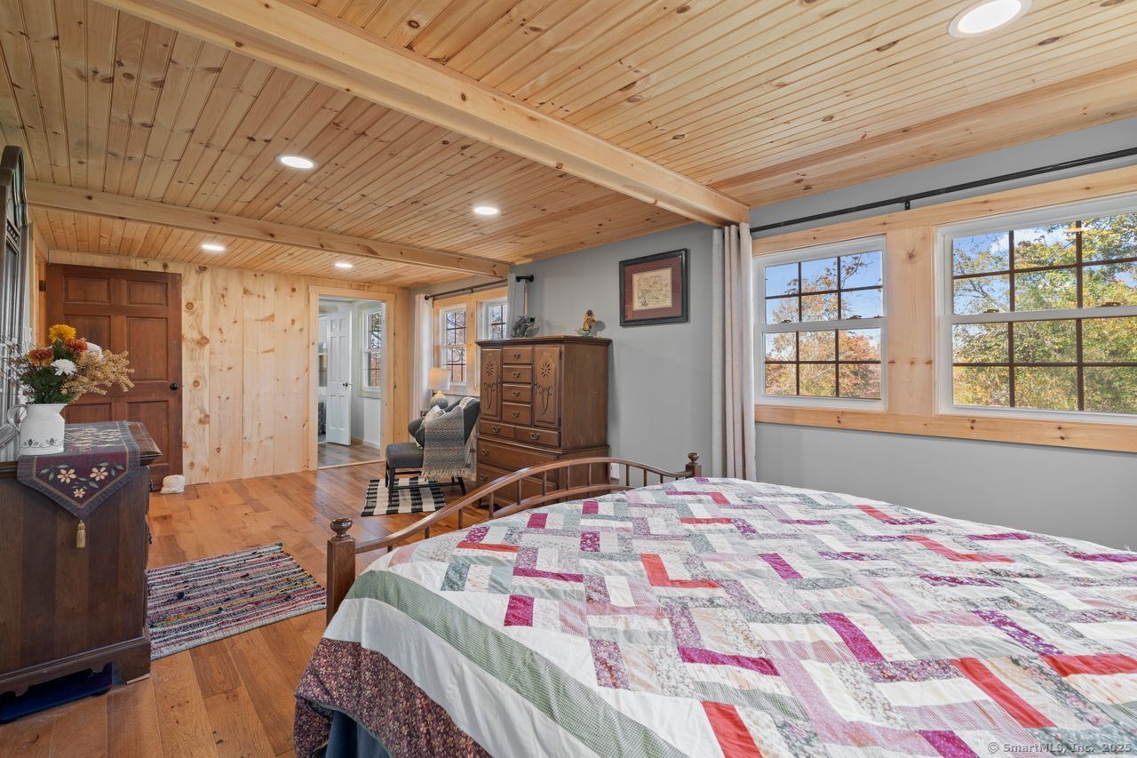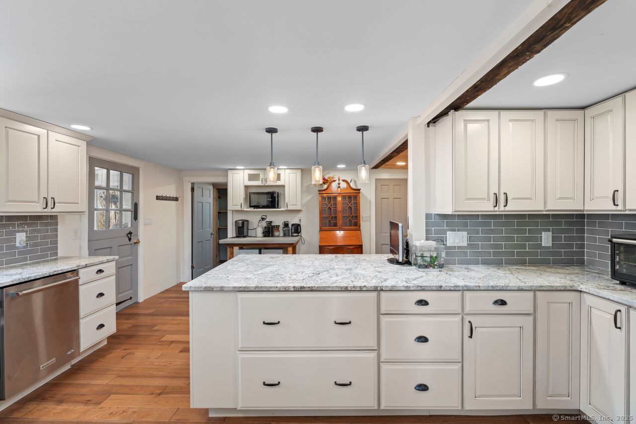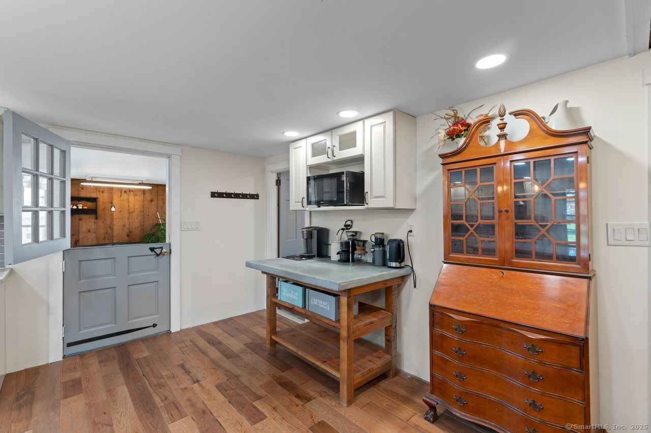Prepare to be amazed! This circa 1740 Cape has been beautifully renovated and thoughtfully transformed while preserving all the warmth and charm that New Englanders cherish in an antique home. The central chimney anchors the home with three working fireplaces, including one with a wood stove. The kitchen features granite countertops, stainless steel appliances (including a gas range), a breakfast bar for casual meals, and a custom coffee bar topped with a concrete counter. The dining area showcases hardwood floors and its own working fireplace, creating the perfect setting for cozy gatherings. Both the living room and study boast hickory floors, exposed beams, and fireplaces that make each space feel inviting and comfortable. The first-floor primary suite includes a walk-in closet and a luxurious full bath with a soaking tub, double sinks, and a tiled shower. A half bath and sunroom complete the main level. Upstairs, you'll find two additional bedrooms, a full bath, and a laundry room, along with several hallway closets, including a cedar closet, for added storage. Set on 2.4 level, fenced acres, the property offers a stone patio, garden area, chicken coop, and pasture-a true countryside retreat that blends historic character with modern comfort.