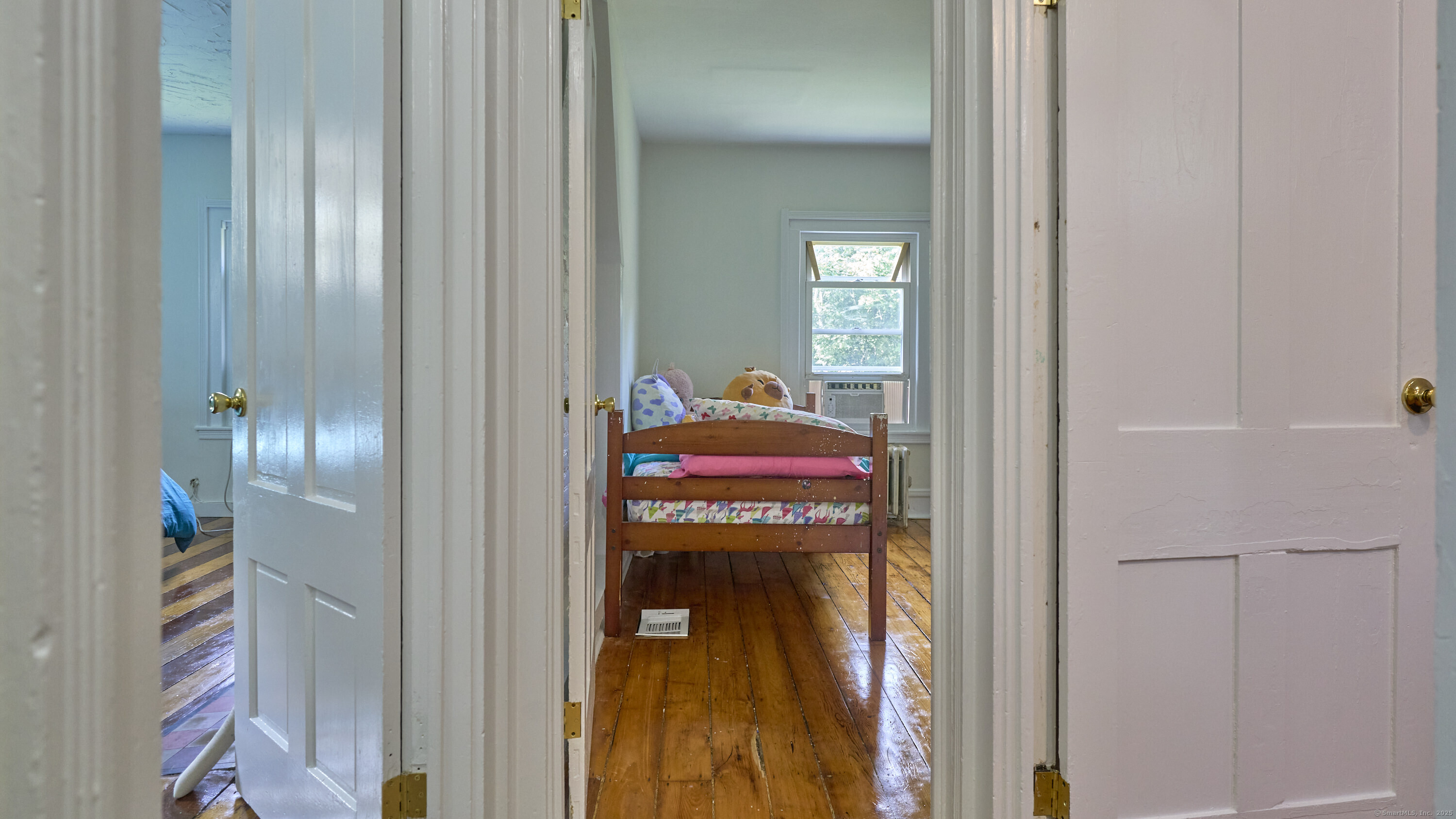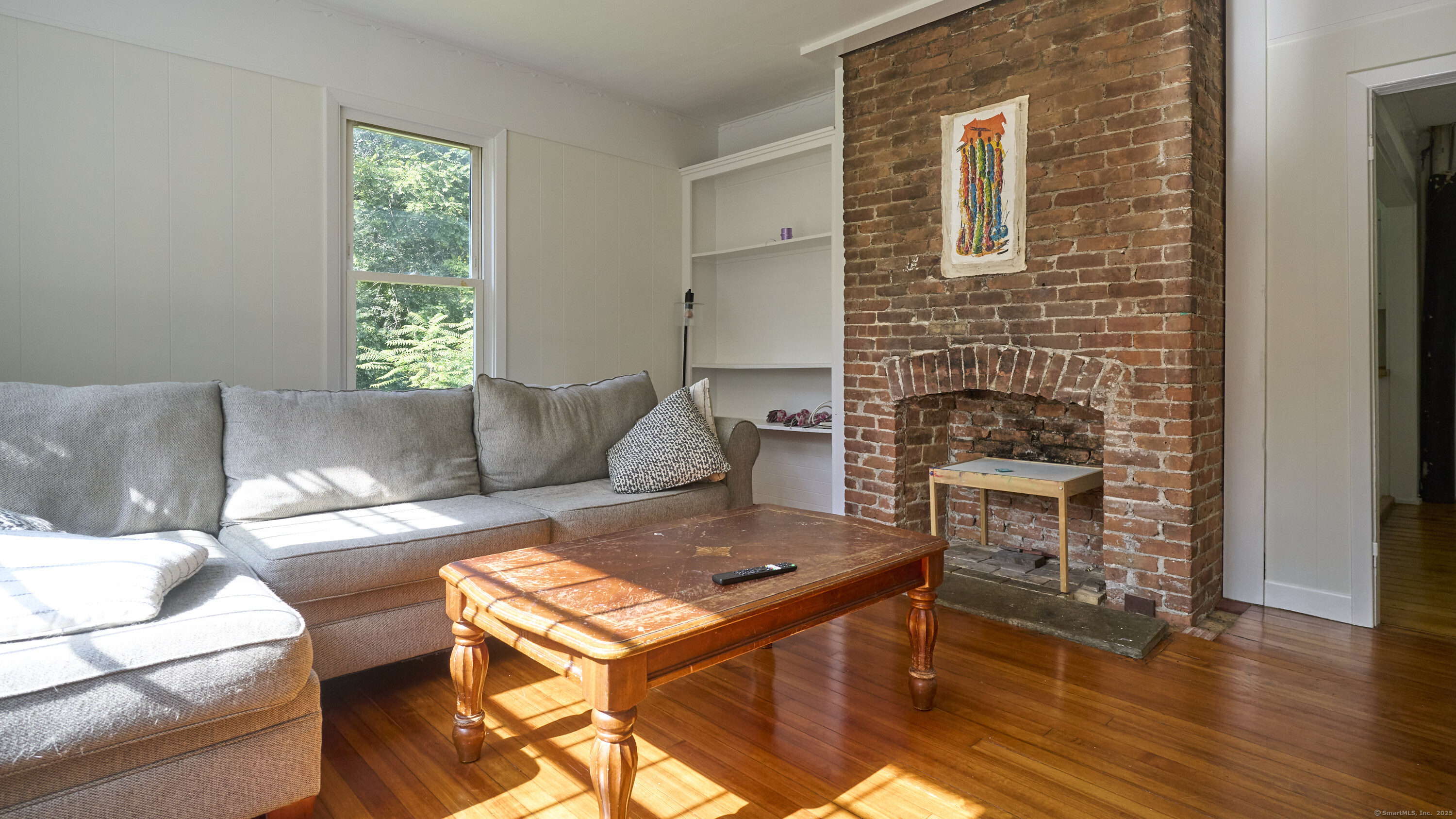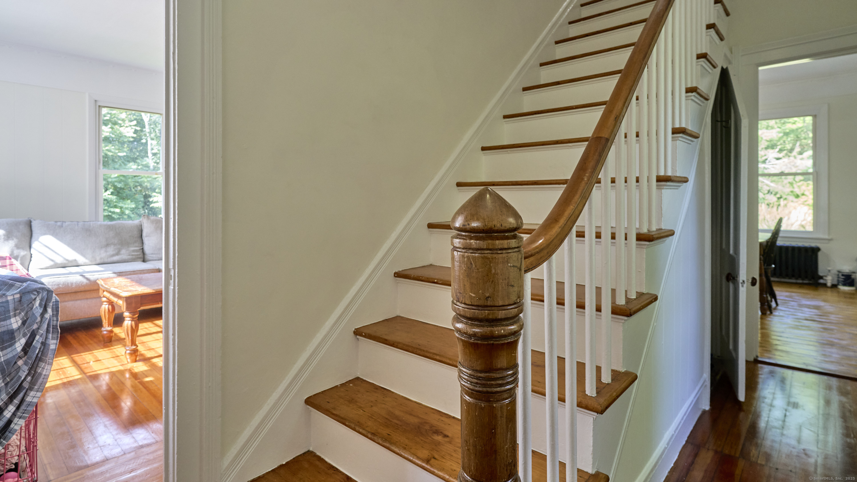 This farmhouse sits on an acre and a half of level land. Inside, hardwood floors run throughout, accompanied by wide trim and clean moldings that reflect the home's simple craftsmanship. On the main floor, you'll find a bright kitchen that opens to a spacious living area, where tall windows fill the rooms with natural light. Upstairs, you'll find bedrooms that continue the hardwood floors and feature details such as exposed brick, wide trim, and tall windows. Outside, the open yard offers a mix of sun and shade, suitable for gardens, projects, or quiet outdoor time. The property is located just minutes from downtown Norwich, Mohegan Park, and local shops, museums, and restaurants, combining privacy with convenient access to amenities