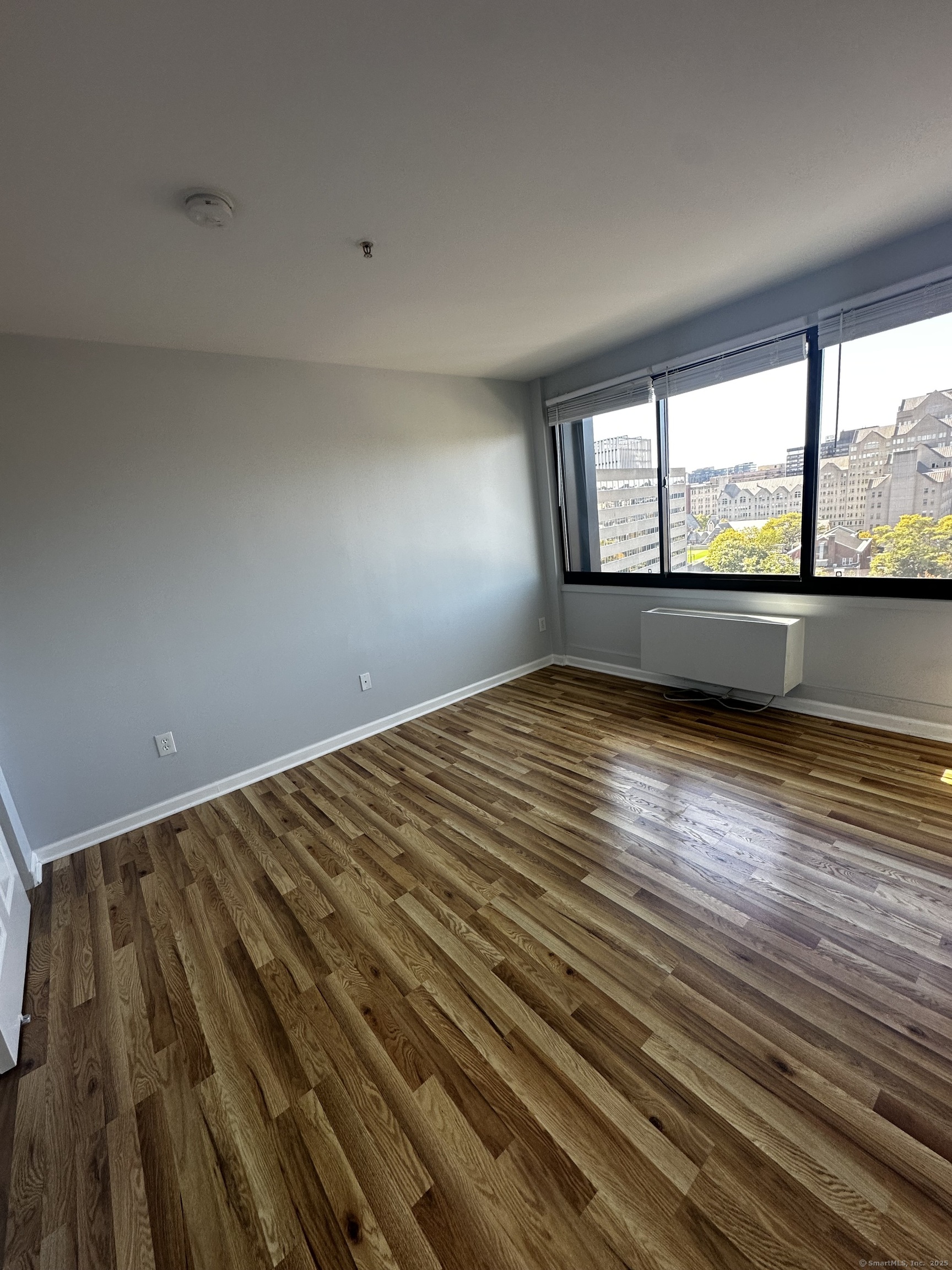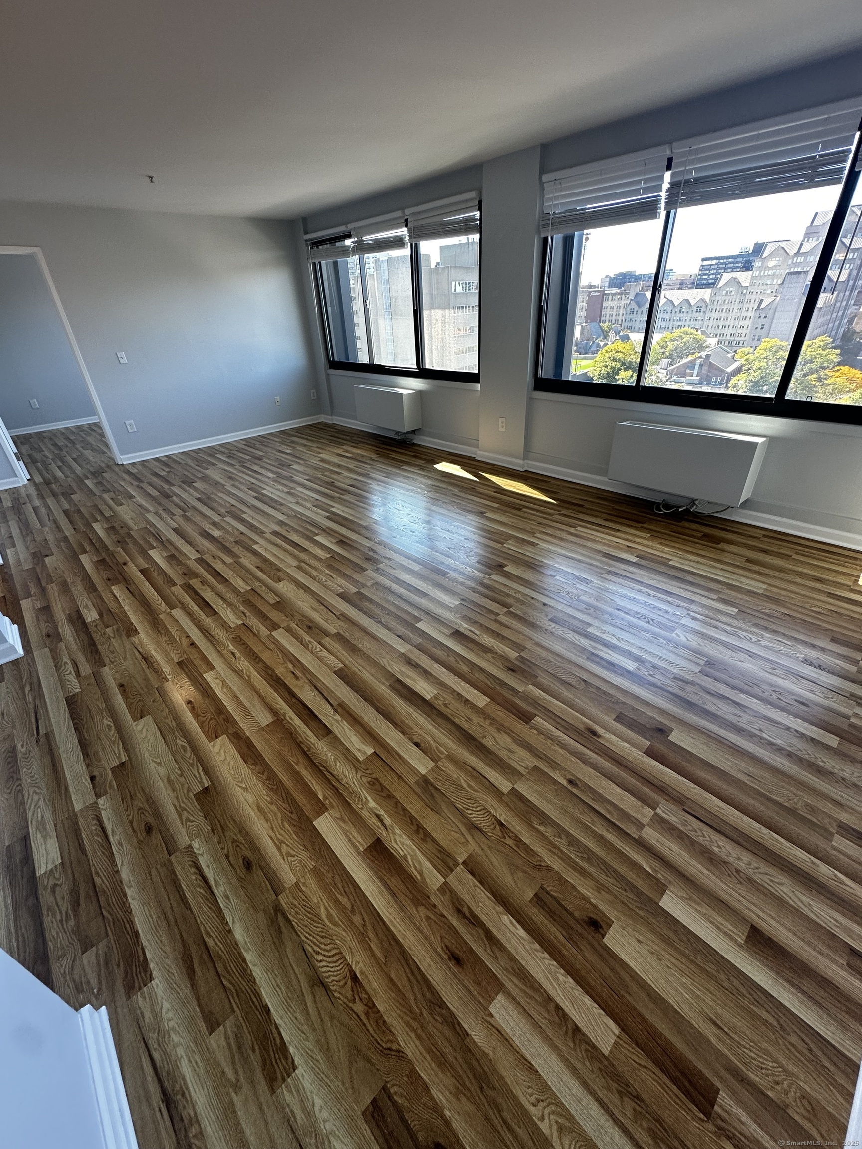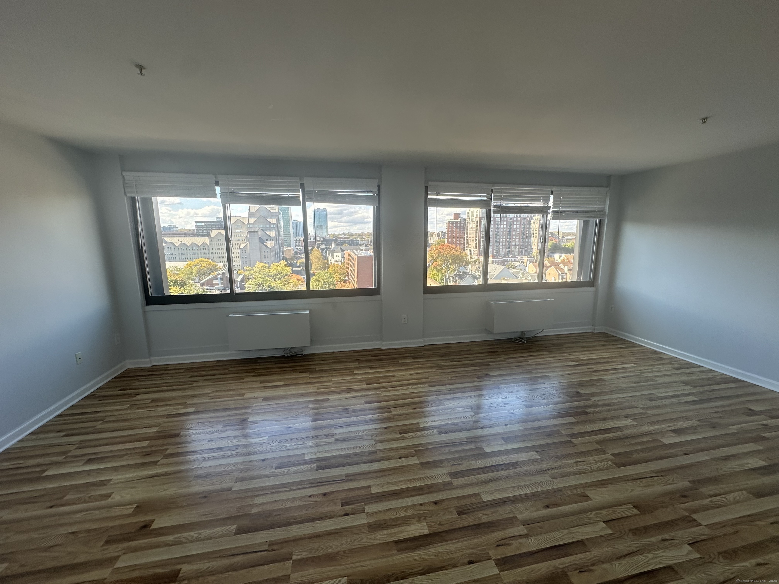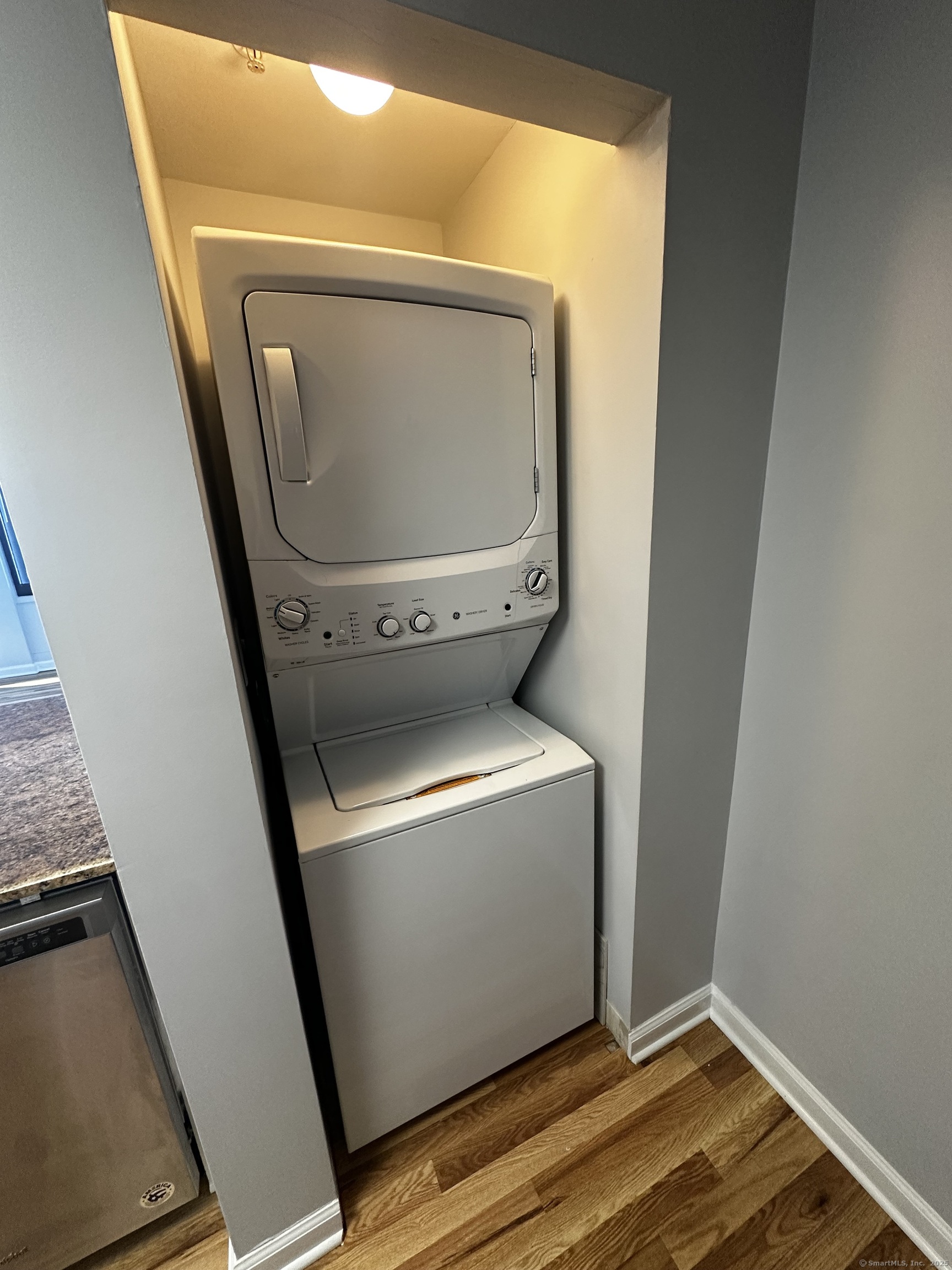 Wonderfully updated and beautiful one bedroom rental with city views and sunsets. Walk to downtown Stamford and train in minutes. Washer and dryer is located in the unit. Wood flooring throughout, updated kitchen and bath and freshly painted. Living room and dining room combo. Walk-in shower. There is a gym in the building for the tenants use. One reserved parking space. Enjoy the common area outdoor patio space with grill and tables in warmer weather. Truly a clean unit! $200 Refundable move-in and move-out security and is reserved w/management company. Moves to take place M-F 9-5 only.
