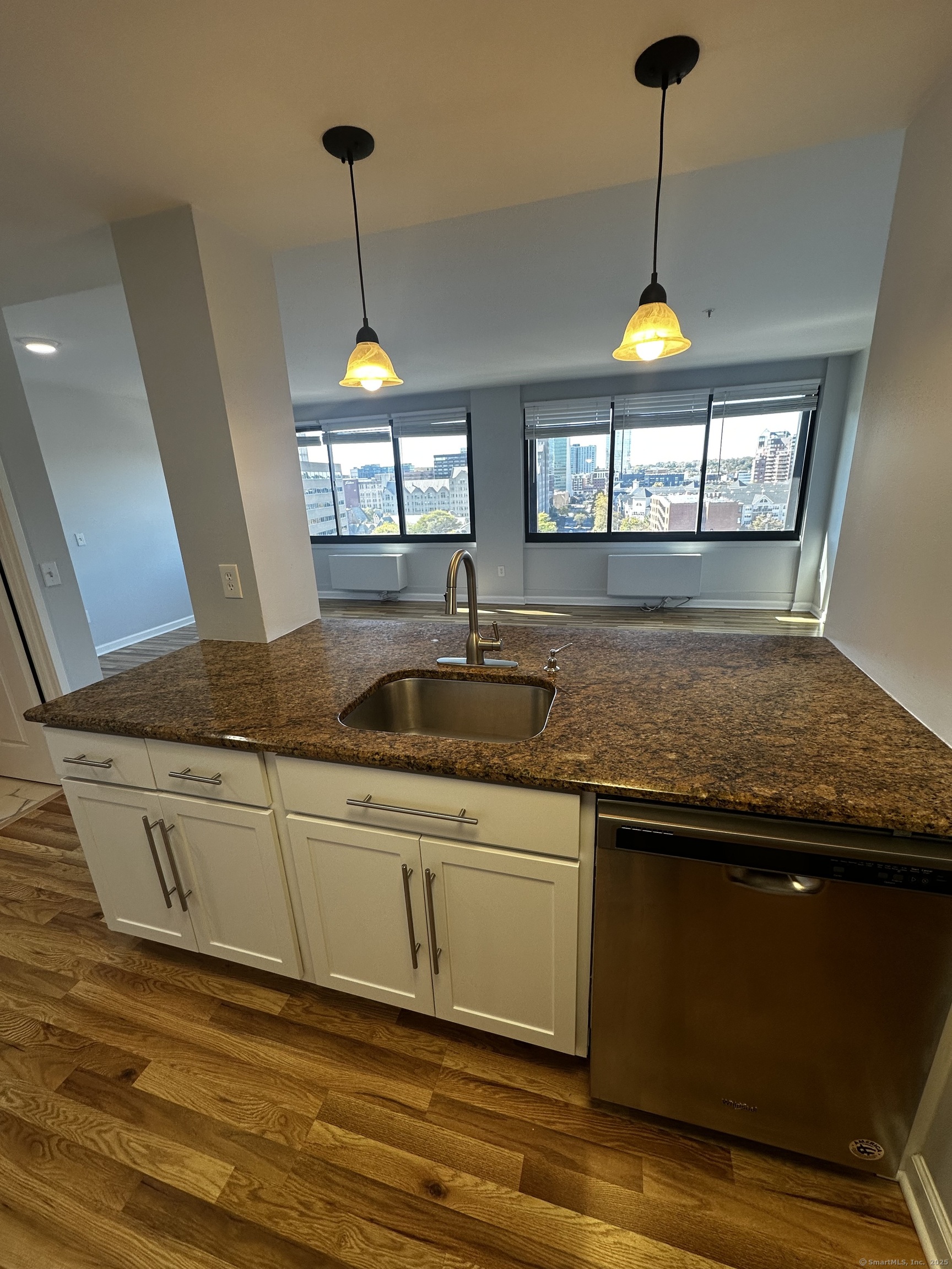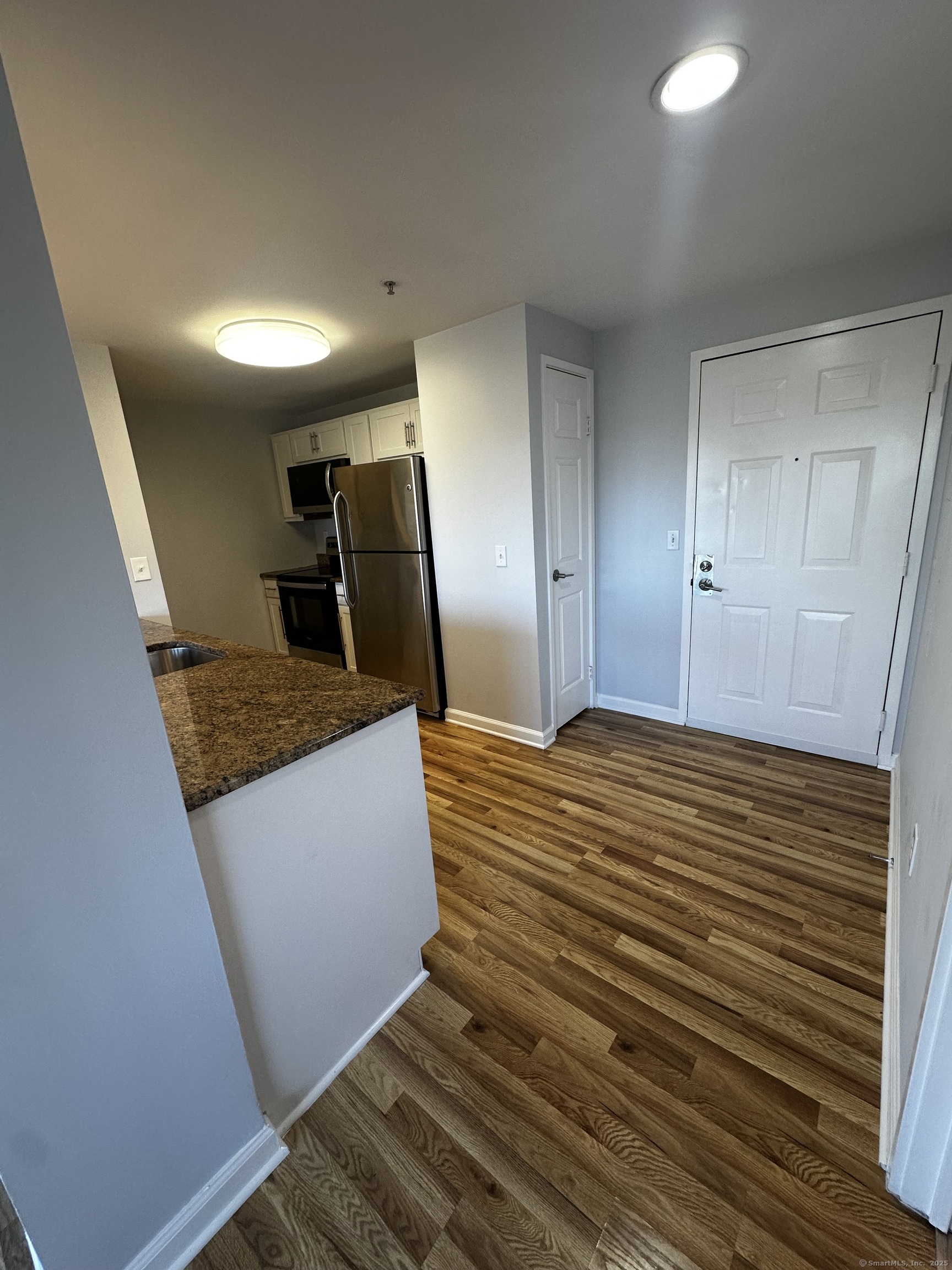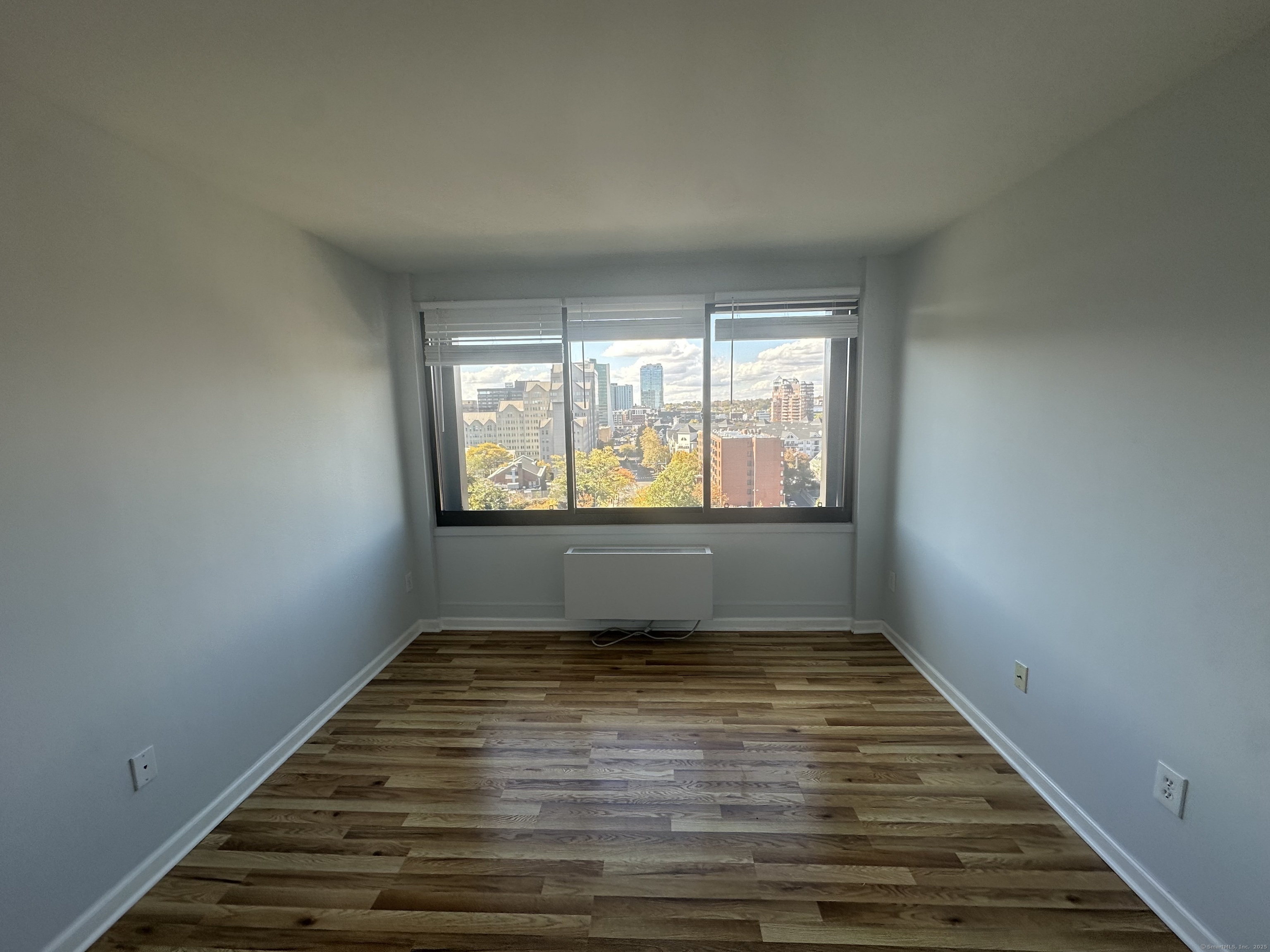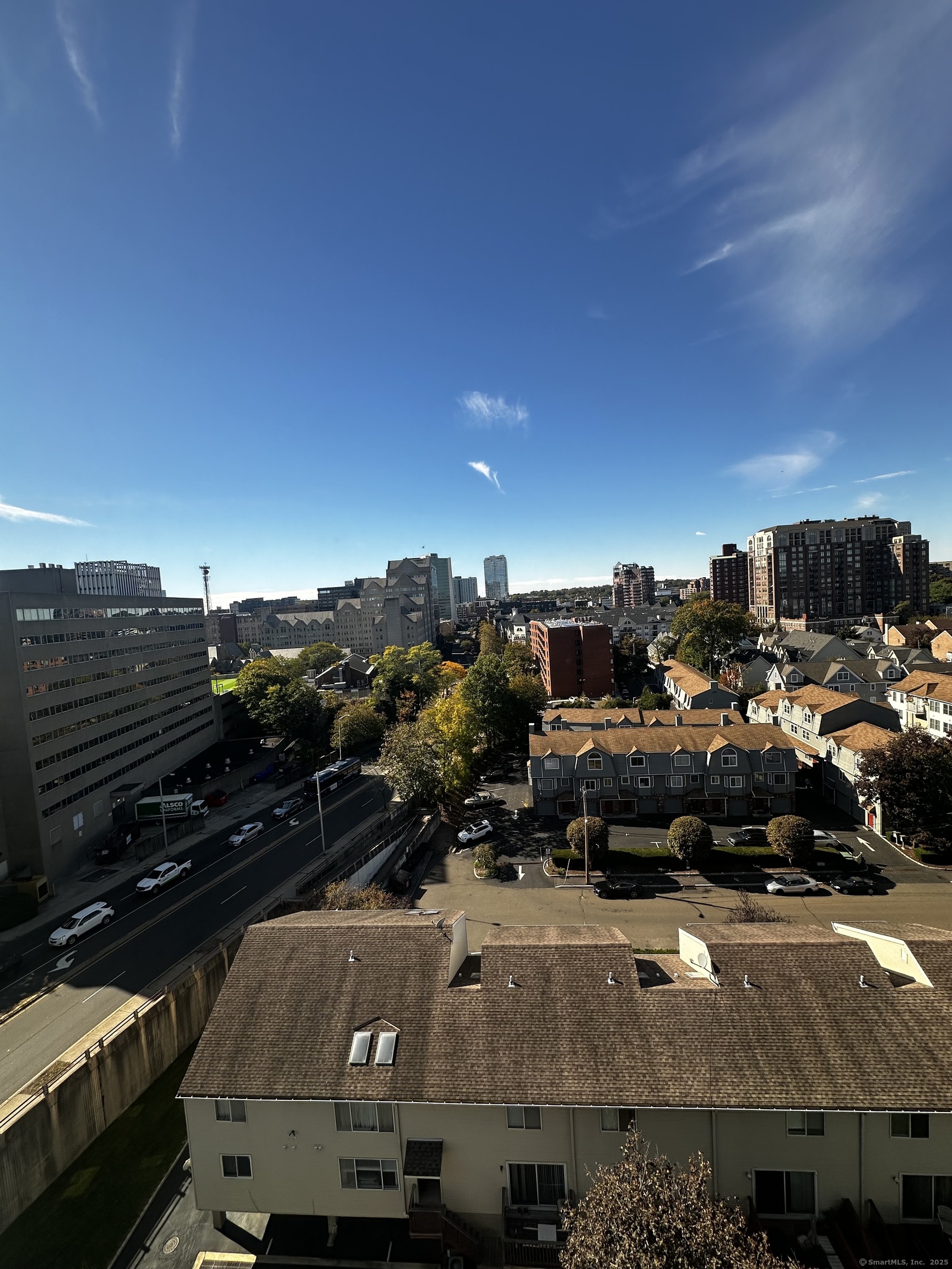 Wonderfully updated and beautiful one bedroom rental with city views and sunsets. Walk to downtown Stamford and train in minutes. Washer and dryer is located in the unit. Wood flooring throughout, updated kitchen and bath and freshly painted. Living room and dining room combo. Walk-in shower. There is a gym in the building for the tenants use. One reserved parking space. Enjoy the common area outdoor patio space with grill and tables in warmer weather. Truly a clean unit! $200 Refundable move-in and move-out security and is reserved w/management company. Moves to take place M-F 9-5 only.