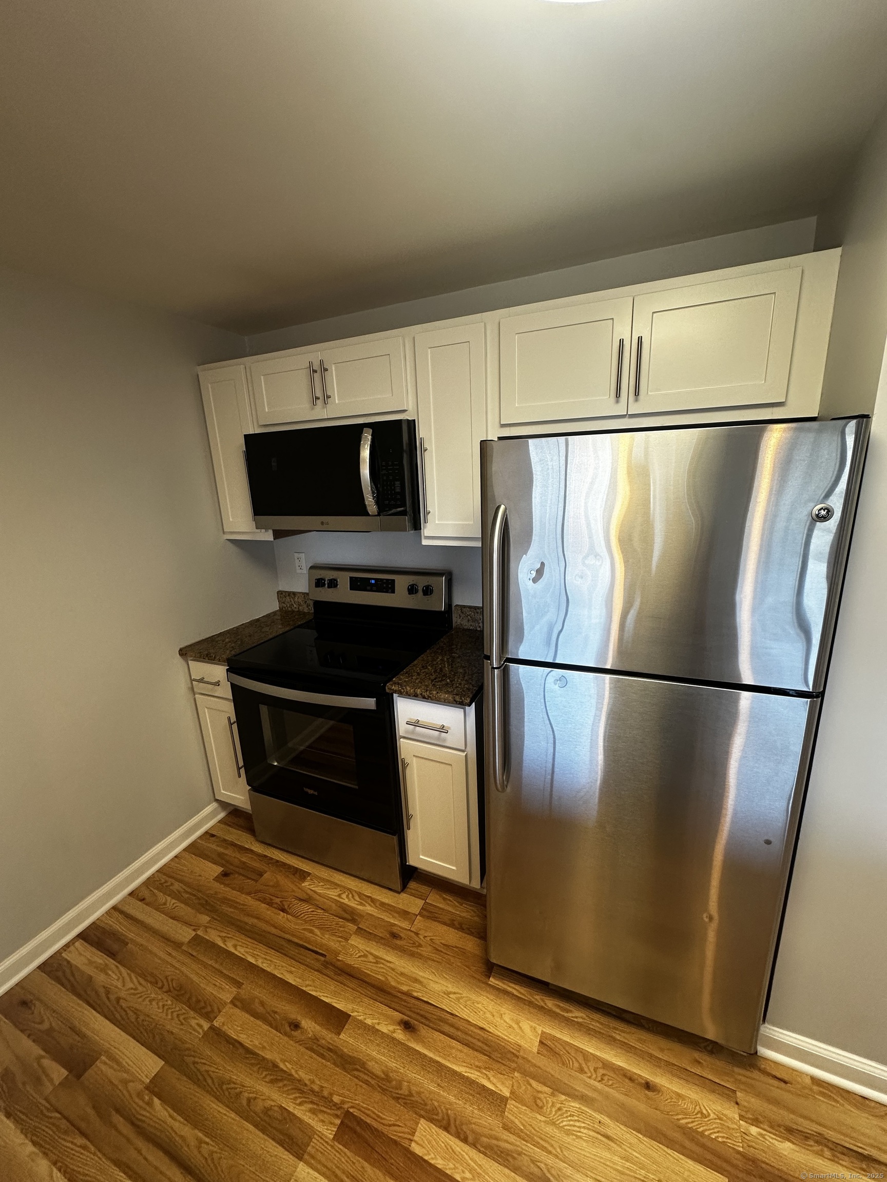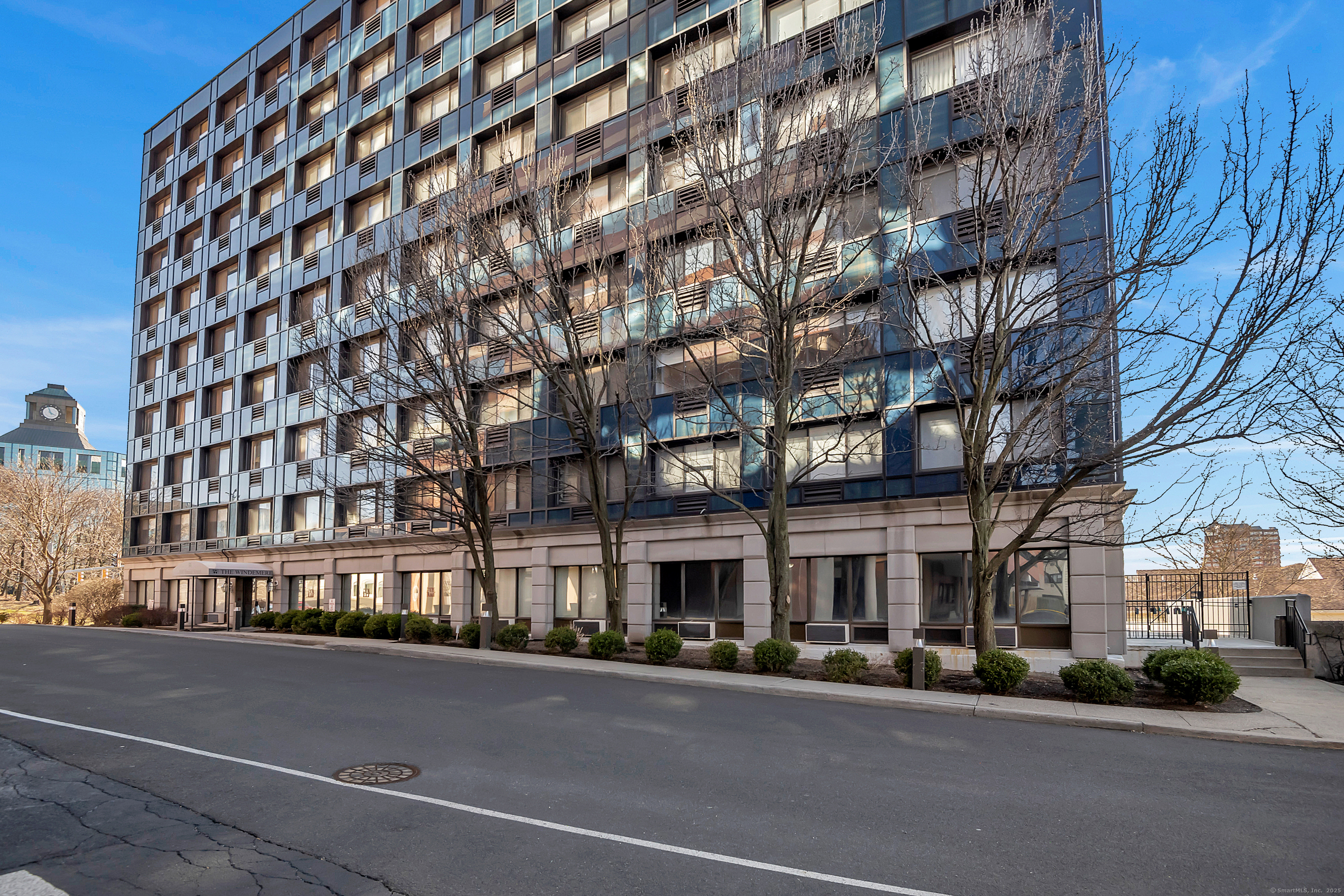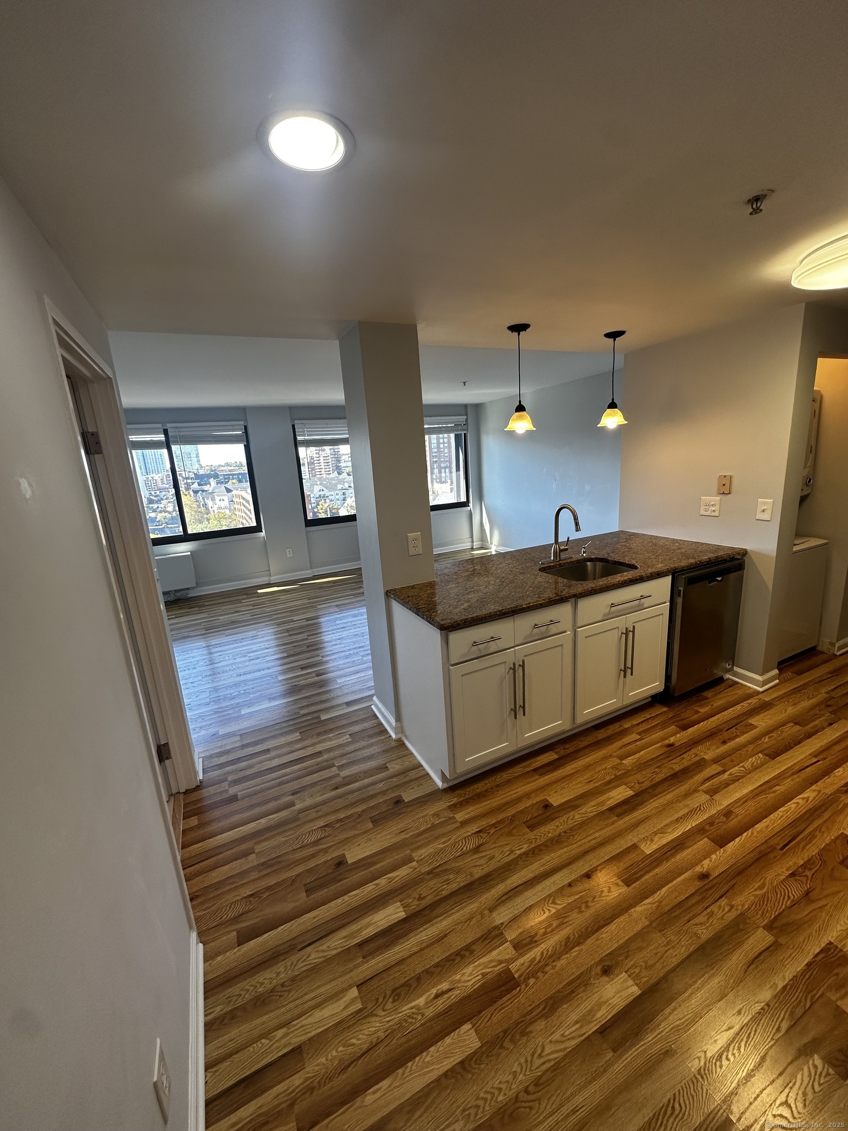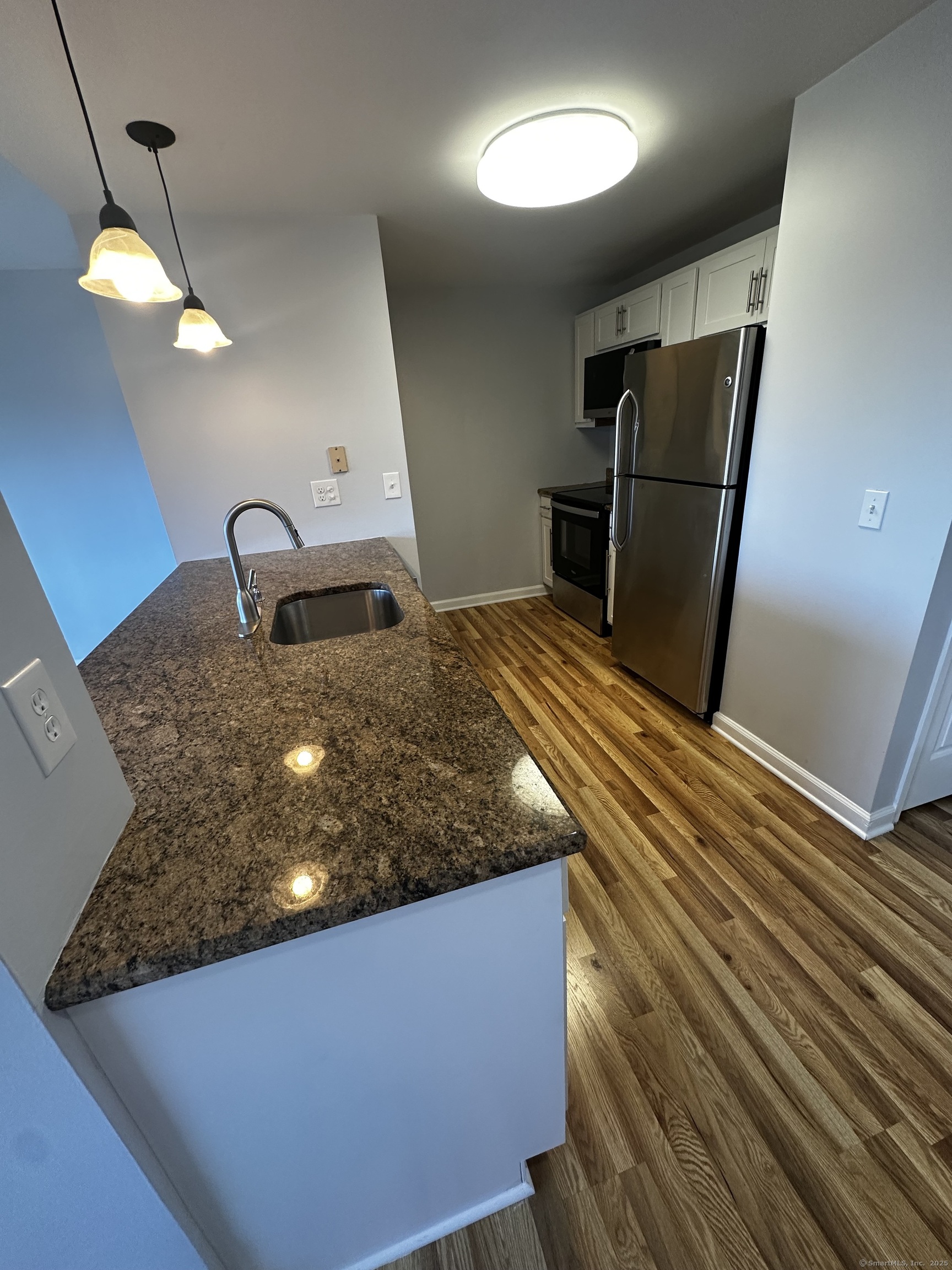 Wonderfully updated and beautiful one bedroom rental with city views and sunsets. Walk to downtown Stamford and train in minutes. Washer and dryer is located in the unit. Wood flooring throughout, updated kitchen and bath and freshly painted. Living room and dining room combo. Walk-in shower. There is a gym in the building for the tenants use. One reserved parking space. Enjoy the common area outdoor patio space with grill and tables in warmer weather. Truly a clean unit! $200 Refundable move-in and move-out security and is reserved w/management company. Moves to take place M-F 9-5 only.