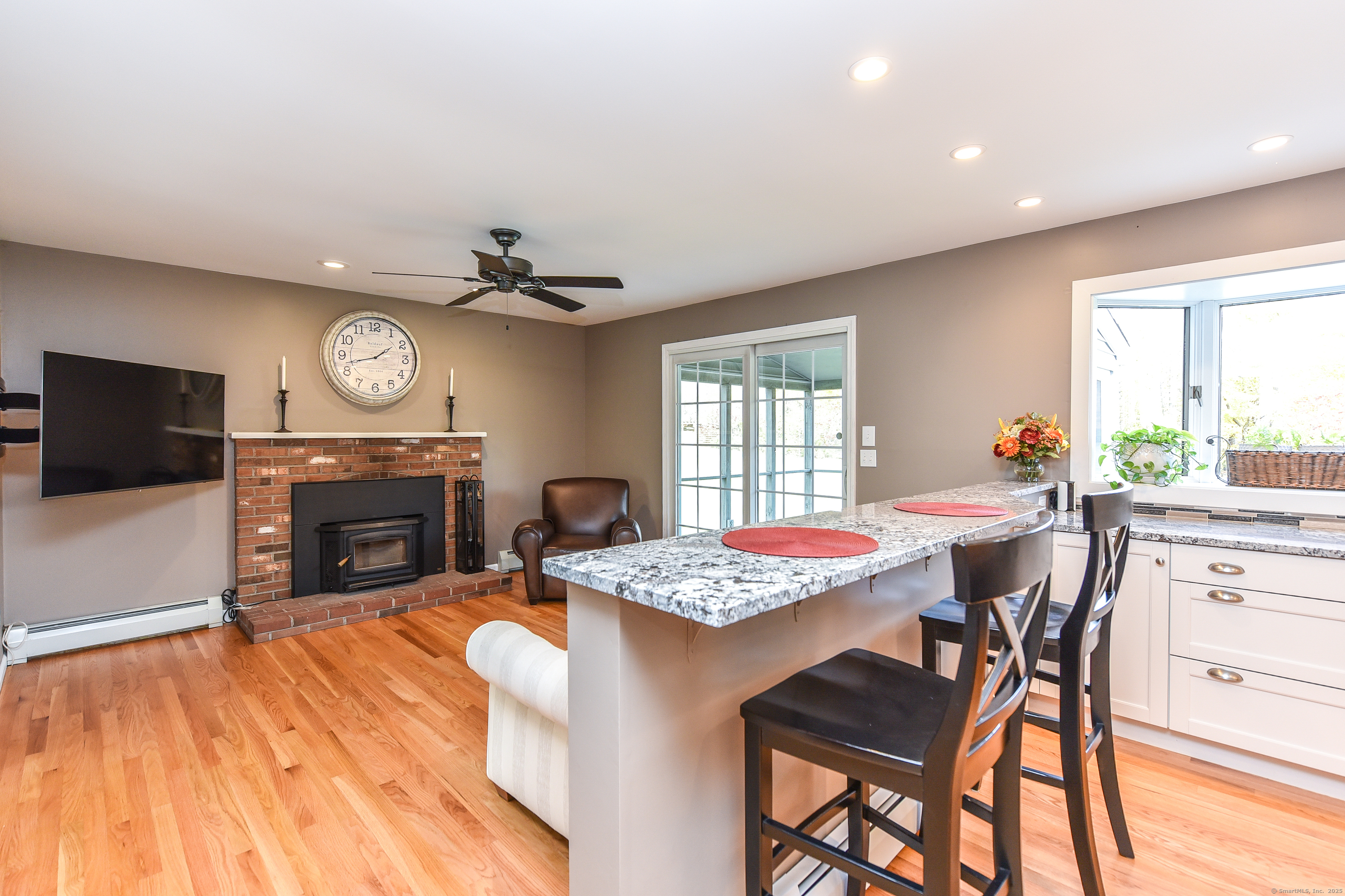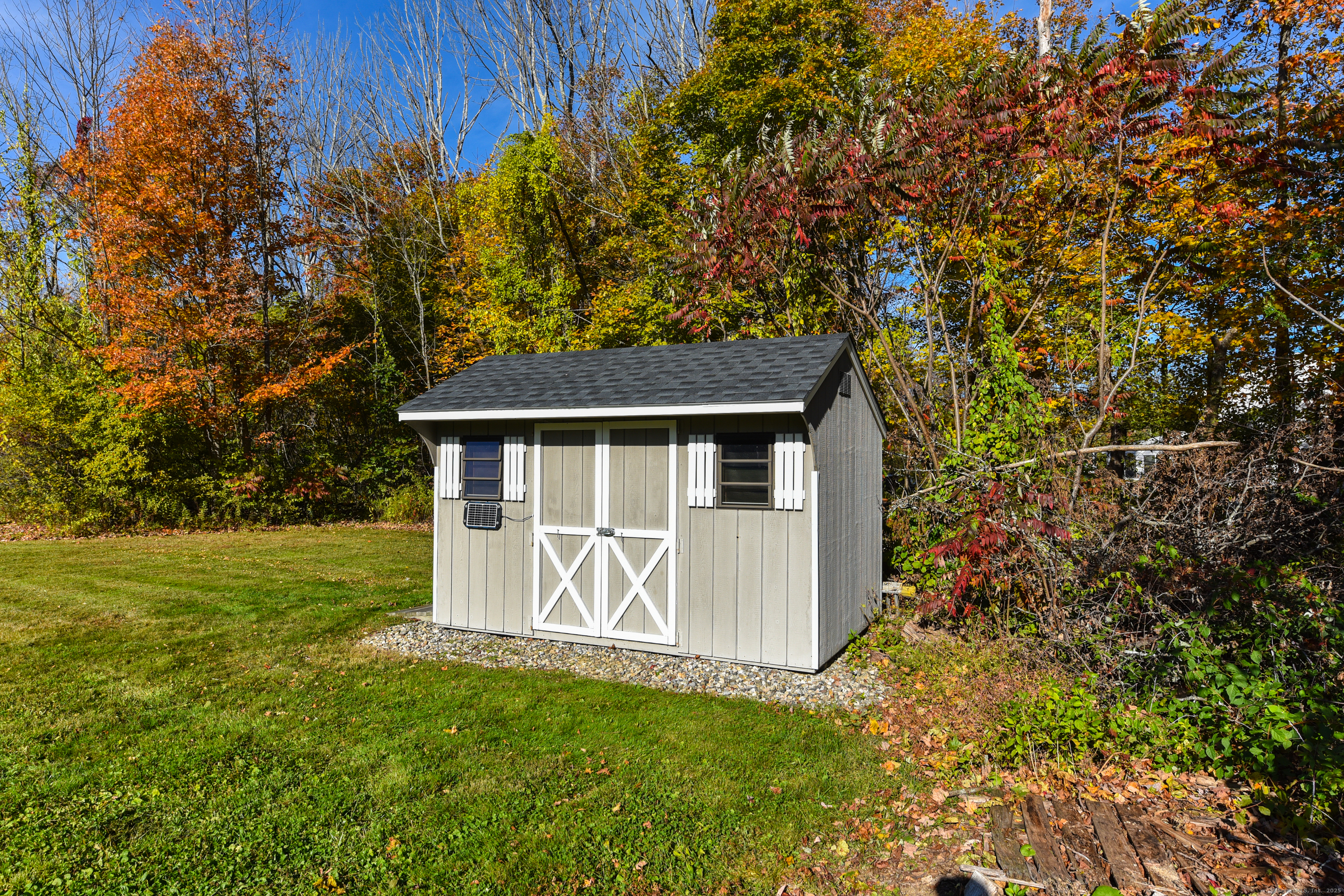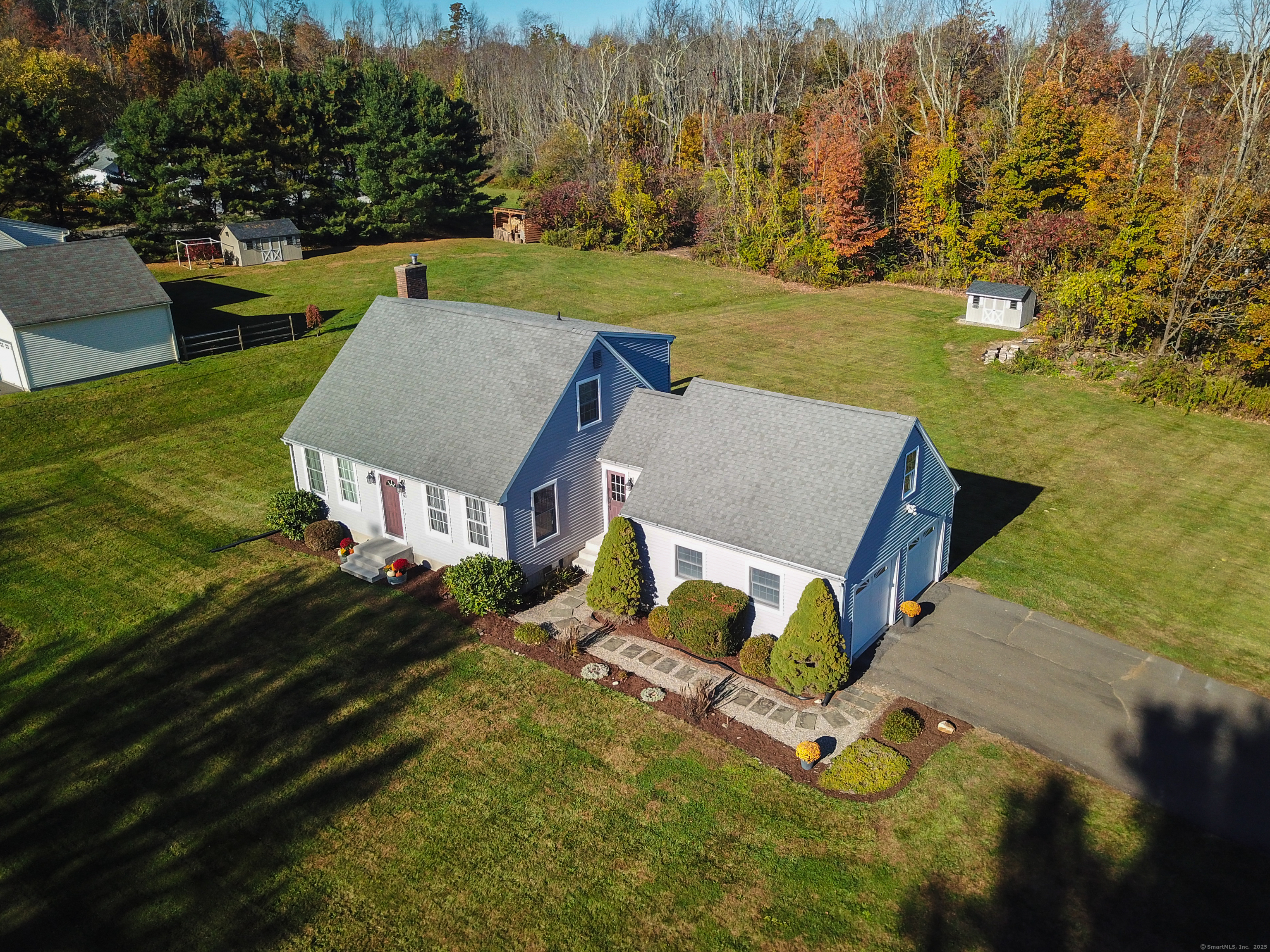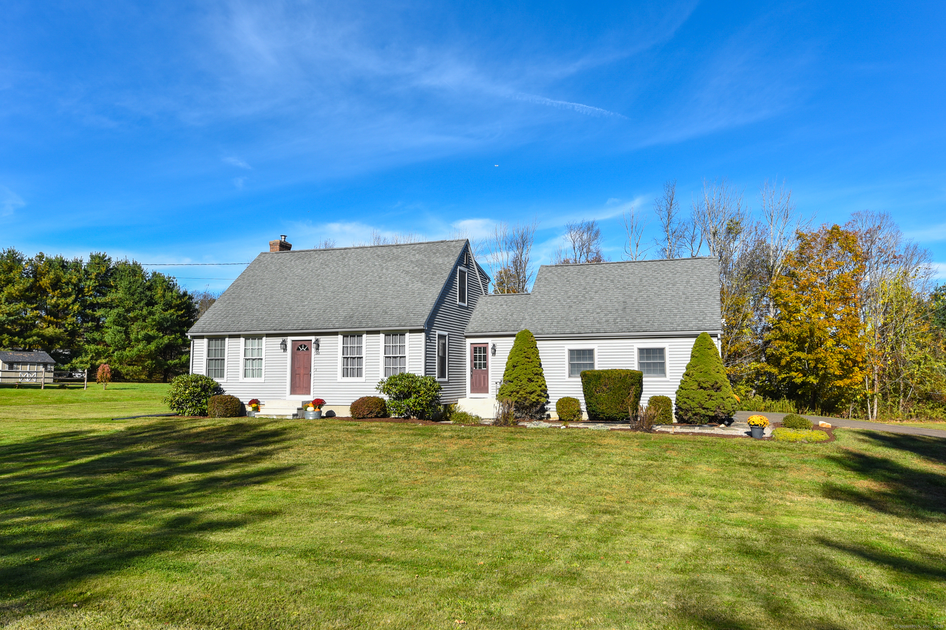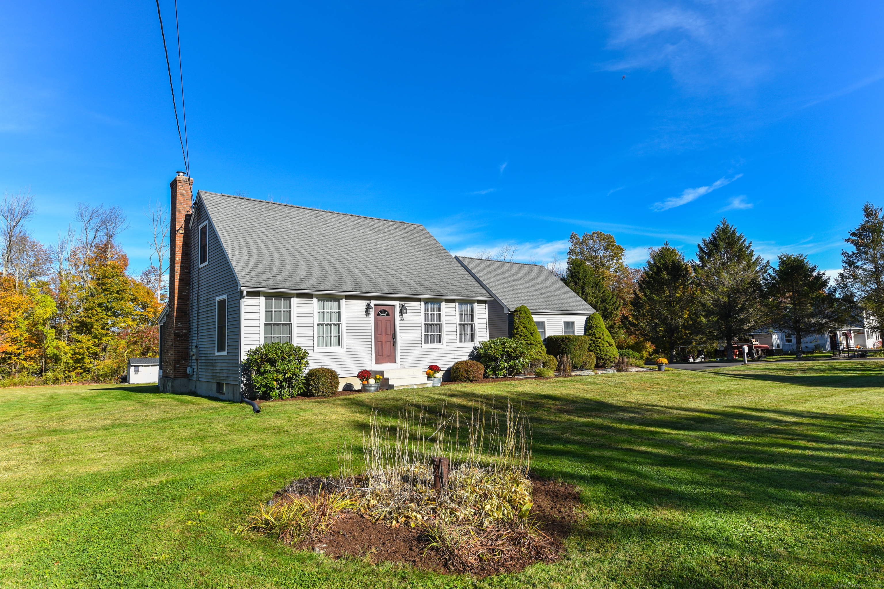 Beautifully maintained Cape set on a wide, open .93-acre lot with a private tree-lined backdrop offering both sun and seclusion. This updated home features a stunning custom kitchen with granite countertops, butcher block island, stainless appliances, tile backsplash, and abundant cabinetry, opening into a bright dining area with hardwood floors. The family room is open to the kitchen with a wood-burning stove insert for added warmth and comfort. Sliders lead to a screened porch overlooking the expansive backyard and is perfect for outdoor dining. The upper level offers three well-sized bedrooms and an updated full bath, while the main floor includes a convenient half bath and laundry. Additional highlights include a 2-car attached garage, garden shed/outbuilding for storage or hobby space, generator-ready panel, thermopane windows, and excellent natural light throughout. The grounds are beautifully manicured, ideal for gardening, play, or outdoor entertaining. Located in a peaceful rural setting with easy access to Barkhamsted recreation areas, reservoirs, and major routes. Move-in ready and a wonderful blend of comfort, space, and New England character.