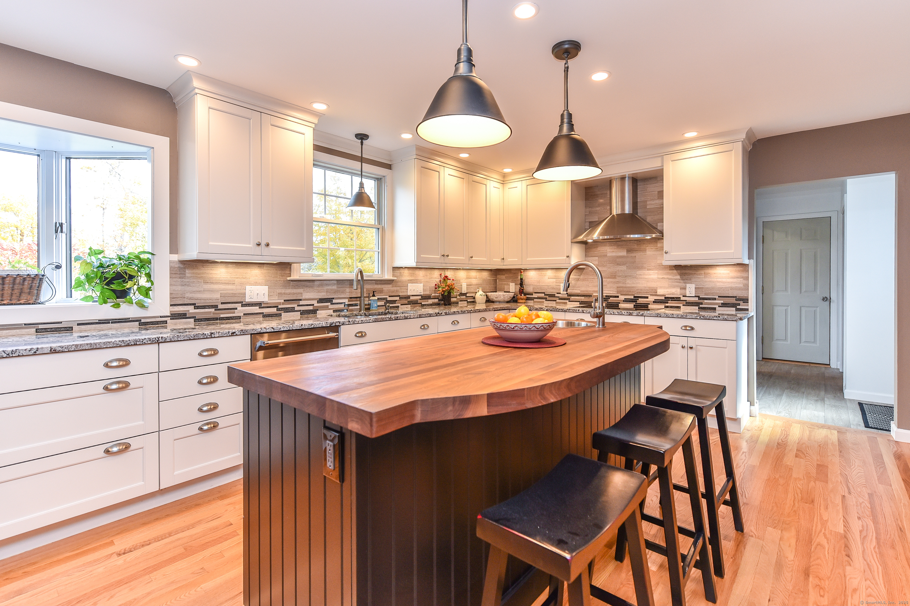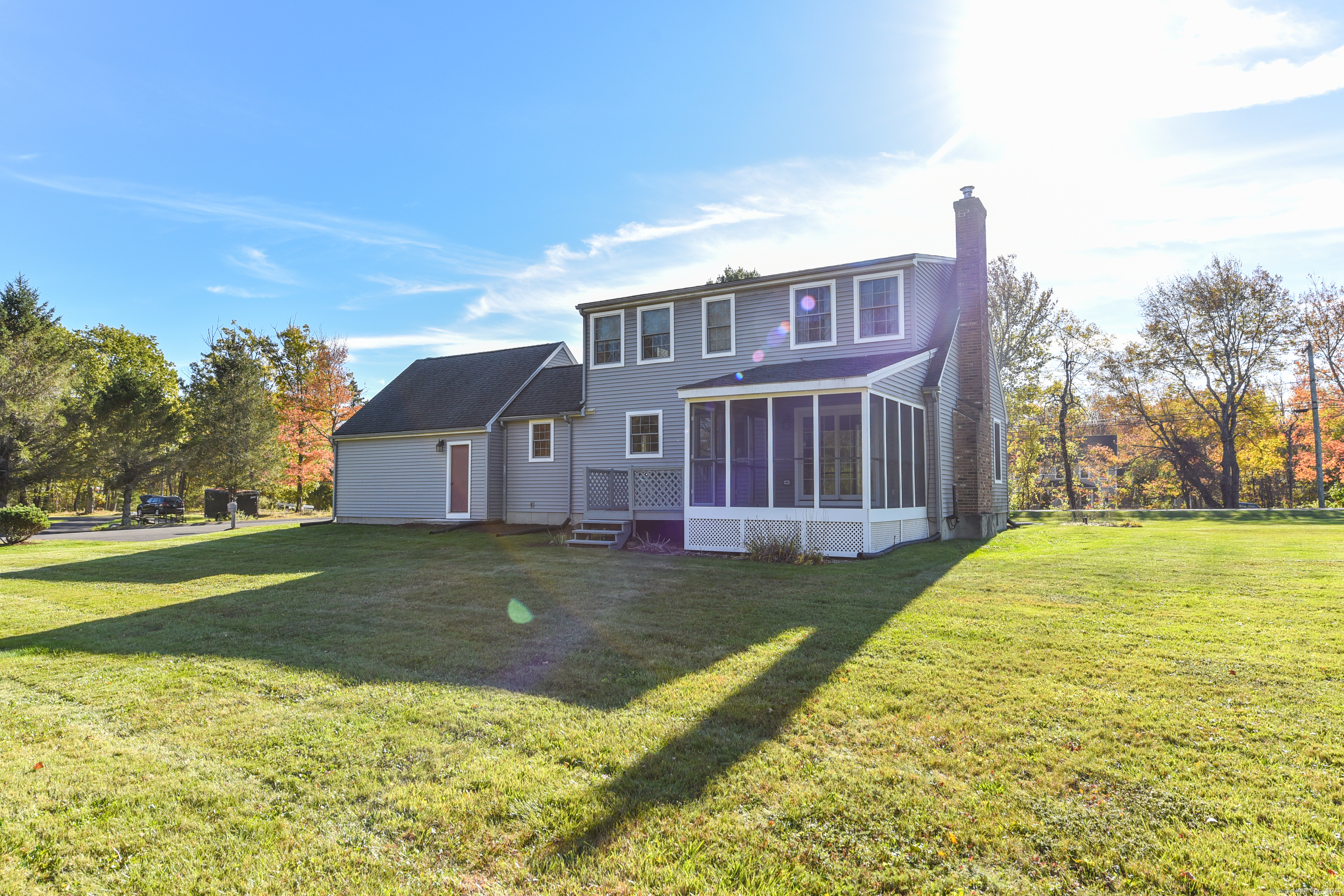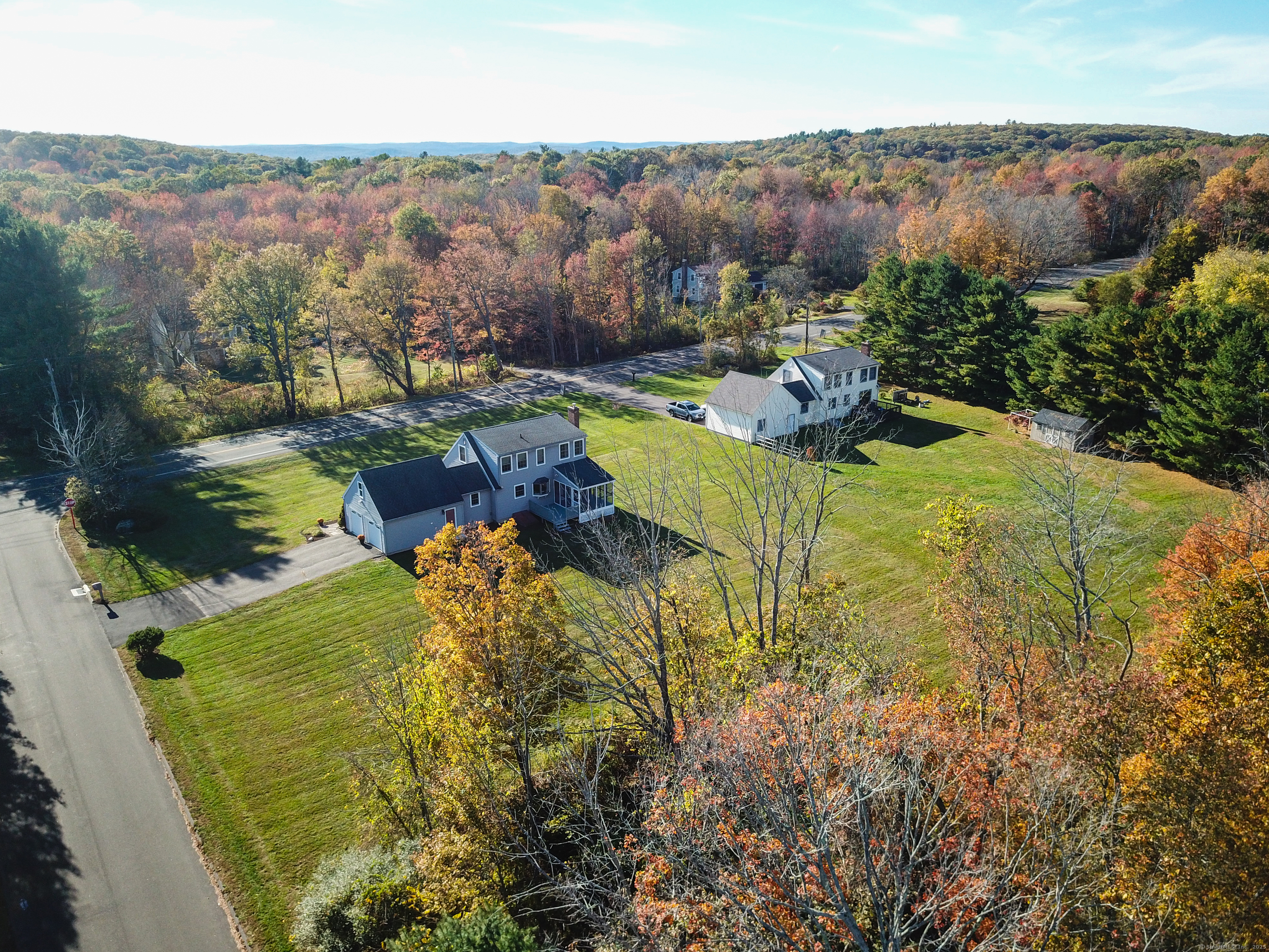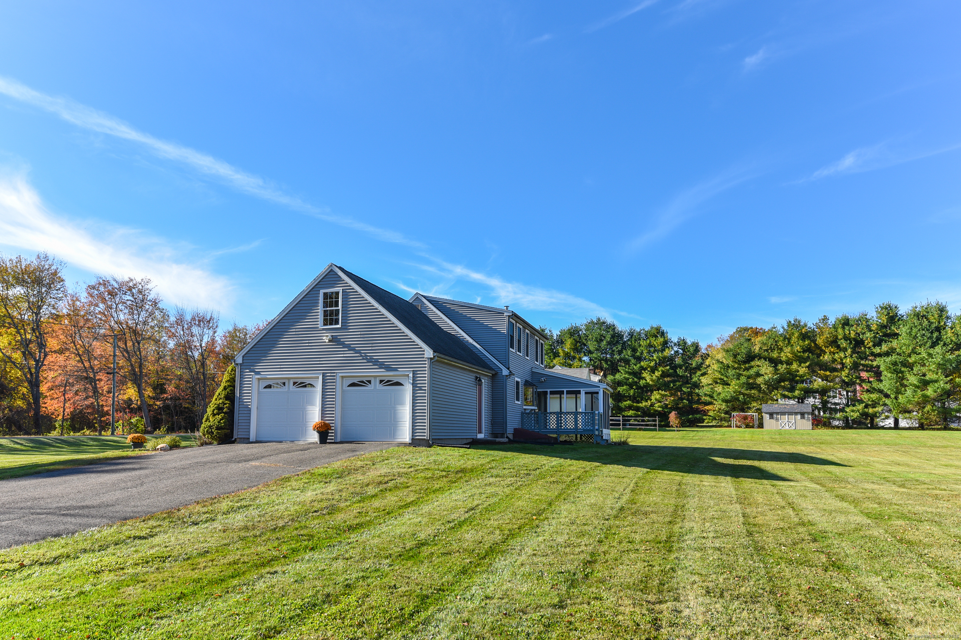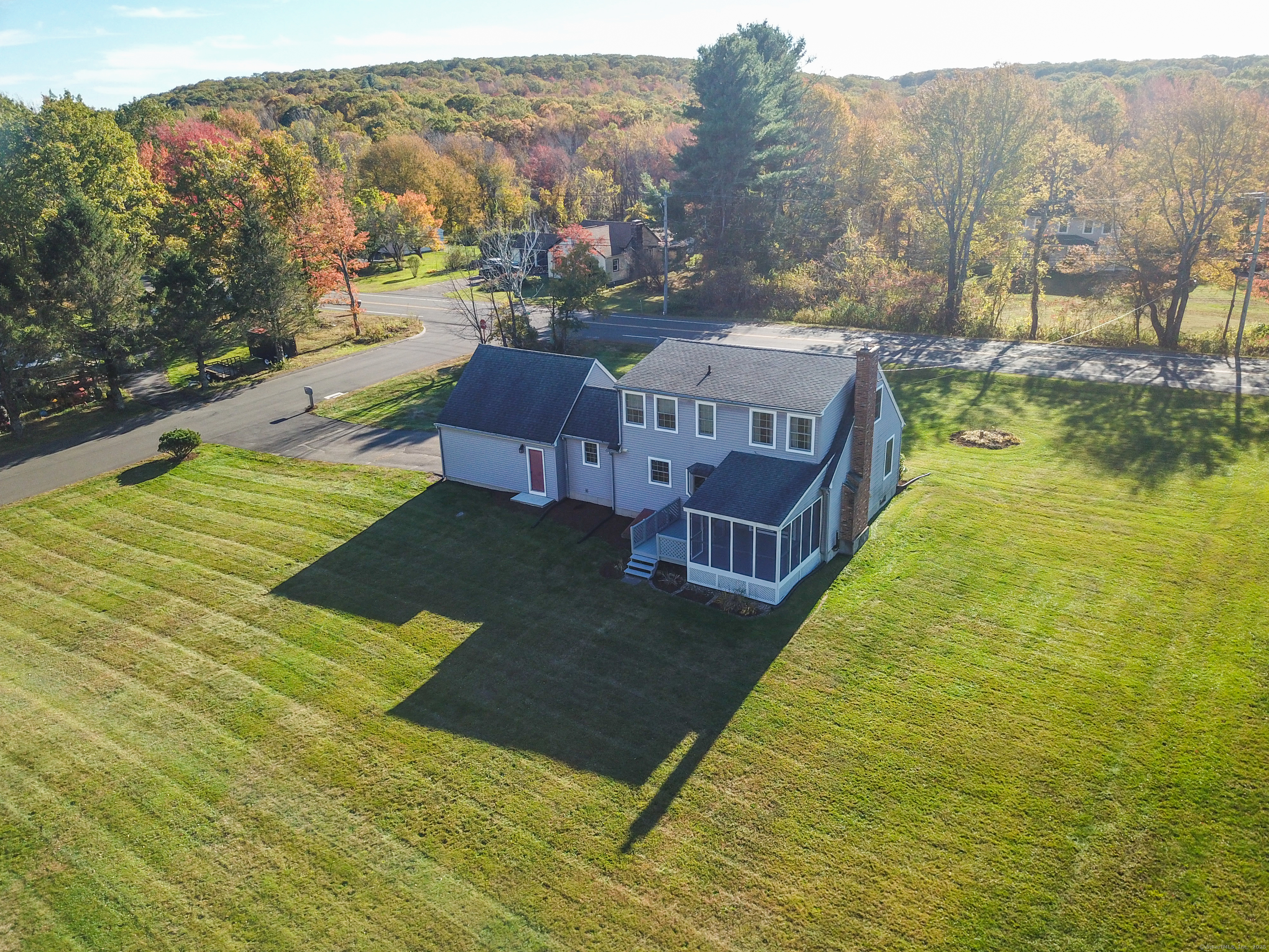 Beautifully maintained Cape set on a wide, open .93-acre lot with a private tree-lined backdrop offering both sun and seclusion. This updated home features a stunning custom kitchen with granite countertops, butcher block island, stainless appliances, tile backsplash, and abundant cabinetry, opening into a bright dining area with hardwood floors. The family room is open to the kitchen with a wood-burning stove insert for added warmth and comfort. Sliders lead to a screened porch overlooking the expansive backyard and is perfect for outdoor dining. The upper level offers three well-sized bedrooms and an updated full bath, while the main floor includes a convenient half bath and laundry. Additional highlights include a 2-car attached garage, garden shed/outbuilding for storage or hobby space, generator-ready panel, thermopane windows, and excellent natural light throughout. The grounds are beautifully manicured, ideal for gardening, play, or outdoor entertaining. Located in a peaceful rural setting with easy access to Barkhamsted recreation areas, reservoirs, and major routes. Move-in ready and a wonderful blend of comfort, space, and New England character.